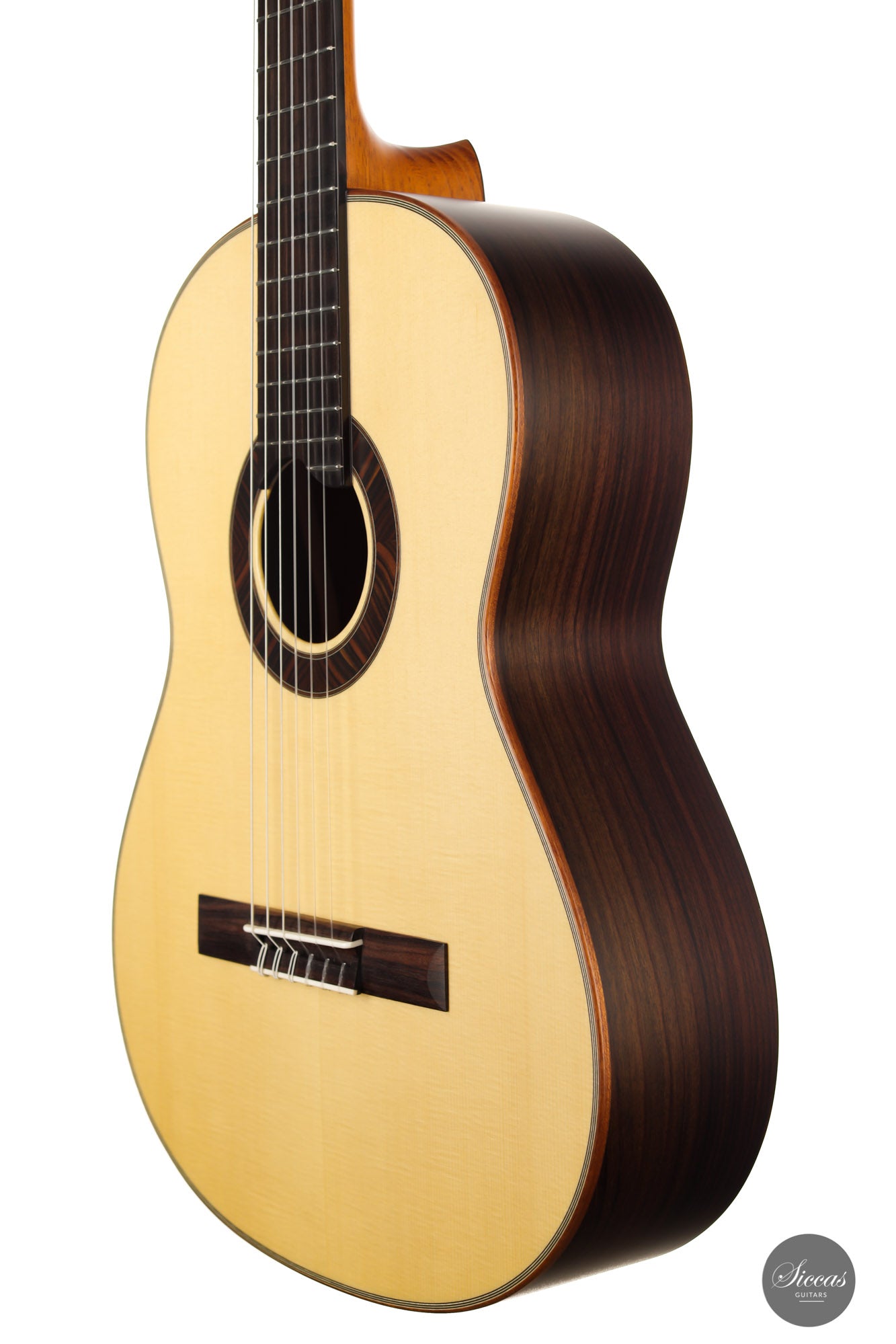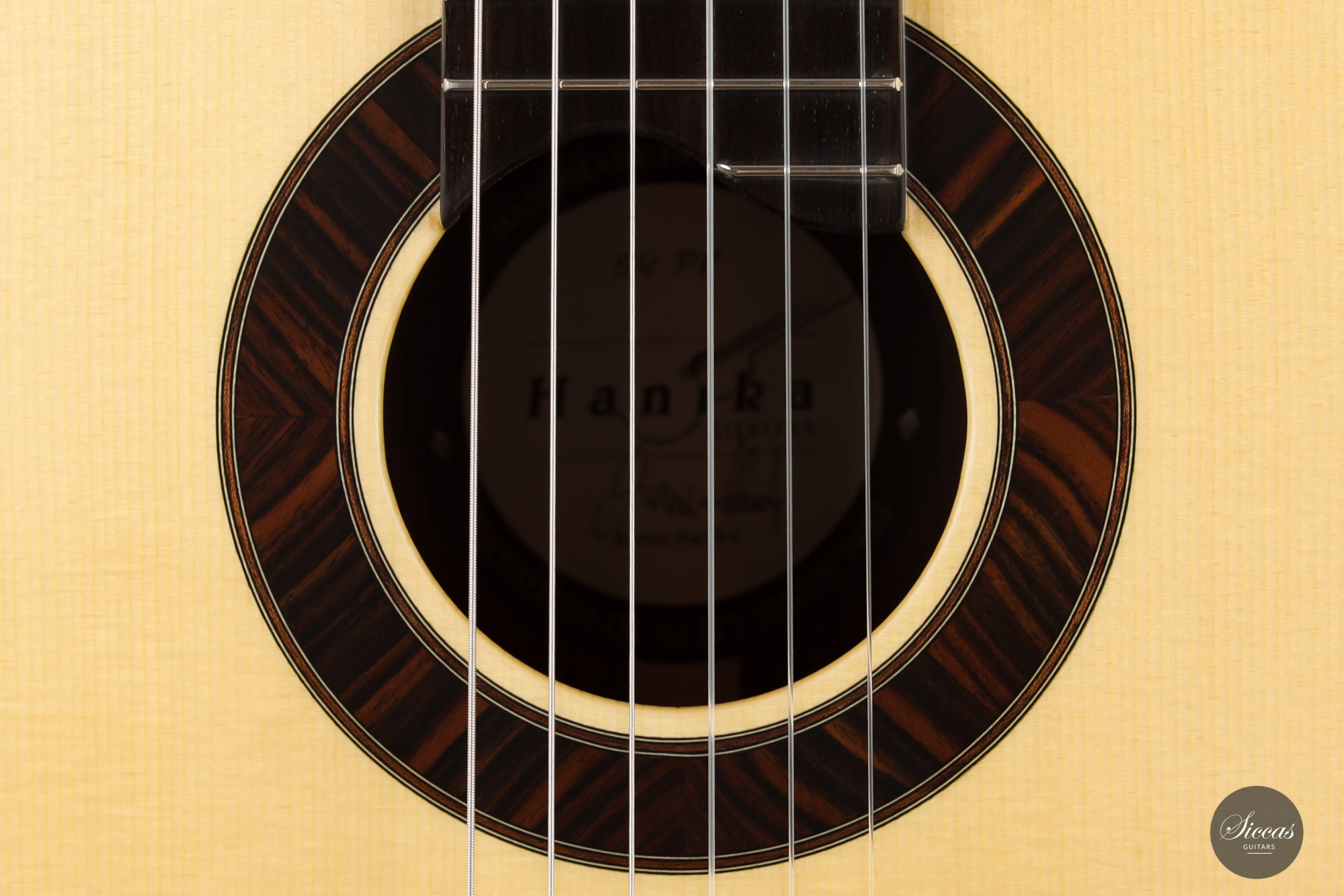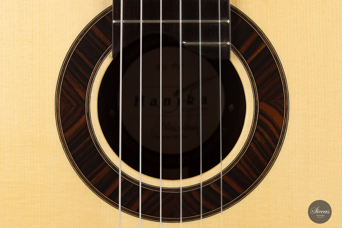 Back and sides of this guitar are made of high quality East Indian rosewood and the top is made of excellent spruce. Rosewood is considered one of the most universal tone woods for guitars, along with the thin spruce top the 54 PF gets a very good attack with full sound and a separated sharp sound. Response and sustain in of this guitar are perfectly balanced, what makes it the perfect instrument for many different type of players. This very thin varnish/wax sealing makes the surface more resistant to typical playing loads and yet the thin sealing creates a particularly open and transparent sound. This Hanika is made of fine-massive tone woods and features a thin top with an asymmetrical 5-fan-bracing. Comes with a Hanika Gig-bag.
