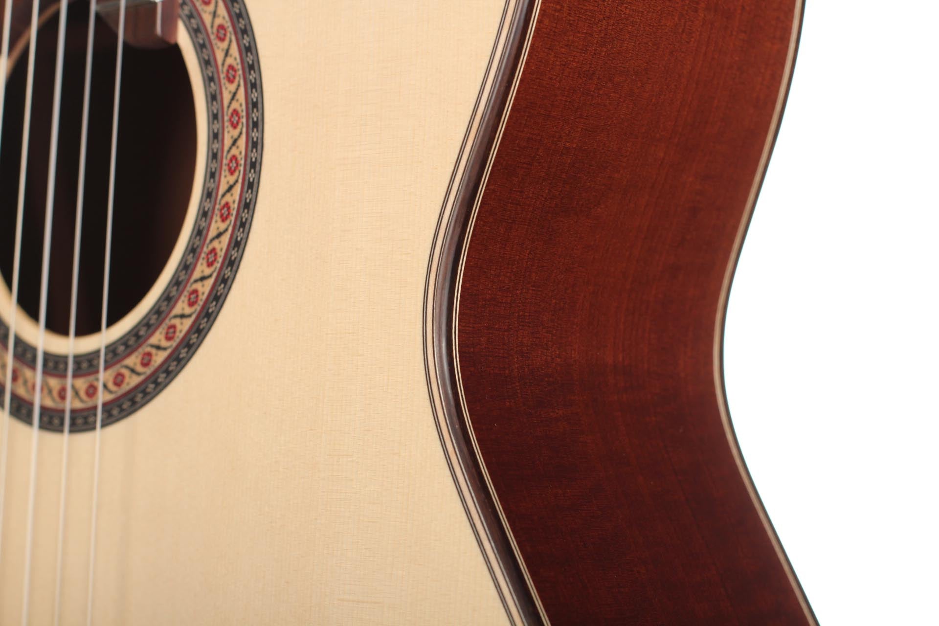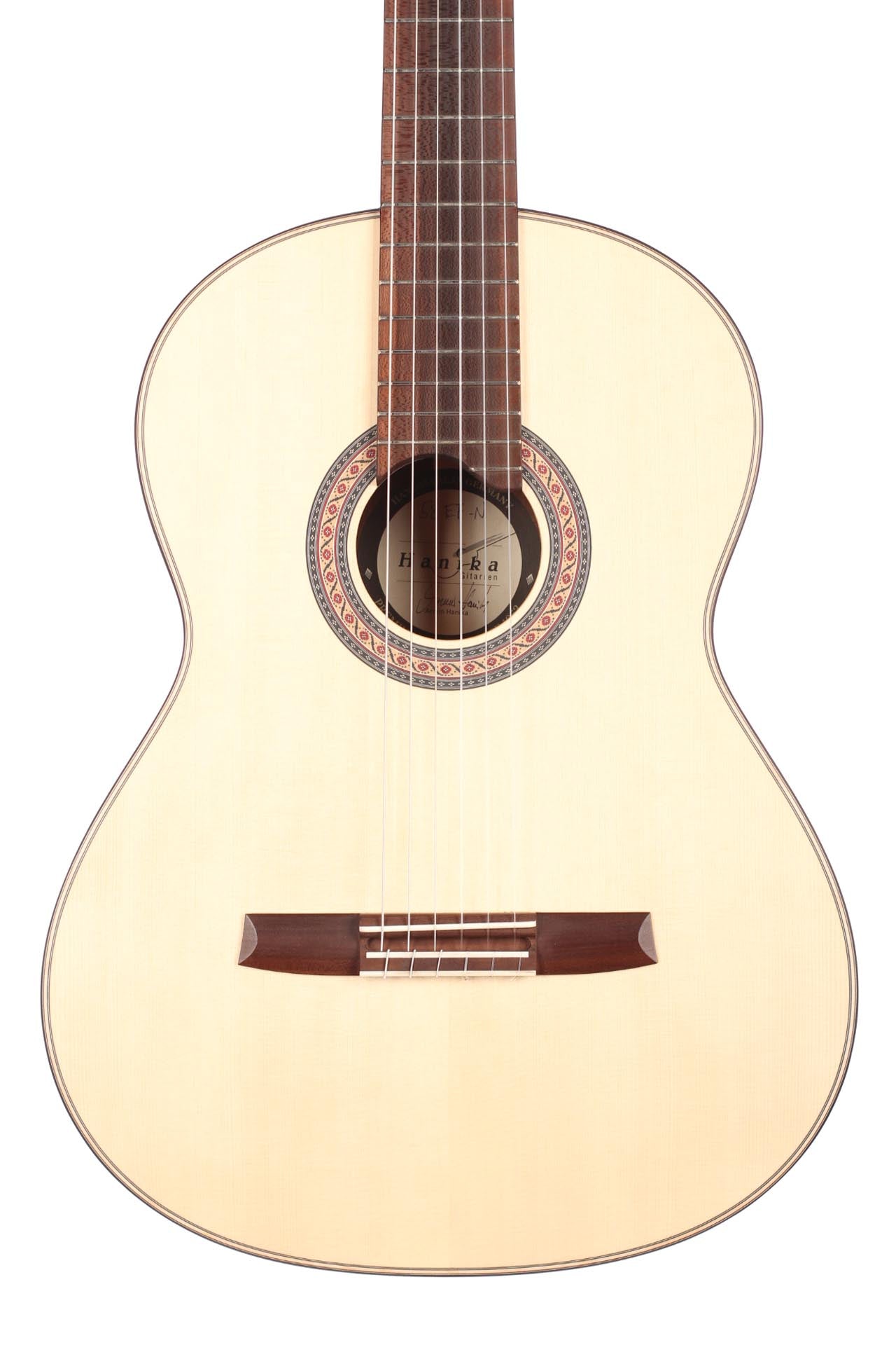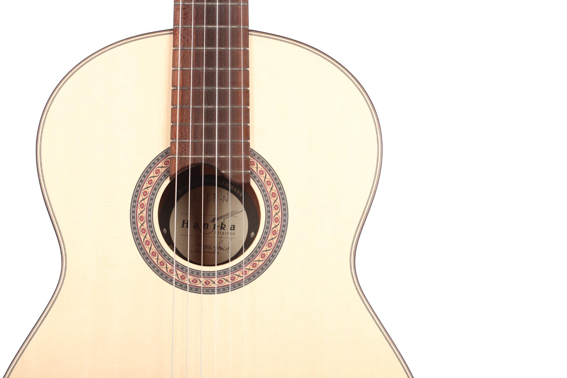 The Hanika 58 EF-N is a concert guitar crafted entirely from domestic tonewoods, combining refined workmanship with a distinctive tonal character. Back and sides of thermo-treated chequers wood and a wafer-thin spruce top with lattice bracing deliver a quick attack, full-bodied sound, and crisp clarity across the registers. Its versatile voice lends itself to a wide range of playing styles, making it especially attractive for advancing players who seek tonal flexibility. With details such as a thermo-plum fretboard, thermo-cherry neck, golden tuners with Galalith pegs, and an elegant high-gloss finish, this instrument unites sustainability with sophistication. Clear projection, lively responsiveness, and a balanced timbre mark the 58 EF-N as a modern guitar that offers both musical depth and long-term reliability.