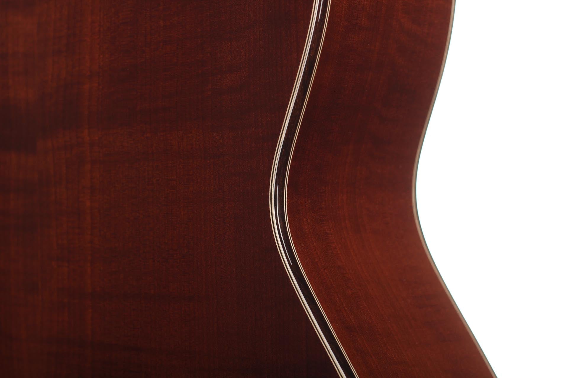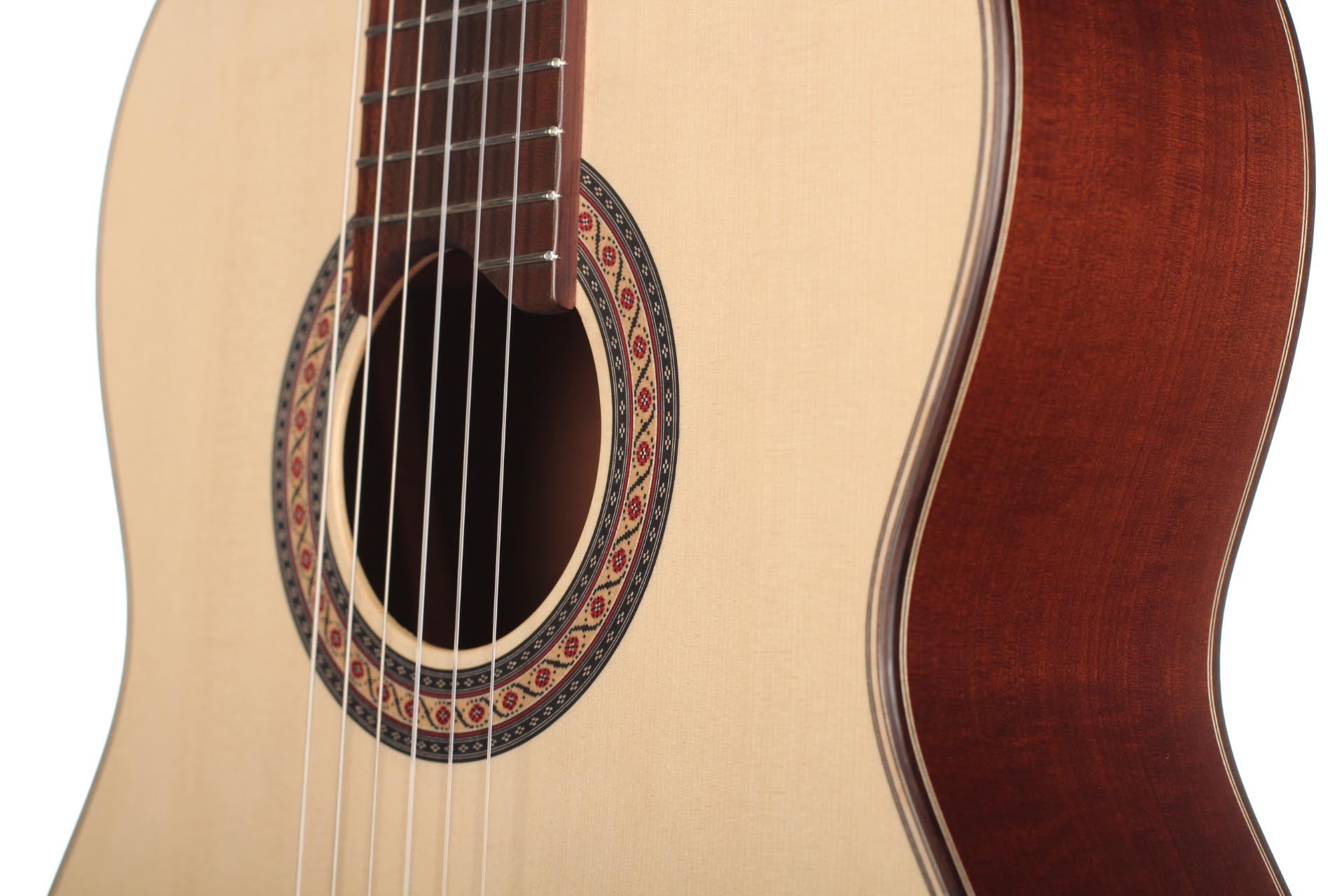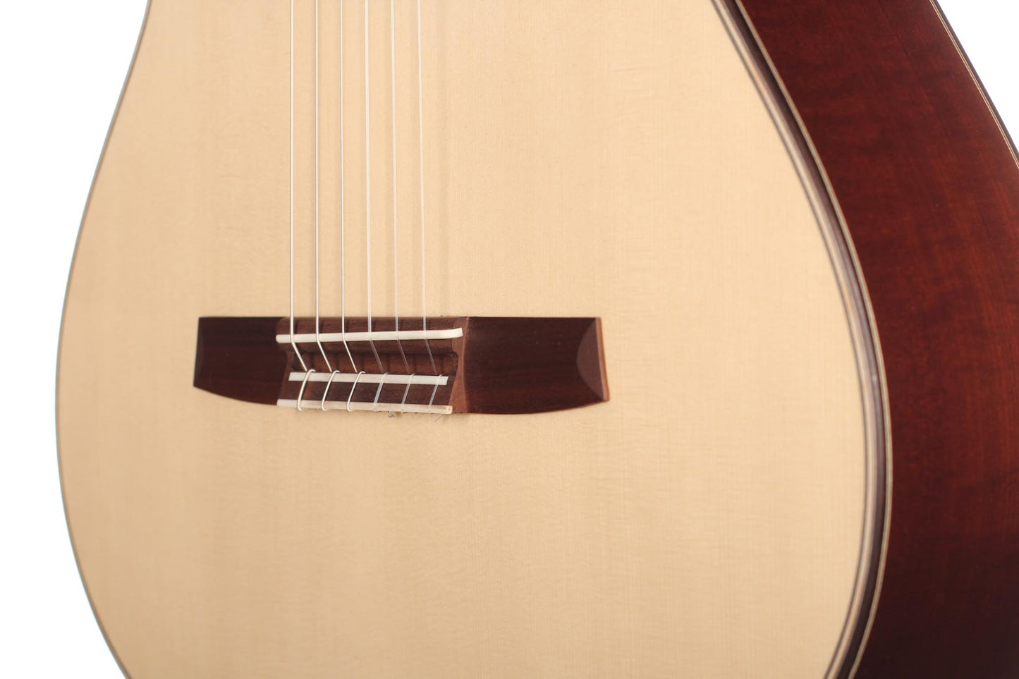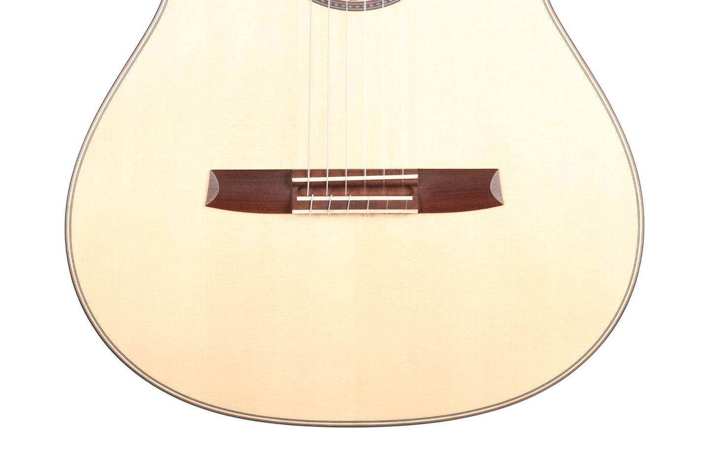 The Hanika 58 EF-N is a concert guitar crafted entirely from domestic tonewoods, combining refined workmanship with a distinctive tonal character. Back and sides of thermo-treated chequers wood and a wafer-thin spruce top with lattice bracing deliver a quick attack, full-bodied sound, and crisp clarity across the registers. Its versatile voice lends itself to a wide range of playing styles, making it especially attractive for advancing players who seek tonal flexibility. With details such as a thermo-plum fretboard, thermo-cherry neck, golden tuners with Galalith pegs, and an elegant high-gloss finish, this instrument unites sustainability with sophistication. Clear projection, lively responsiveness, and a balanced timbre mark the 58 EF-N as a modern guitar that offers both musical depth and long-term reliability.