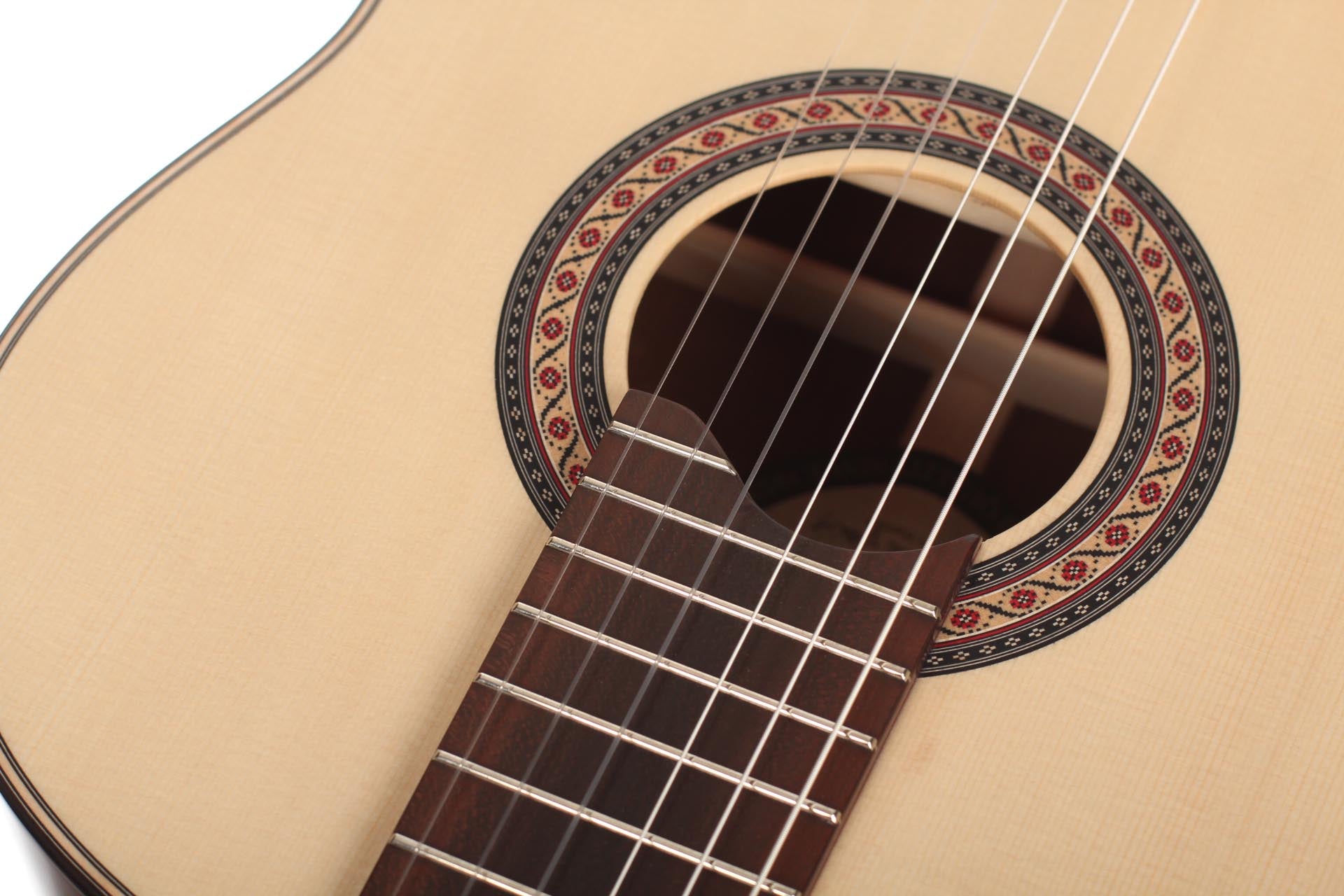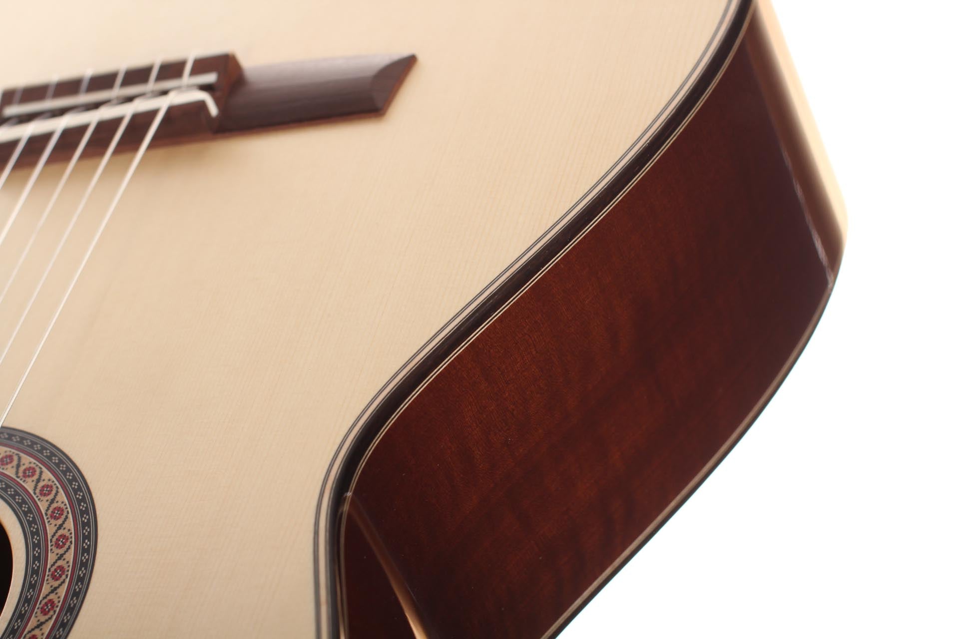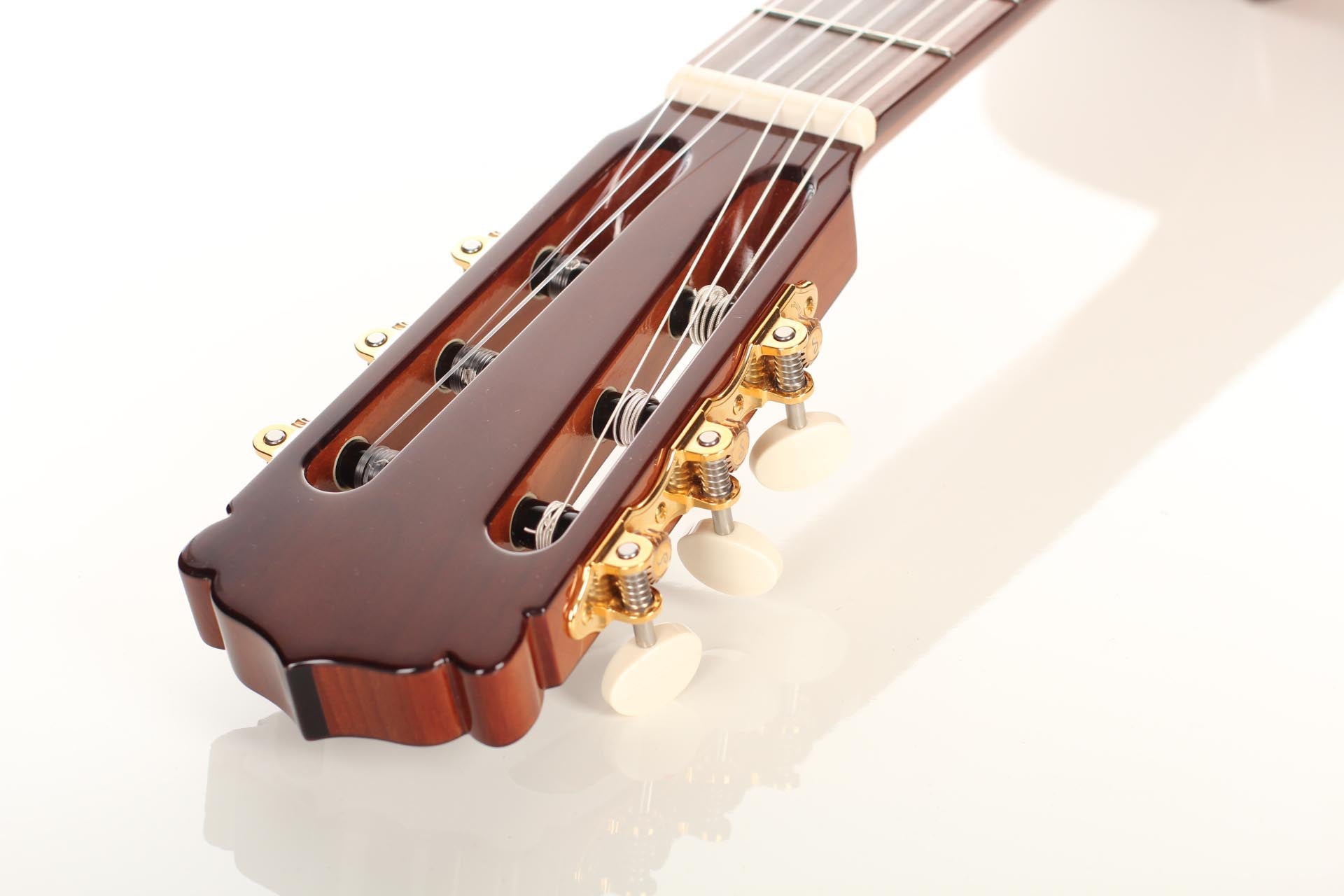 Back and sides are made from high-quality thermo-treated Chequers wood with a soundboard made from outstanding spruce wood. Chequers wood is characterized by its particularly dense wood structure and is regarded as one of the best domestic tonewoods for guitars. In conjunction with the wafer-thin spruce-wood soundboard with a lattice structure, these woods ensure that the 58 EF-N achieves a very good attack with a full sound and crisp tone. This guitar meets high demands, is recommended for advancing players and its versatile sound really comes into its own for a diverse range of playing techniques. Made from very high-quality solid tonewoods, this guitar has a high-gloss finish, a domed soundboard, and lattice bracing. The bushed golden tuning machines with Galalith pegs, the thermo-treated cherry neck completely reinforced with thermo-treated chequers wood and the thermo-treated chequers wood headstock are hallmarks of the 58 EF-N’s high quality. The fretboard is made of thermo-treated plum wood, thus ensuring that the entire guitar is made exclusively of domestic wood. The back, sides and neck of the guitar are varnished with a UV-cured, high-gloss acrylic lacquer. The soundboard is sealed with a thin layer of natural varnish. Included is a Hiscox Pro II case. This guitar is Cites-free.