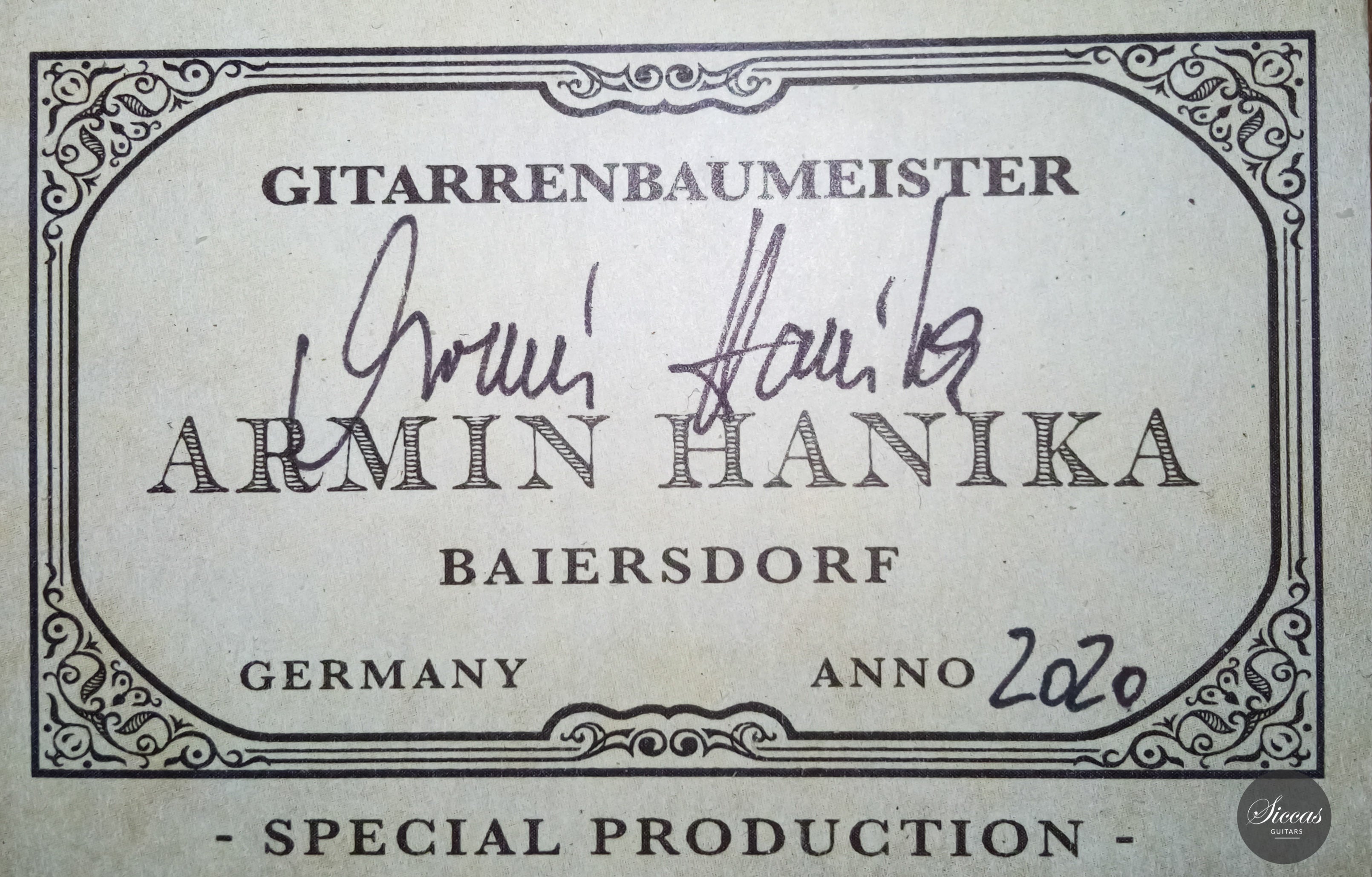 This Armin Hanika, HE Lattice custom, is a unique instrument. Pushing the boundaries of his HE Lattice model and going toward a highly modern design, Armin Hanika gave this "Special Production" guitar a ton of exciting features. To name a few, one will note the elevated fingerboard, double back, 1a head design, first-class Scheller tuners, thermo-treated spruce soundboard with lattice bracing, slight radius on the fingerboard, pins for a strap, and an extra soundport on the side. The most refined set of Ziricote was also chosen for this excellent guitar, bringing this instrument one step more towards the 1A model's quality. Soundwise, it is an absolute beast and offers outstanding responsiveness. A clean, focussed tone with plenty of sympathetical resonances make it an ideal concert guitar.