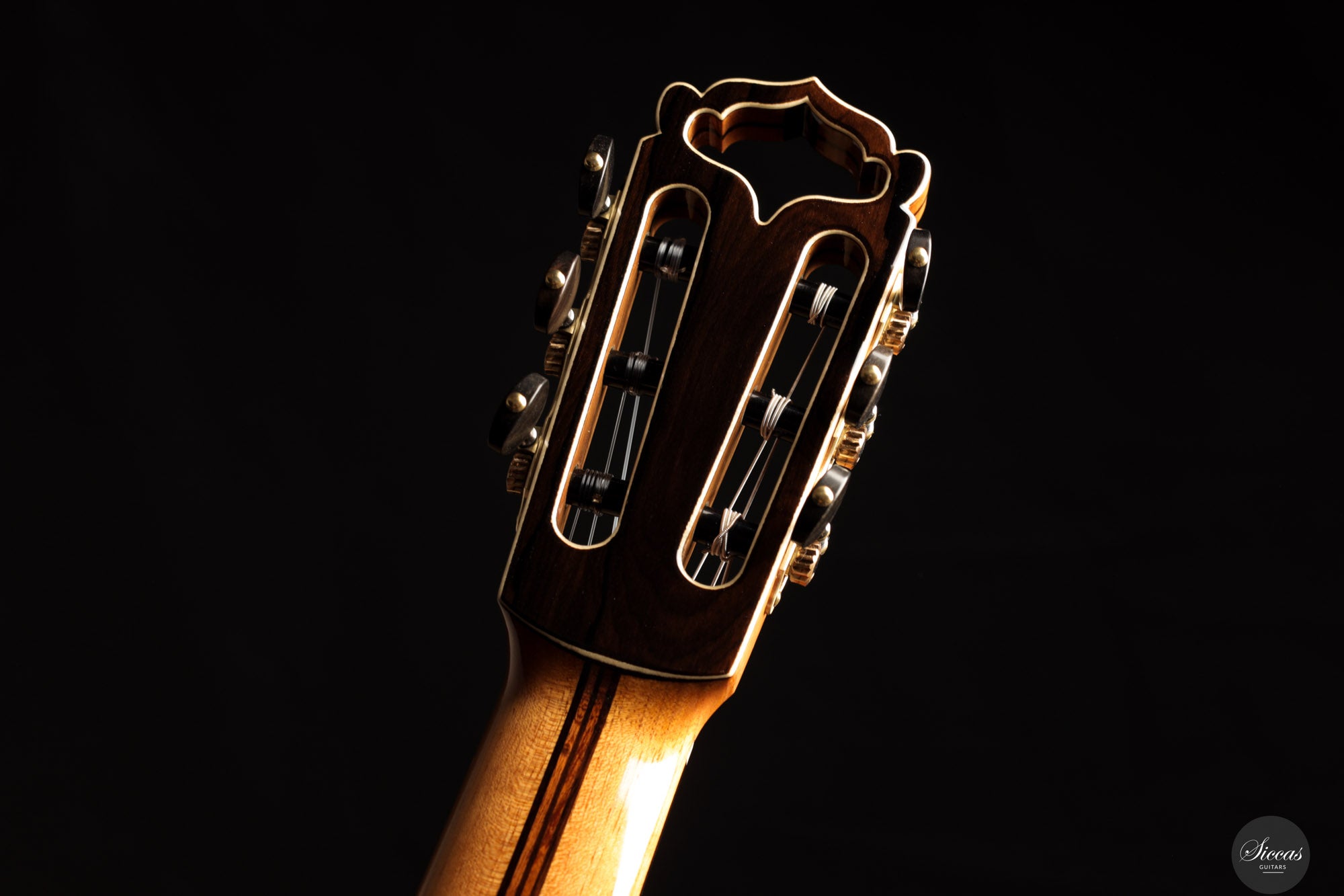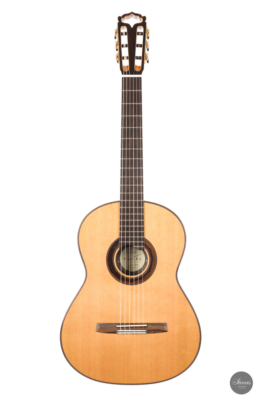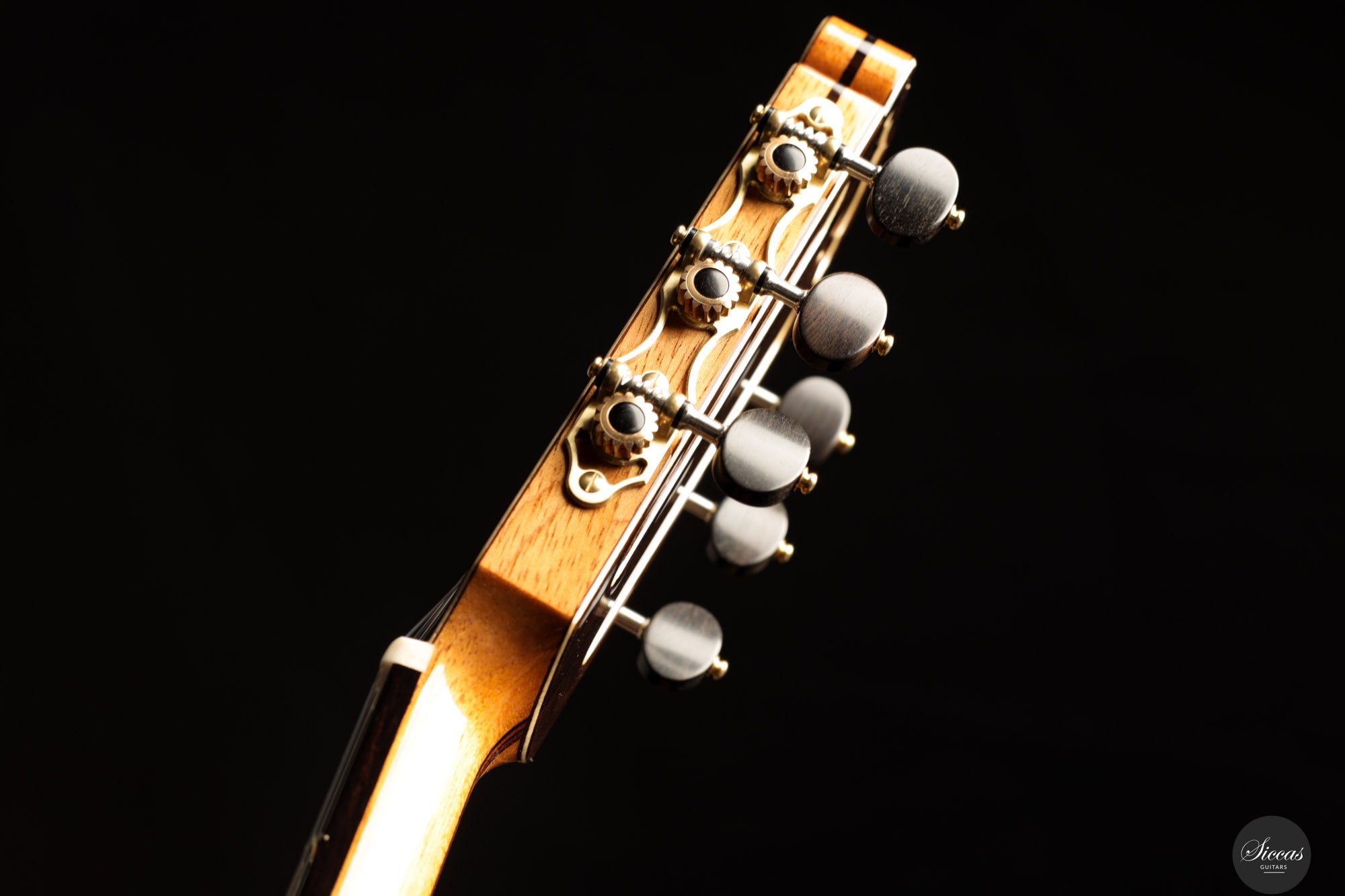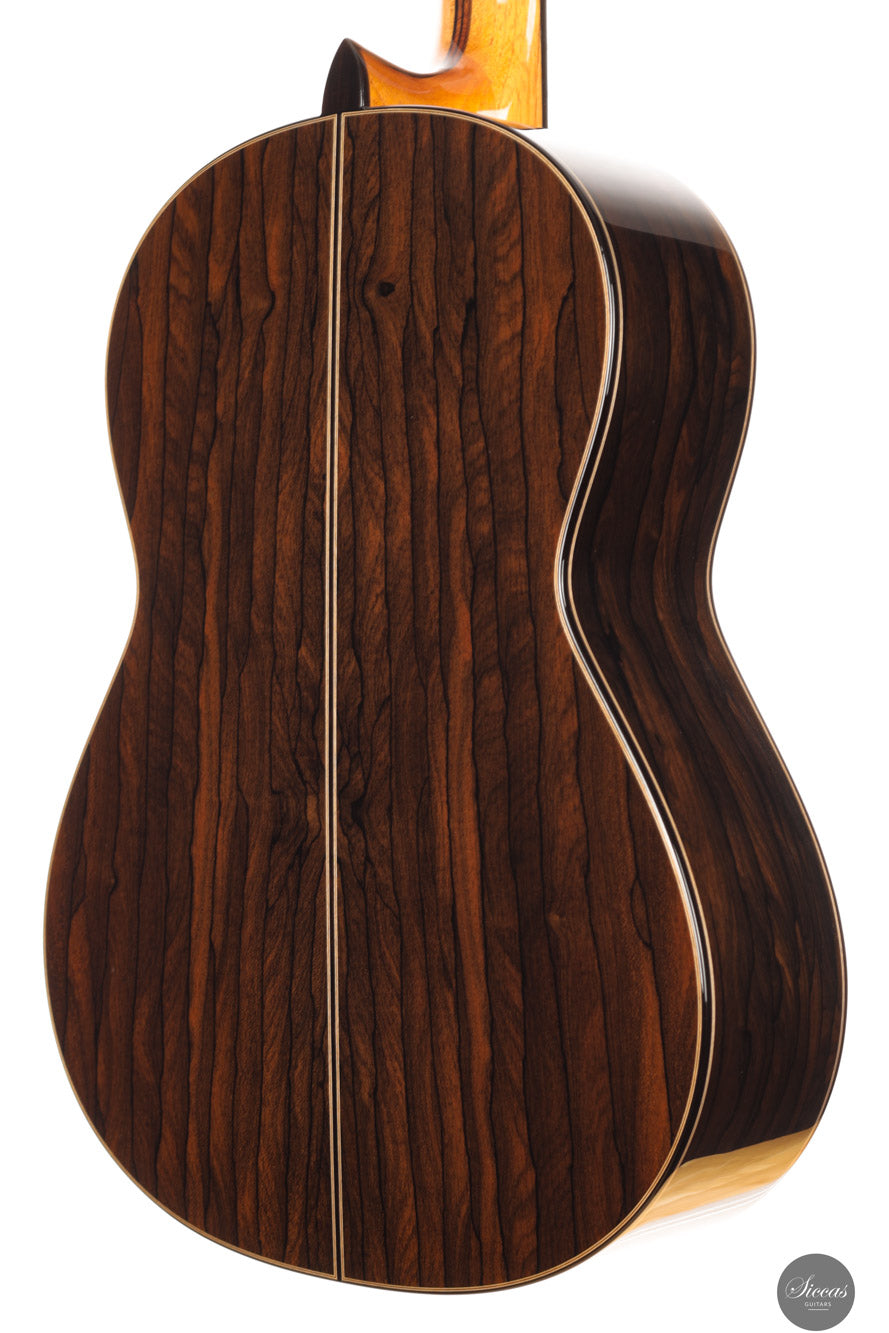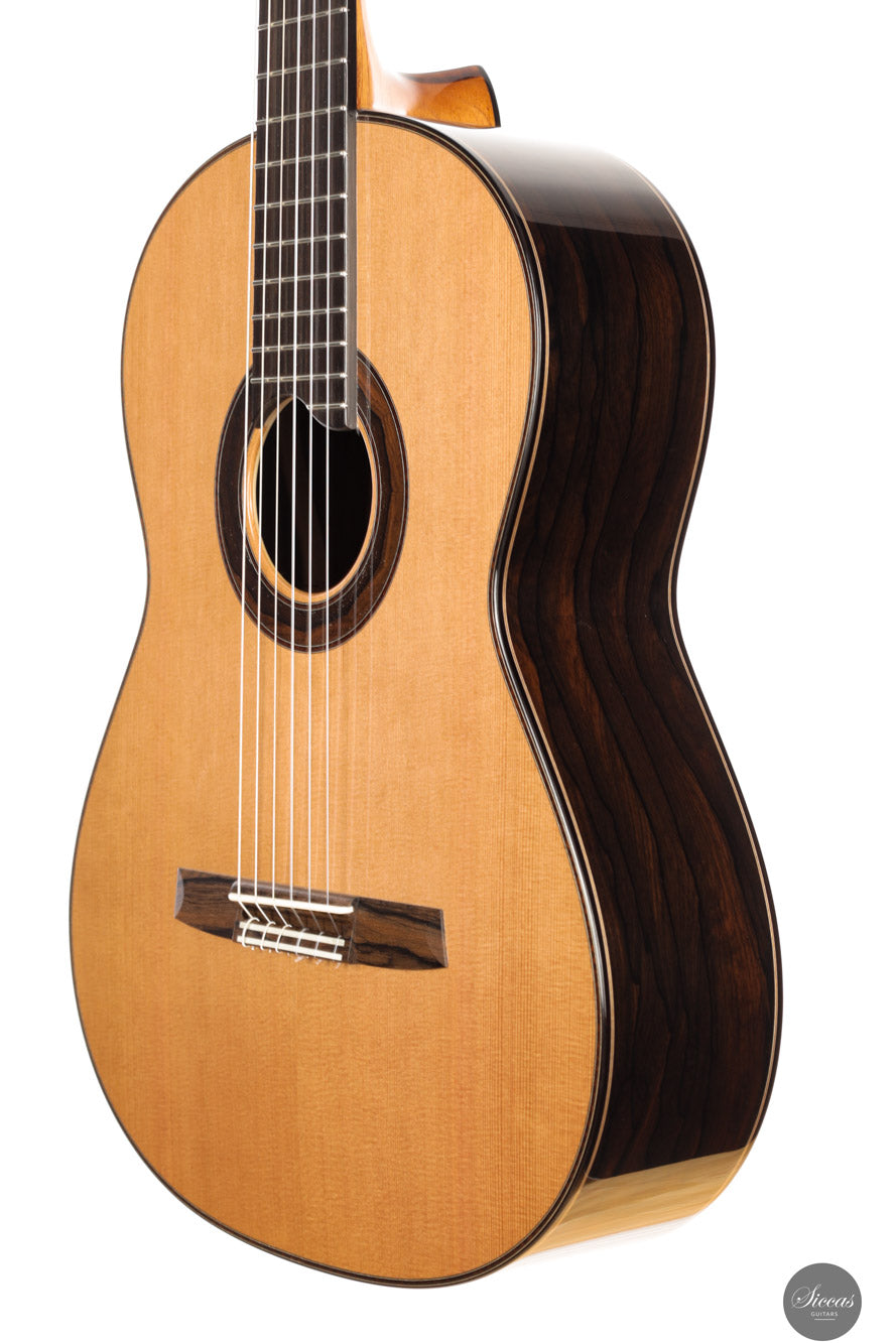 The Hanika HE Torres “New Model” represents the pinnacle of the workshop’s professional line, combining master craftsmanship with refined materials. Built with striking Ziricote back and sides and a select cedar top, it offers both visual elegance and exceptional tonal depth. Its voice is powerful yet nuanced, with excellent dynamics, warm substance, and clear articulation, while maintaining ease of playability and balance across all registers. Designed as a modern interpretation of the Torres tradition, it provides significant volume and responsiveness that meet the demands of virtuoso performance. Outfitted with precision Alessi tuners and a BAM Hightech case, this instrument embodies Hanika’s philosophy of uniting tradition with contemporary innovation in a premium concert guitar.