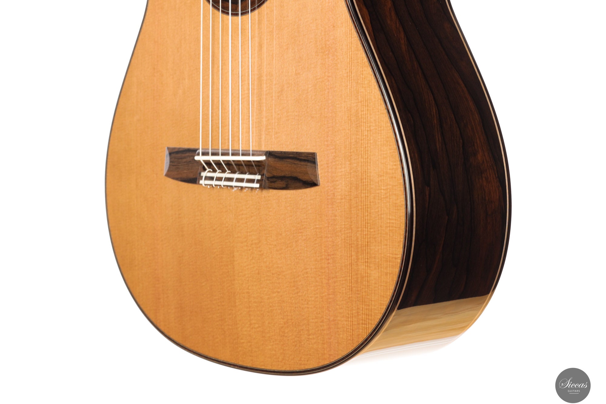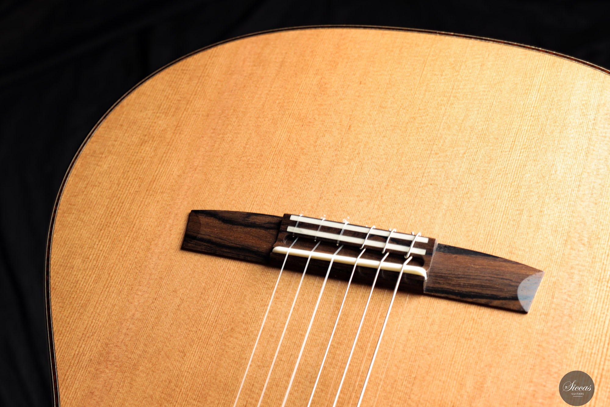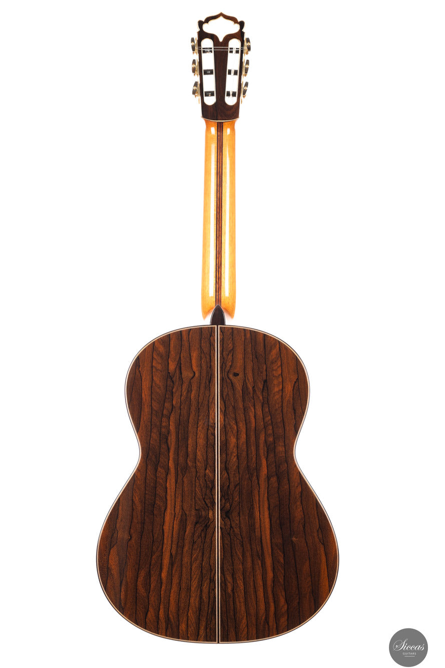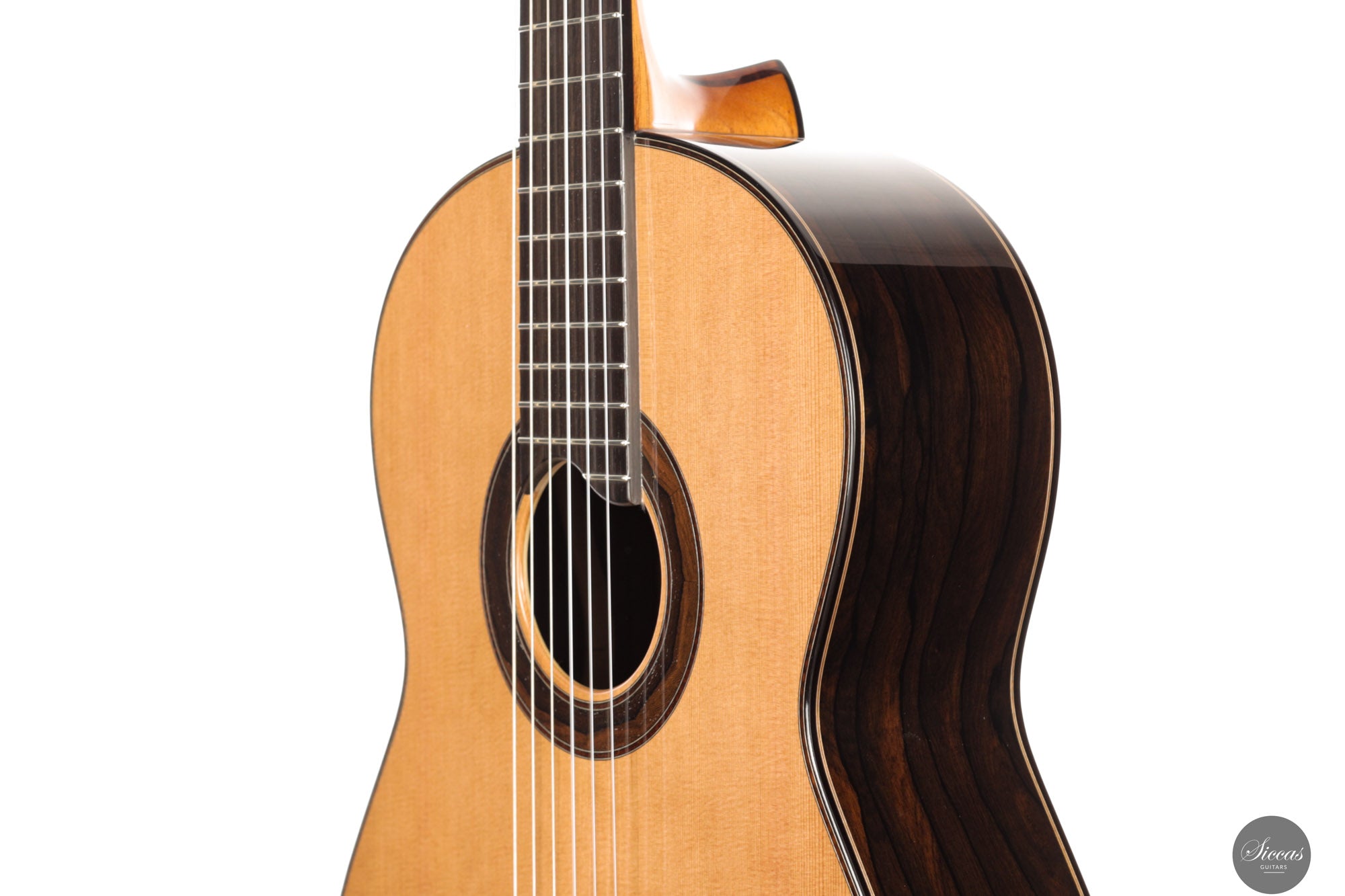 The Hanika HE Torres “New Model” represents the pinnacle of the workshop’s professional line, combining master craftsmanship with refined materials. Built with striking Ziricote back and sides and a select cedar top, it offers both visual elegance and exceptional tonal depth. Its voice is powerful yet nuanced, with excellent dynamics, warm substance, and clear articulation, while maintaining ease of playability and balance across all registers. Designed as a modern interpretation of the Torres tradition, it provides significant volume and responsiveness that meet the demands of virtuoso performance. Outfitted with precision Alessi tuners and a BAM Hightech case, this instrument embodies Hanika’s philosophy of uniting tradition with contemporary innovation in a premium concert guitar.