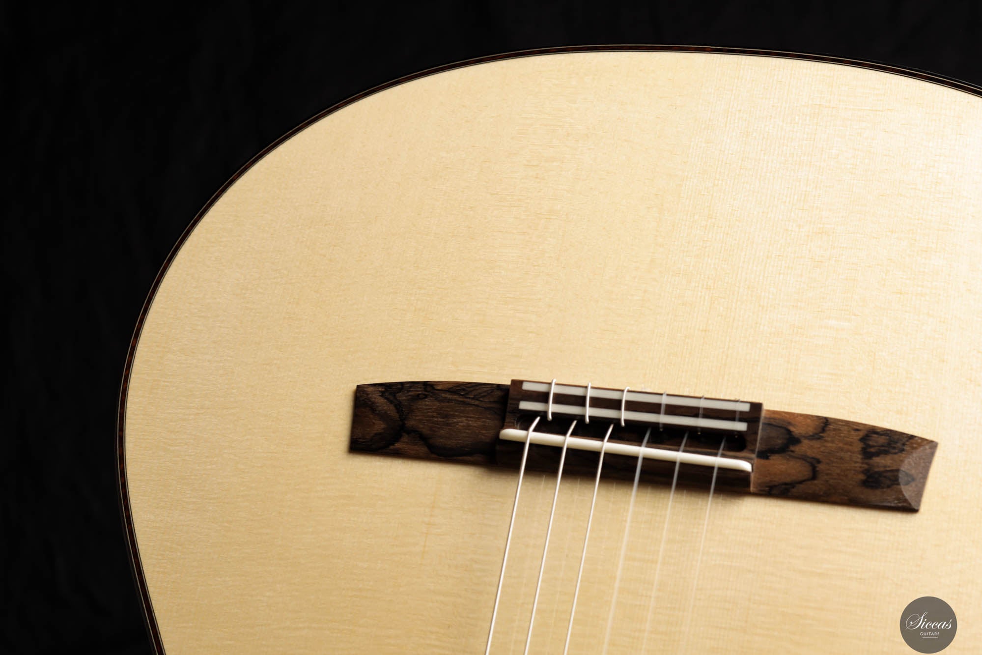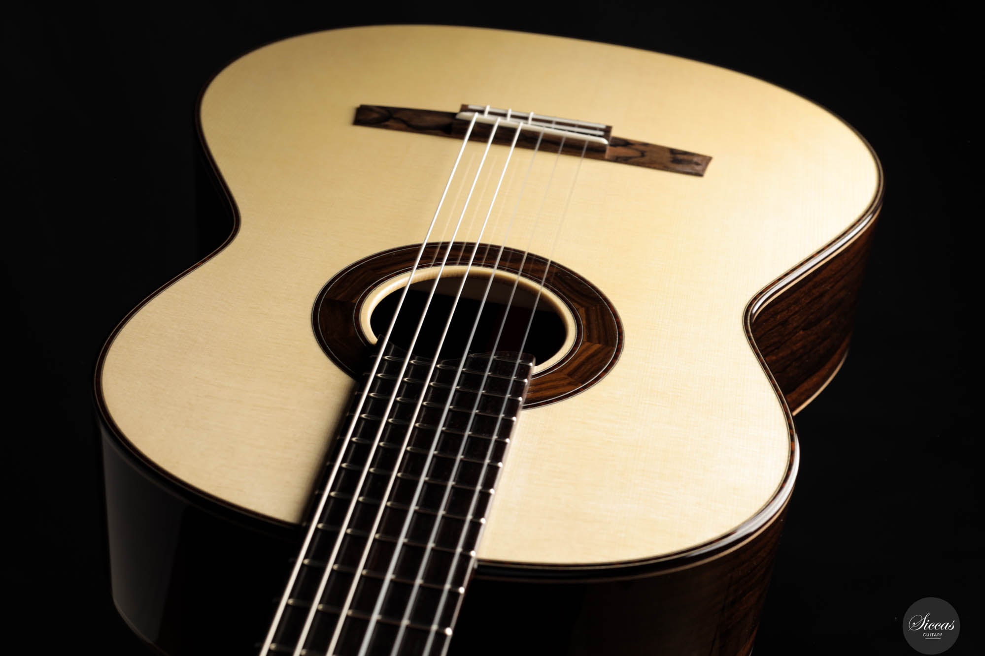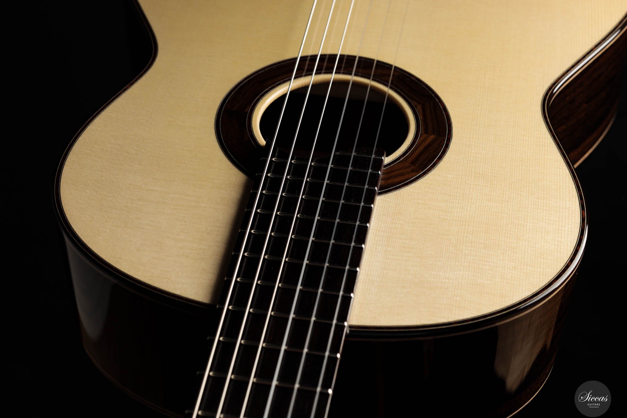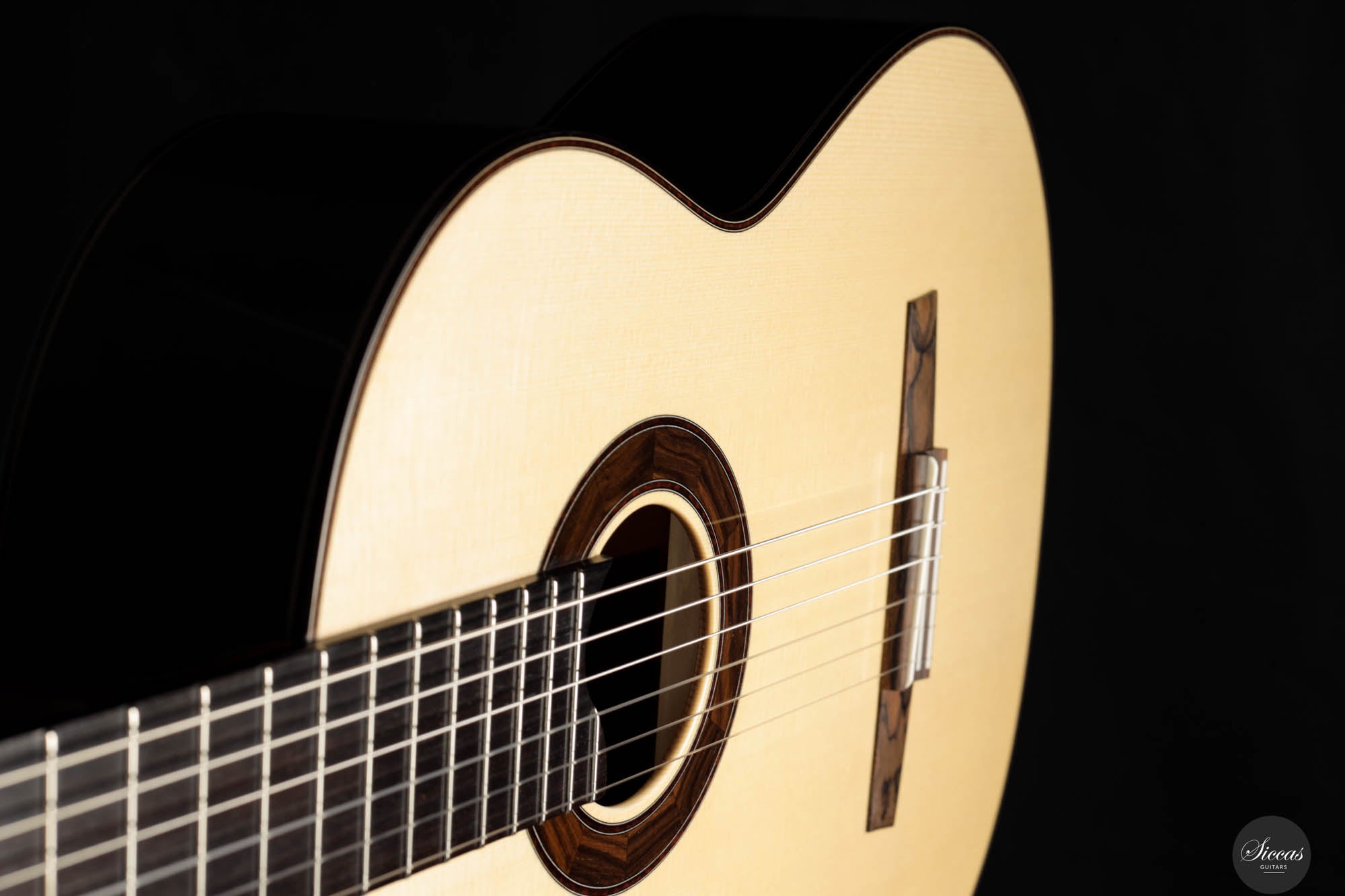Be mindful when touching your instrument with greasy or unwashed hands: any skin contact is a small attack on the varnish. Of course, a guitar is made to be played, but taking a few precautions helps preserve its beauty: wash your hands before playing, wear long sleeves, and avoid unnecessary direct skin contact with the body of the instrument.