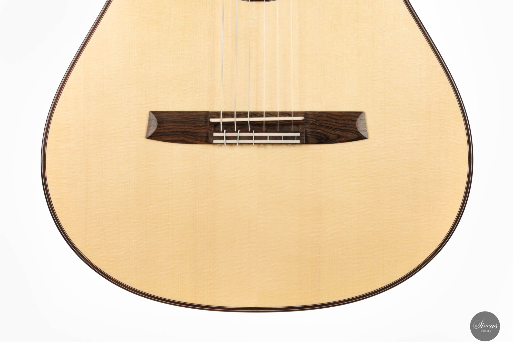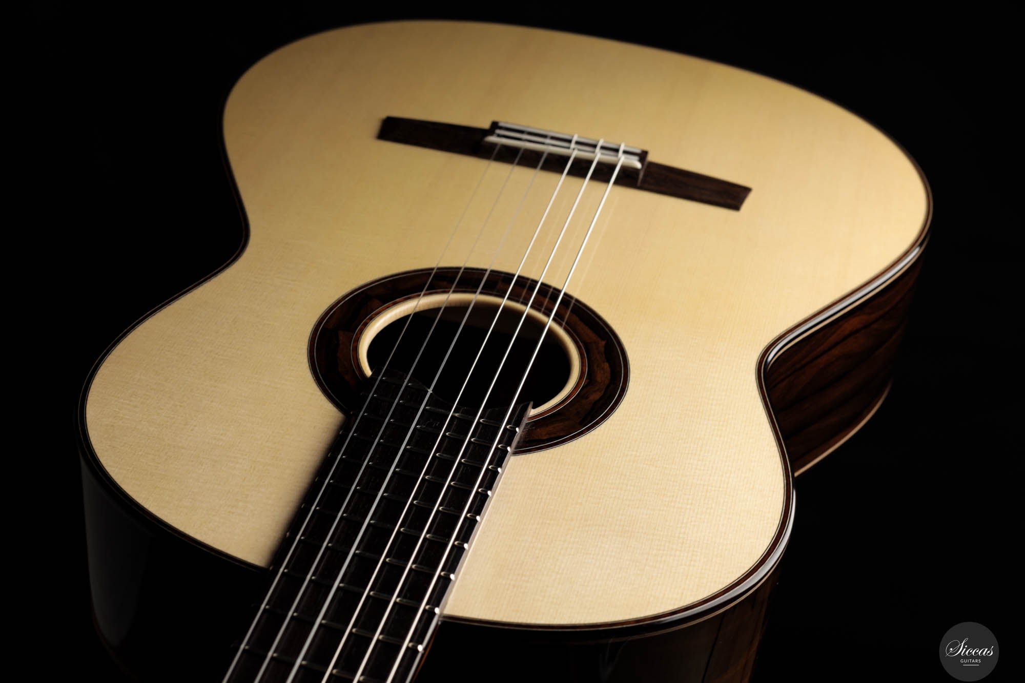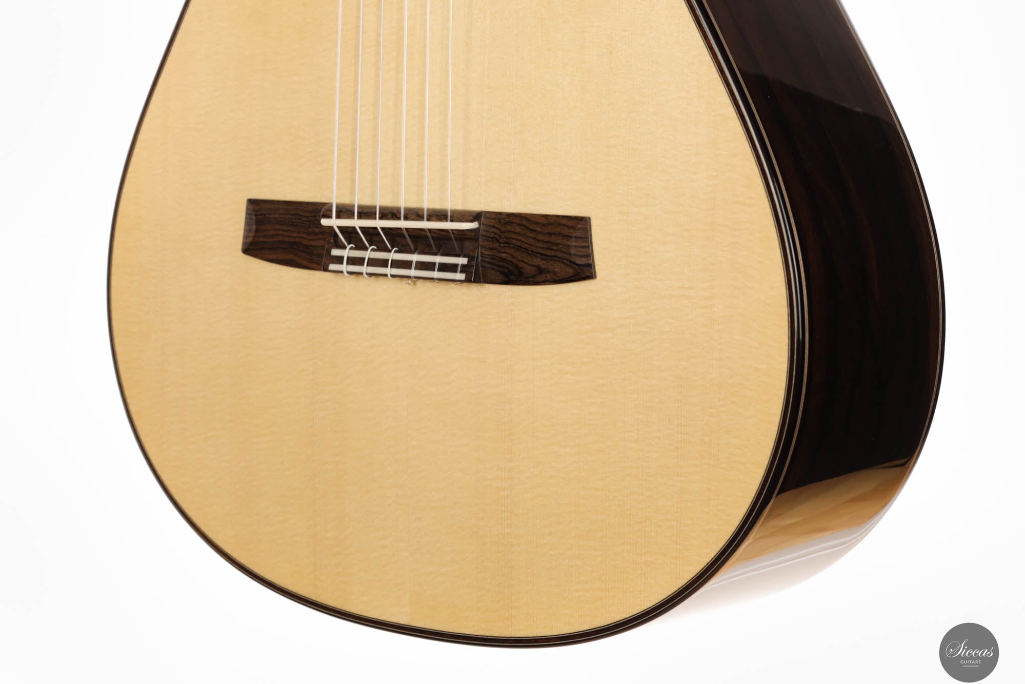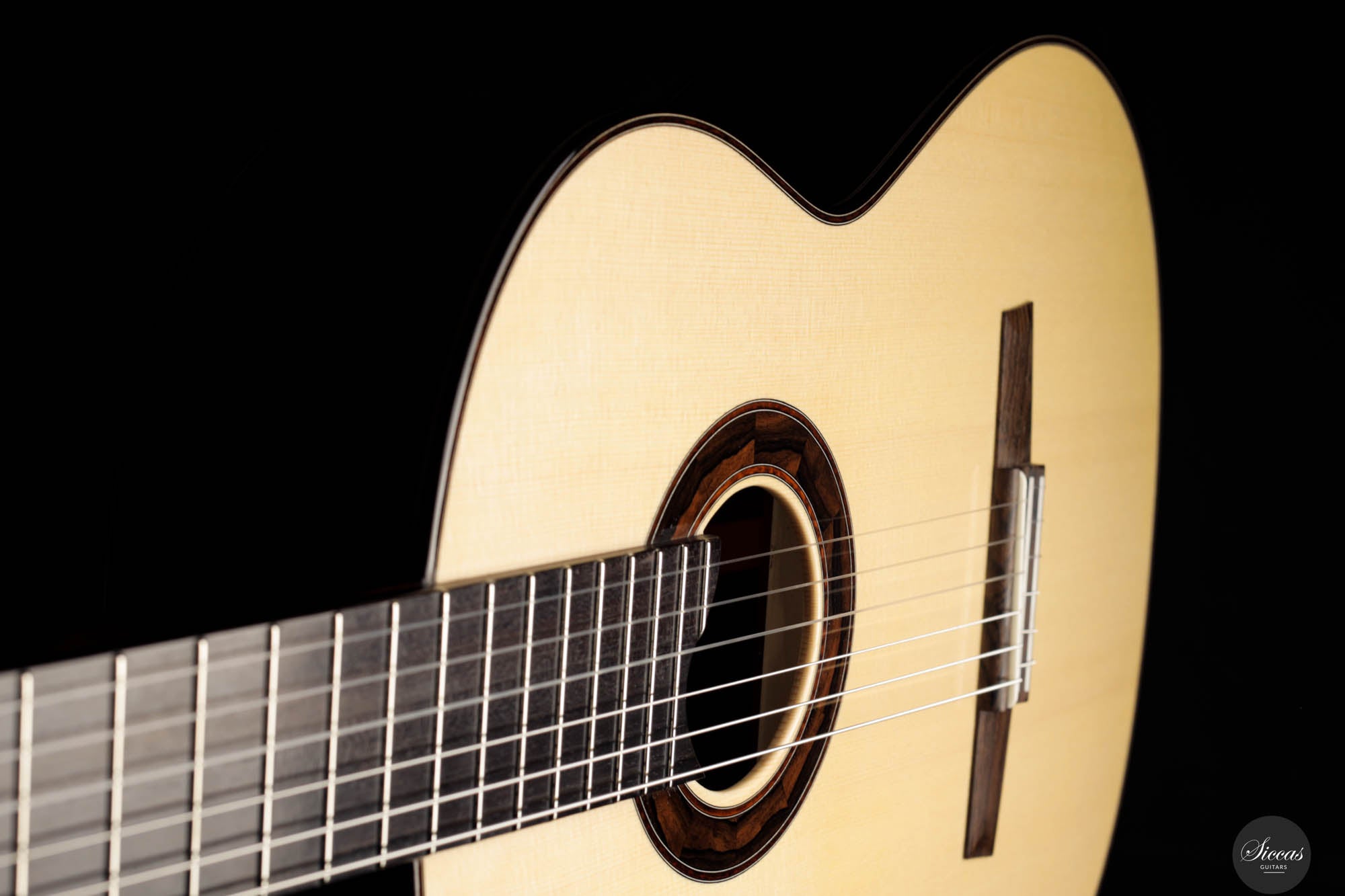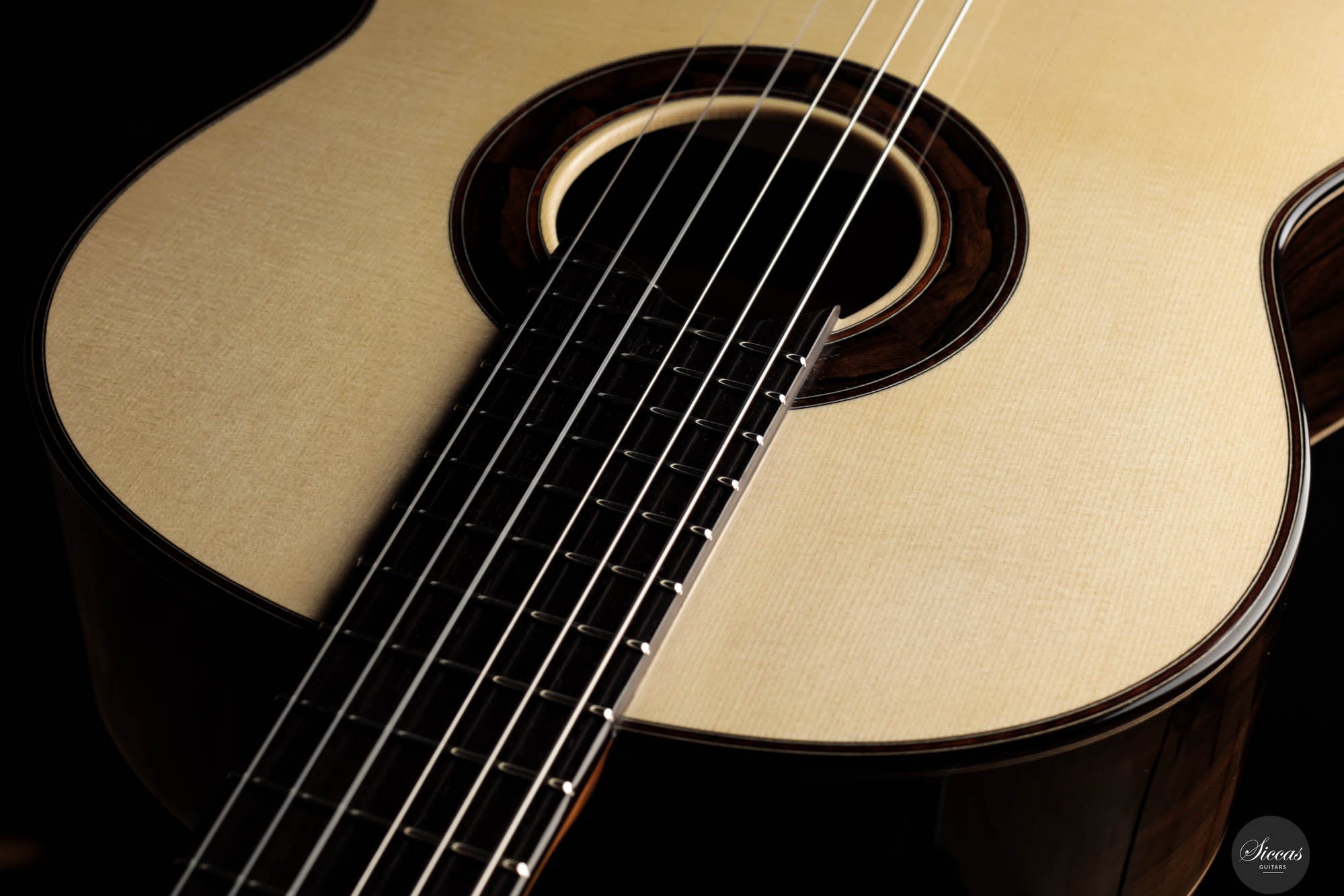 Be mindful when touching your instrument with greasy or unwashed hands: any skin contact is a small attack on the varnish. Of course, a guitar is made to be played, but taking a few precautions helps preserve its beauty: wash your hands before playing, wear long sleeves, and avoid unnecessary direct skin contact with the body of the instrument.