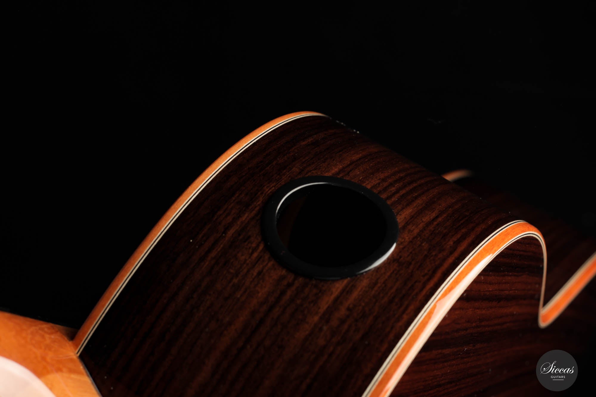 The 7-fold symmetrical domed top bracing provides a particularly resonant and clear sound, while the additional side sound hole in the rim further enhances sound projection. The natural high gloss lends the guitar a noble shine, accentuating its elegance.