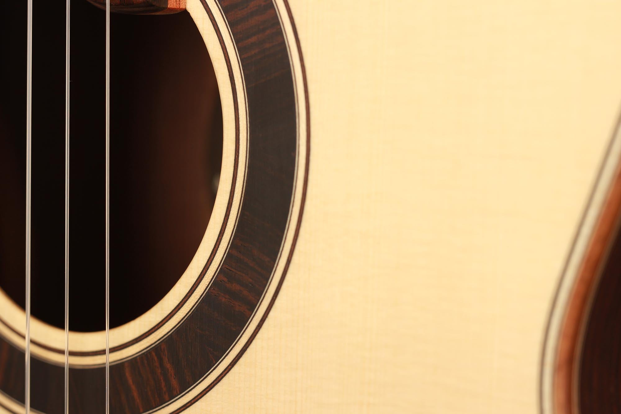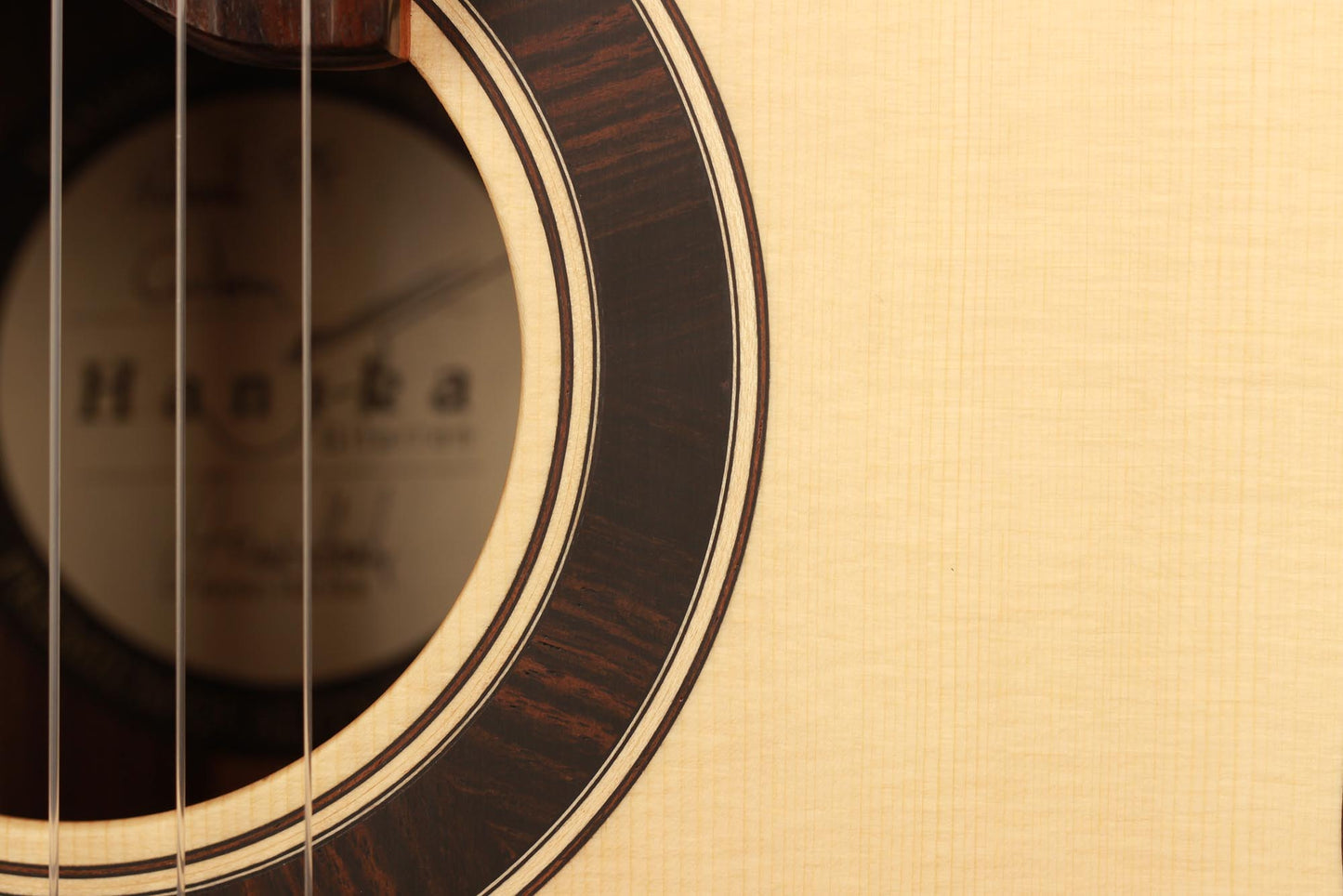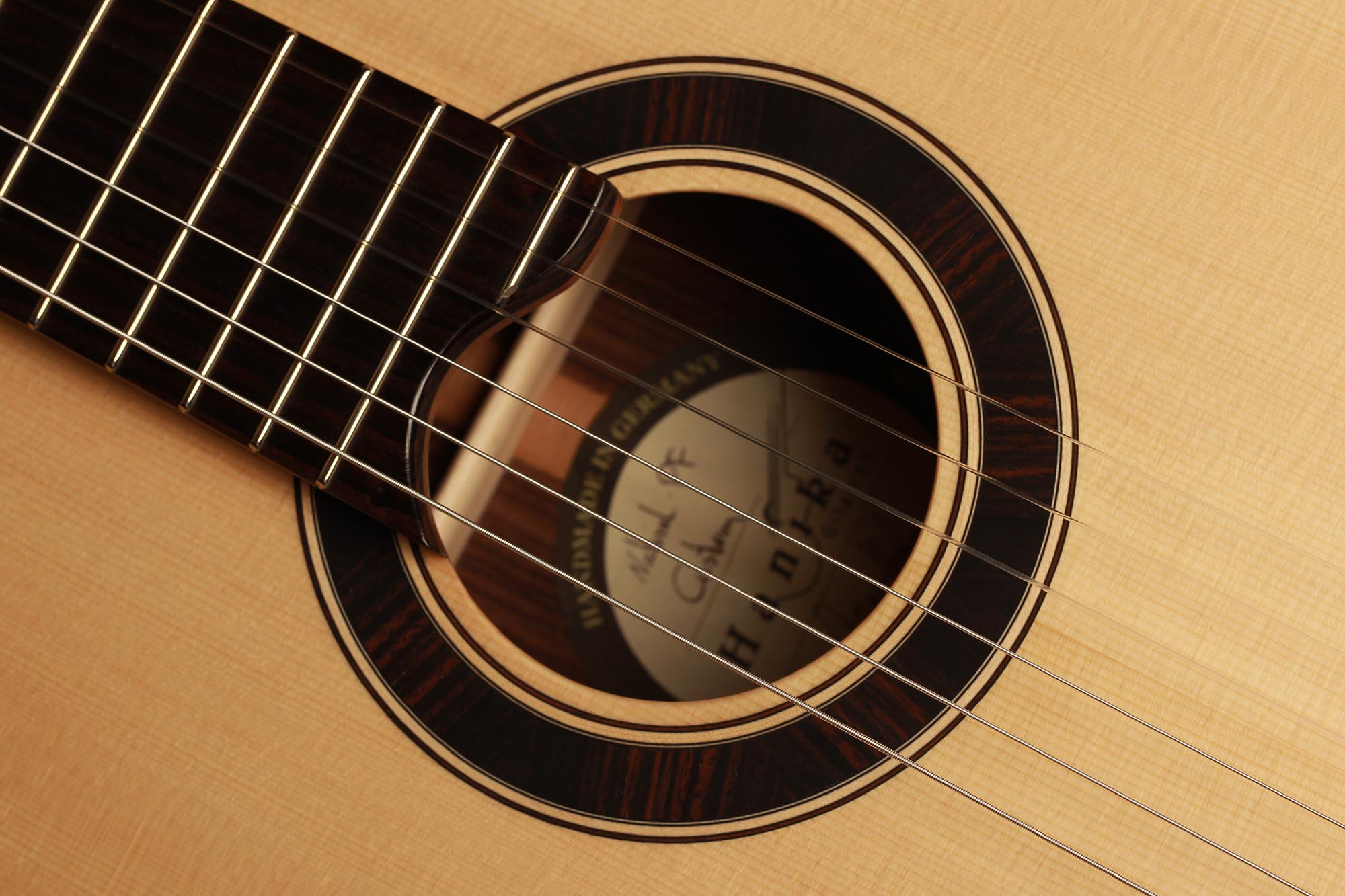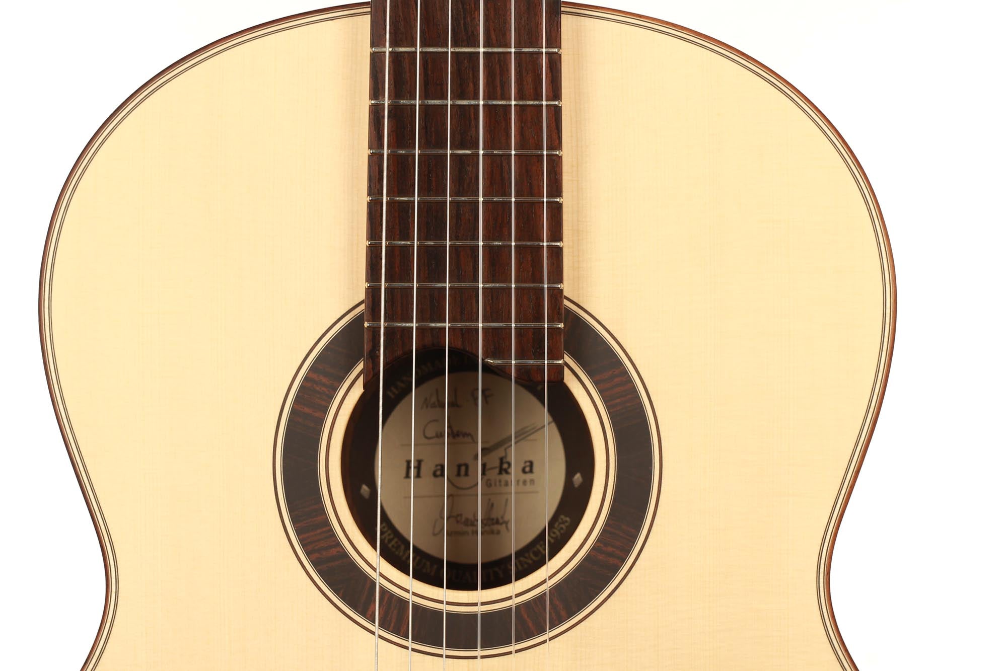 This “Natural PF Custom” guitar is a unique instrument, that bridges the gap between the "Natural" line and the "New Century" line of Armin Hanika. It is built with a traditional seven fan bracing construction and a spruce top. The finish is natural matt with open pores, which is the usual treatment for Hanika guitars of this line. However, this guitar has an elevated fingerboard which is a unique feature for this model.
