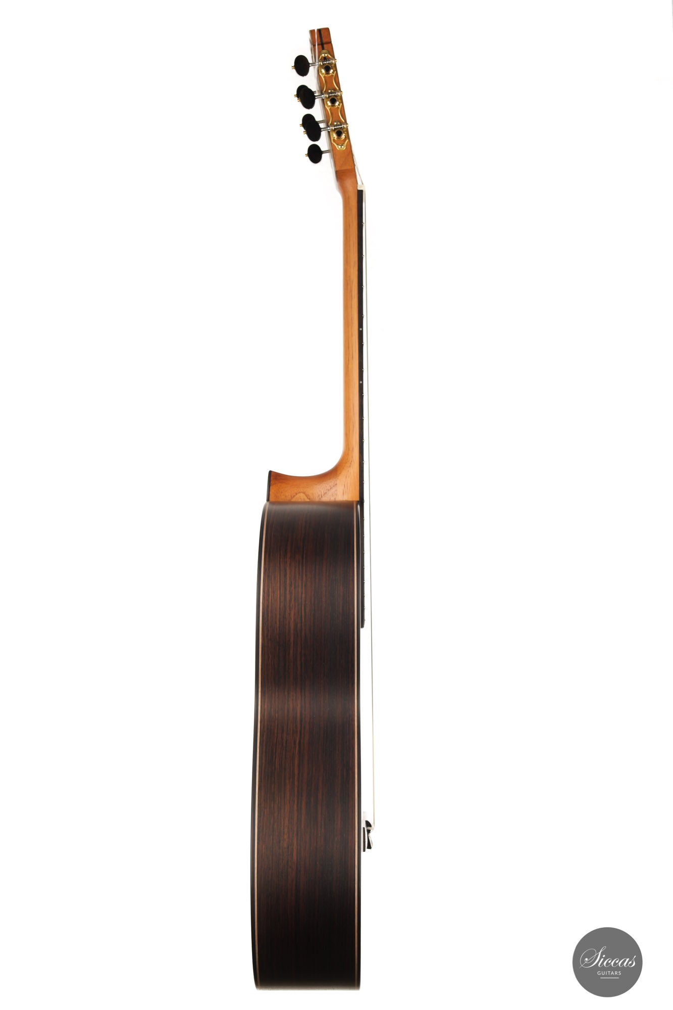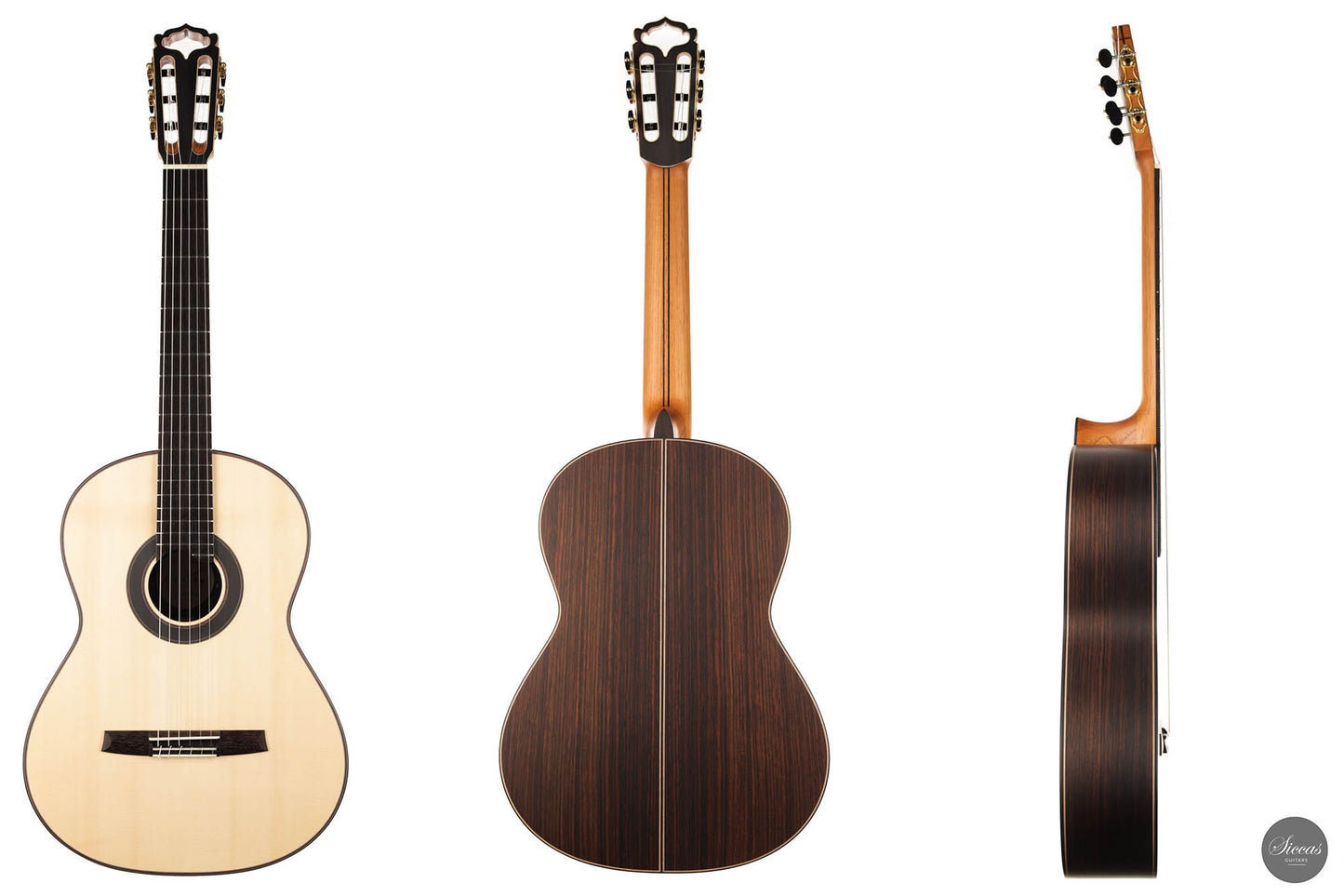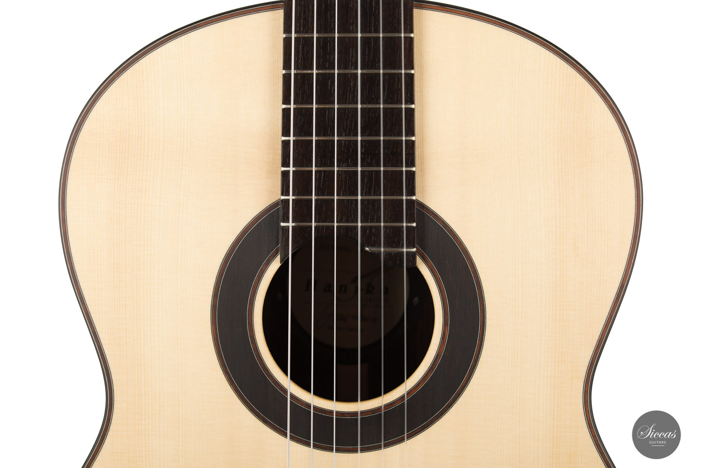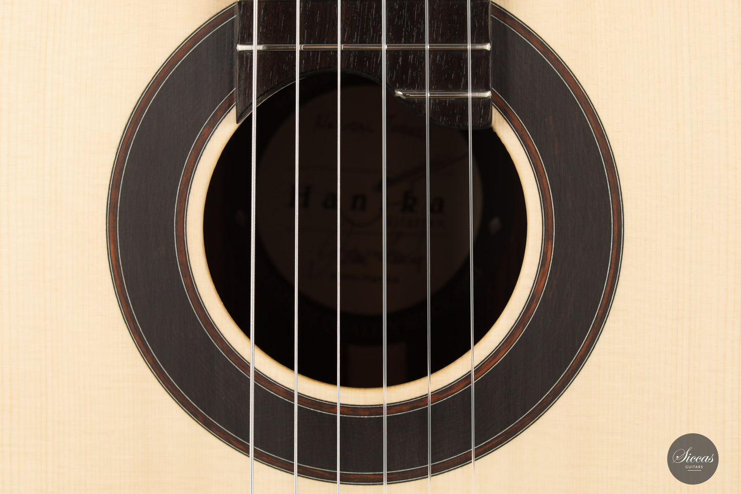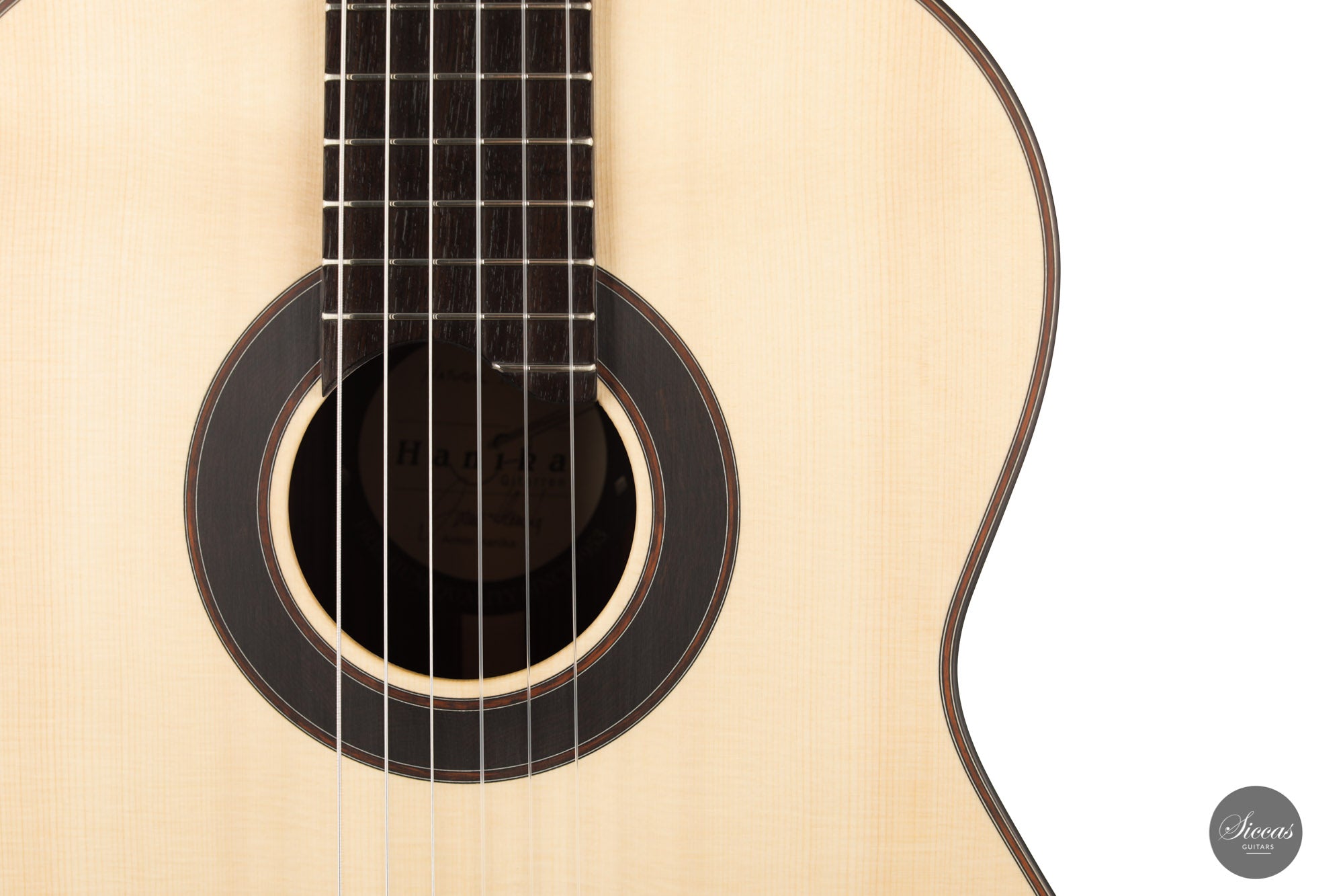The Hanika Natural Torres combines East Indian rosewood back and sides with a fine spruce top, creating a guitar with a full, resonant sound, strong attack and clear separation. Its balanced response and sustain make it versatile for a wide range of playing styles, while the thin “Natural” varnish and wax sealing protect the surface without compromising openness or transparency of tone. Refined details such as Alessi tuners with ebony knobs, a reinforced Cedro neck, African blackwood fingerboard and a three-layer rosewood-maple-rosewood headstock highlight the craftsmanship. Delivered with a Hiscox Pro II case, this model offers professional quality with a focus on essential performance.