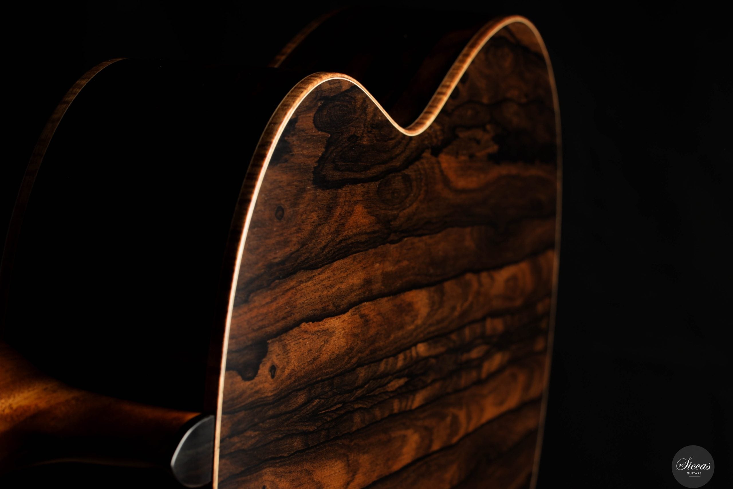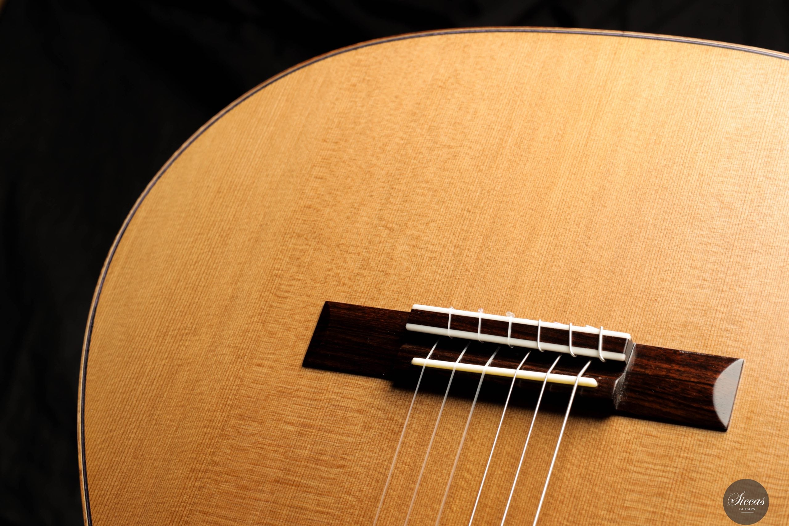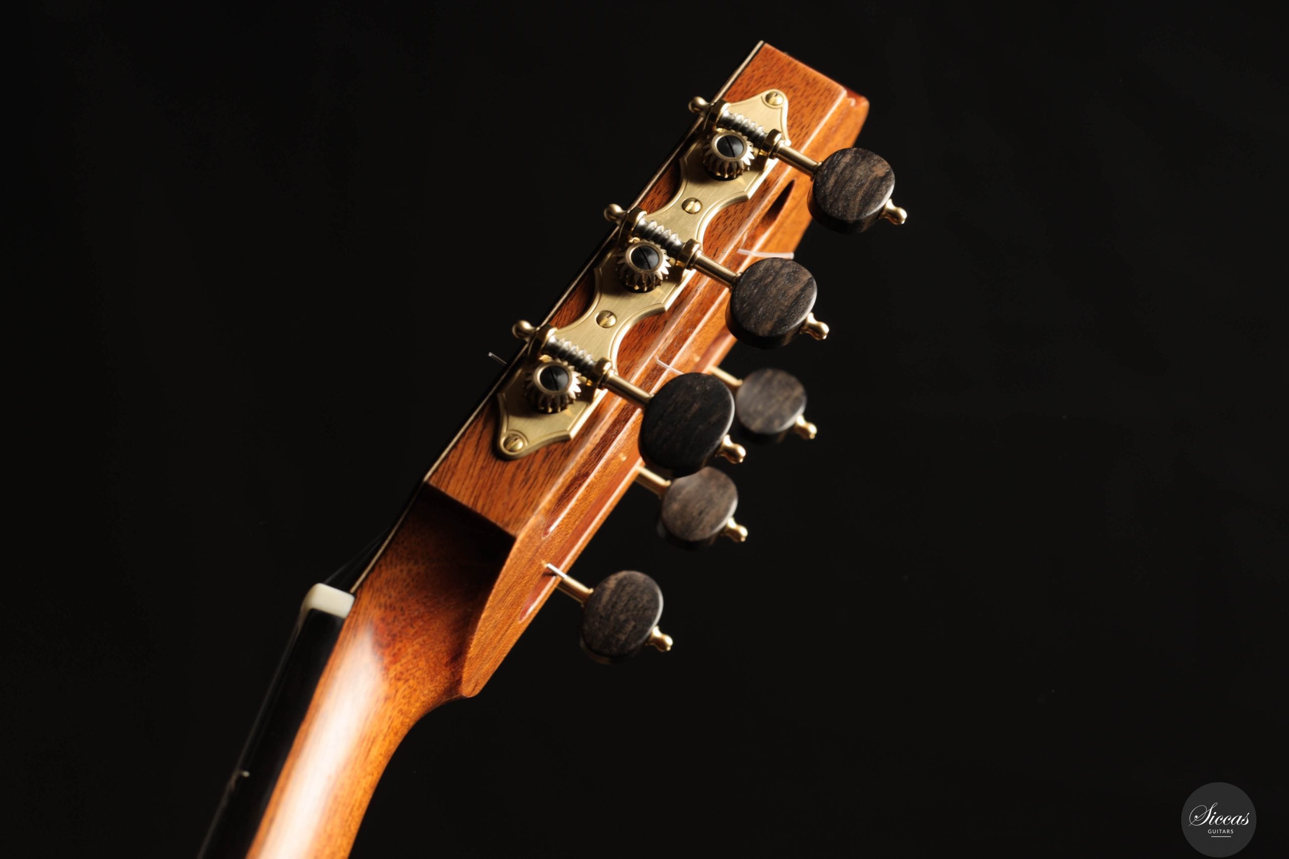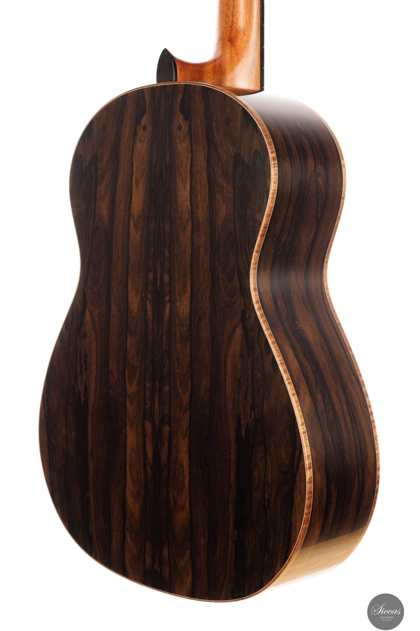 The back and sides are made of dramatic Ziricote, known for its density, sustain, and dark tonal characteristics. The finish is a very thin application of nitrocellulose lacquer, chosen by the luthier for its durability and ability to fuse into a continuous layer, much like shellac. Though once hesitant to use this finish, Sanders has developed a refined method involving fewer coats to ensure safety in application while maintaining tonal transparency. The scale is 650 mm, with a 51 mm nut width. The guitar weighs 1970 grams and is equipped with Kris Barnett tuners and Knobloch EDC 34.0 strings.