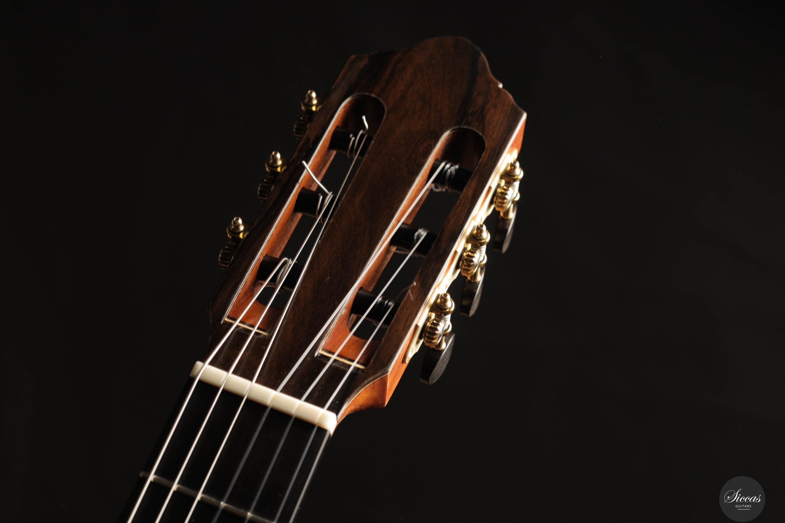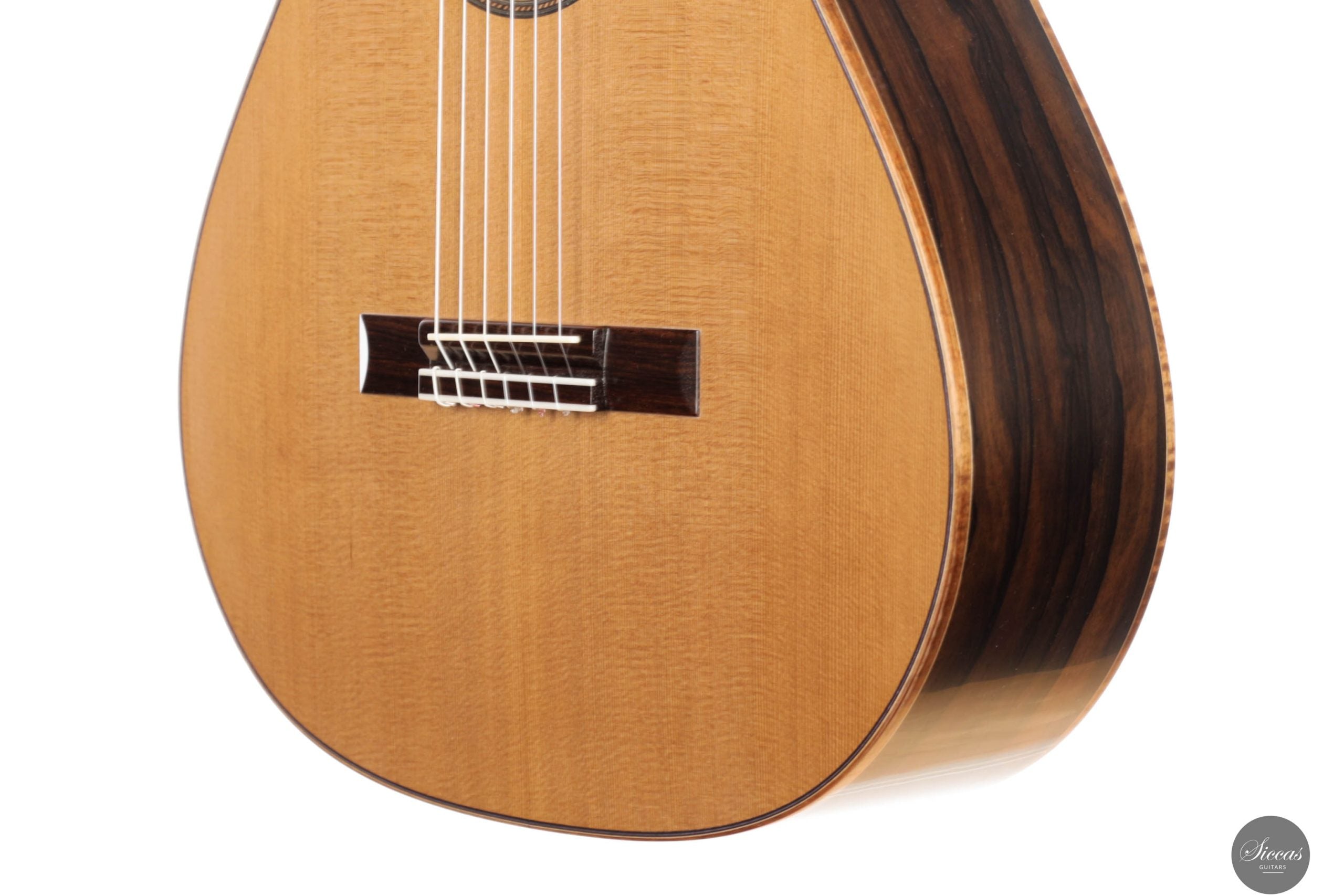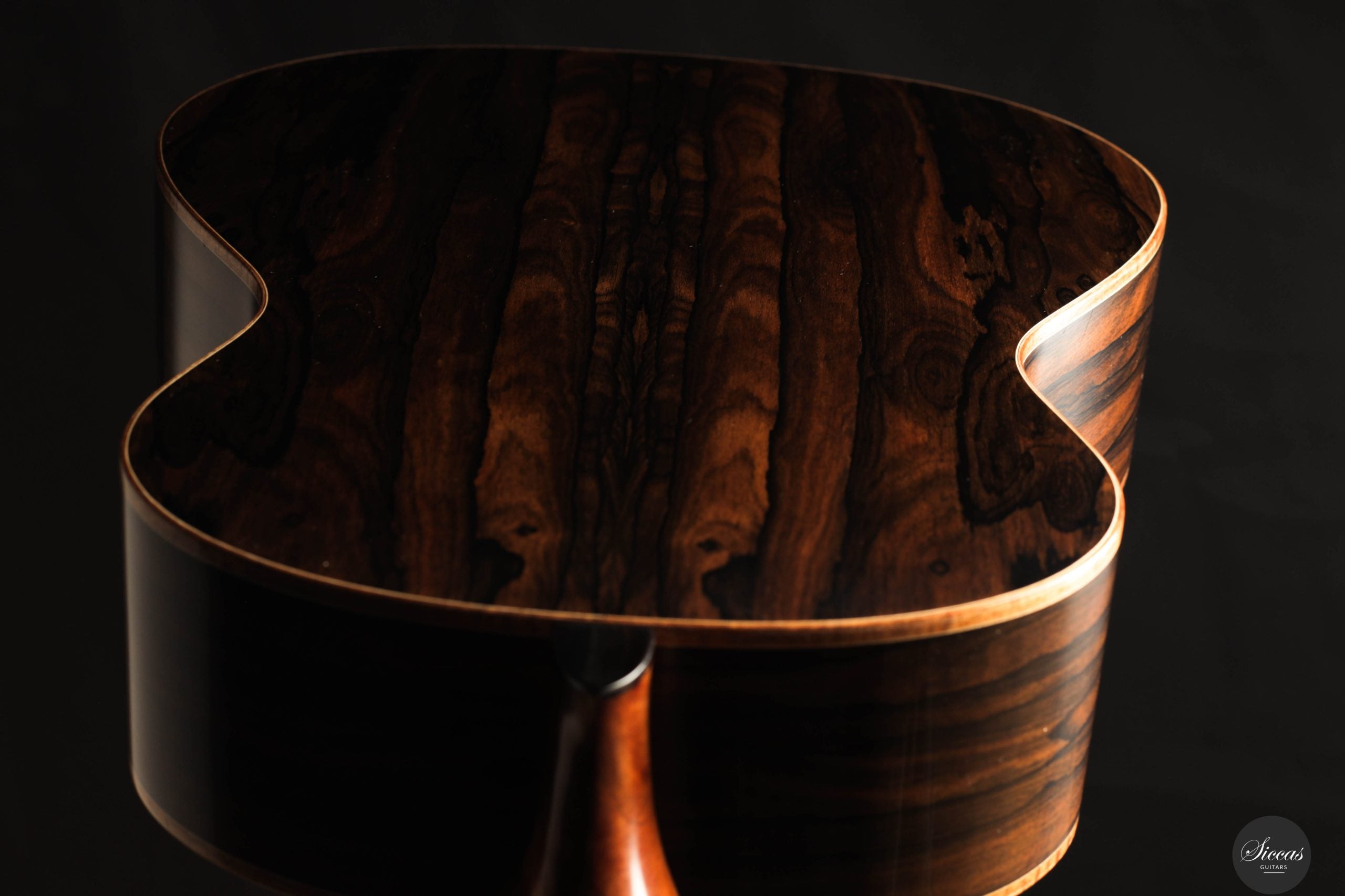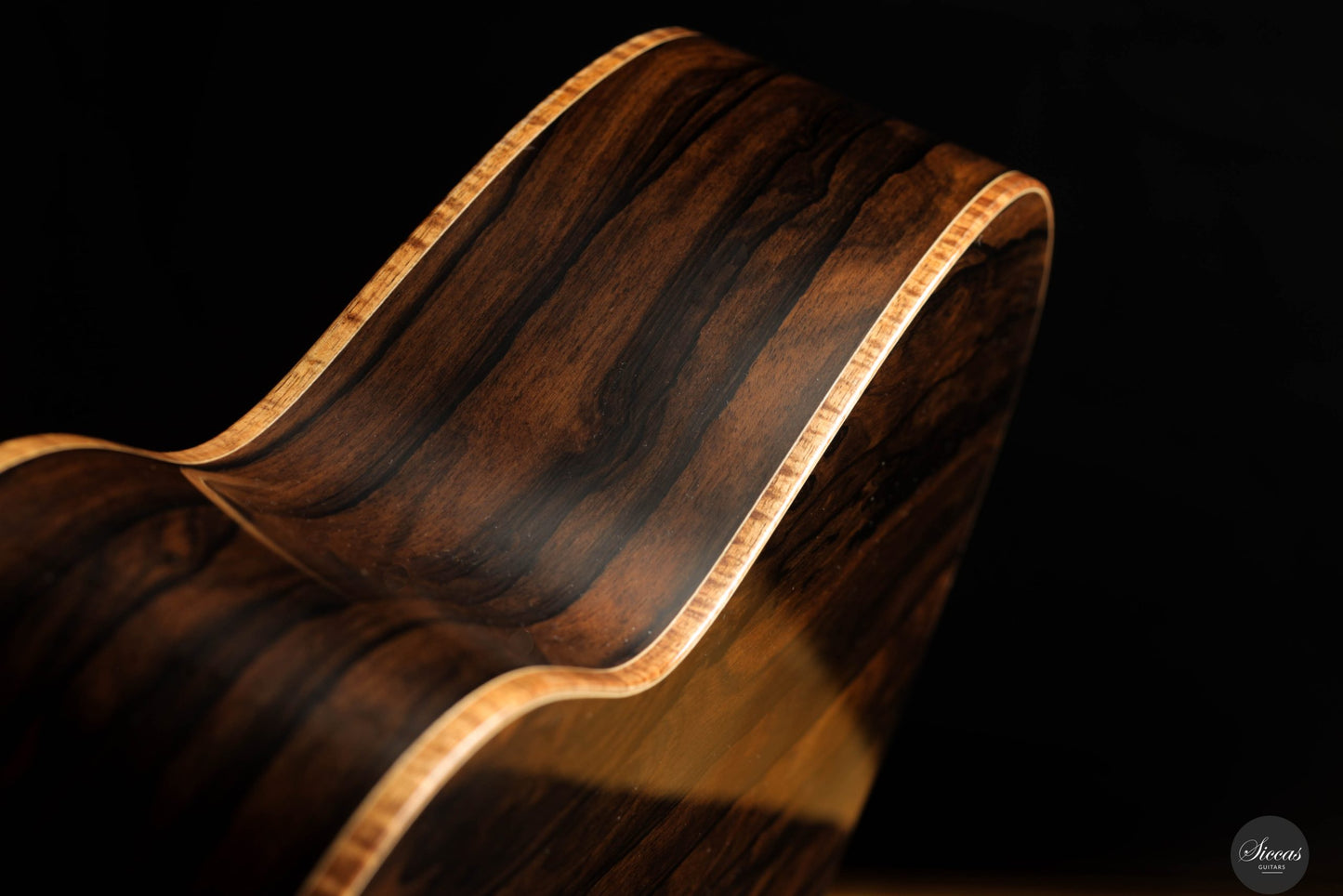 The back and sides are made of dramatic Ziricote, known for its density, sustain, and dark tonal characteristics. The finish is a very thin application of nitrocellulose lacquer, chosen by the luthier for its durability and ability to fuse into a continuous layer, much like shellac. Though once hesitant to use this finish, Sanders has developed a refined method involving fewer coats to ensure safety in application while maintaining tonal transparency. The scale is 650 mm, with a 51 mm nut width. The guitar weighs 1970 grams and is equipped with Kris Barnett tuners and Knobloch EDC 34.0 strings.