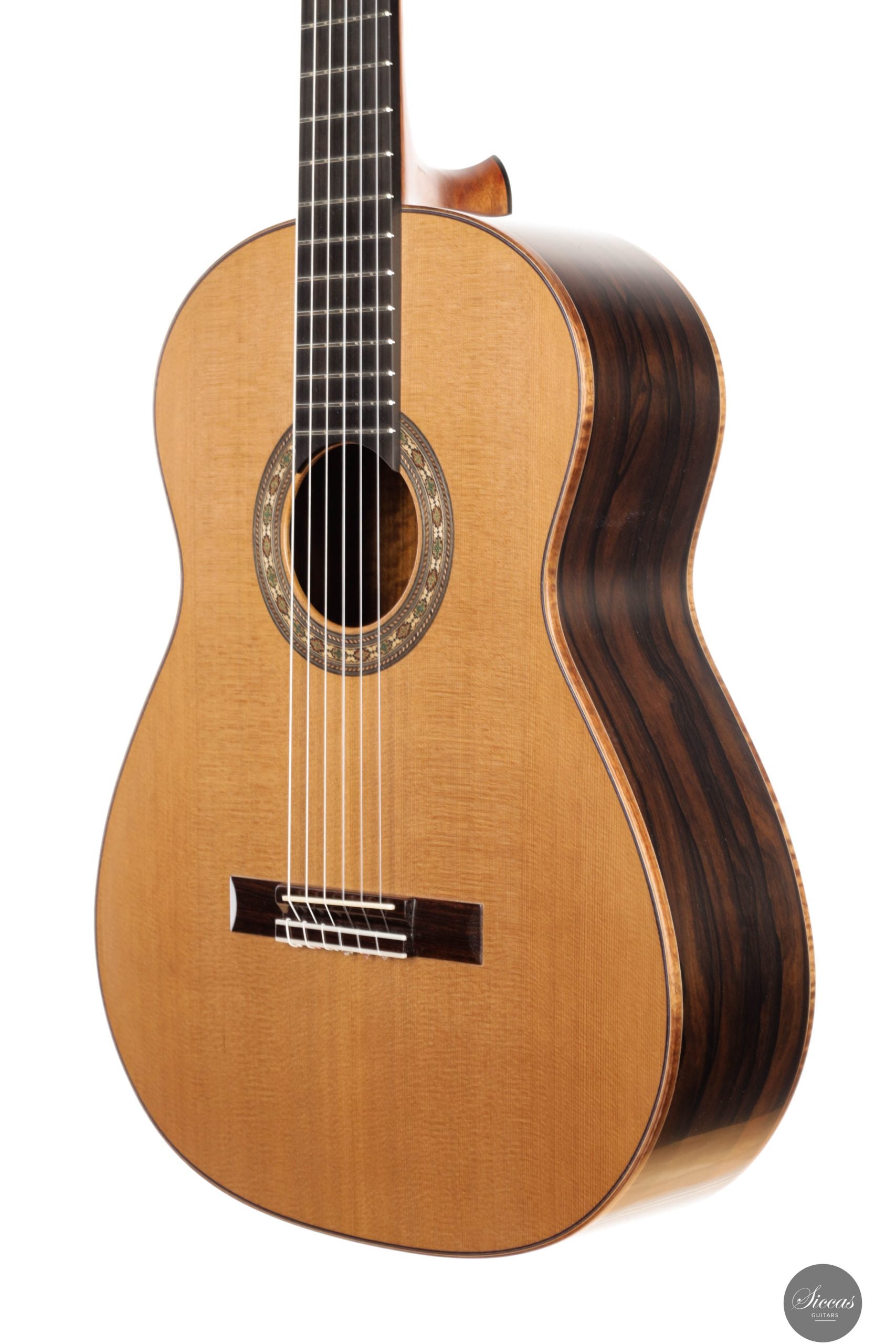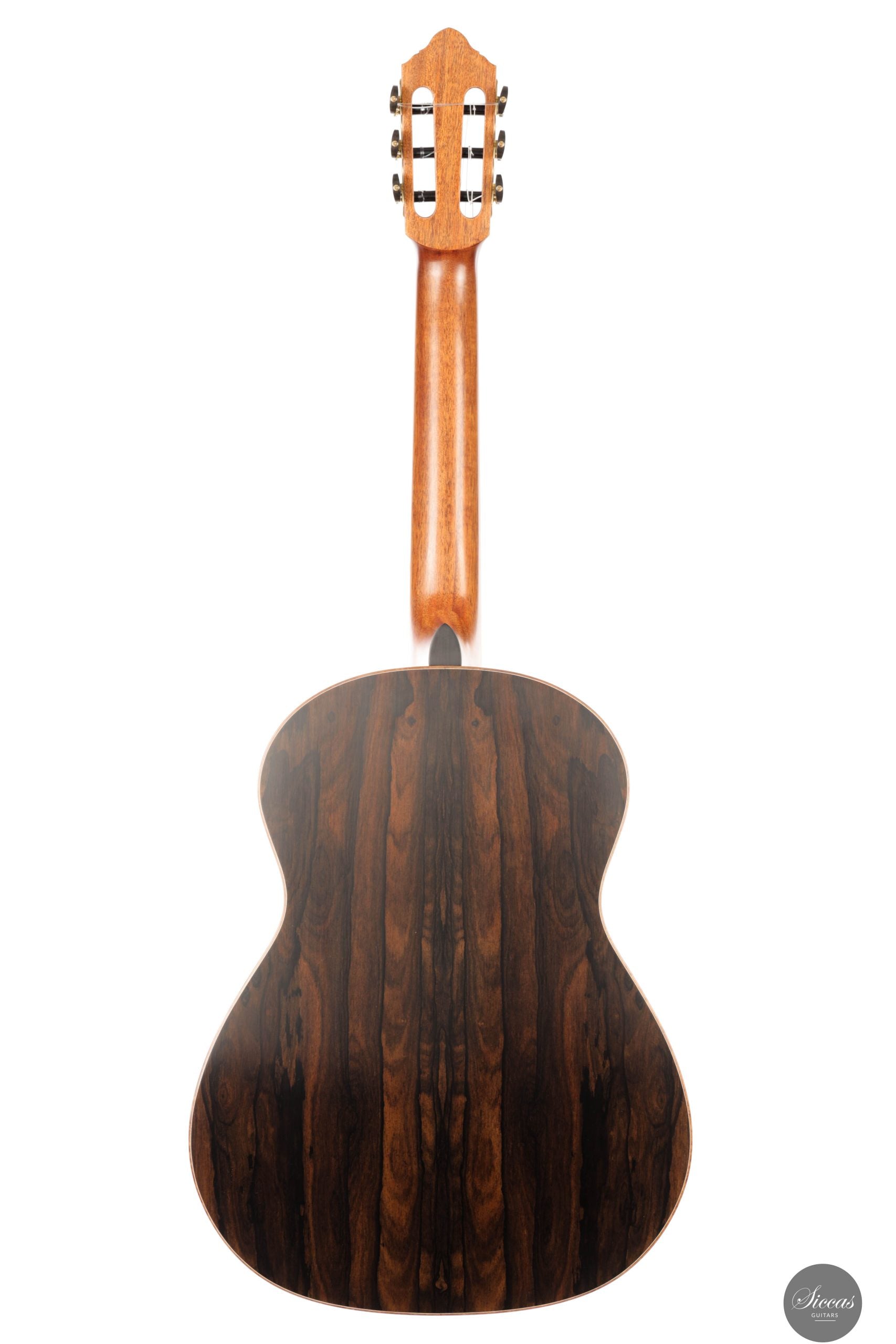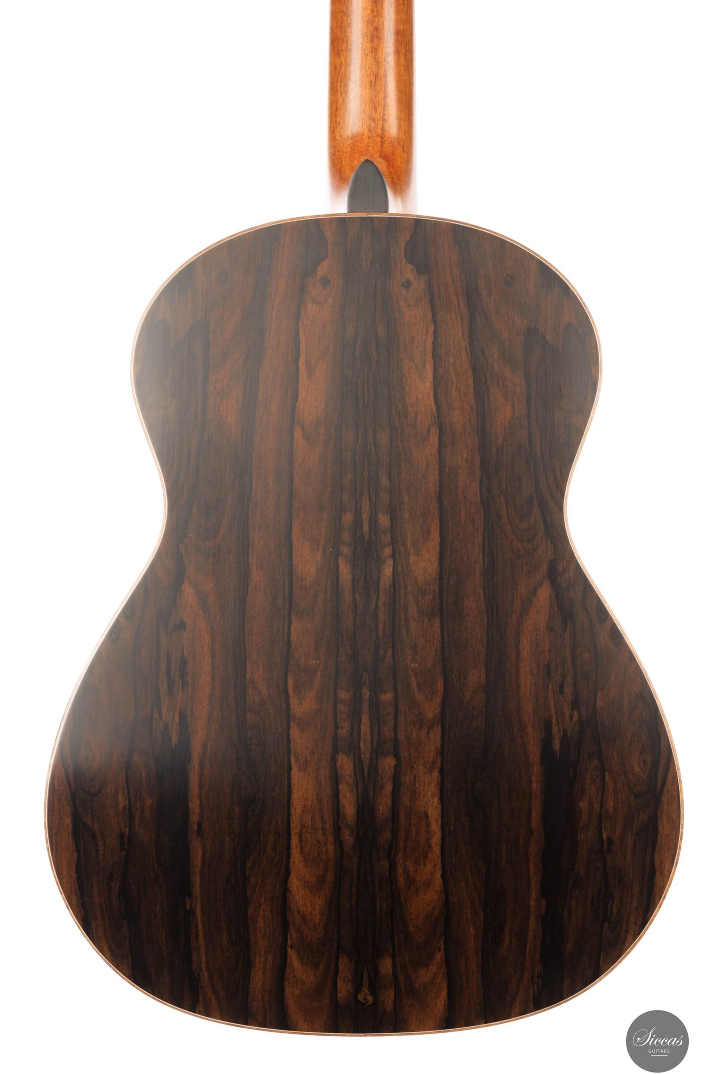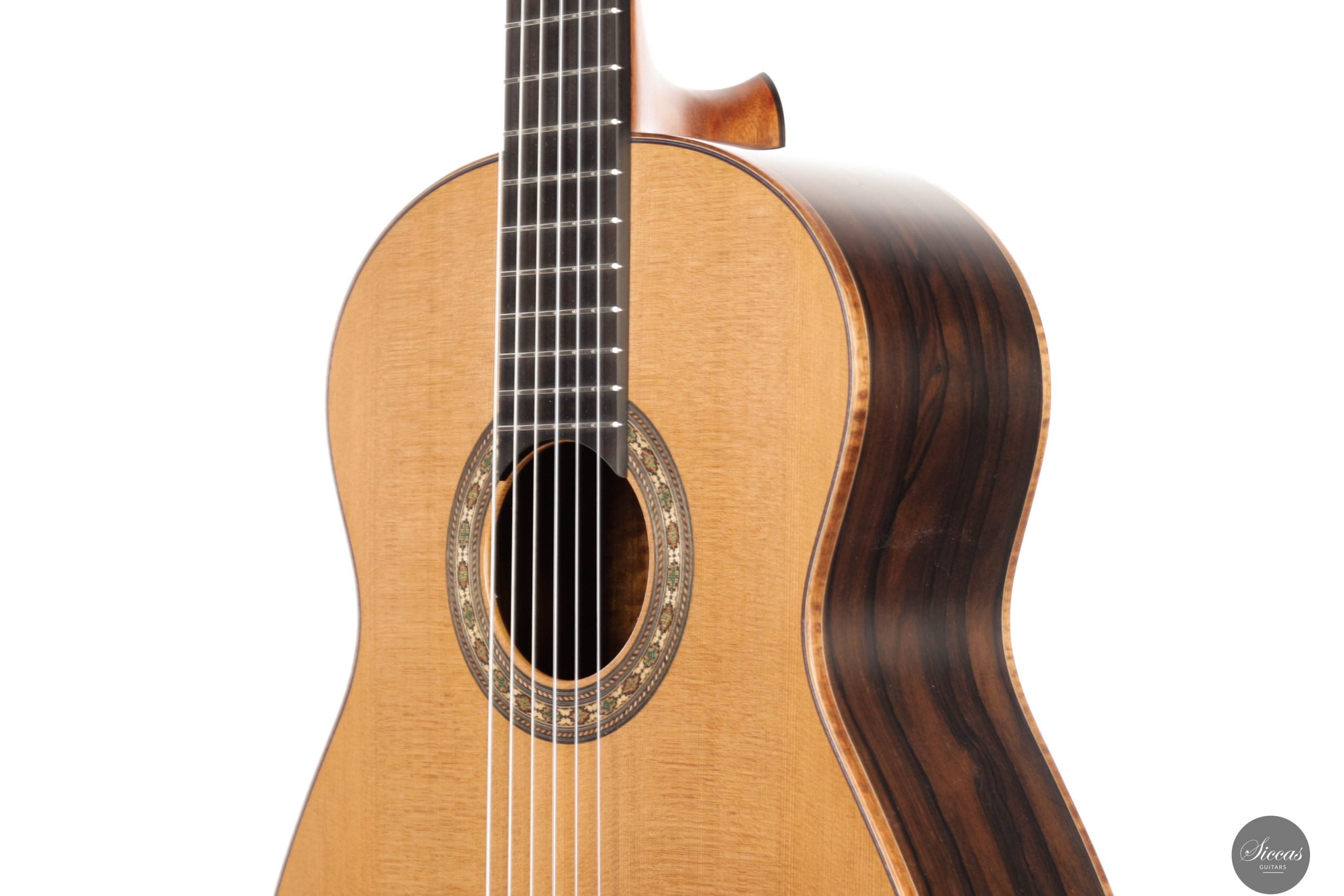 The back and sides are made of dramatic Ziricote, known for its density, sustain, and dark tonal characteristics. The finish is a very thin application of nitrocellulose lacquer, chosen by the luthier for its durability and ability to fuse into a continuous layer, much like shellac. Though once hesitant to use this finish, Sanders has developed a refined method involving fewer coats to ensure safety in application while maintaining tonal transparency. The scale is 650 mm, with a 51 mm nut width. The guitar weighs 1970 grams and is equipped with Kris Barnett tuners and Knobloch EDC 34.0 strings.