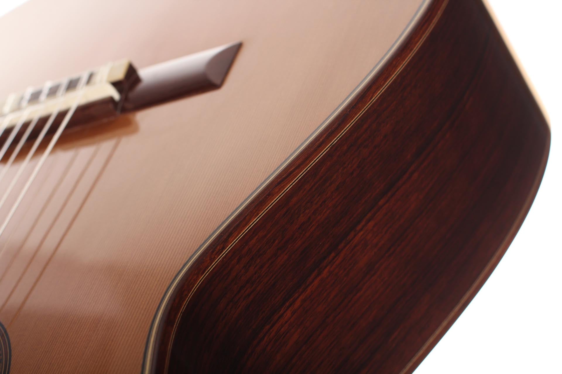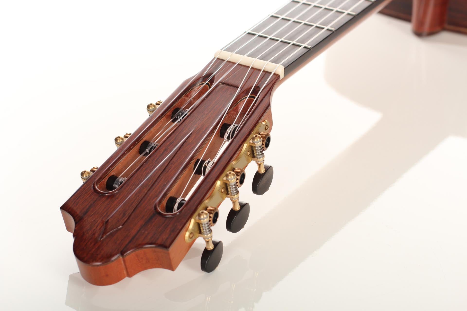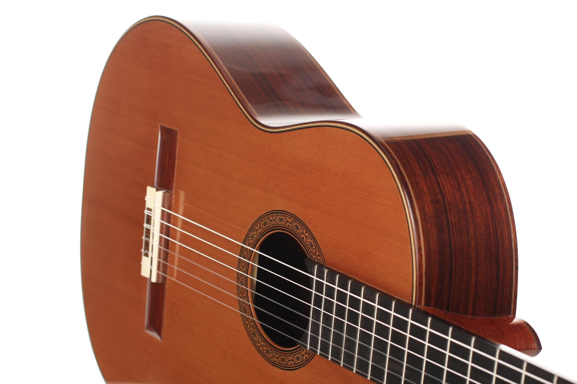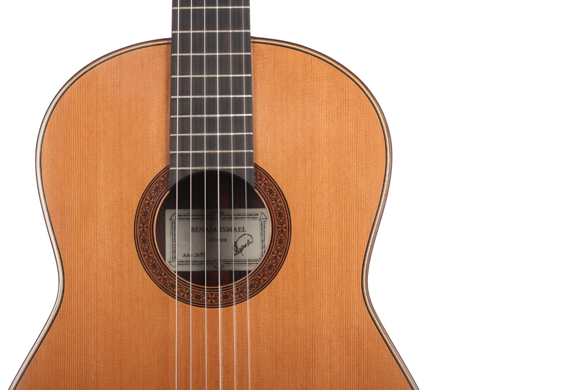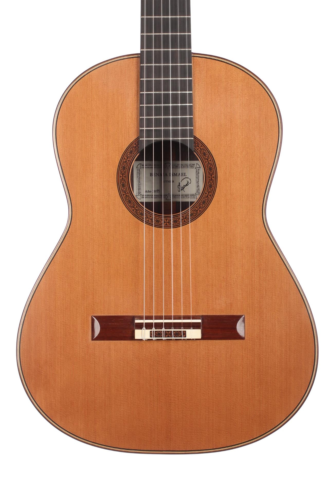 This guitar that Benaja made in 2011 is a beautiful copy of a 2008 Daniel Friederich. The top is made of fine cedar wood and back and sides are made of Indian rosewood. The trebles sound very clear for a cedar top guitar and overall the instrument is very balanced. The basses are dark but not too dominant. It is a very beautiful guitar that has the character of a late Daniel Friederich guitar.