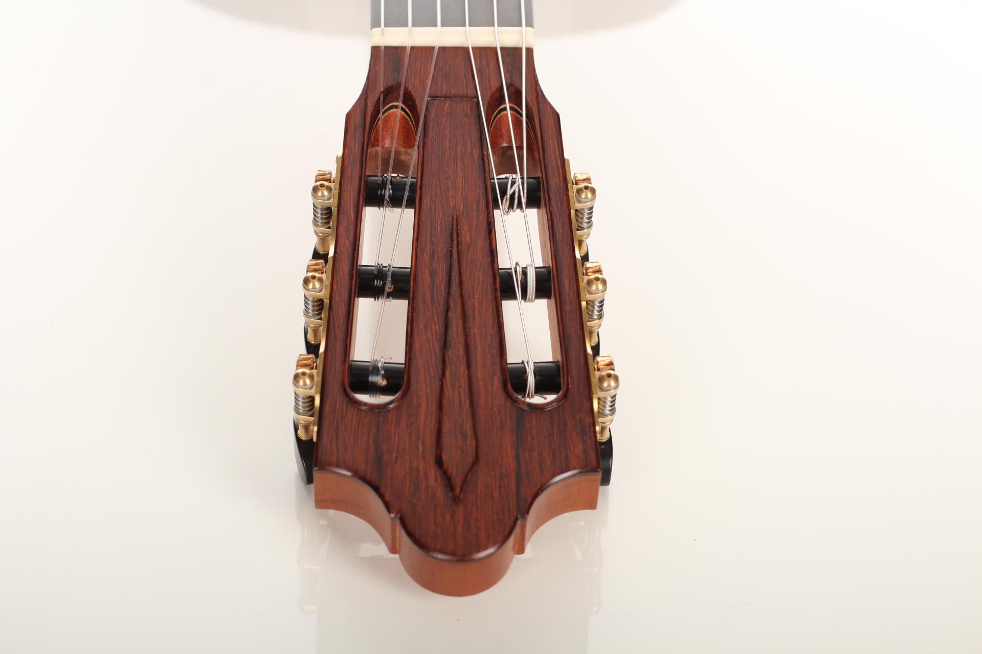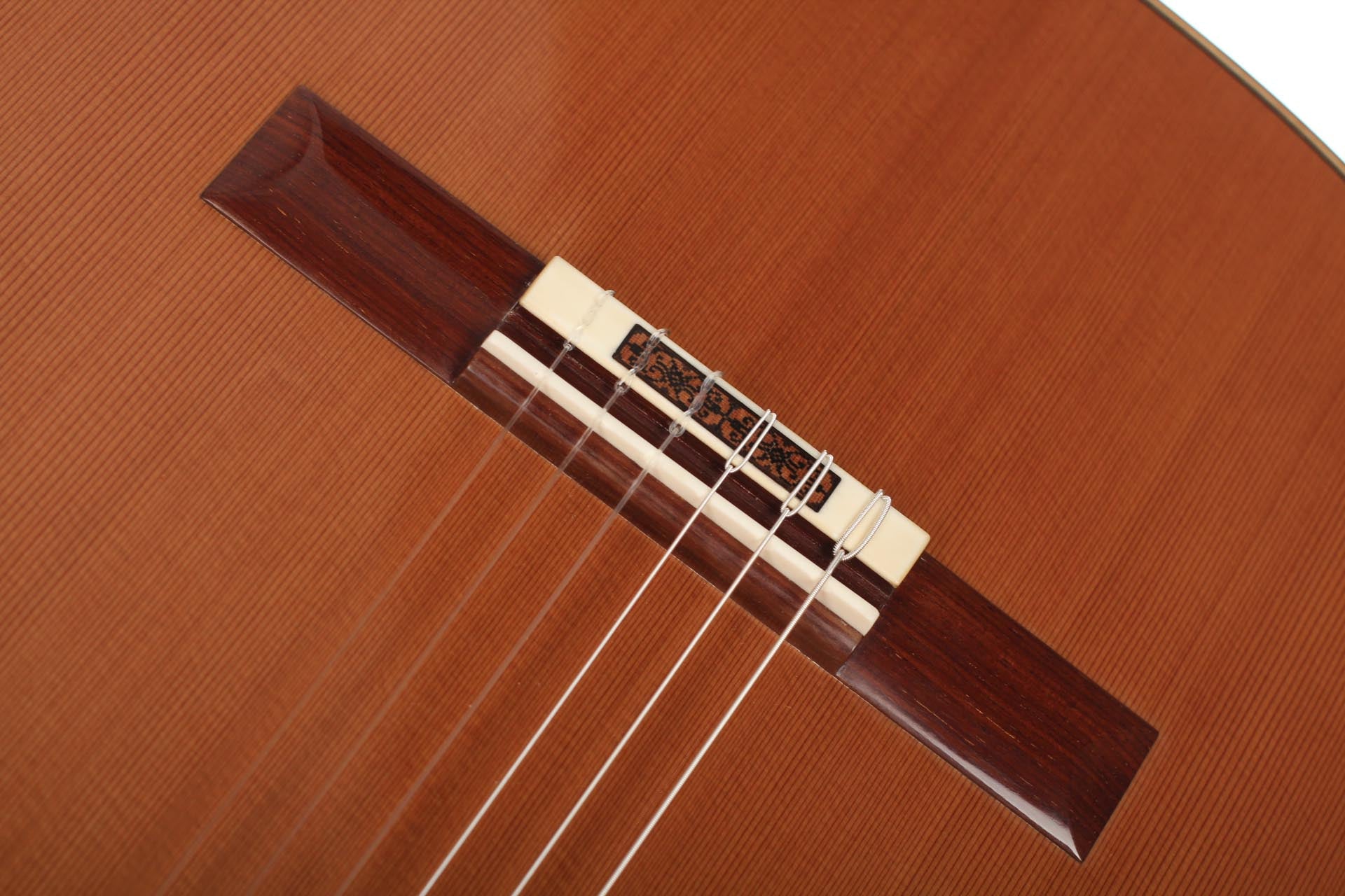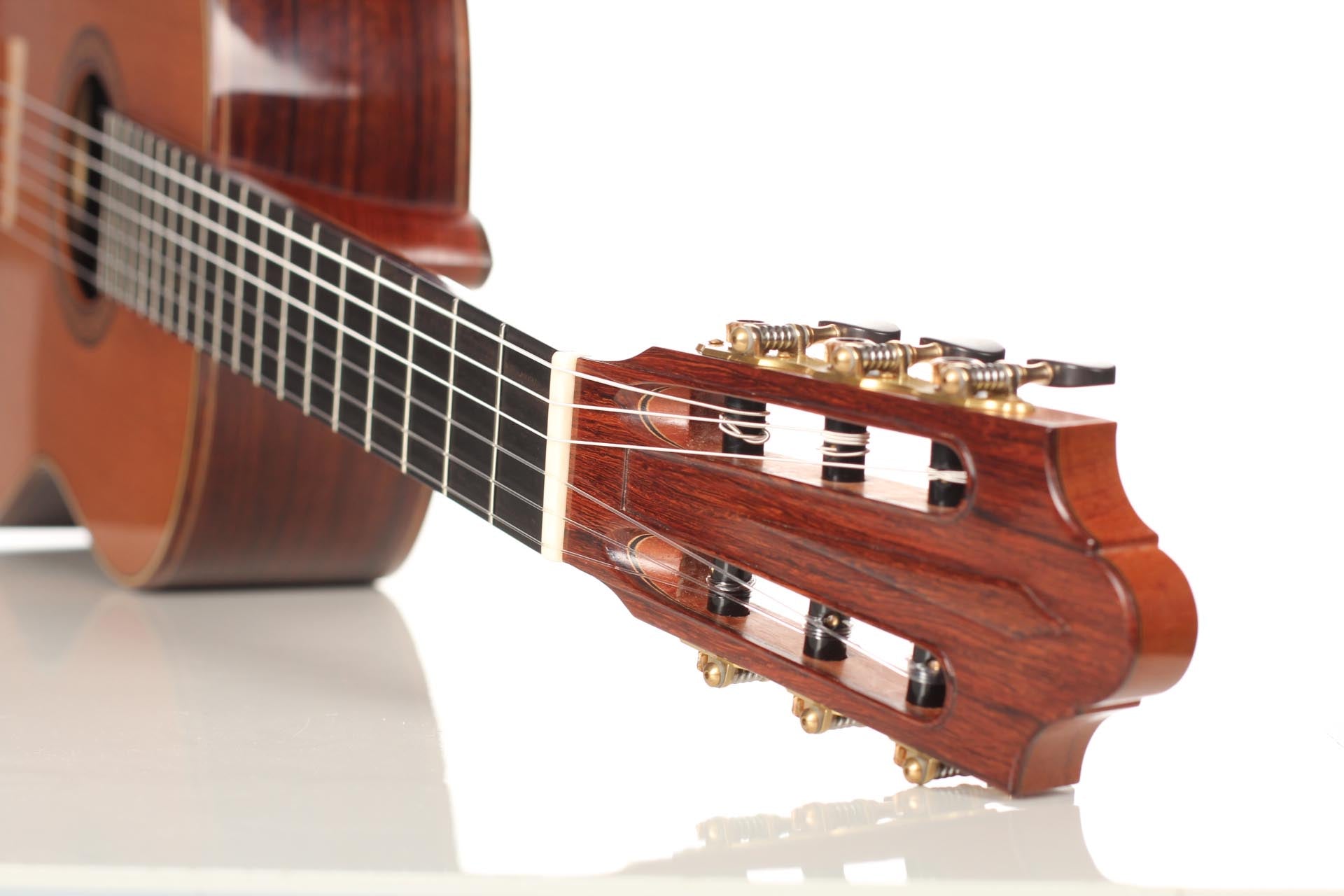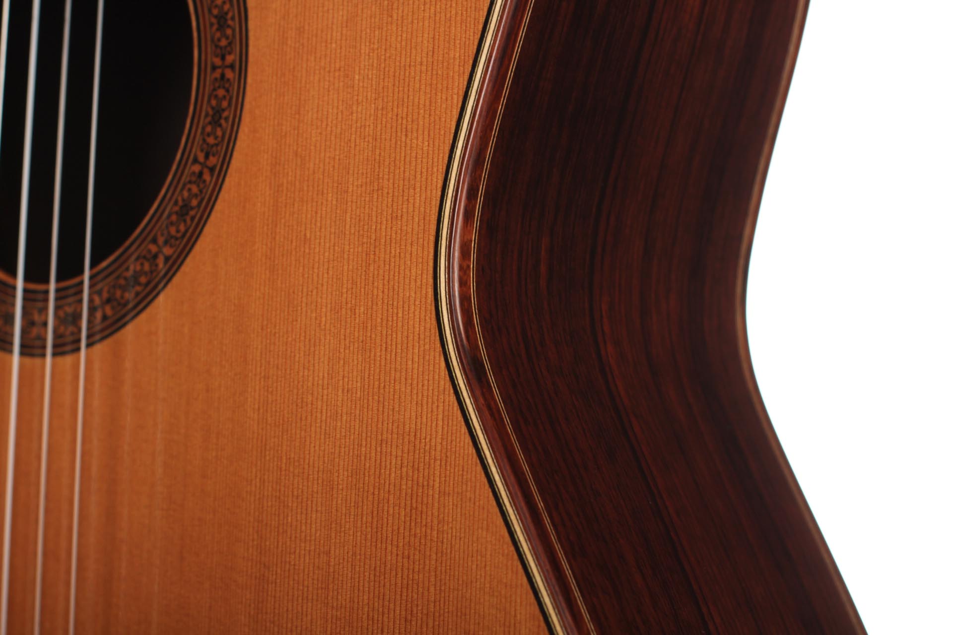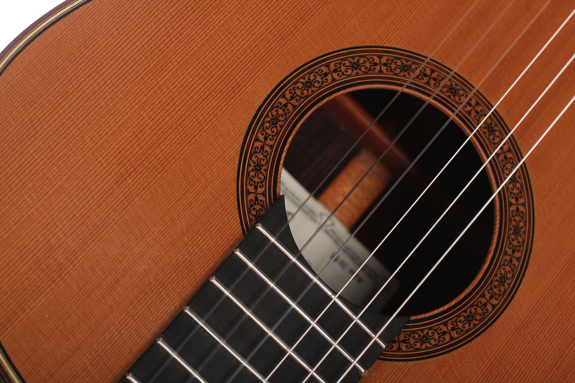 This guitar that Benaja made in 2011 is a beautiful copy of a 2008 Daniel Friederich. The top is made of fine cedar wood and back and sides are made of Indian rosewood. The trebles sound very clear for a cedar top guitar and overall the instrument is very balanced. The basses are dark but not too dominant. It is a very beautiful guitar that has the character of a late Daniel Friederich guitar.