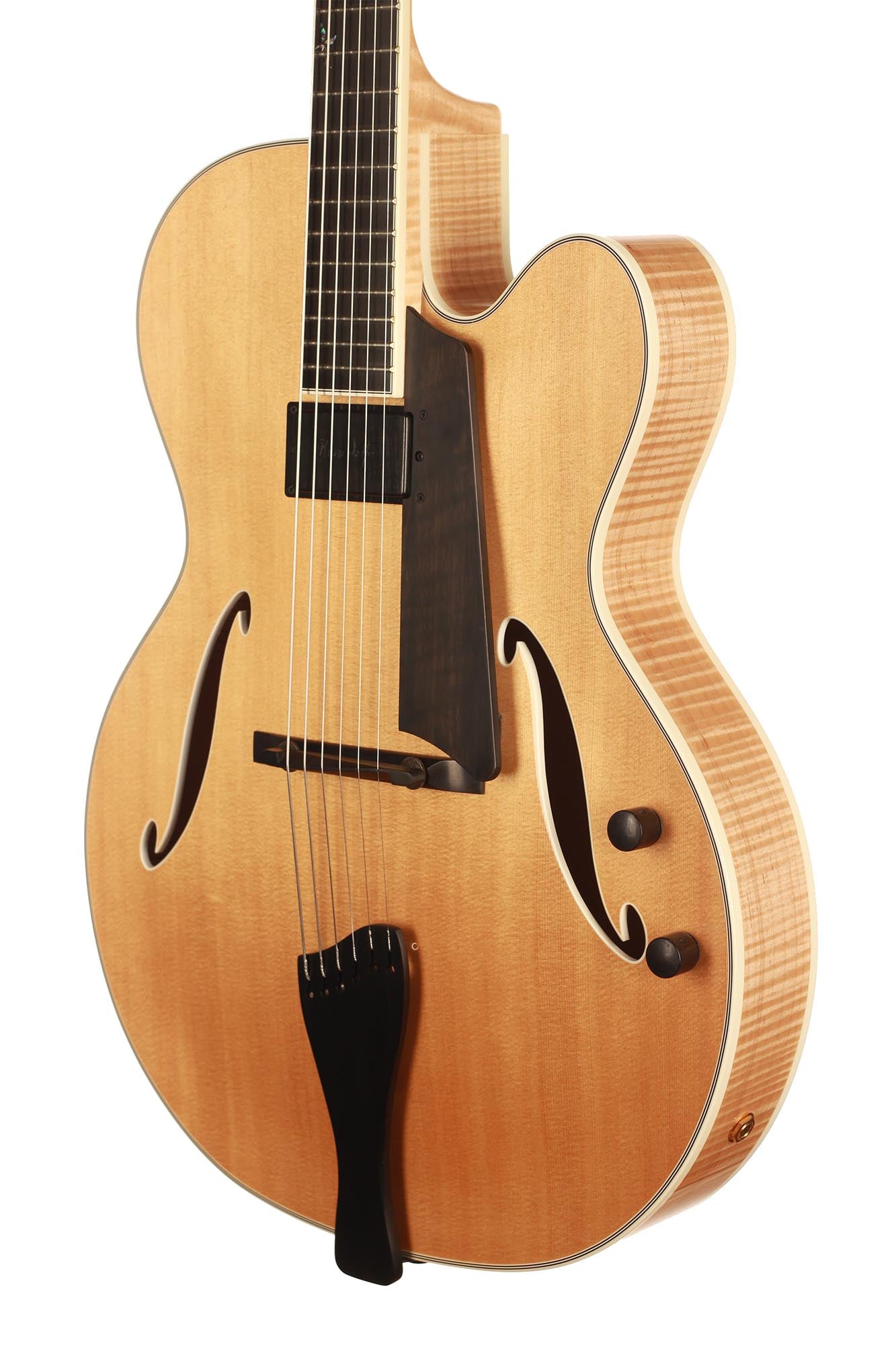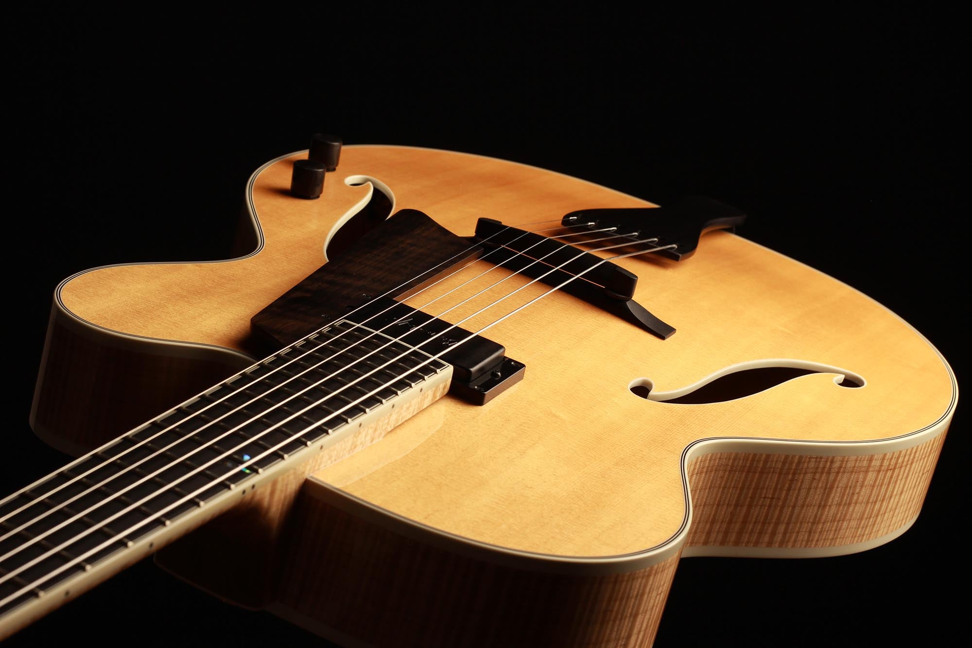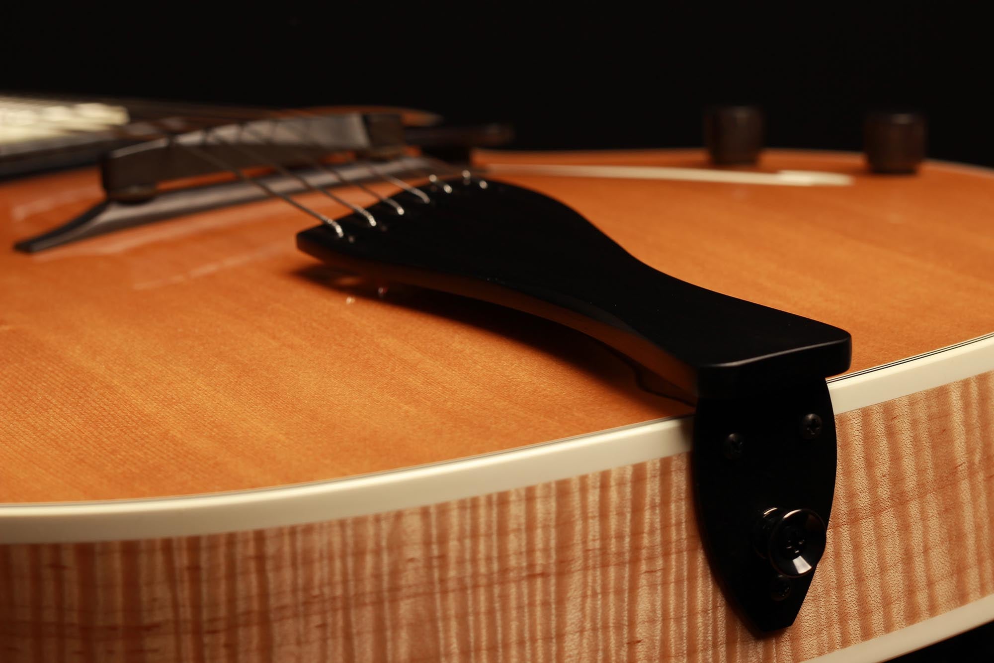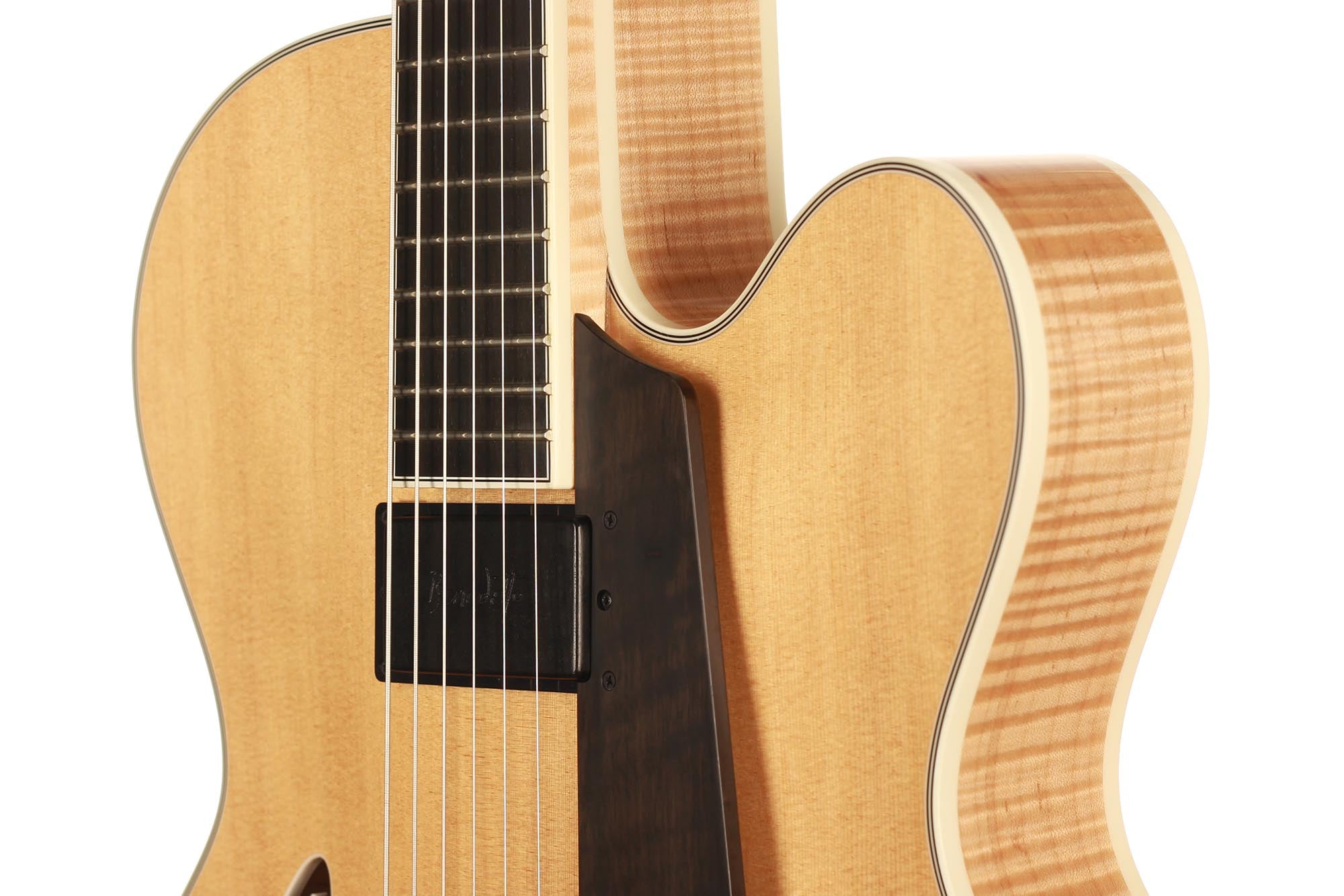 The Bravo Deluxe was developed to satisfy the musicians' need for a tastefully designed, rich and full-sounding thin-body guitar that is also suitable for the stage and is a pleasure to tour with. This beautiful model has a light laminated spruce top and a back made of wonderfully flamed maple. The neck is also made of maple and on the fretboard there is the typical and stylishly designed abalone inlay on the 12th fret. The guitar has a deluxe binding package of body, neck, headstock and sound holes and a B-6 pickup in black. With this pickup the Benedetto Bravo Deluxe gets a very appealing warm, full-bodied and differentiated tone.