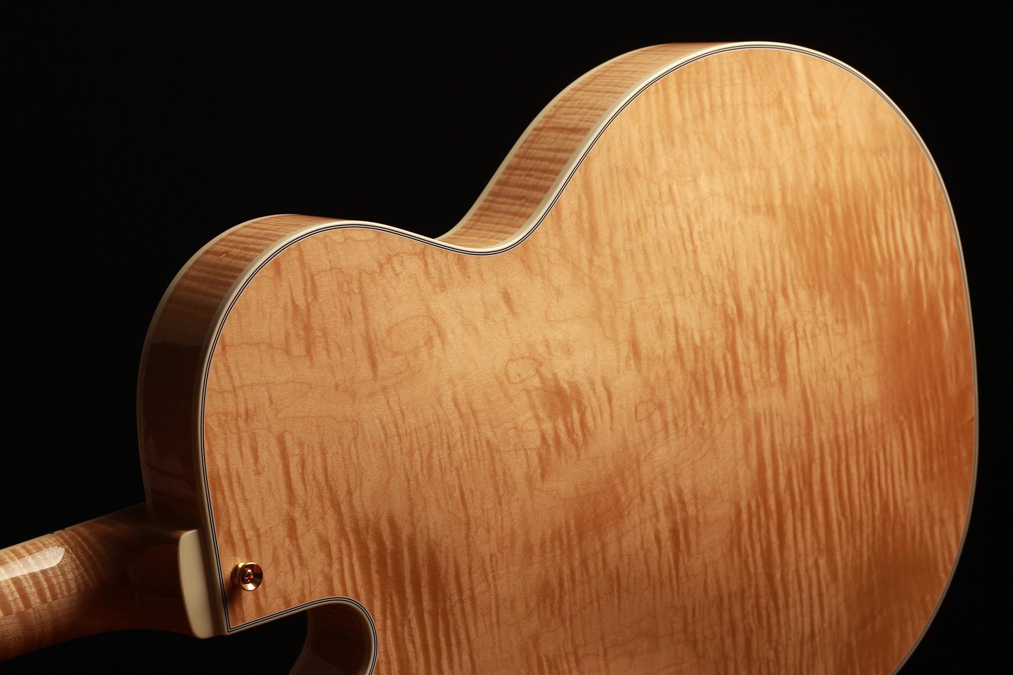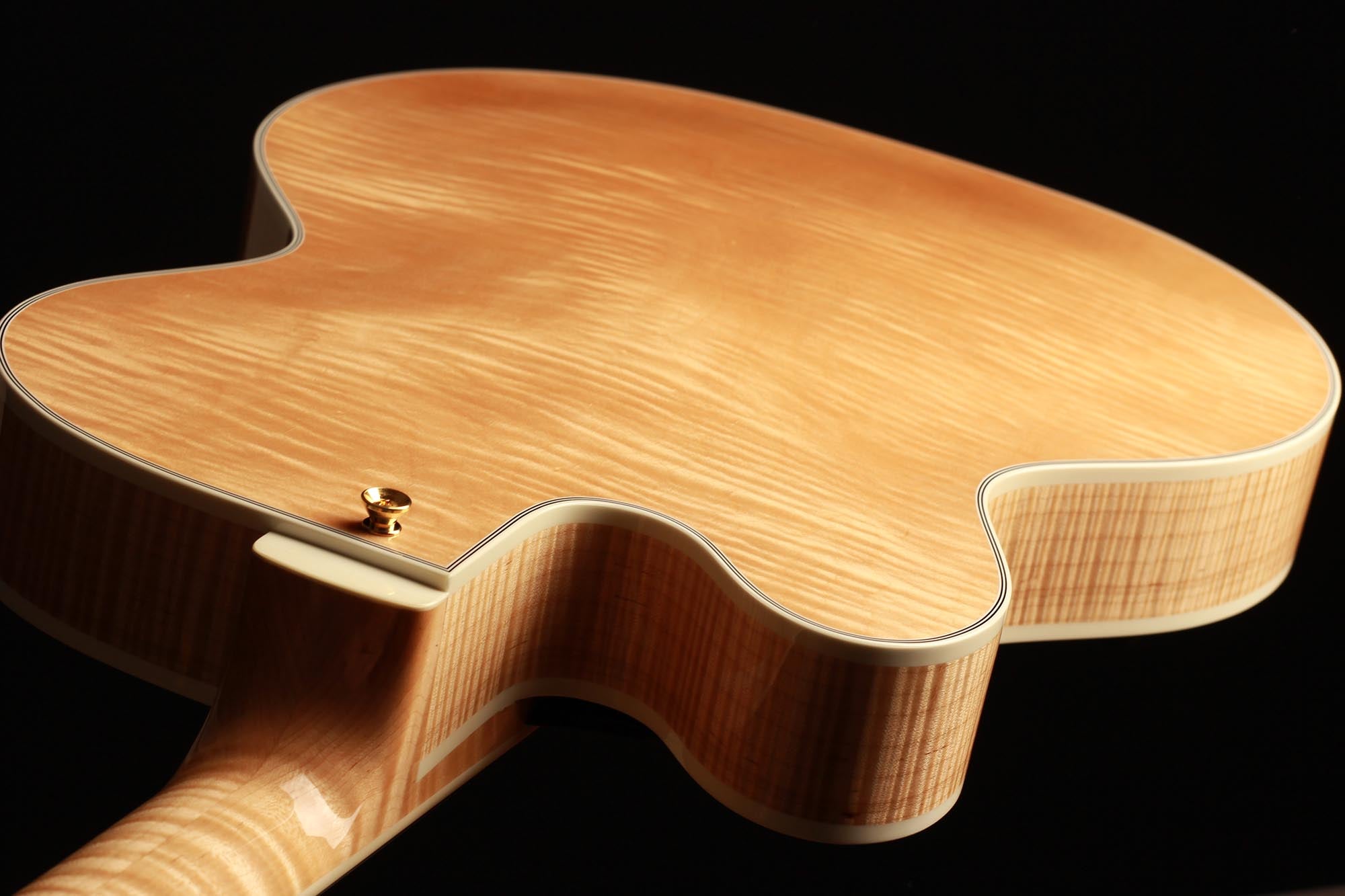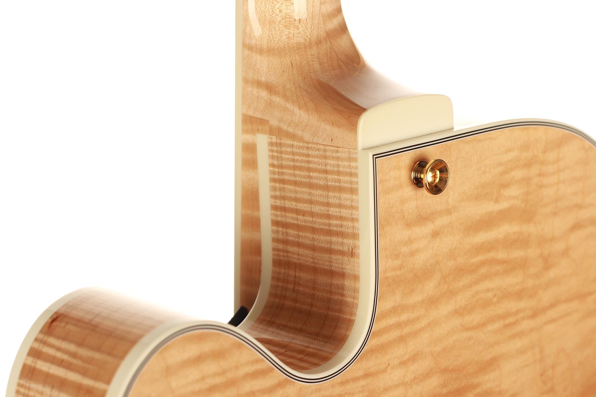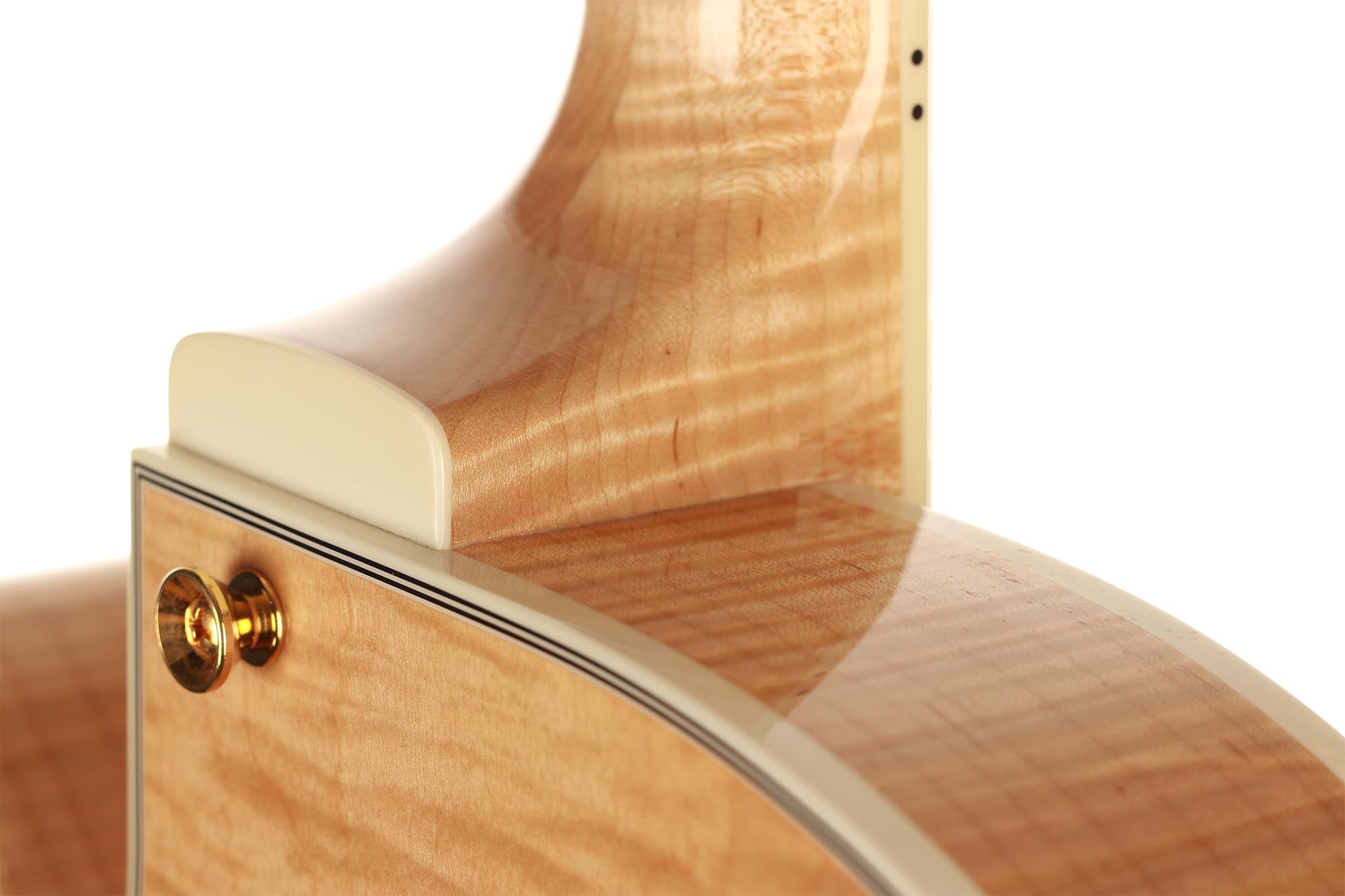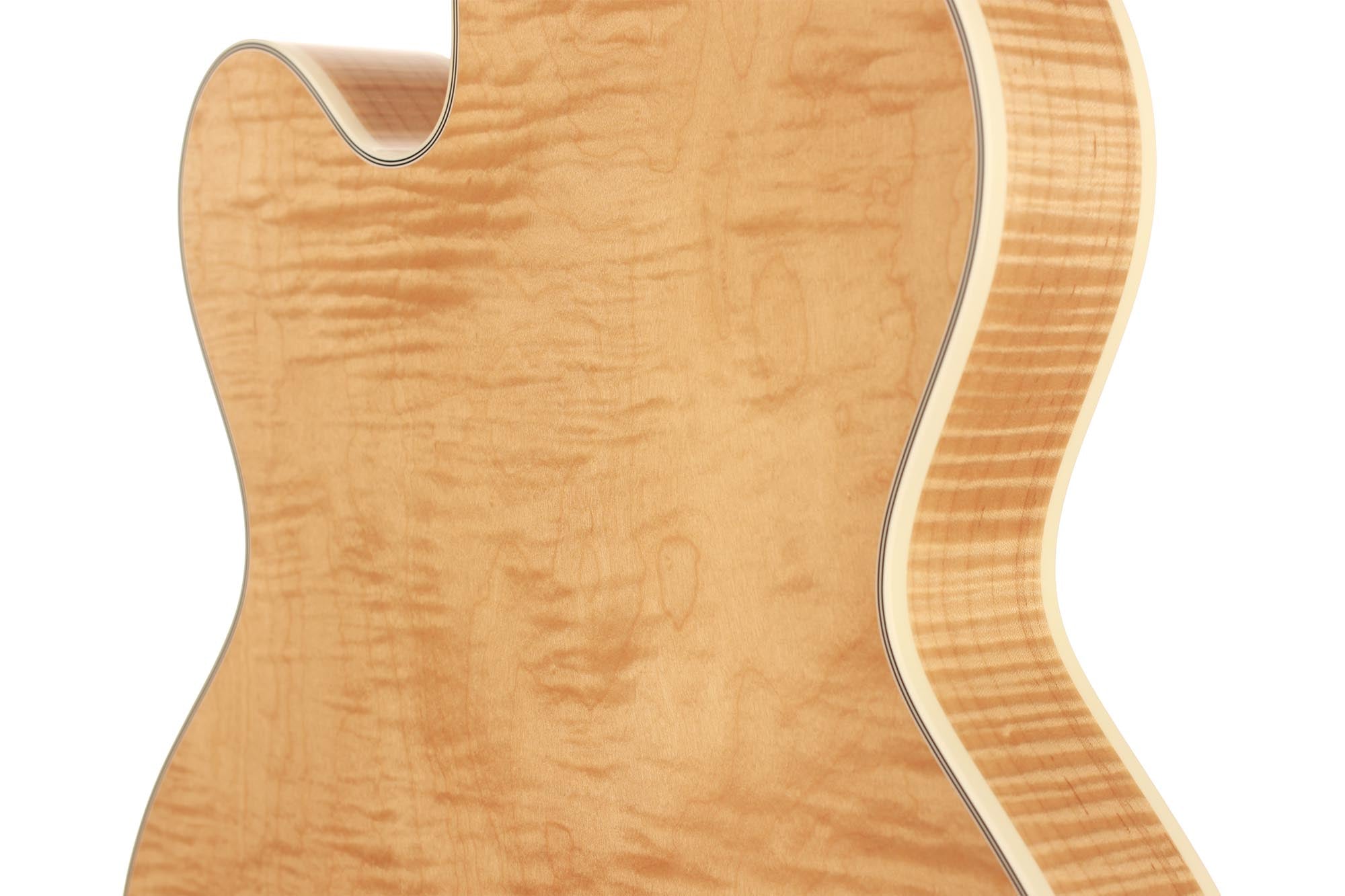 The Bravo Deluxe was developed to satisfy the musicians' need for a tastefully designed, rich and full-sounding thin-body guitar that is also suitable for the stage and is a pleasure to tour with. This beautiful model has a light laminated spruce top and a back made of wonderfully flamed maple. The neck is also made of maple and on the fretboard there is the typical and stylishly designed abalone inlay on the 12th fret. The guitar has a deluxe binding package of body, neck, headstock and sound holes and a B-6 pickup in black. With this pickup the Benedetto Bravo Deluxe gets a very appealing warm, full-bodied and differentiated tone.