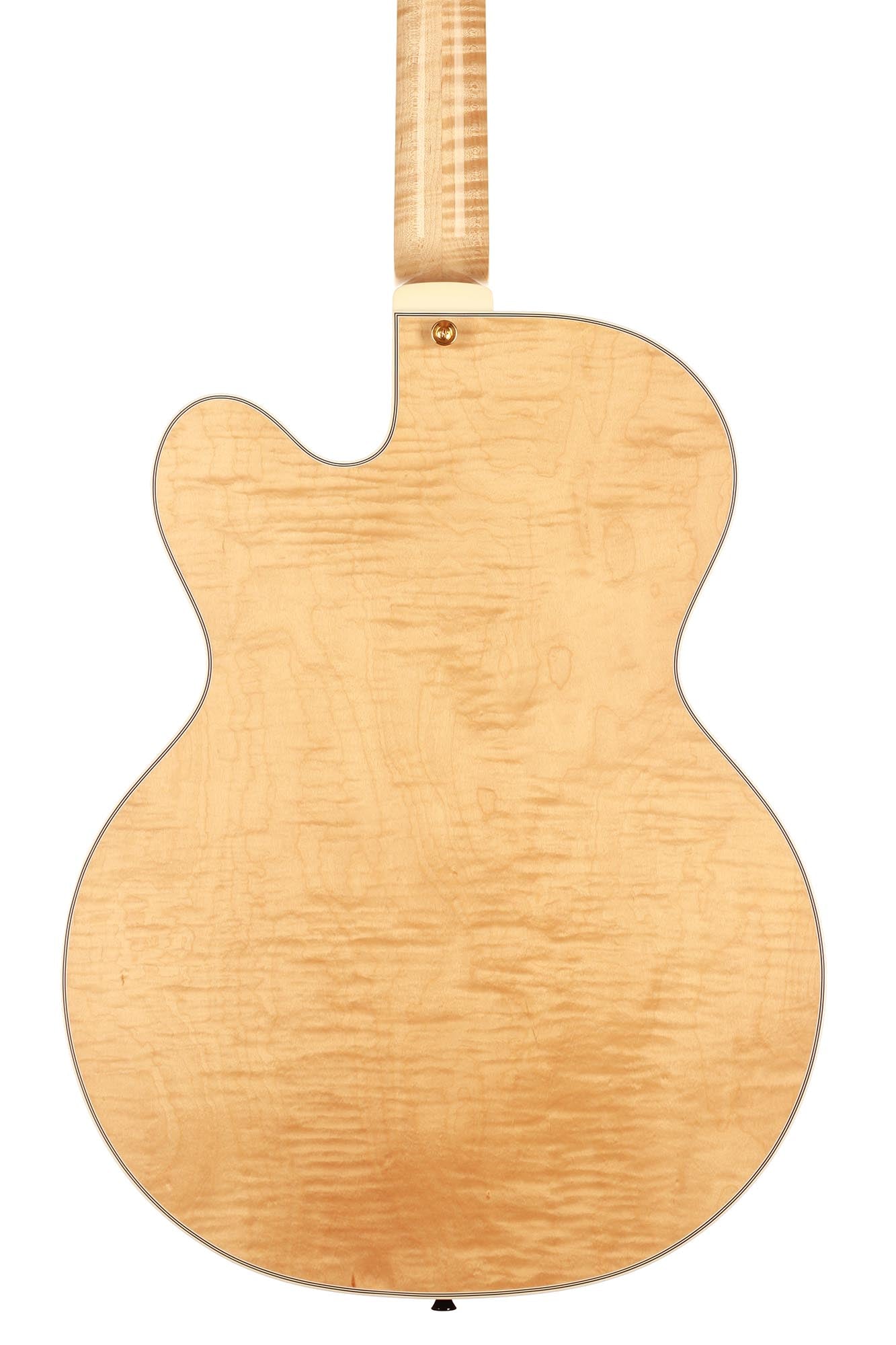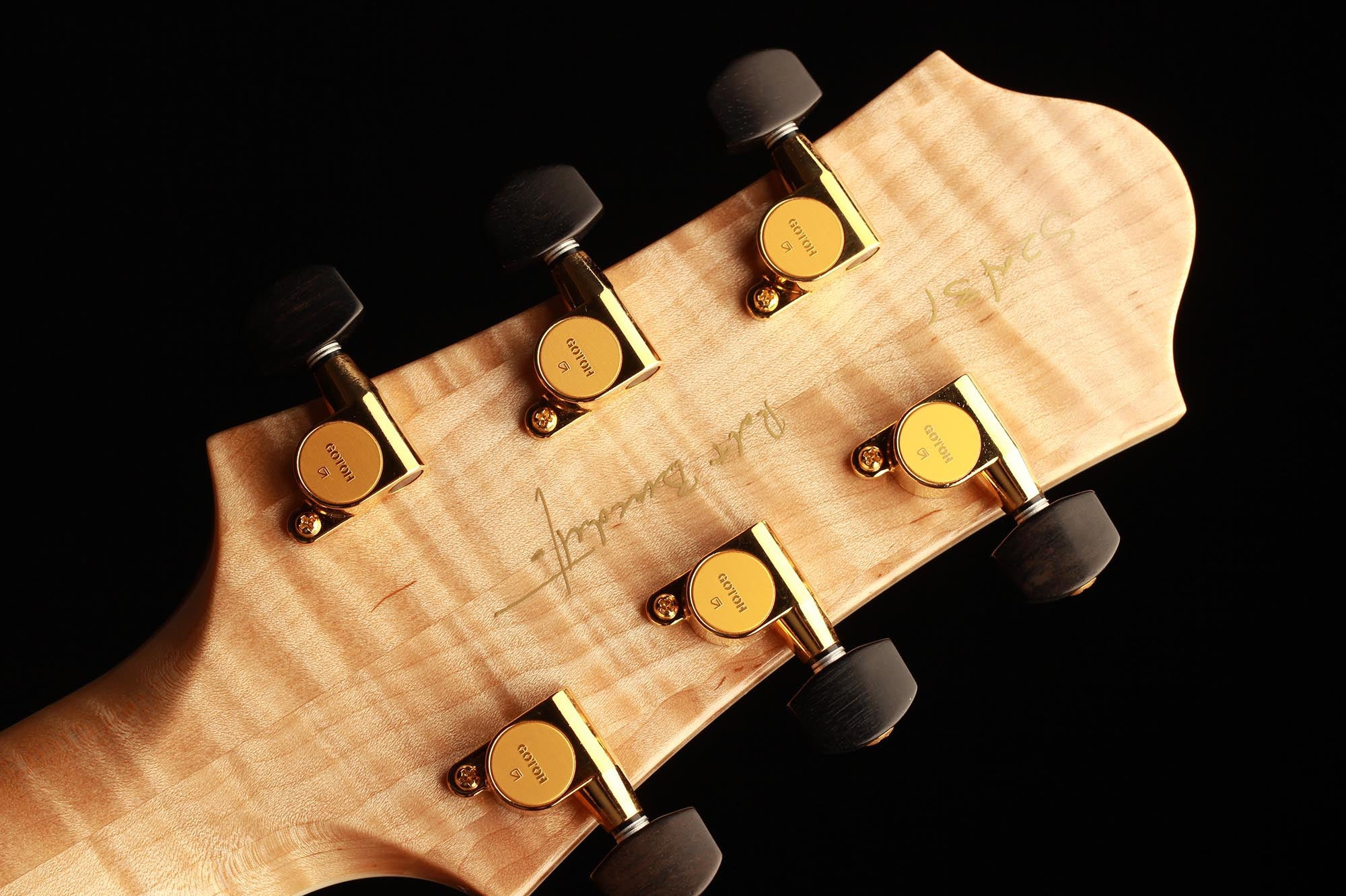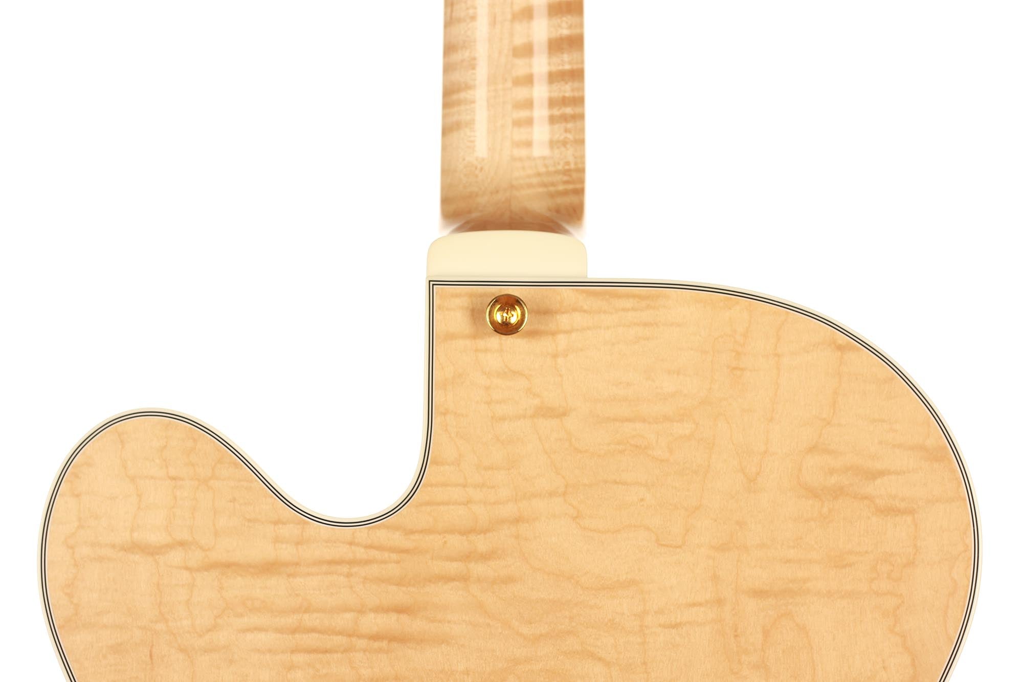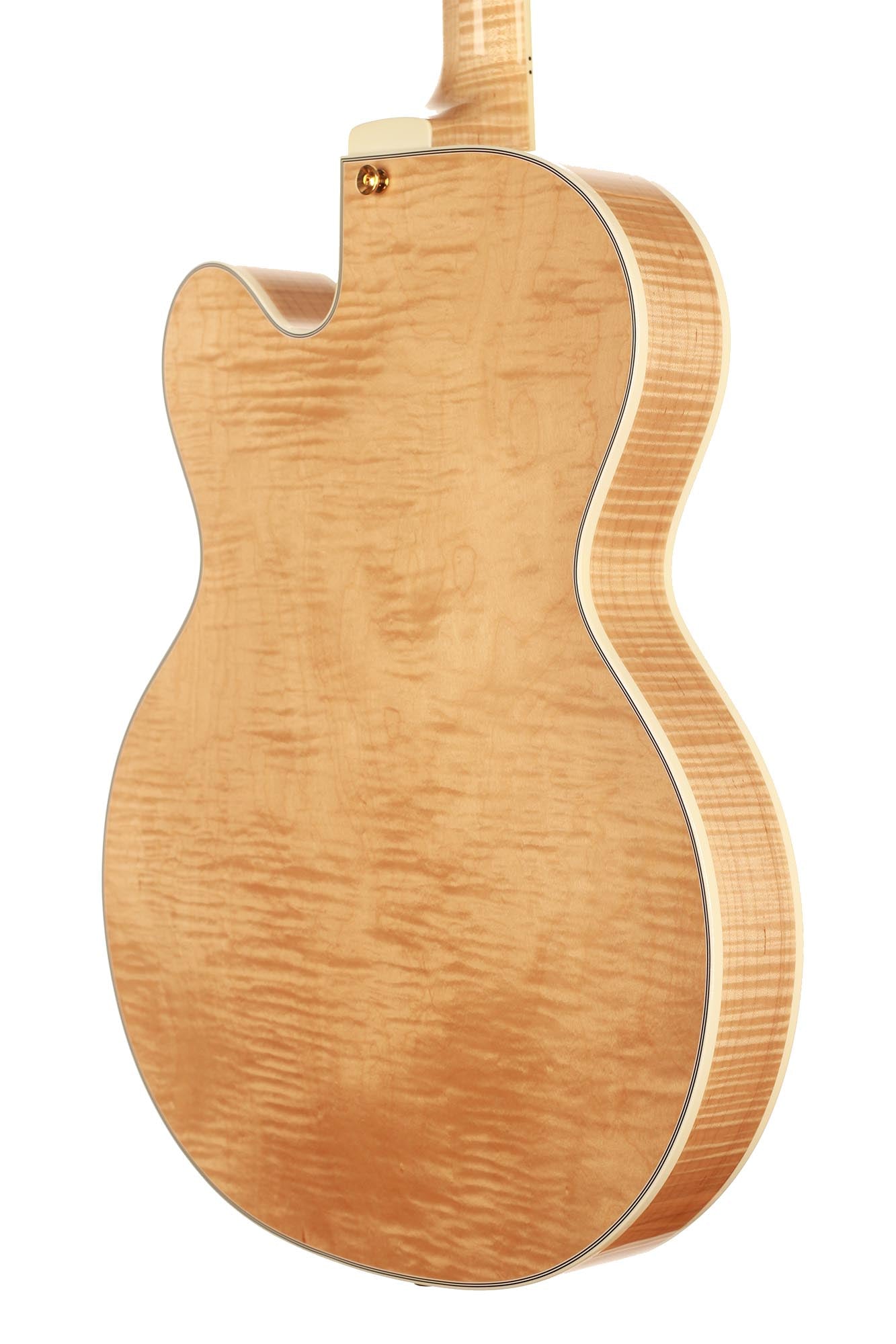 The Bravo Deluxe was developed to satisfy the musicians' need for a tastefully designed, rich and full-sounding thin-body guitar that is also suitable for the stage and is a pleasure to tour with. This beautiful model has a light laminated spruce top and a back made of wonderfully flamed maple. The neck is also made of maple and on the fretboard there is the typical and stylishly designed abalone inlay on the 12th fret. The guitar has a deluxe binding package of body, neck, headstock and sound holes and a B-6 pickup in black. With this pickup the Benedetto Bravo Deluxe gets a very appealing warm, full-bodied and differentiated tone.