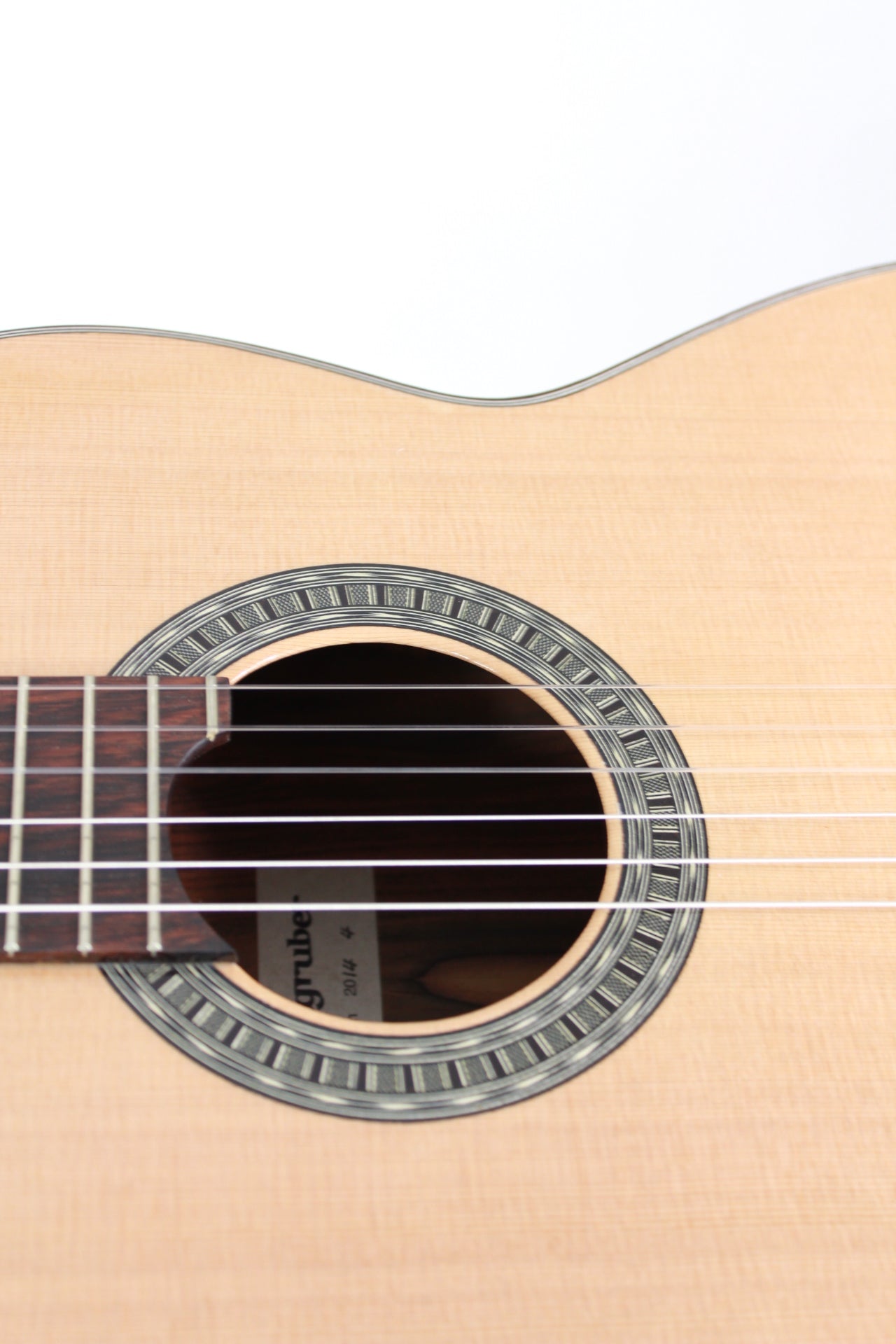 Bernd Holzgruber from Velden at Wörthersee (Carinthia) in Austria was born in 1939, studied guitar with Karl Scheit in Vienna and played his final examination in 1968 on a self-constructed instrument. Since then, he took care of Scheit’s instrument collection which gave him the possibility to study master guitars, for example by Robert Bouchet, as well as historical lutes. He is a pioneer in the construction of historical instruments and a creative luthier, who had constantly continued developing his models during his 50-year career. The top of this guitar is made of cedar in Doubletop-construction (Aramid). Back and ribs are made of Indian roseweood with the the sides and back veneered with Amazonas rosewood. The machine heads are by Klaus Scheller.