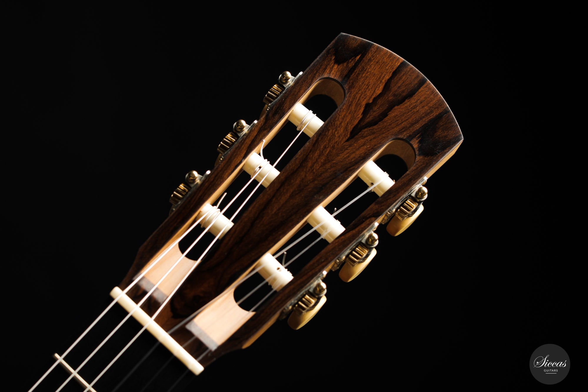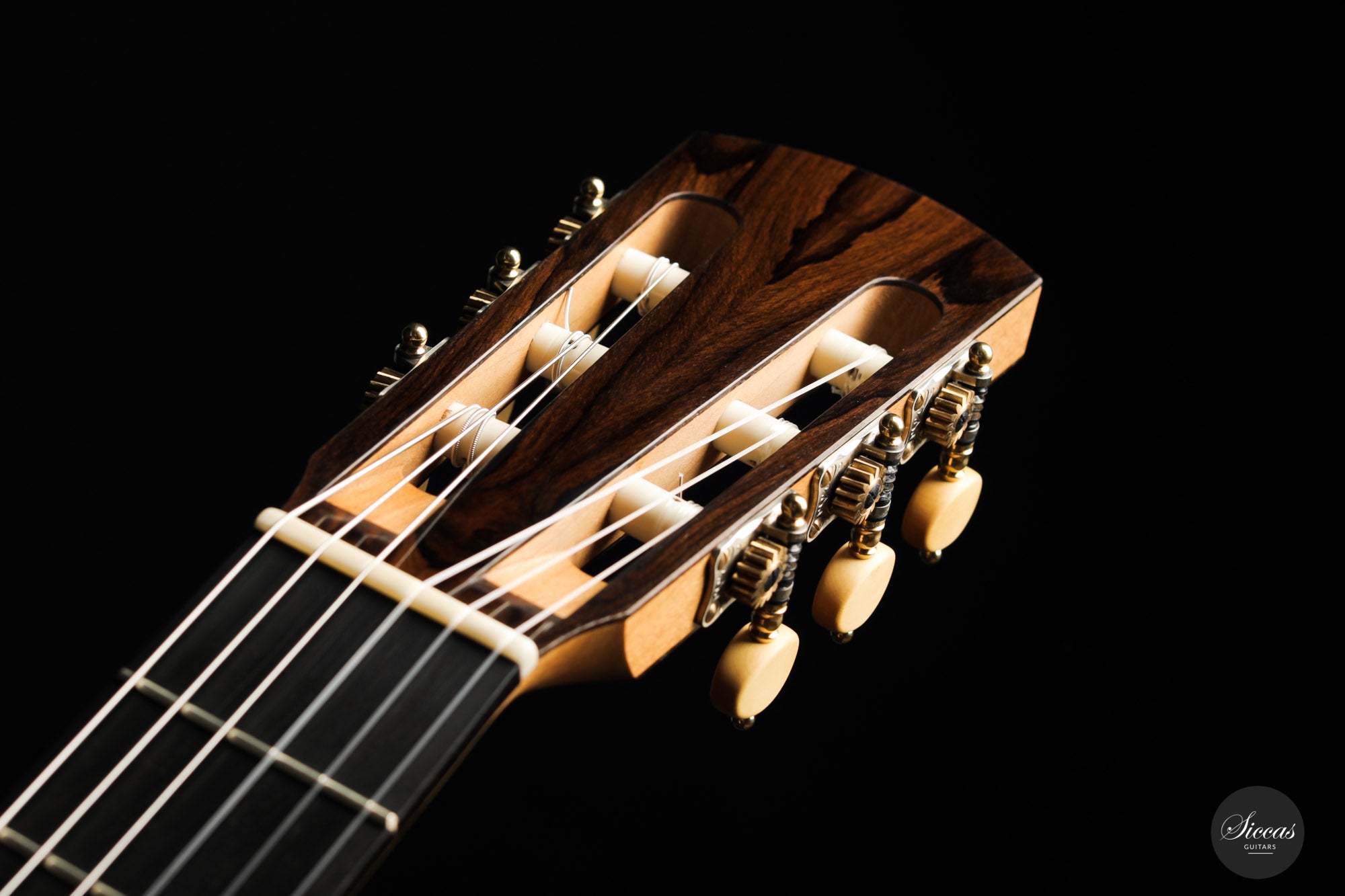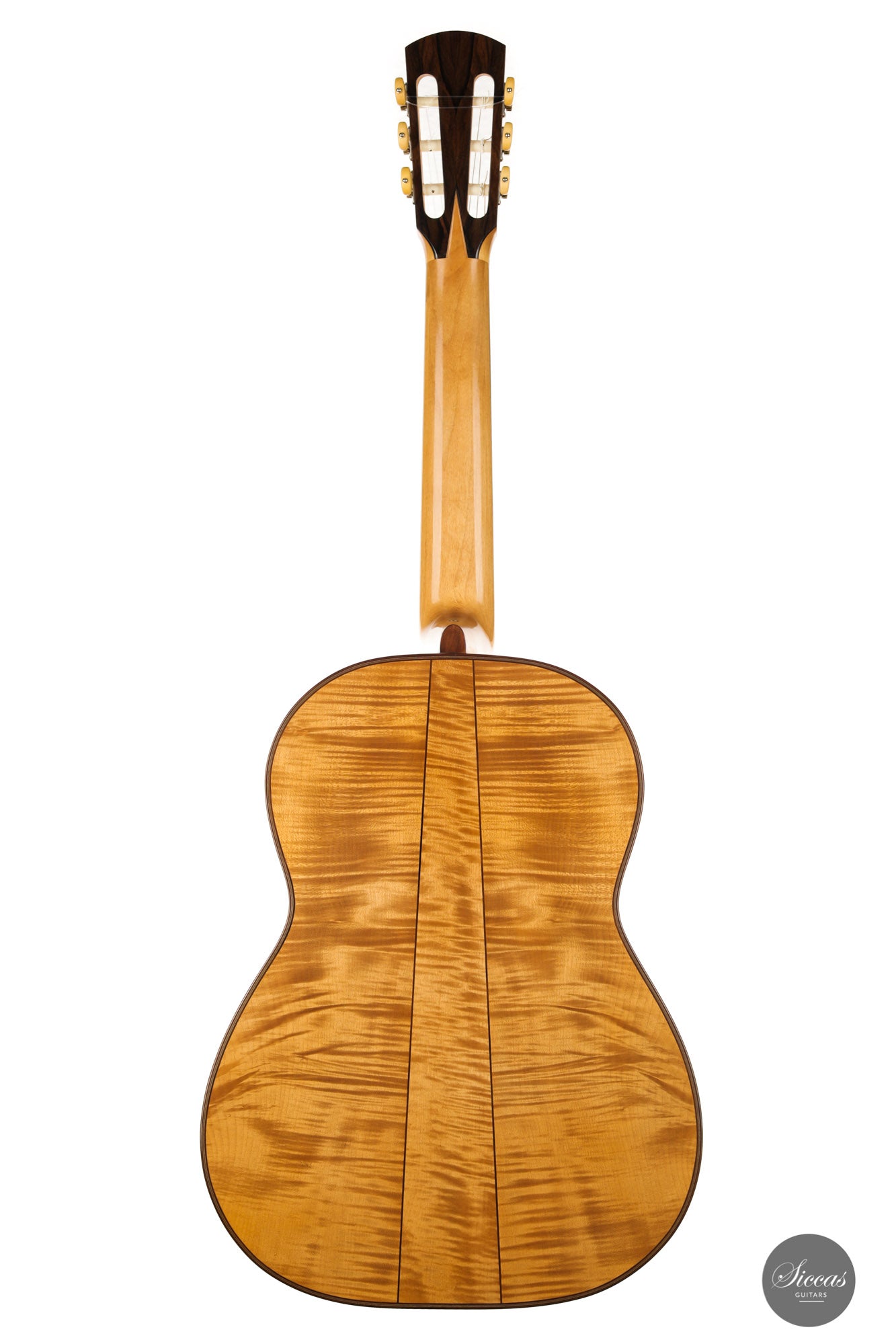 This guitar built in 2020 is truly fascinating. The concert model of his own design has an elaborate cedar lattice performance on a spruce top. This rather modern element is counterbalanced by a three-piece maple back, which is very reminiscent of the way Spanish guitar makers used this fine wood in the 19th century. In addition, the raised fingerboard is made in the Viennese style, suspended above the soundboard, and equipped with an internal mechanism that allows the height of the strings to be adjusted with a simple key. Finally, the headstock is adorned with superb Rodgers machine heads, which contrast with the dark, figured Ziricote head veneer.