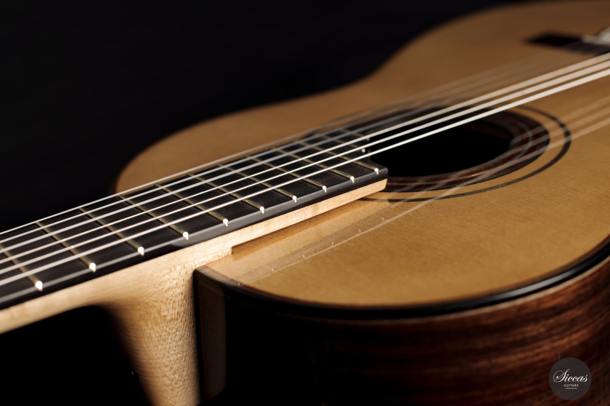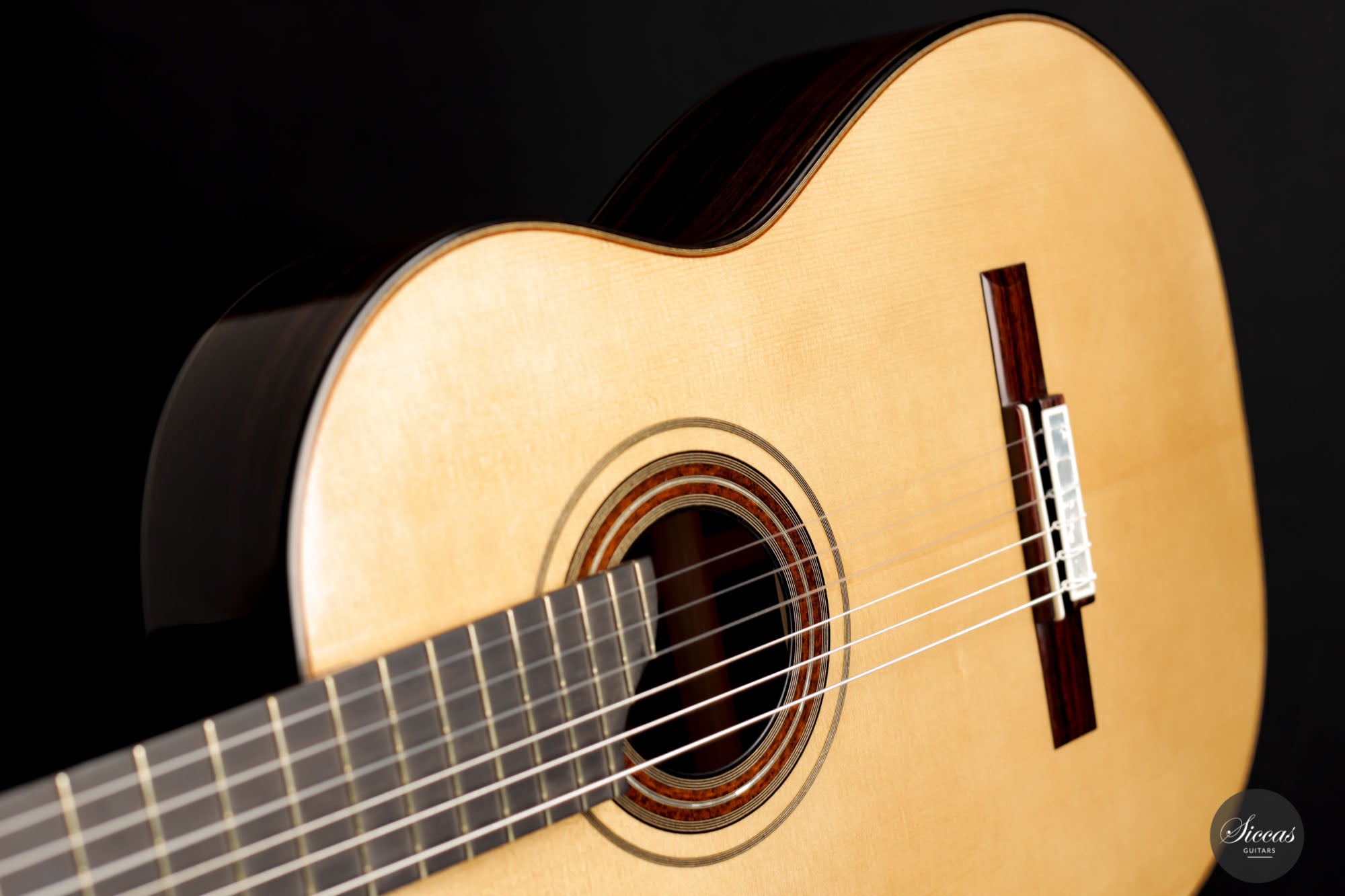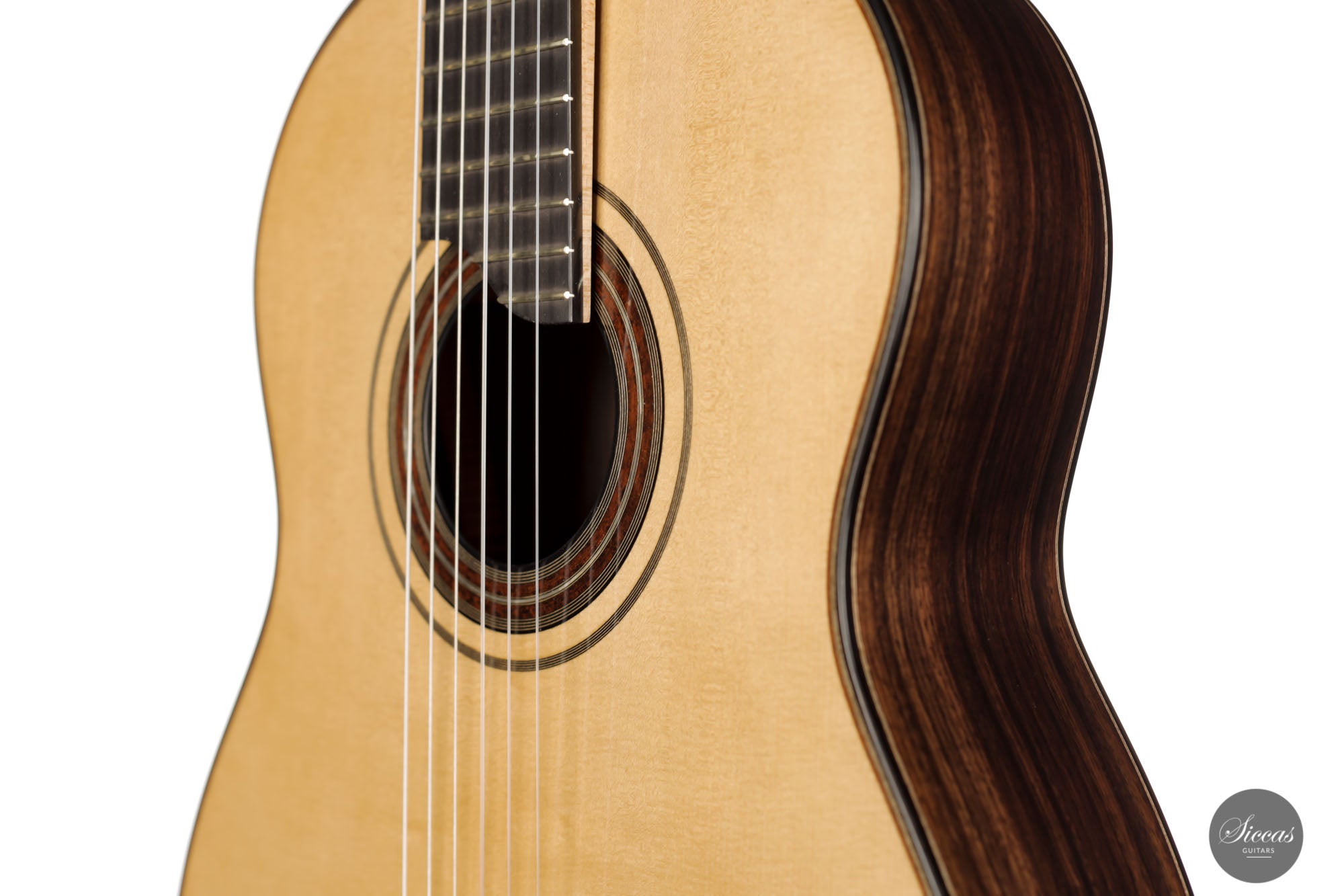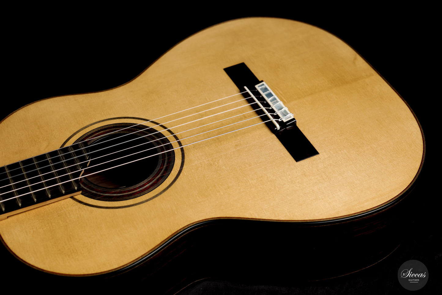 Our fascination for this guitar also applies to its sound. The very clear and easy to modulate tone has an elegant charm, with a notorious power and projection. The impressive ease of playing and the pure transparency of the tone in the trebles make this guitar a highly mesmerizing instrument. In summary, it is a true gem from one of the most experienced luthiers in Germany.