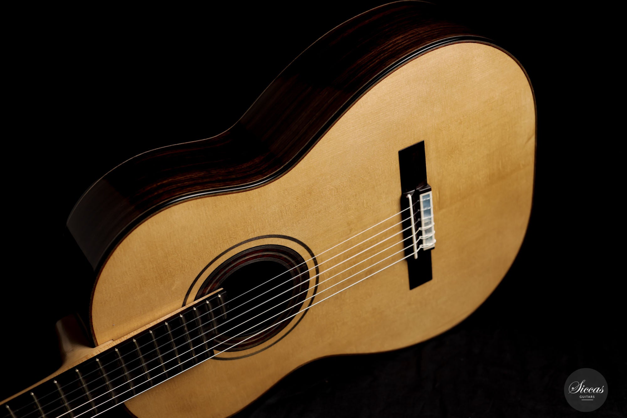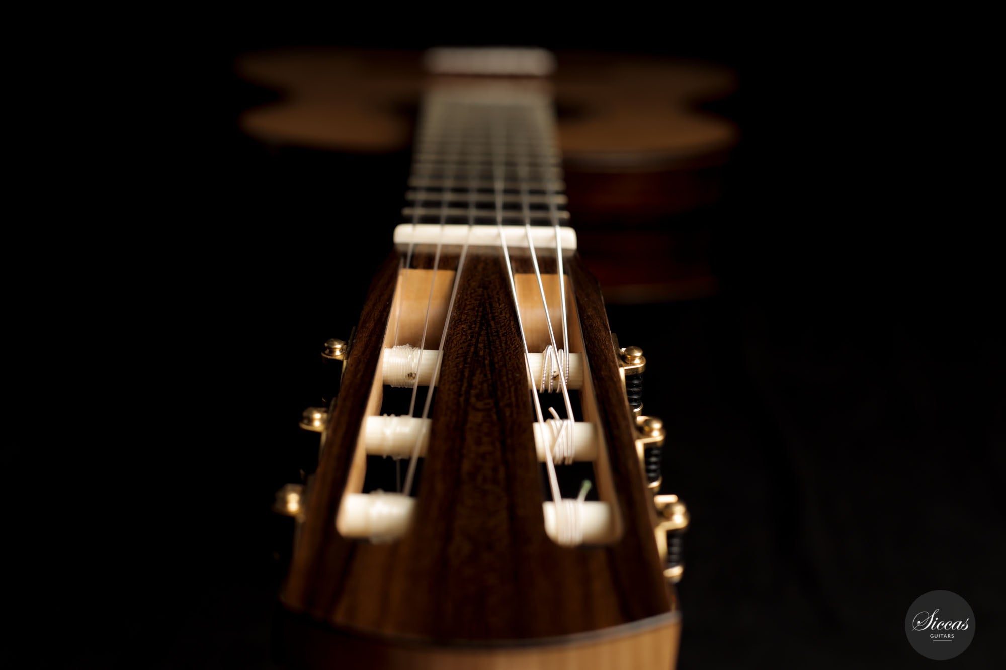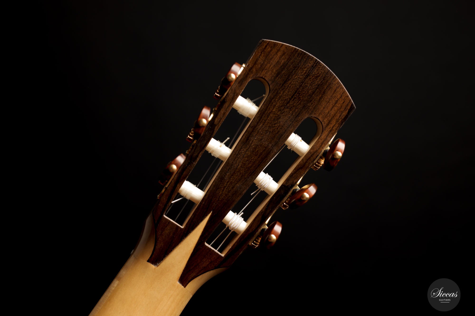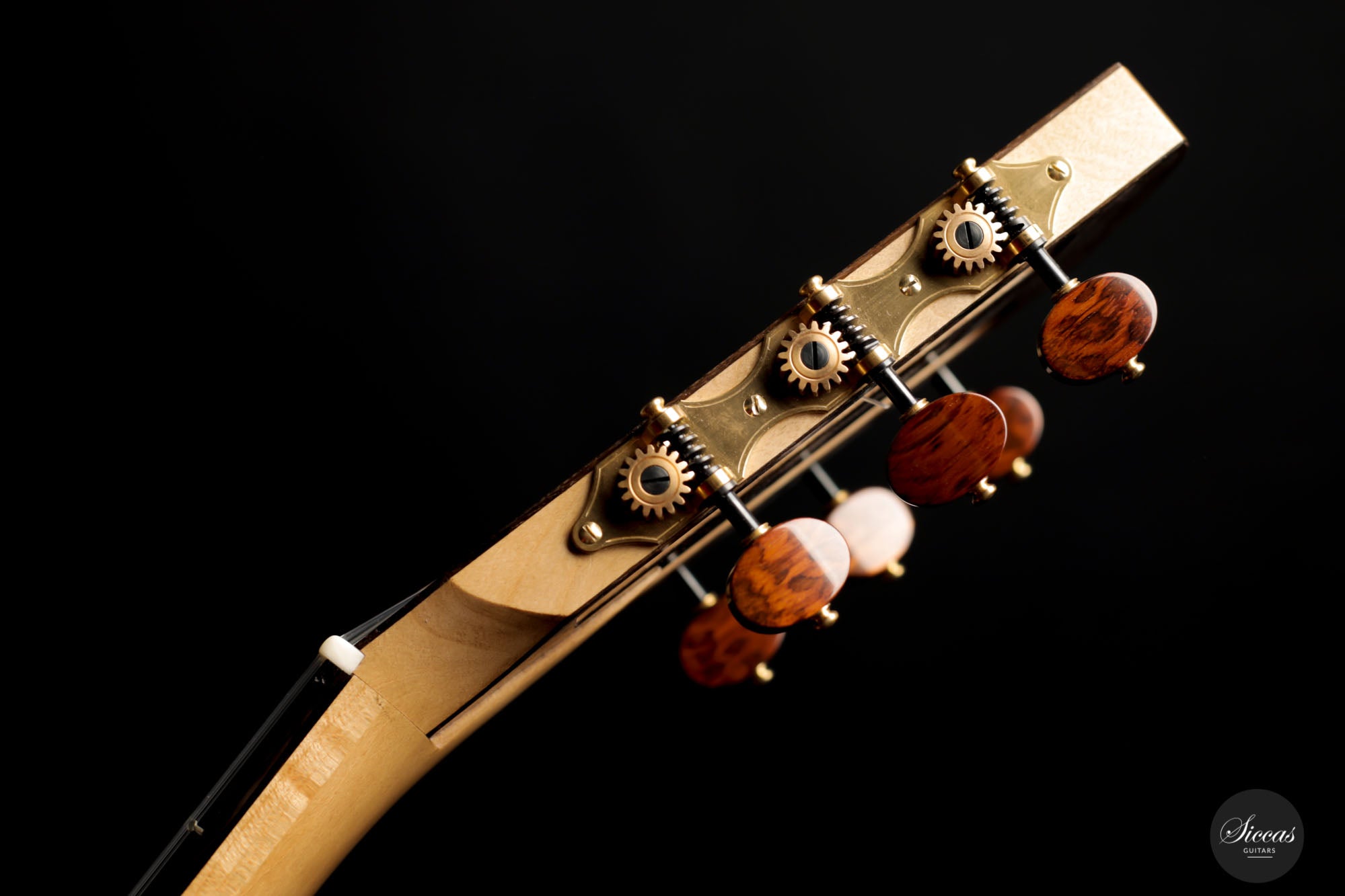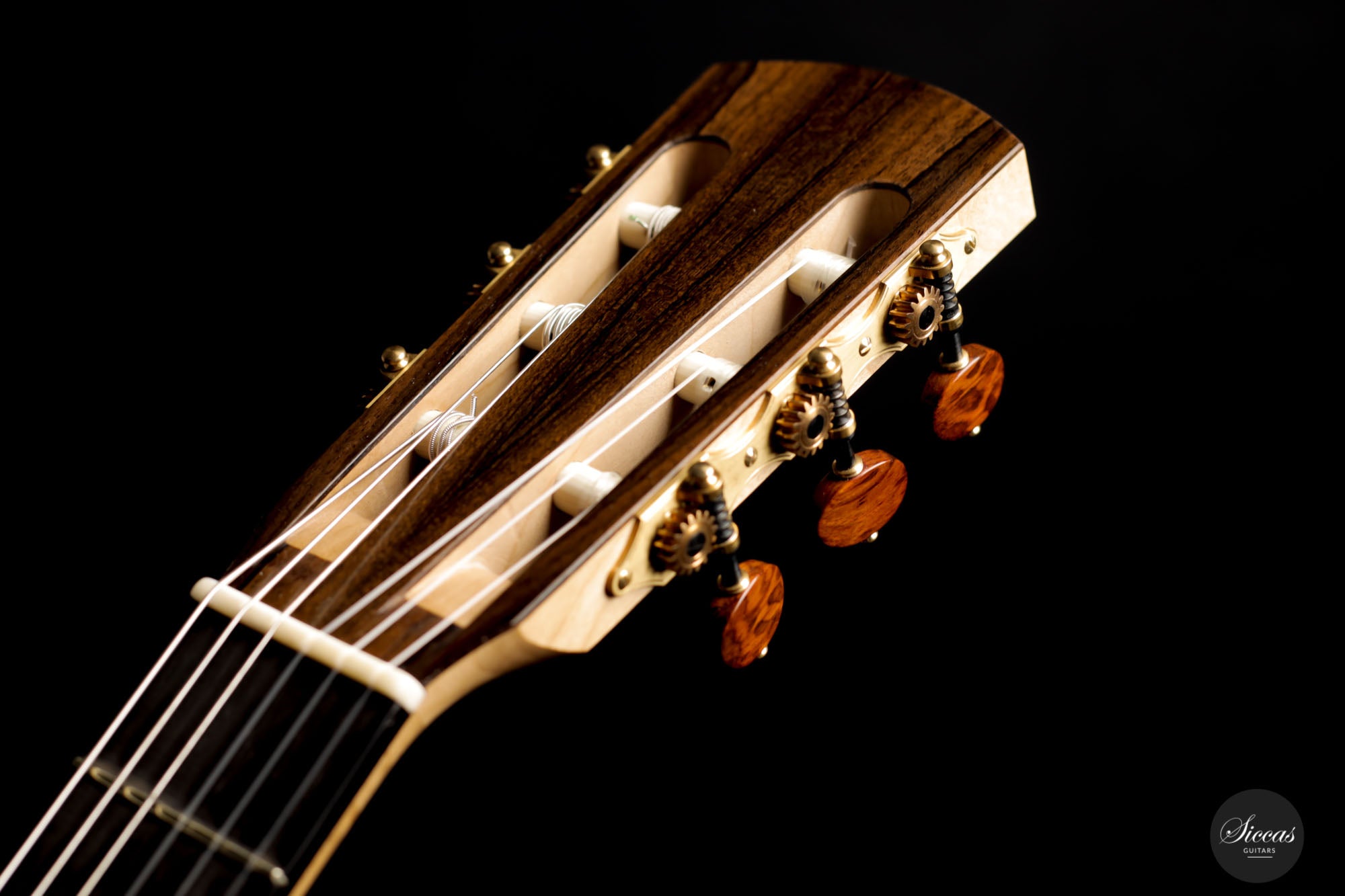 As expected this guitar made in 2021 is a very lovely and well-made instrument. It is a concert model of his own design that has an elaborate cedar-lattice-bracing on a spruce top. This rather modern element is counterbalanced by traditional Indian Rosewood back and sides. In addition, the raised fingerboard is made in the Viennese style, suspended above the soundboard, and equipped with an internal mechanism that allows the height of the strings to be adjusted with a simple key. Finally, the headstock is adorned with superb Scheller machine heads, which contrast with the dark, figured Ziricote head veneer.