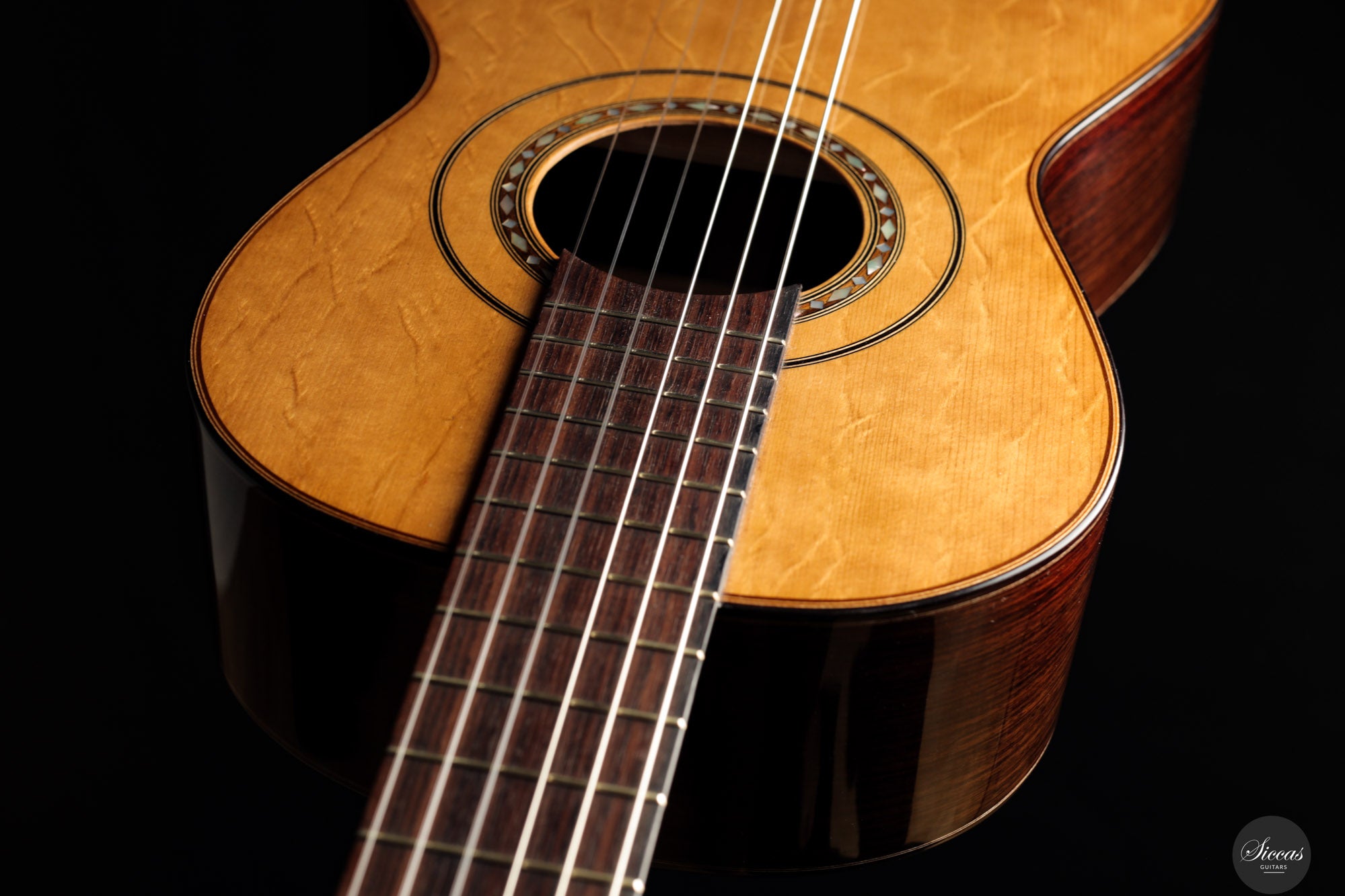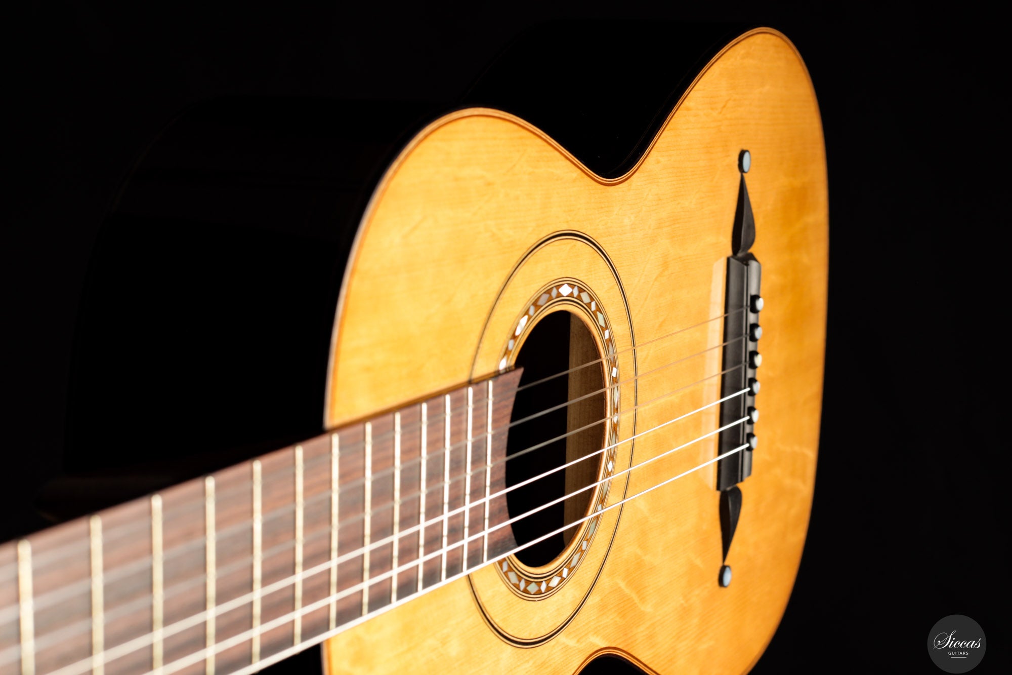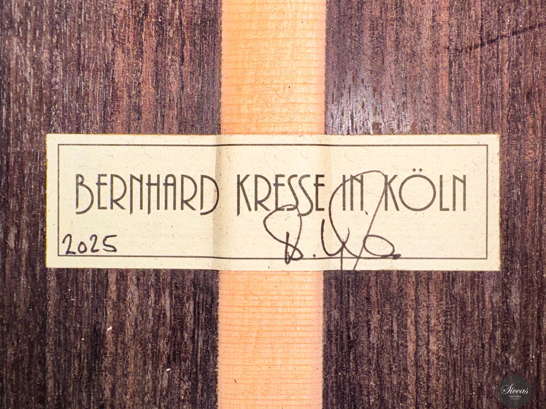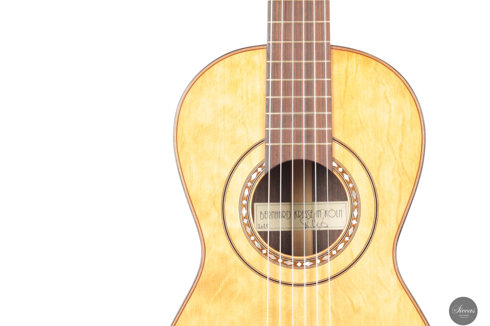 Bernhard Kresse, based in Cologne, Germany, is internationally recognized for his expertise in building historically informed instruments as well as modern classical guitars. His deep knowledge of nineteenth-century Spanish and French traditions, combined with meticulous craftsmanship, has earned him a reputation as one of Europe’s leading luthiers for historically inspired guitars. He is especially admired for his faithful reconstructions of romantic-era instruments, which capture the authentic sound world of the early guitar repertoire while maintaining the structural reliability required by today’s performers.About the guitar