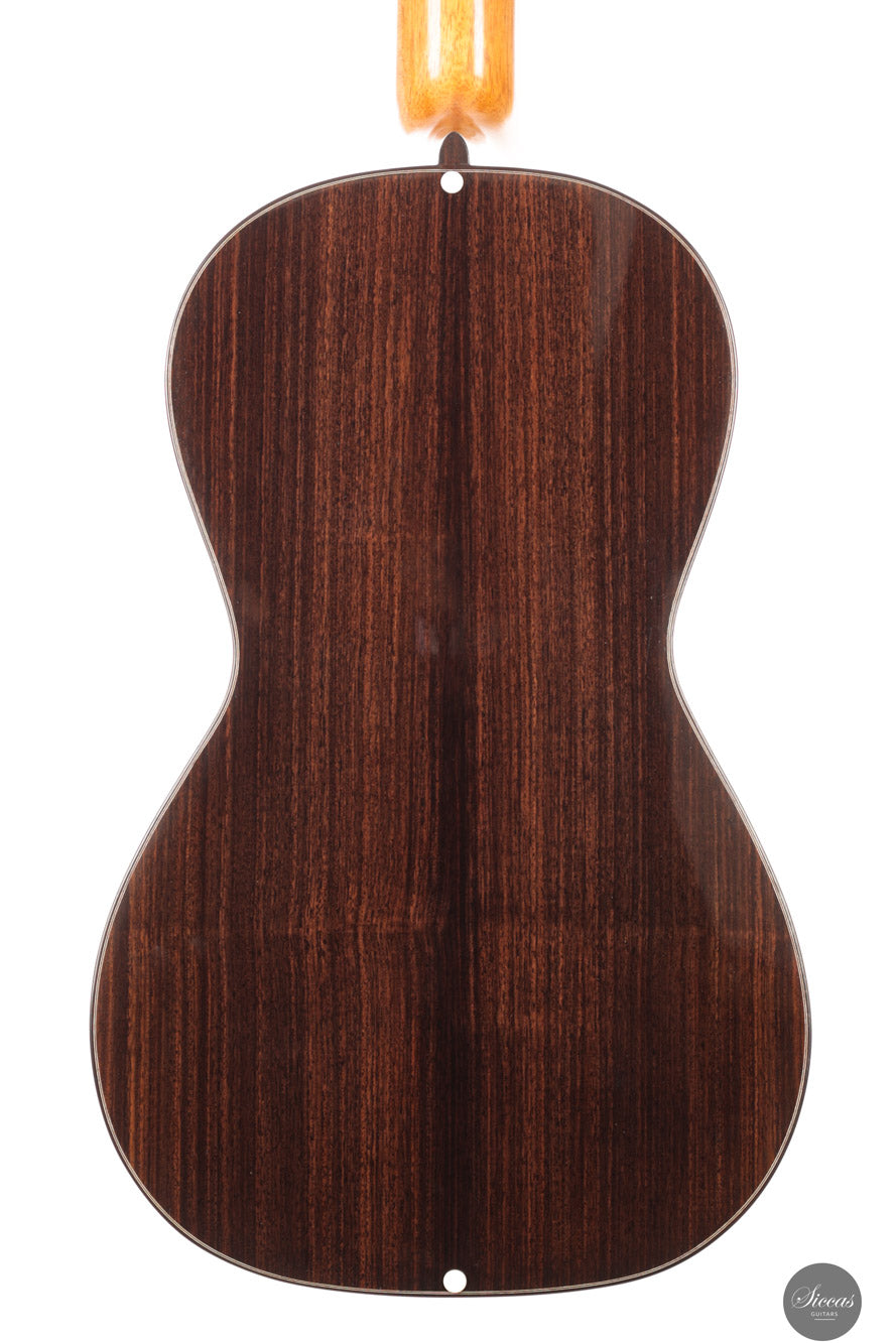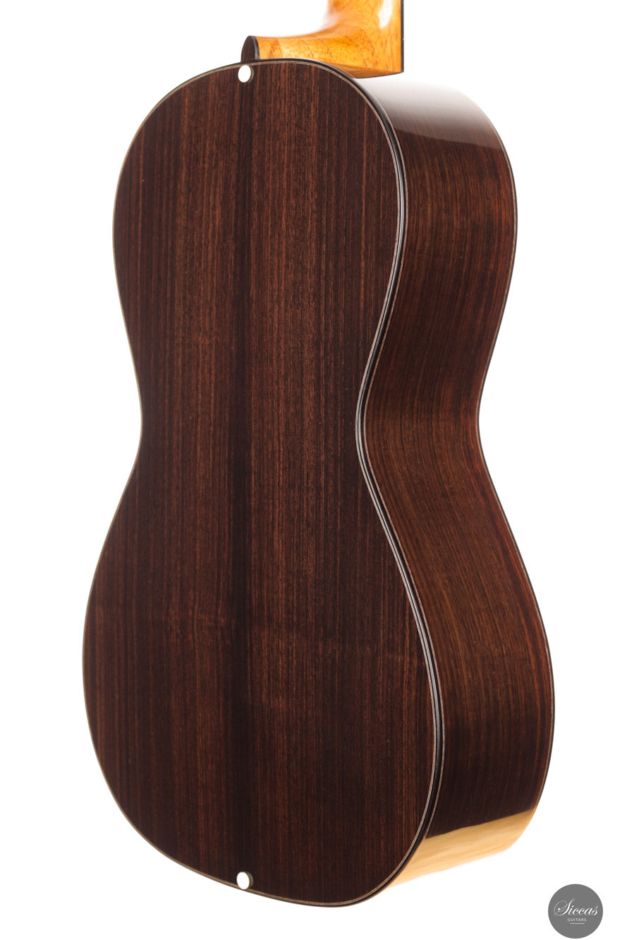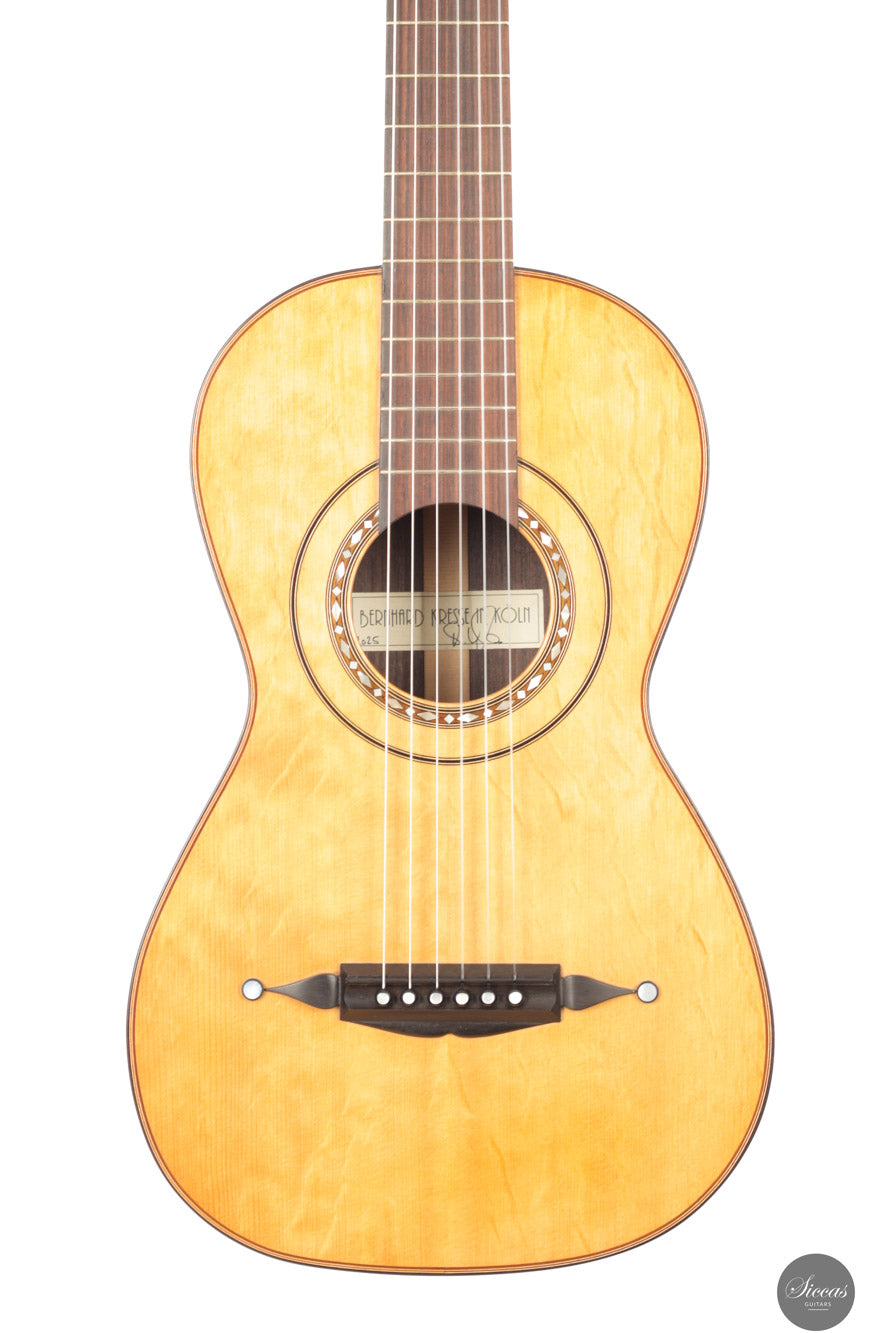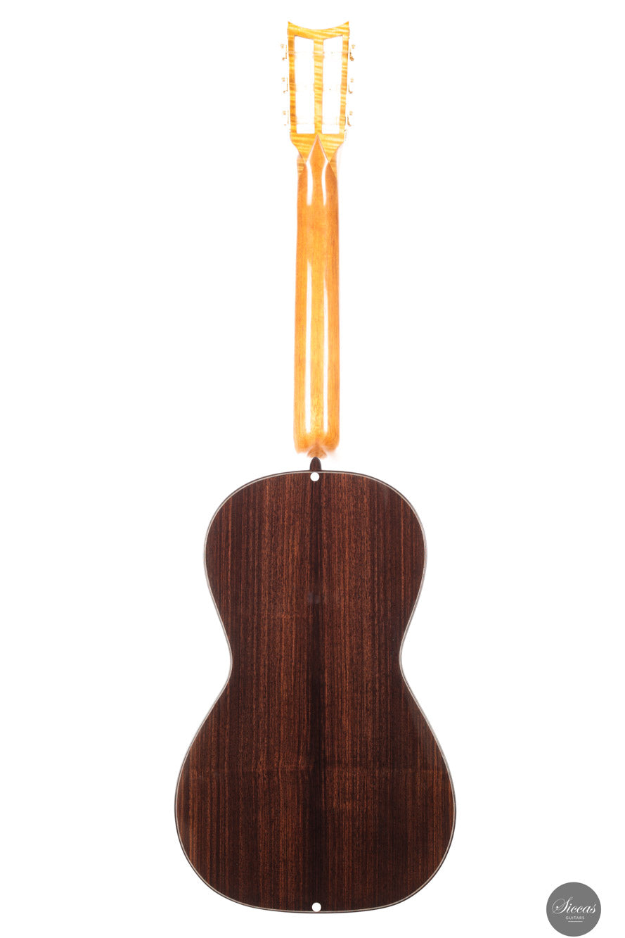 This guitar, completed in 2025, is Bernhard Kresse’s interpretation of a Louis Panormo instrument from 1843. It features a spruce soundboard and Indian rosewood back and sides, finished with French polish. With a shorter 630 mm scale length, a 47 mm nut, and a remarkably light weight of only 1190 grams, it offers the playability and tonal character typical of romantic-era guitars. The elegant design is completed with Alessi tuners and refined craftsmanship in every detail. The tonal profile reflects the intimate and lyrical qualities associated with early nineteenth-century guitars. The sound is soft, warm, and slightly nasal, with a pronounced midrange that evokes the original Panormo character. Its balance and clarity make it ideally suited for repertoire of the classical and romantic periods, offering both expressive delicacy and historical authenticity. Despite its historical model, the instrument is entirely new, reliable, and built to the highest modern standards of precision.Regular care extends the life of the instrument