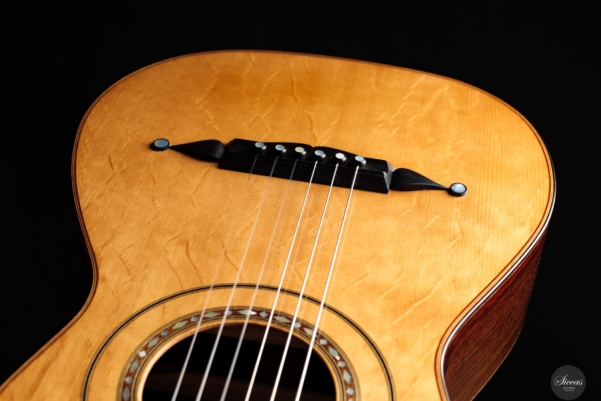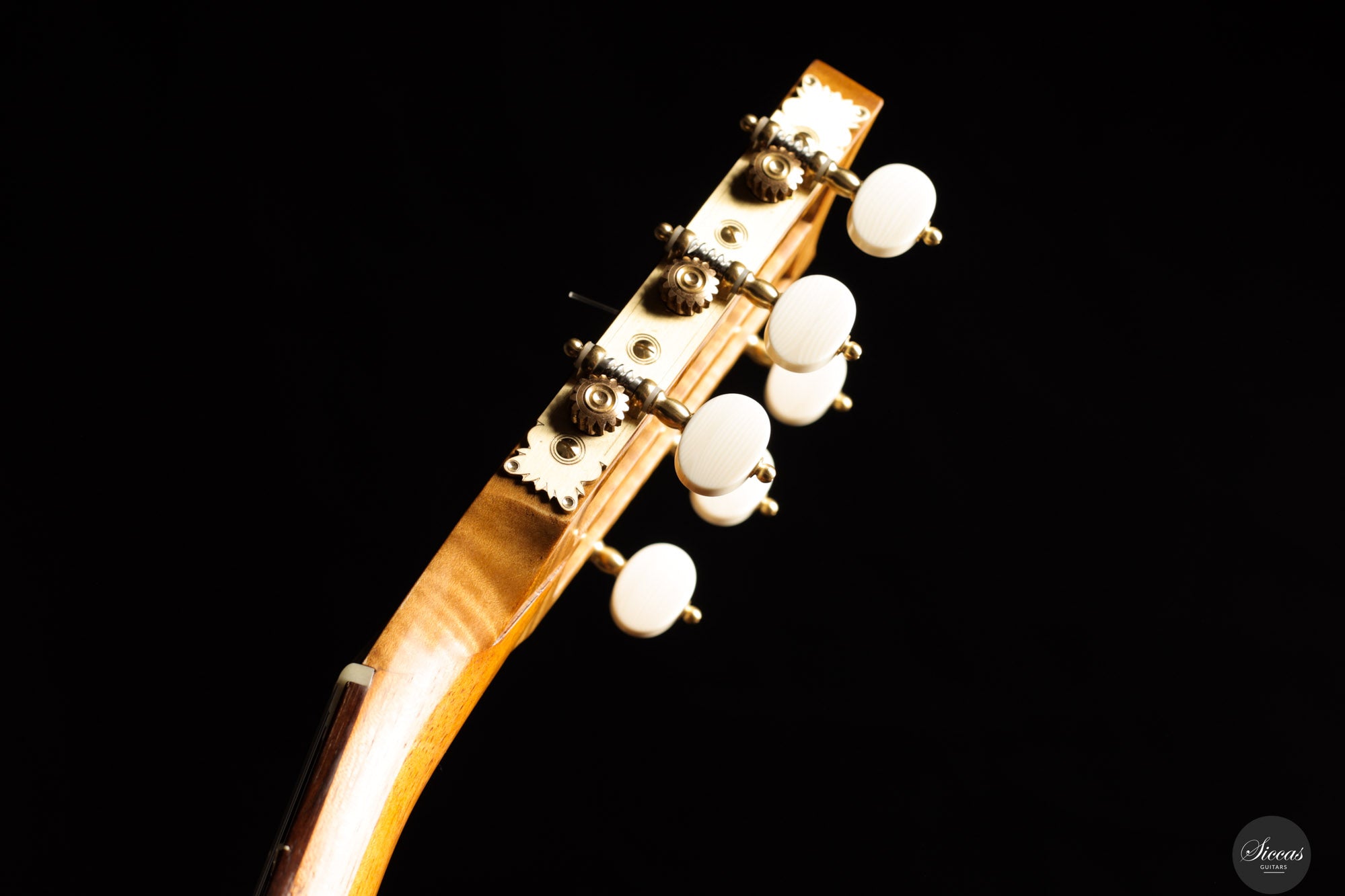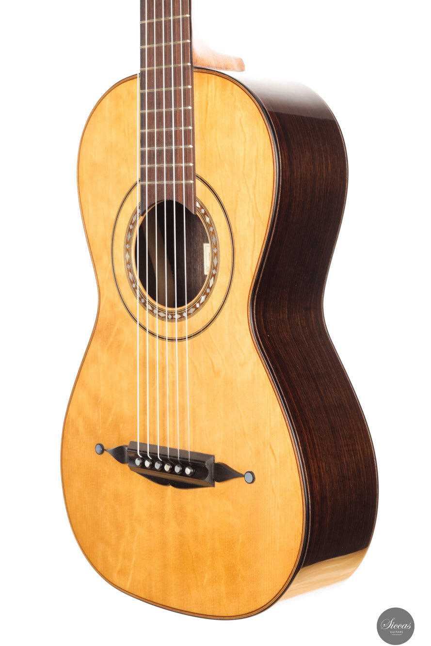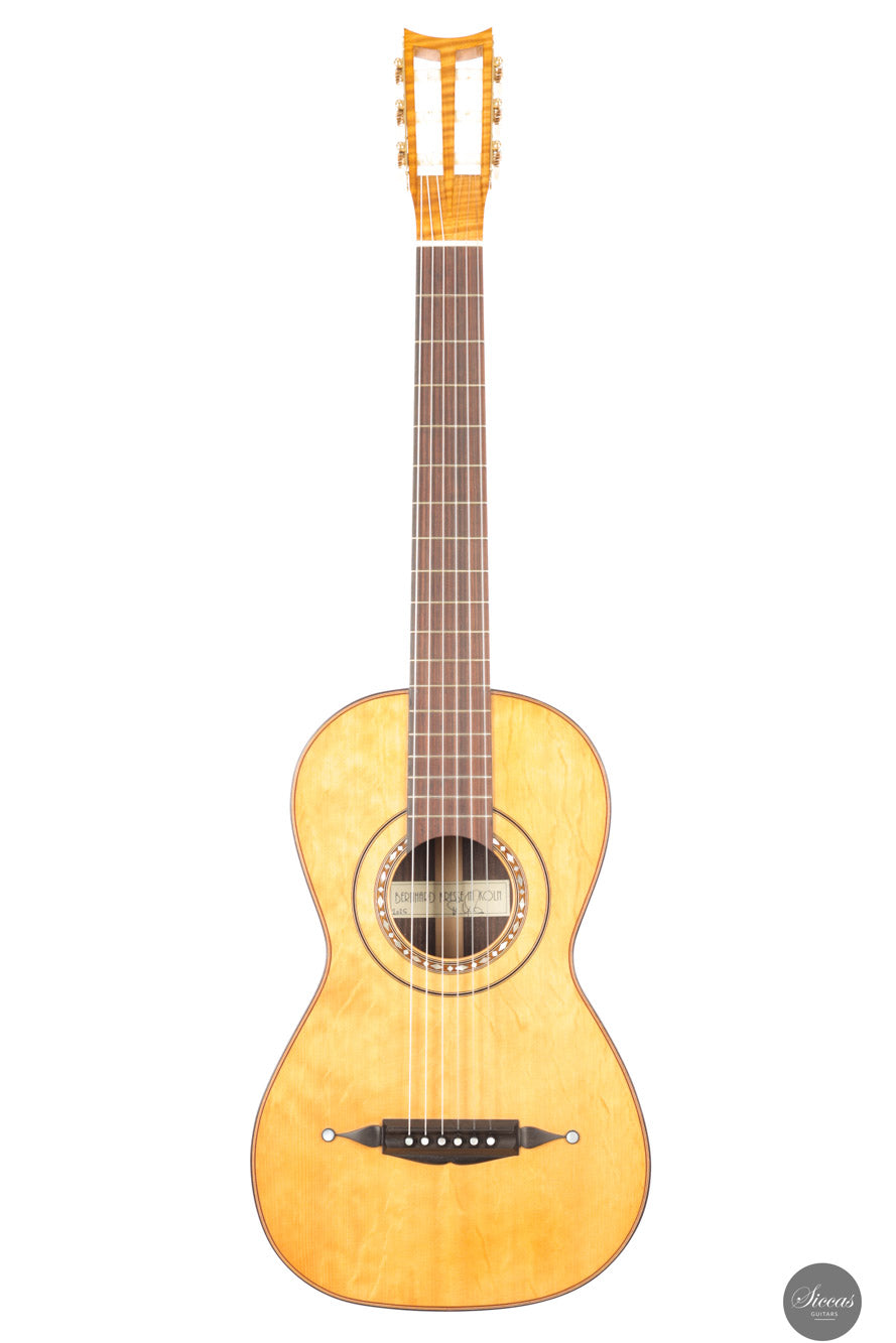 This guitar, completed in 2025, is Bernhard Kresse’s interpretation of a Louis Panormo instrument from 1843. It features a spruce soundboard and Indian rosewood back and sides, finished with French polish. With a shorter 630 mm scale length, a 47 mm nut, and a remarkably light weight of only 1190 grams, it offers the playability and tonal character typical of romantic-era guitars. The elegant design is completed with Alessi tuners and refined craftsmanship in every detail. The tonal profile reflects the intimate and lyrical qualities associated with early nineteenth-century guitars. The sound is soft, warm, and slightly nasal, with a pronounced midrange that evokes the original Panormo character. Its balance and clarity make it ideally suited for repertoire of the classical and romantic periods, offering both expressive delicacy and historical authenticity. Despite its historical model, the instrument is entirely new, reliable, and built to the highest modern standards of precision.Regular care extends the life of the instrument