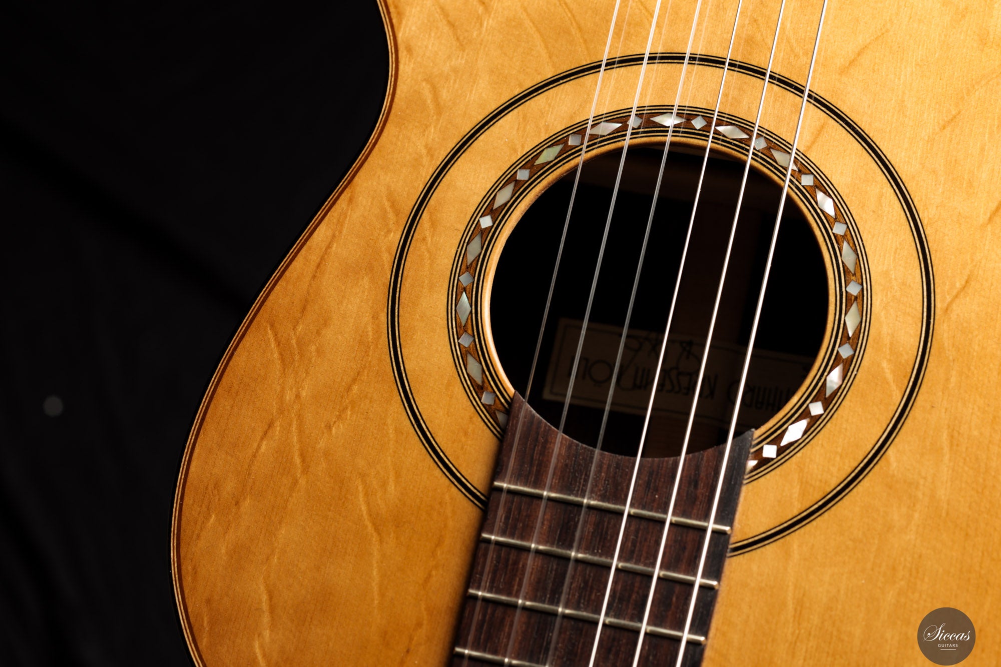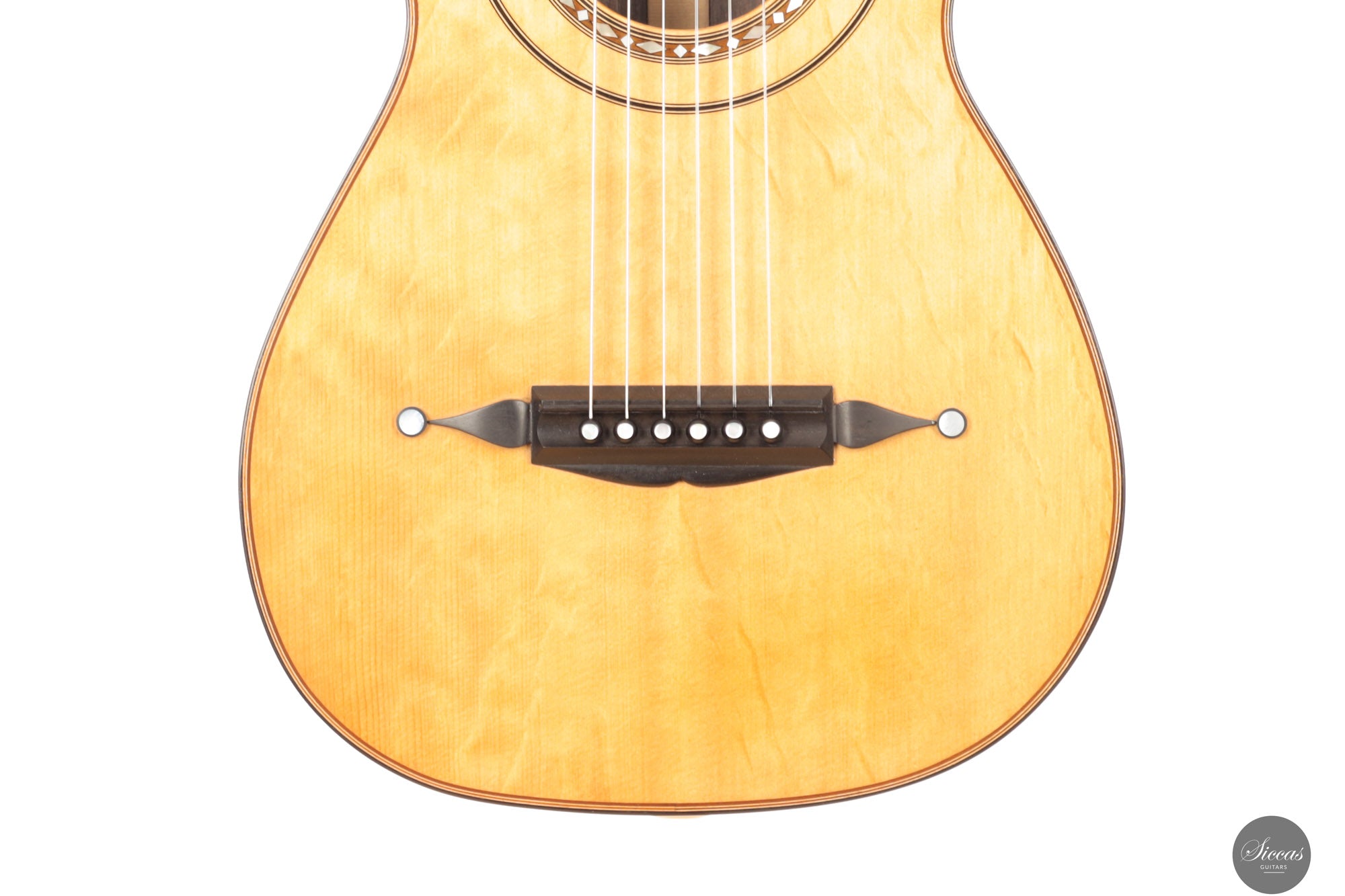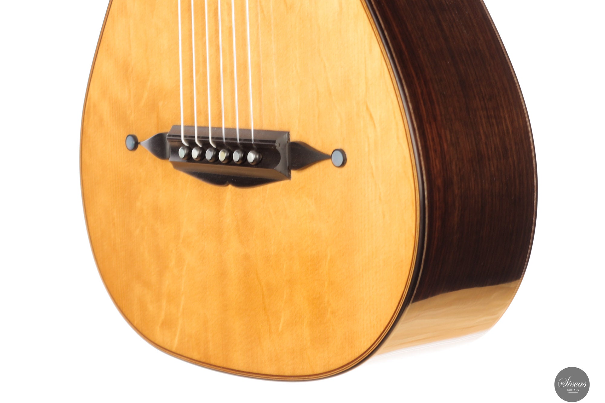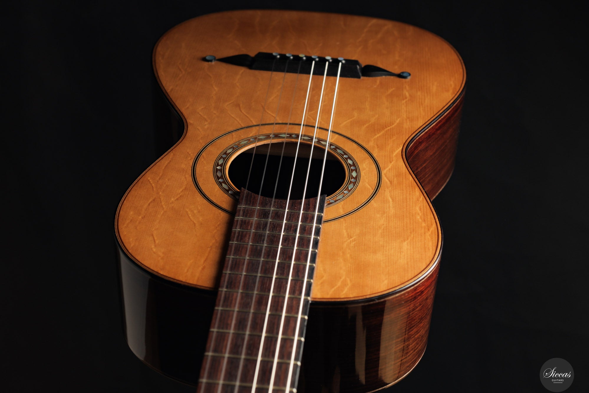 This guitar, completed in 2025, is Bernhard Kresse’s interpretation of a Louis Panormo instrument from 1843. It features a spruce soundboard and Indian rosewood back and sides, finished with French polish. With a shorter 630 mm scale length, a 47 mm nut, and a remarkably light weight of only 1190 grams, it offers the playability and tonal character typical of romantic-era guitars. The elegant design is completed with Alessi tuners and refined craftsmanship in every detail. The tonal profile reflects the intimate and lyrical qualities associated with early nineteenth-century guitars. The sound is soft, warm, and slightly nasal, with a pronounced midrange that evokes the original Panormo character. Its balance and clarity make it ideally suited for repertoire of the classical and romantic periods, offering both expressive delicacy and historical authenticity. Despite its historical model, the instrument is entirely new, reliable, and built to the highest modern standards of precision.Regular care extends the life of the instrument