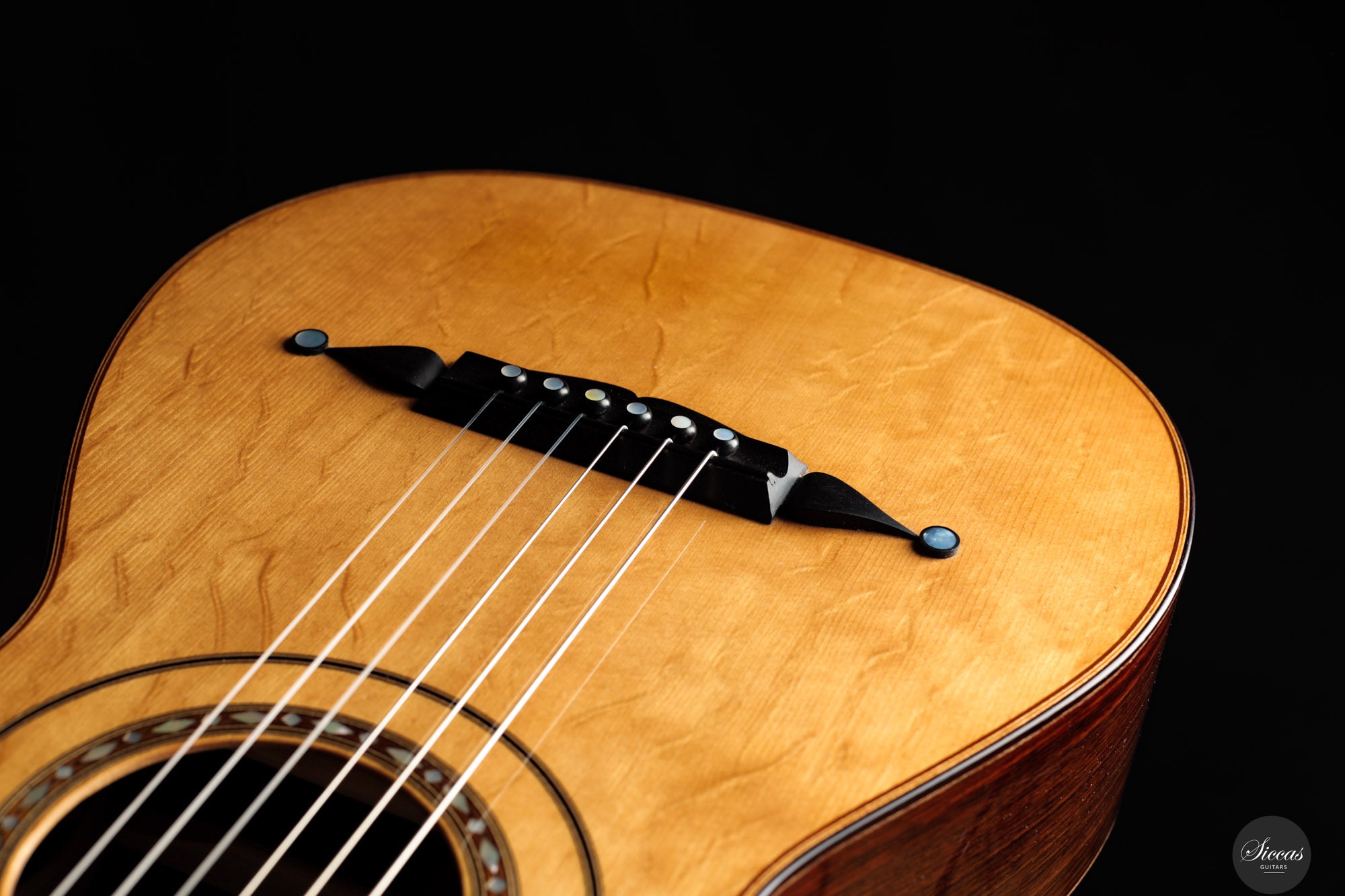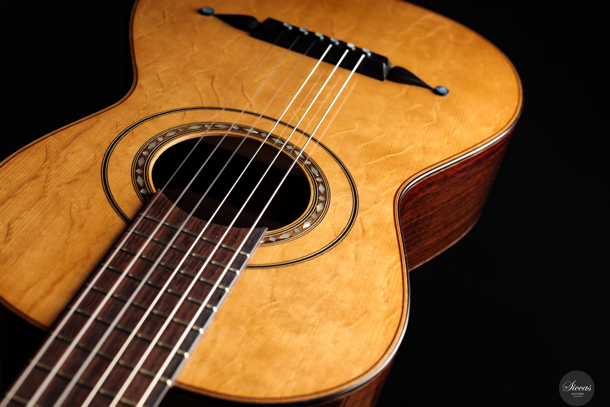 Be mindful when touching your instrument with greasy or unwashed hands: any skin contact is a small attack on the varnish. Of course, a guitar is made to be played, but taking a few precautions helps preserve its beauty: wash your hands before playing, wear long sleeves, and avoid unnecessary direct skin contact with the body of the instrument.