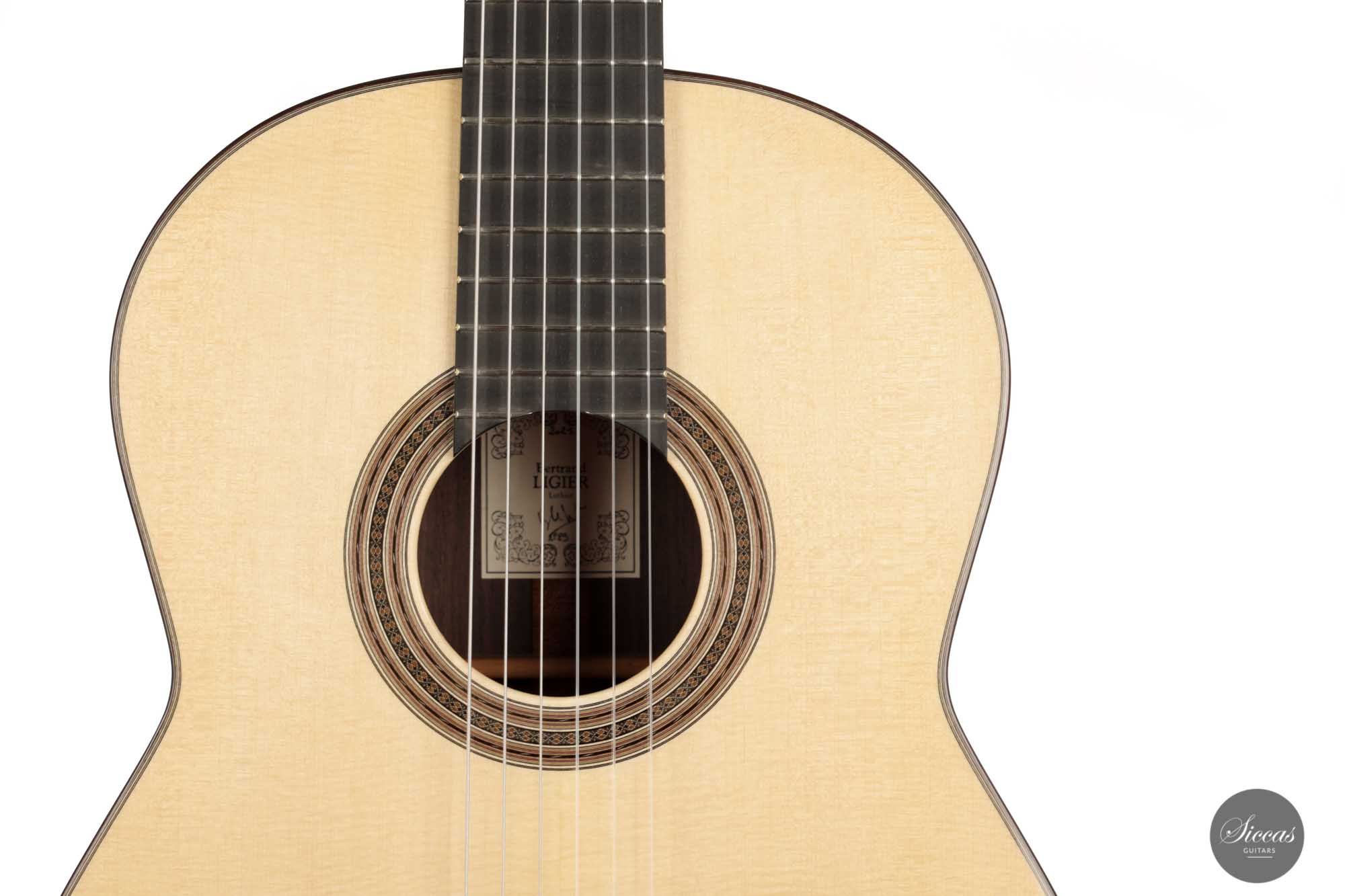 Bertrand Ligier is a French luthier based in Connaux, near Avignon in the south of France. His guitars follow the French tradition and are crafted with great finesse. Particular attention is given to the French polish, and the sound qualities follow those of Dominique Field and Daniel Friederich’s guitars. Bertrand has adopted some aesthetic details from the history of guitar making and has made them his own with outstanding refinement and taste. For instance, the shape of the head as well as the illuminations and the size of the label are reminiscent of those of Robert Bouchet. The rosette is of the utmost delicacy and the intricate mosaic pieces that compose it are assembled with skillful precision.