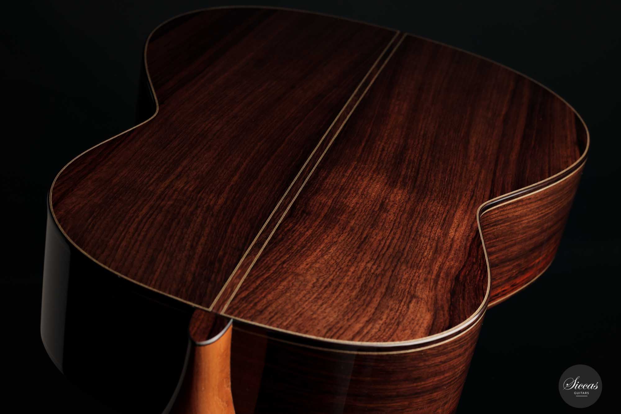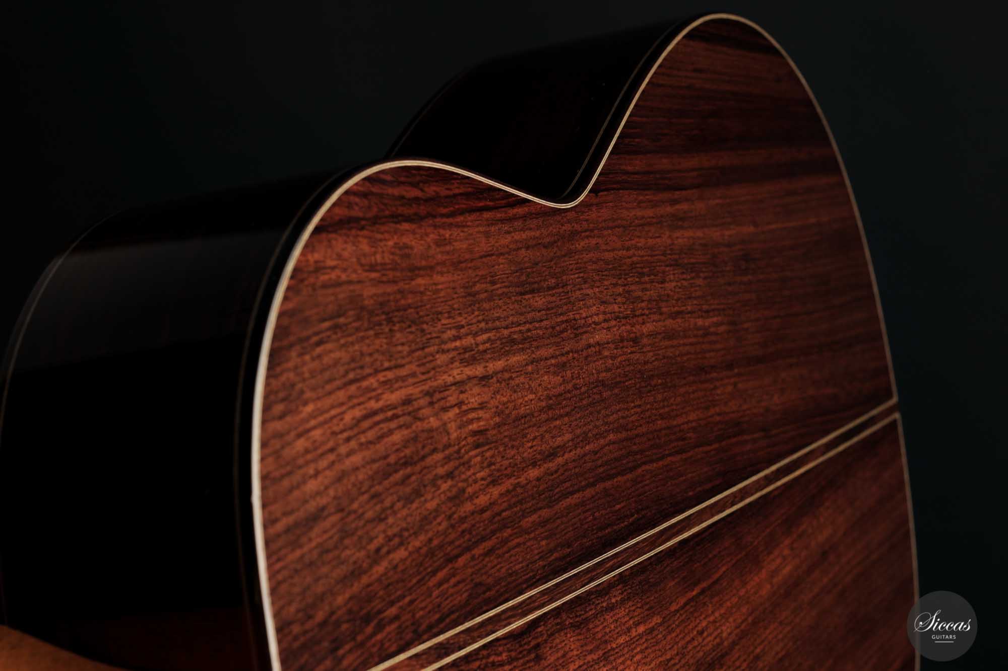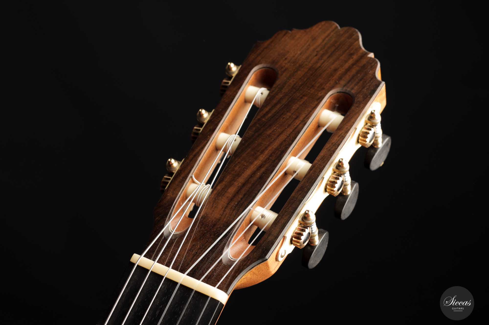 What a guitar! This instrument, built in 2021 and numbered 89, is as new. Almost no playing marks are to be seen on the glass-like french polish. The French guitar-making school has arguably been leading worldwide lutherie in terms of finesse and elegance for the past 50 years. First with Robert Bouchet and then Daniel Friederich and Dominique Field, followed by Jean-Noel Rohé. Now Bertrand Ligier brings the tradition even further with a spectacular craftsmanship quality displayed on this guitar. In our opinion, this rosette is a sign of genius. Deep in the Bertrand Ligier style with details in the tenth of millimeter size, it displays a hidden hommage to Daniel Friederichs rosette that is truly emotional to us. The colors and shape of the central mosaic are a work of art and a mesmerizing fresco telling the story of the French guitar-making school.