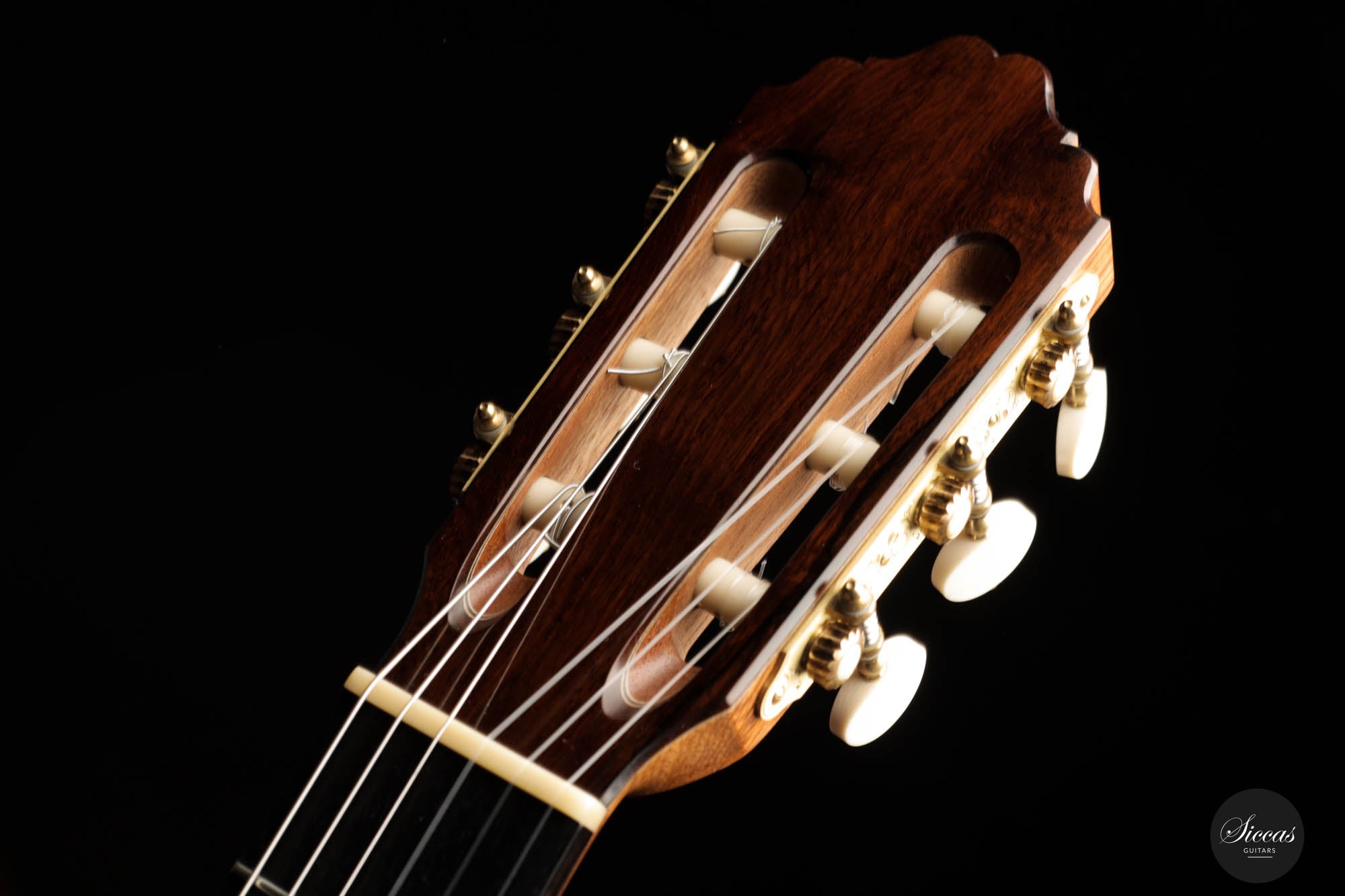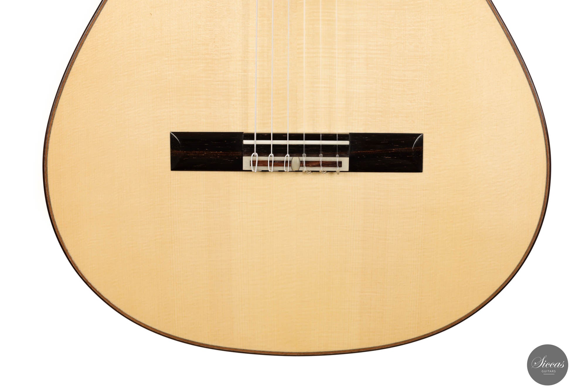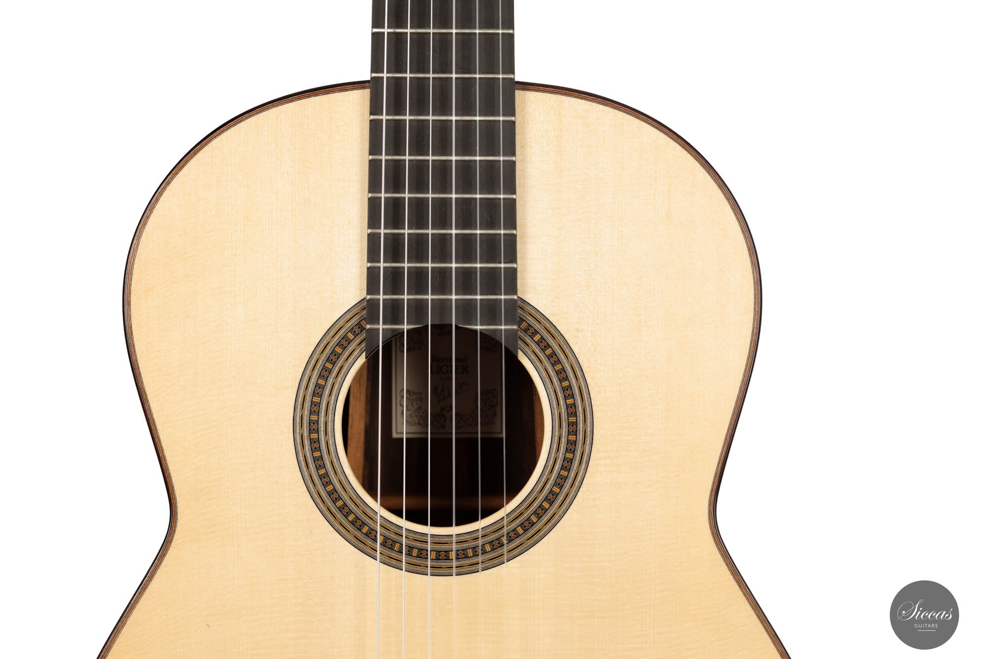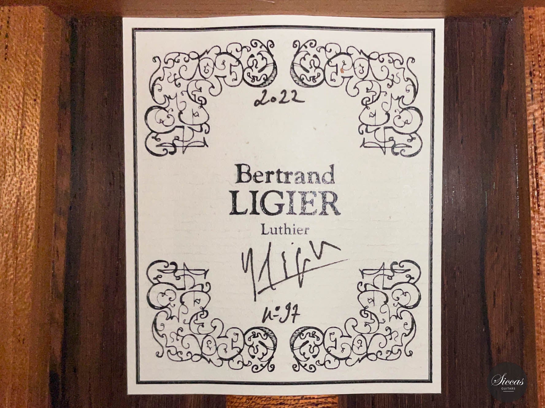 Bertrand Ligier is a French luthier based in Connaux, near Avignon, in southern France. His guitars follow the French tradition and are crafted with great finesse. Particular attention is given to the French polish, and the sound qualities follow those of Dominique Field and Daniel Friederich’s guitars. Bertrand has adopted some aesthetic details from the history of guitar making and has made them his own with outstanding refinement and taste. For instance, the shape of the head as well as the illuminations and the size of the label, are reminiscent of Robert Bouchet's. The rosette is of the utmost delicacy, and the intricate mosaic pieces that compose it are assembled with skillful precision.