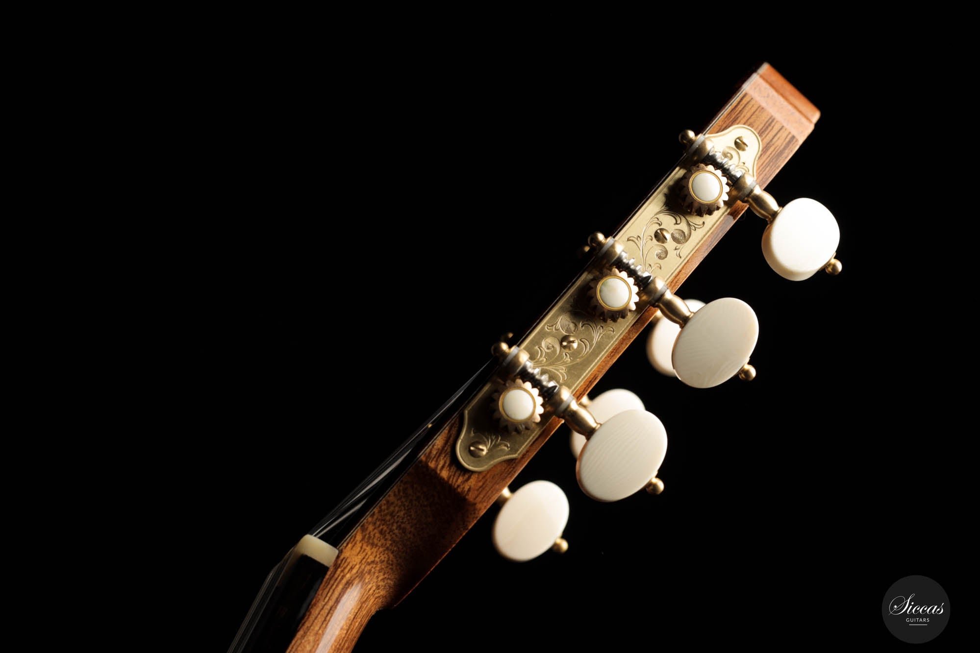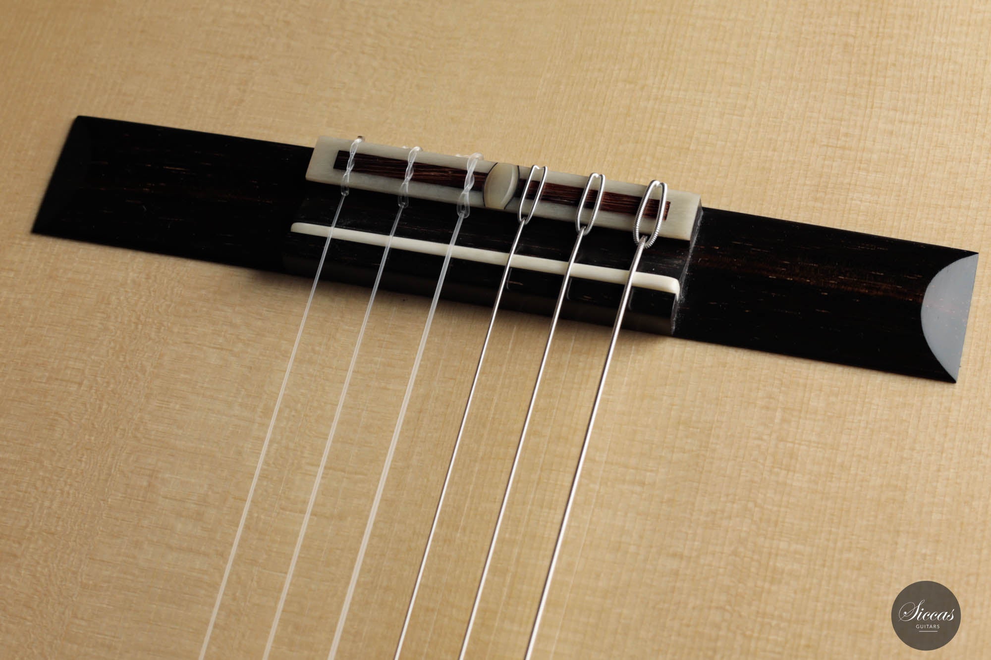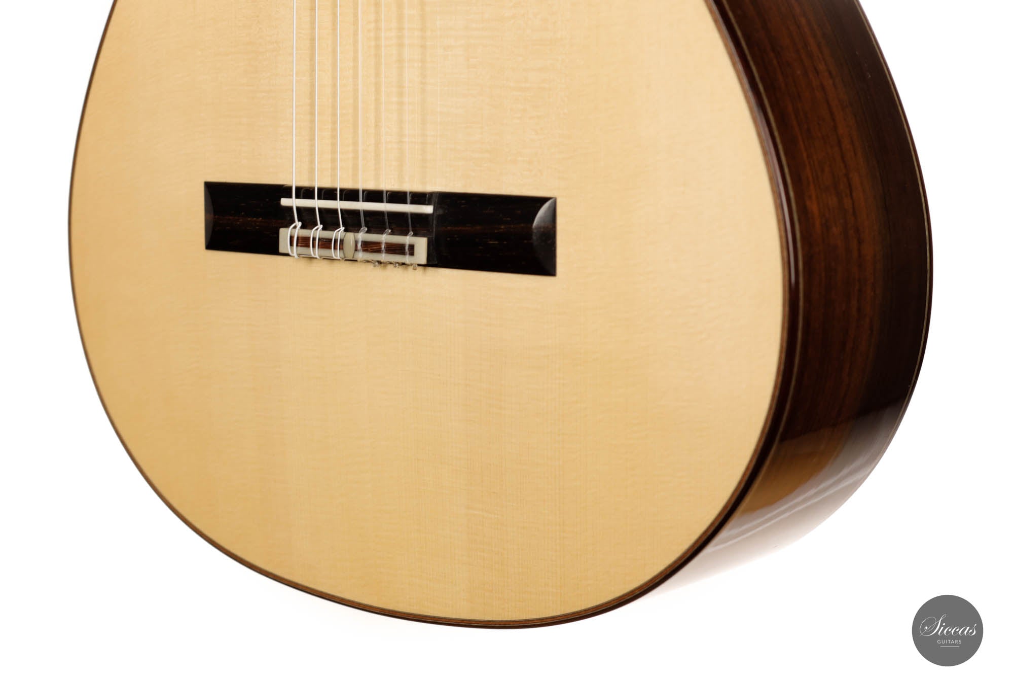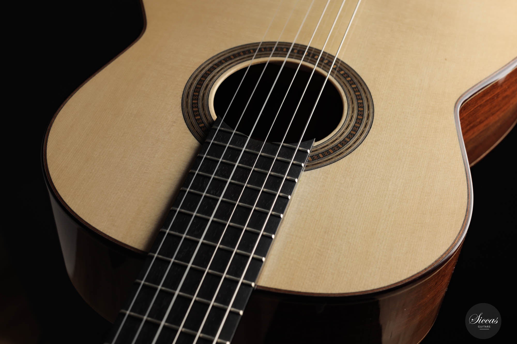 Bertrand Ligier is a French luthier based in Connaux, near Avignon, in southern France. His guitars follow the French tradition and are crafted with great finesse. Particular attention is given to the French polish, and the sound qualities follow those of Dominique Field and Daniel Friederich’s guitars. Bertrand has adopted some aesthetic details from the history of guitar making and has made them his own with outstanding refinement and taste. For instance, the shape of the head as well as the illuminations and the size of the label, are reminiscent of Robert Bouchet's. The rosette is of the utmost delicacy, and the intricate mosaic pieces that compose it are assembled with skillful precision.