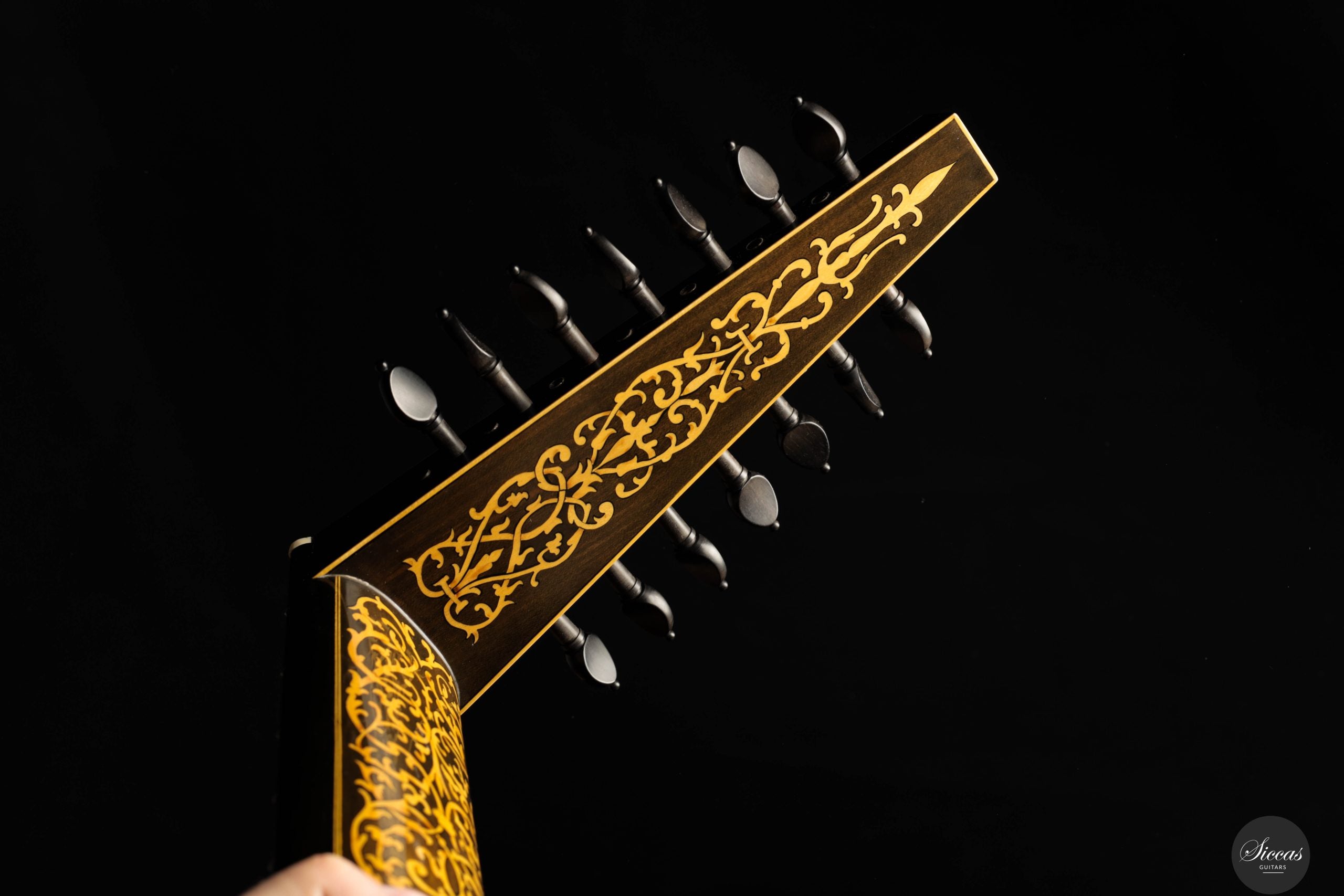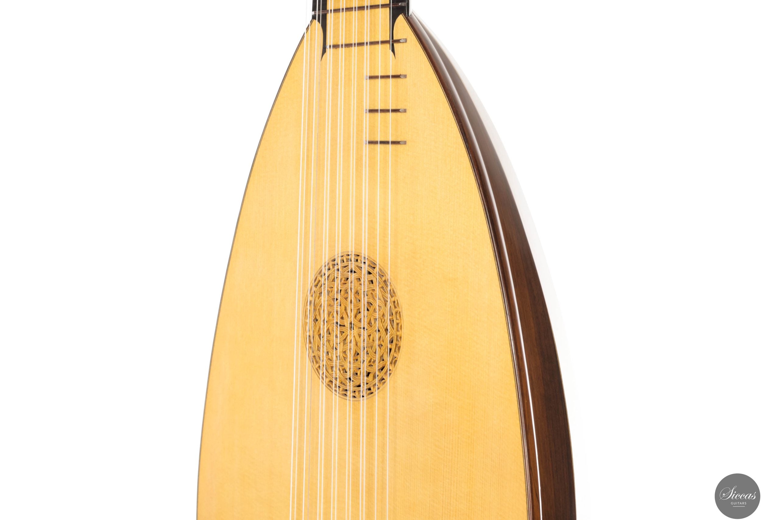 This instrument is in excellent condition, showing only minimal signs of use. There is one distinct scratch behind the bridge that is purely superficial and does not impact the instrument’s structure or acoustics. The lute has been exceptionally well maintained and remains fully concert-ready; an outstanding choice for both professional performance and serious collectors.