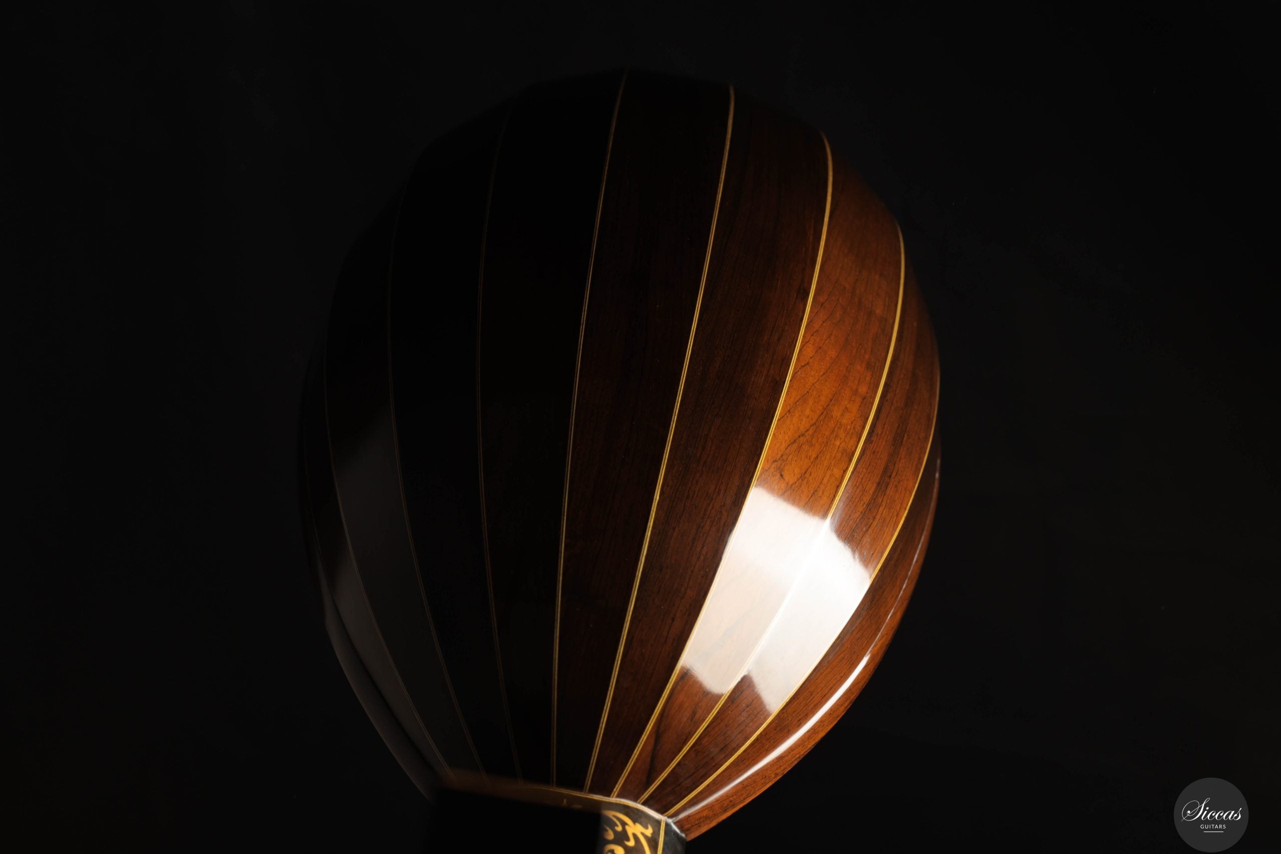 This elegant 8-course lute, built in 1981 by Brian Cohen, exemplifies his deep understanding of historical instrument making. The top is made of finely grained spruce, providing clarity and resonance ideal for the repertoire of the early Baroque and Renaissance periods. The back and sides are crafted from beautifully figured Indian rosewood, lending the instrument not only visual warmth but also rich, sonorous depth. The body’s graceful curves and balanced weight make it both visually refined and a pleasure to play.