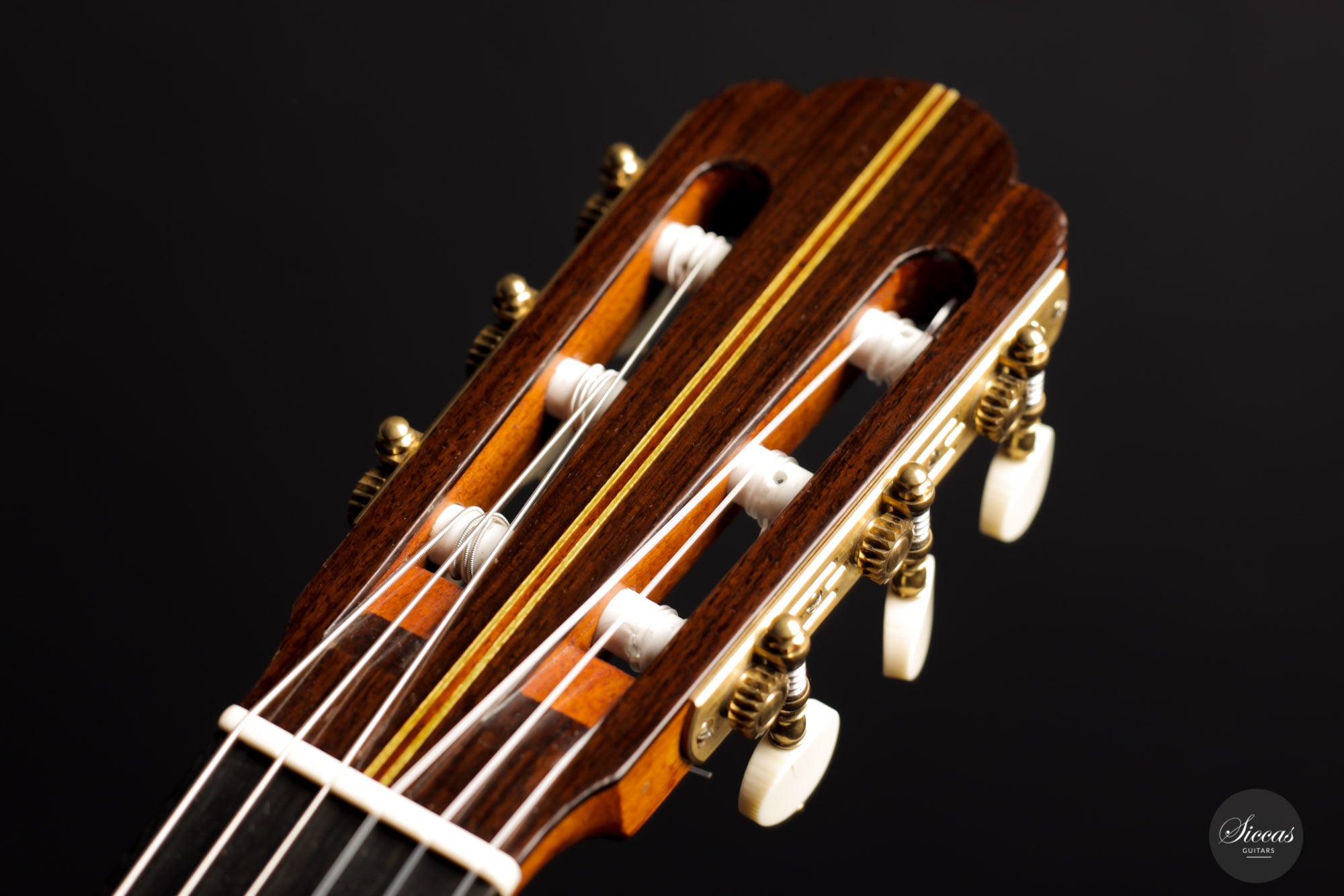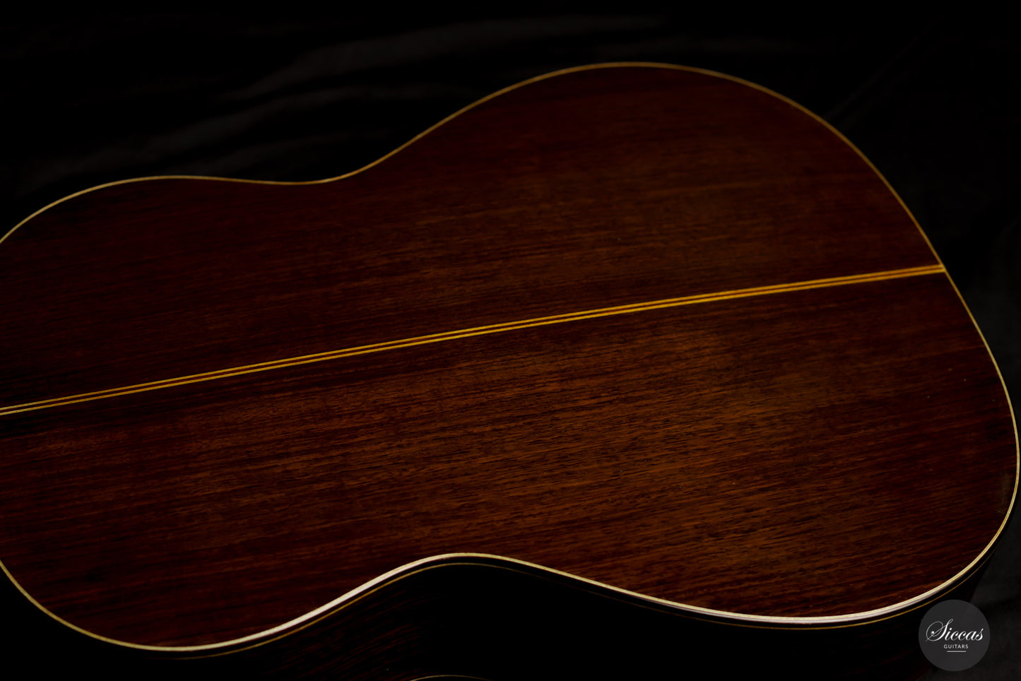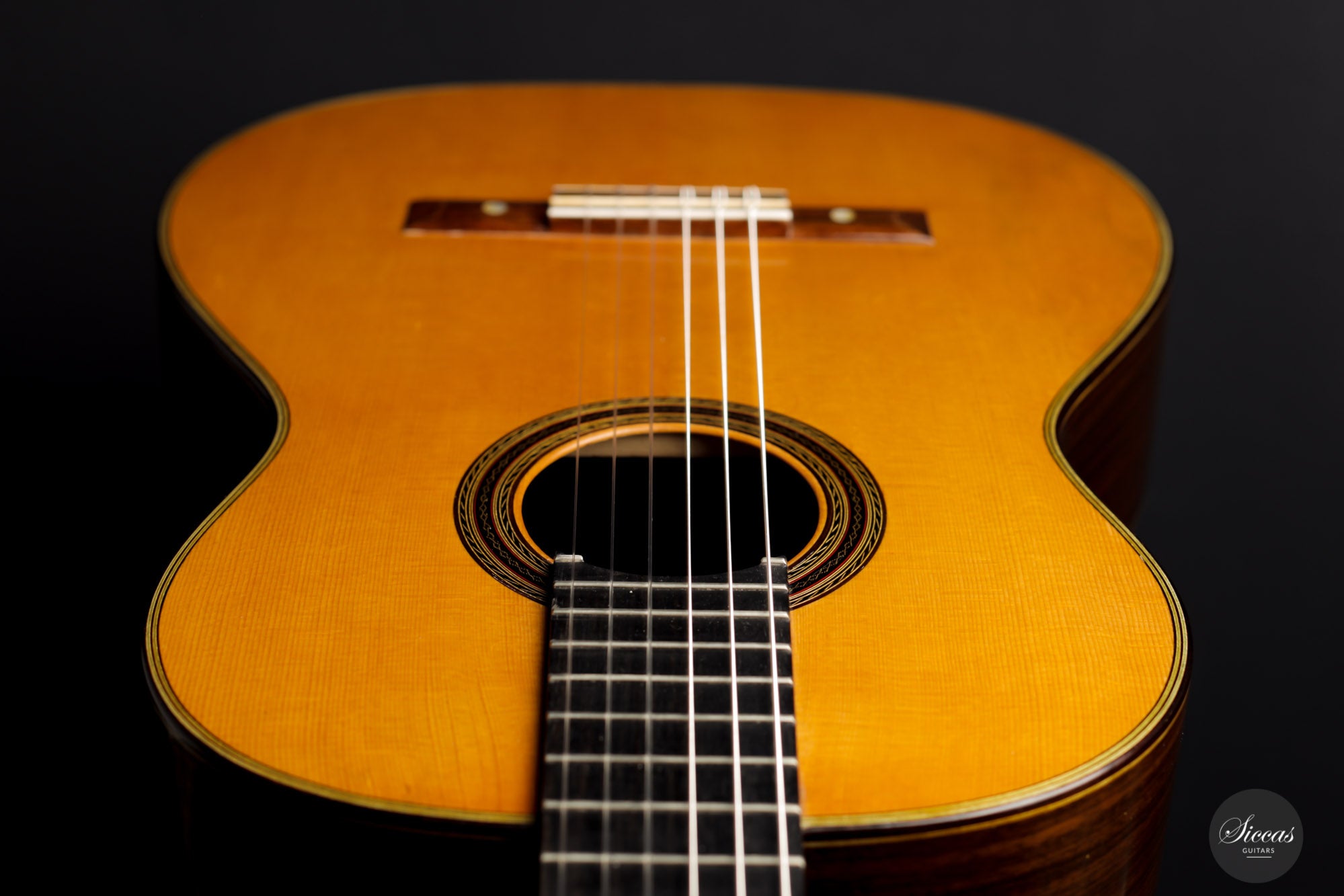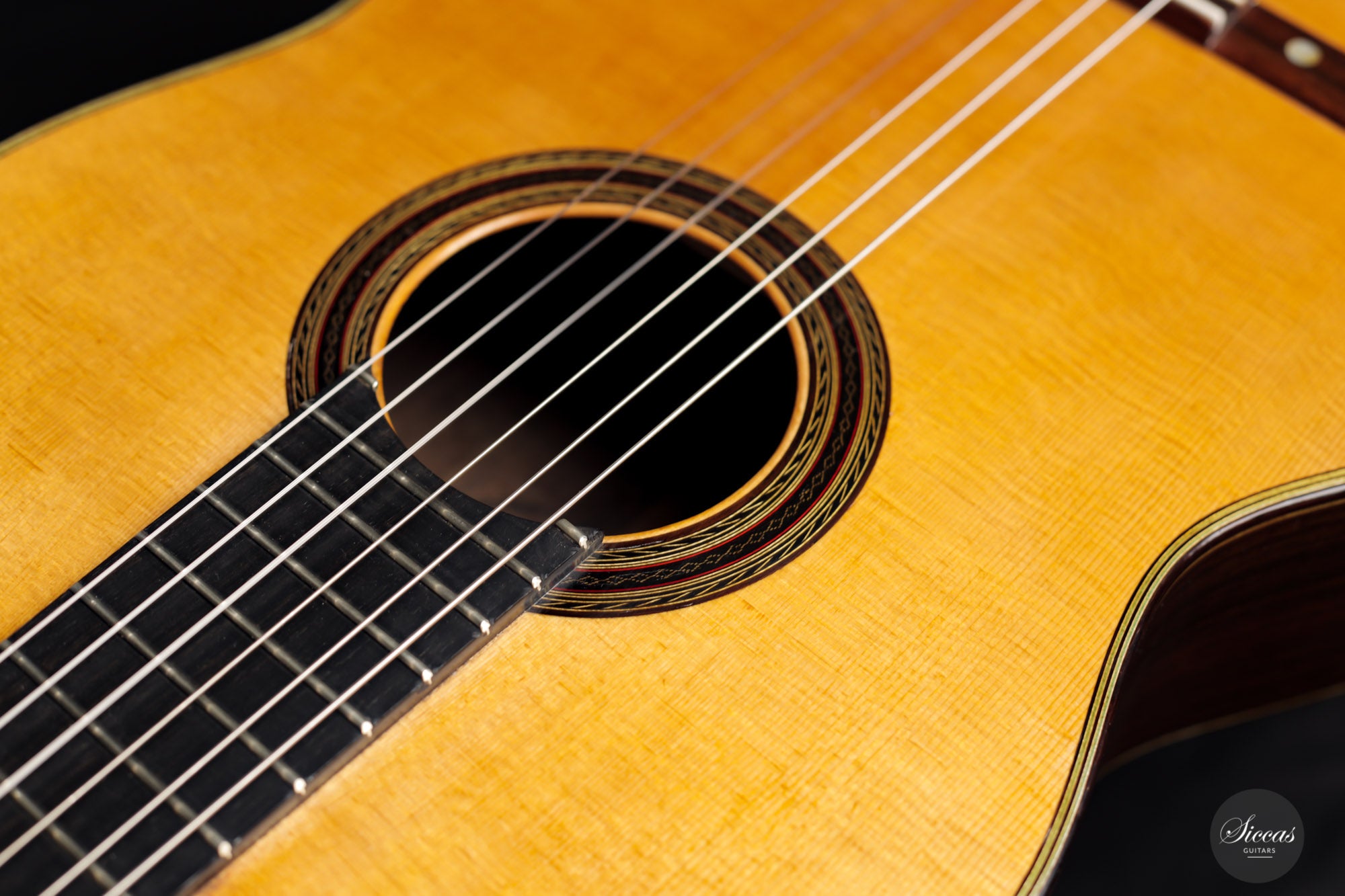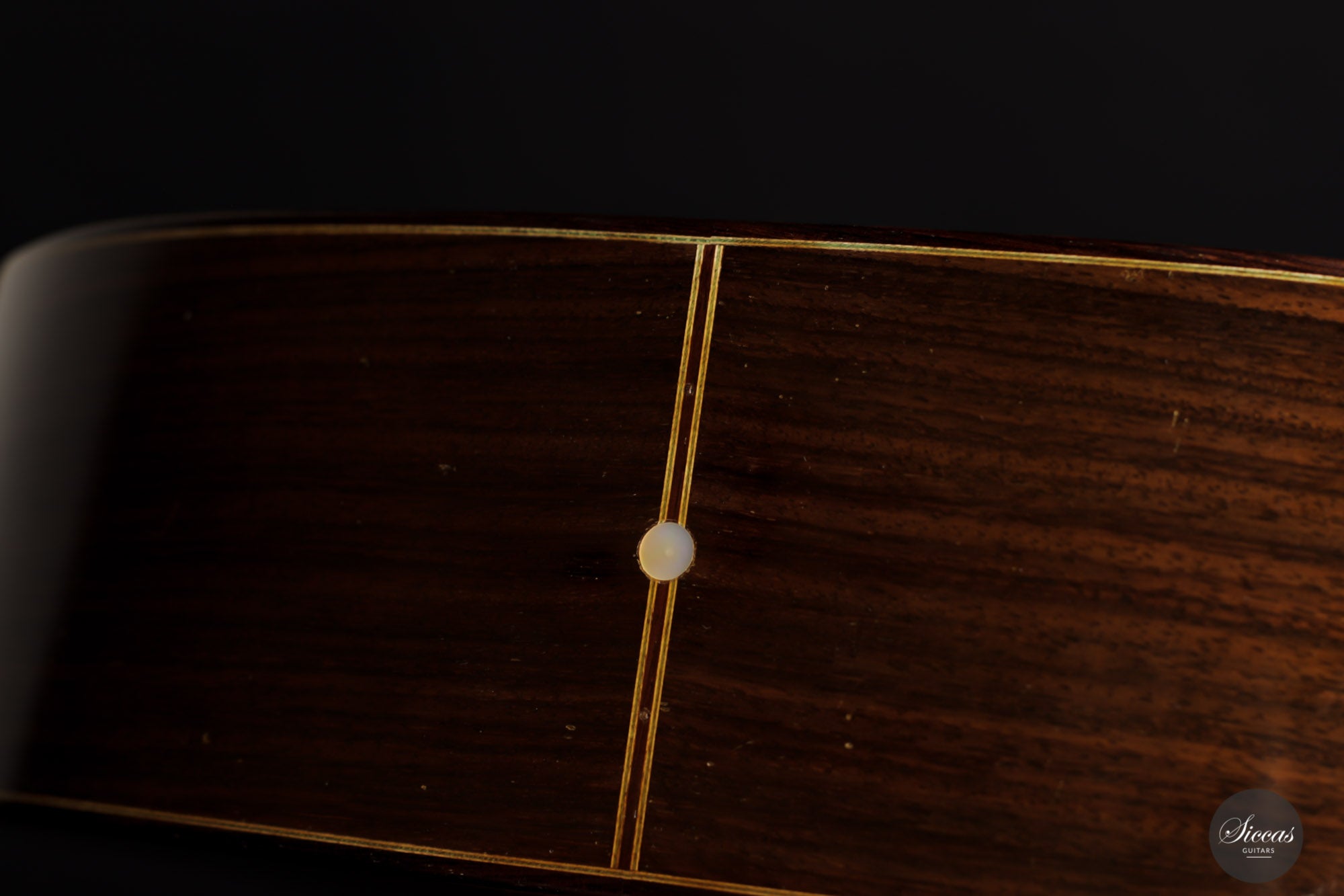 Boden und Zargen dieser Replika einer Gitarre von 1947 von einem der bekanntesten deutschen Gitarrenbauern des 20. Jahrhunderts sind aus indischem Palisander und die Decke aus einer wunderschönen Haselfichte gefertigt. Allein die Ästhetik der Hölzer ist bereits beeindruckend, aber auch die klanglichen Eigenschaften dieser Schäfer Gitarre sind äußerst faszinierend. Die erste Saite klingt wunderbar klar und präsent, mit einem langem Sustain und toller Strahlkraft. Die Bässe klingen warm und tragend und die einzelnen Töne lassen sich hervorragend formen. Die hochwertigen Mechaniken von Schaller passen hervorragend zum Gesamtbild dieser traditionell gebauten Gitarre und sorgen für eine perfektes und leichtgängiges Stimmen. Insgesamt befindet sich die Gitarre in einem sehr guten Zustand.