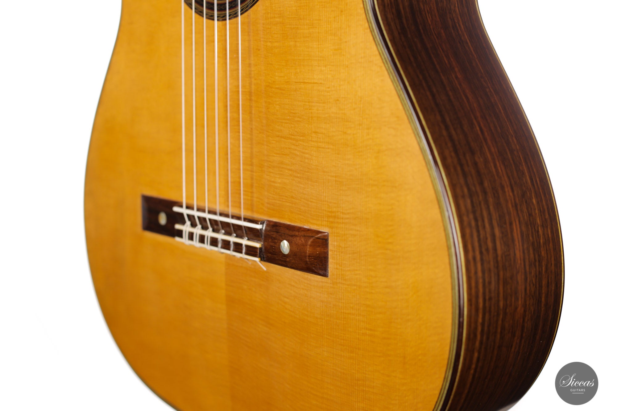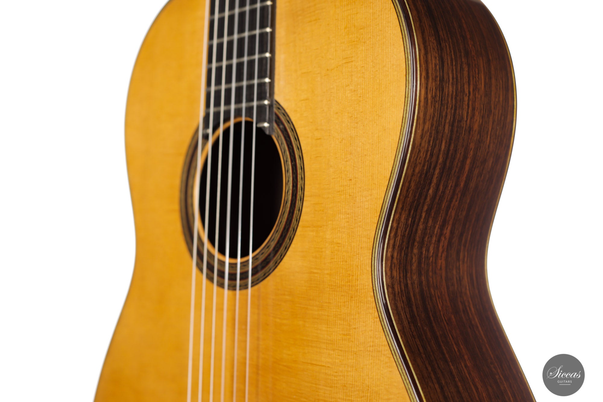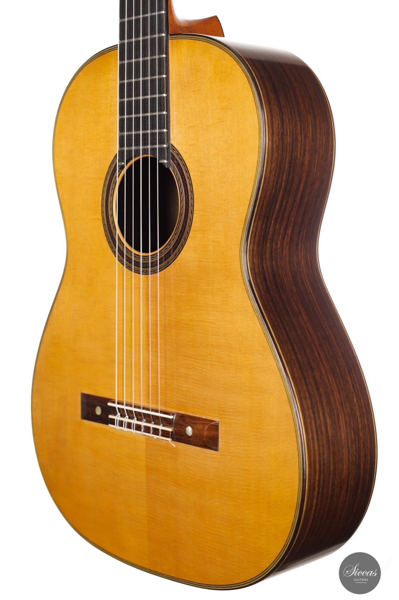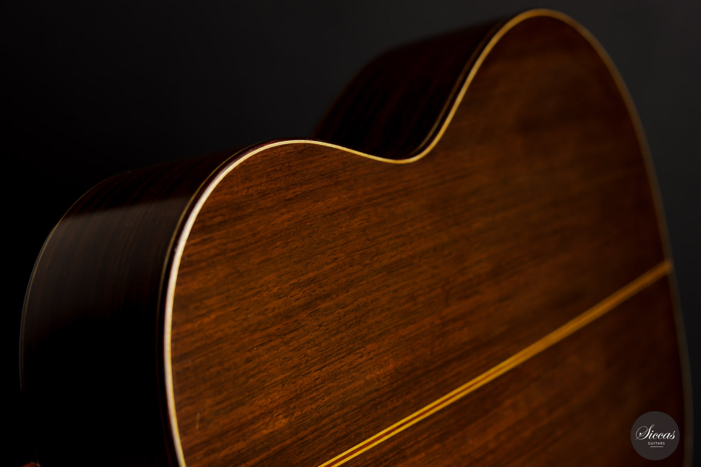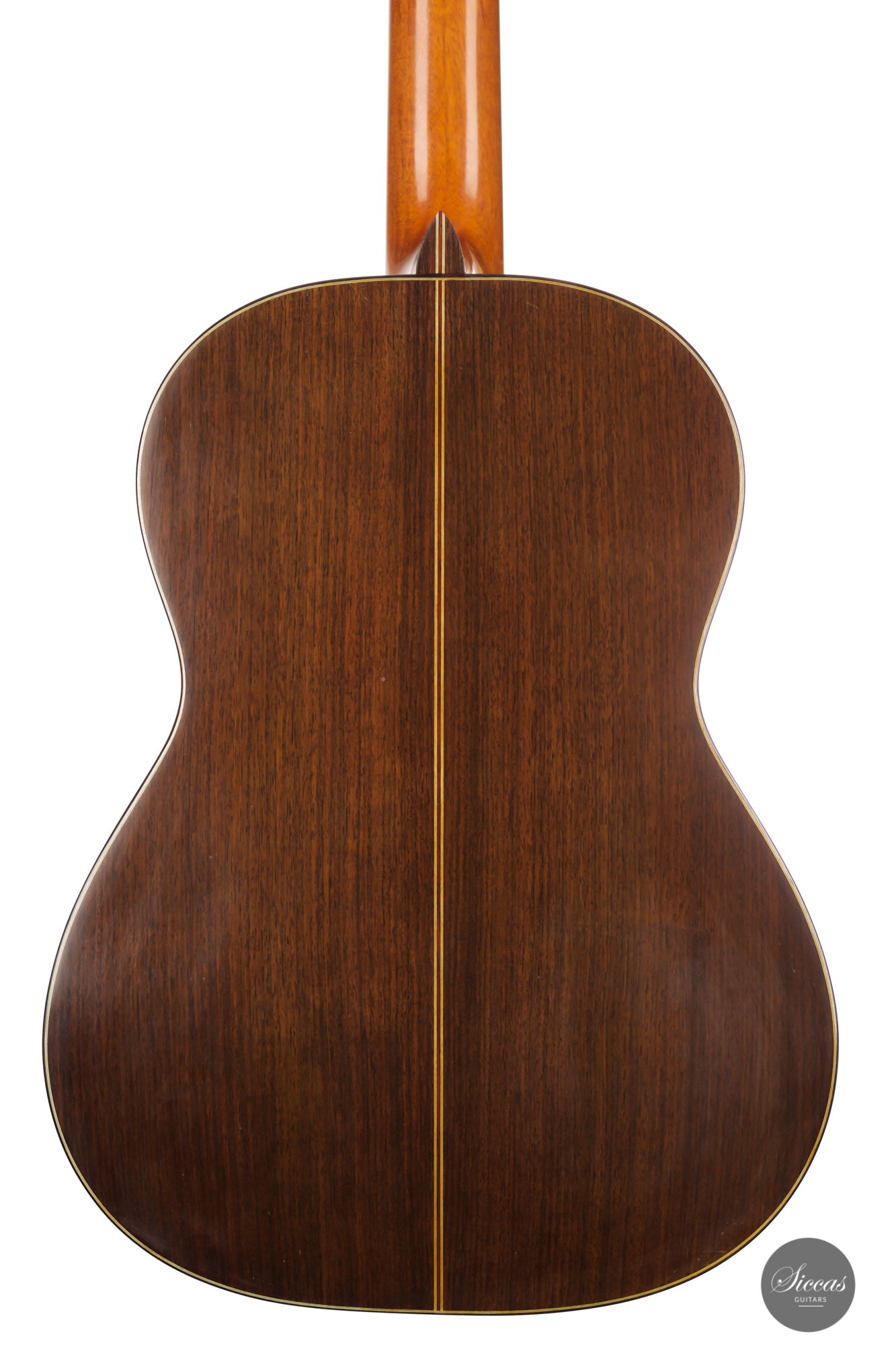 Boden und Zargen dieser Replika einer Gitarre von 1947 von einem der bekanntesten deutschen Gitarrenbauern des 20. Jahrhunderts sind aus indischem Palisander und die Decke aus einer wunderschönen Haselfichte gefertigt. Allein die Ästhetik der Hölzer ist bereits beeindruckend, aber auch die klanglichen Eigenschaften dieser Schäfer Gitarre sind äußerst faszinierend. Die erste Saite klingt wunderbar klar und präsent, mit einem langem Sustain und toller Strahlkraft. Die Bässe klingen warm und tragend und die einzelnen Töne lassen sich hervorragend formen. Die hochwertigen Mechaniken von Schaller passen hervorragend zum Gesamtbild dieser traditionell gebauten Gitarre und sorgen für eine perfektes und leichtgängiges Stimmen. Insgesamt befindet sich die Gitarre in einem sehr guten Zustand.