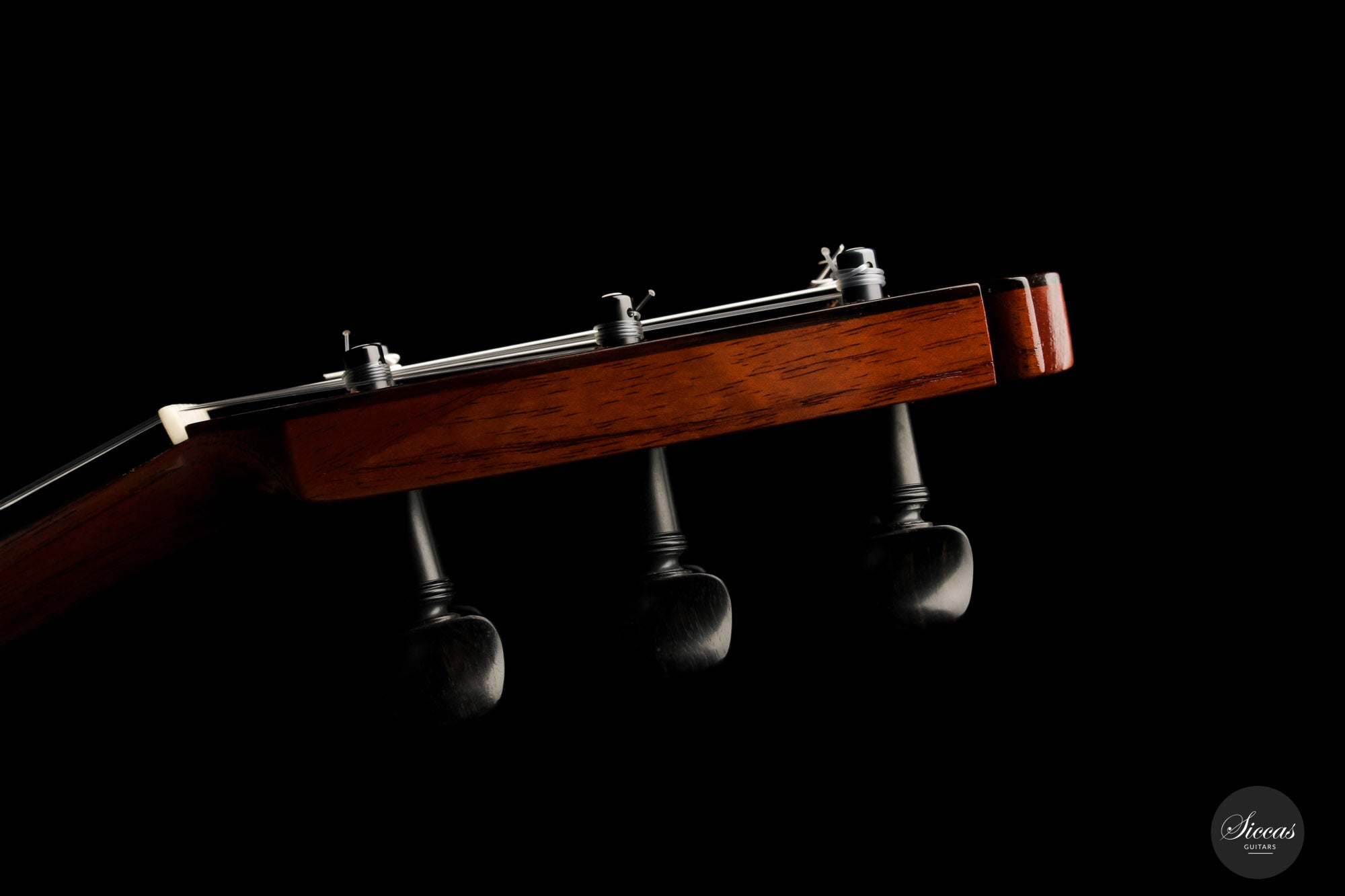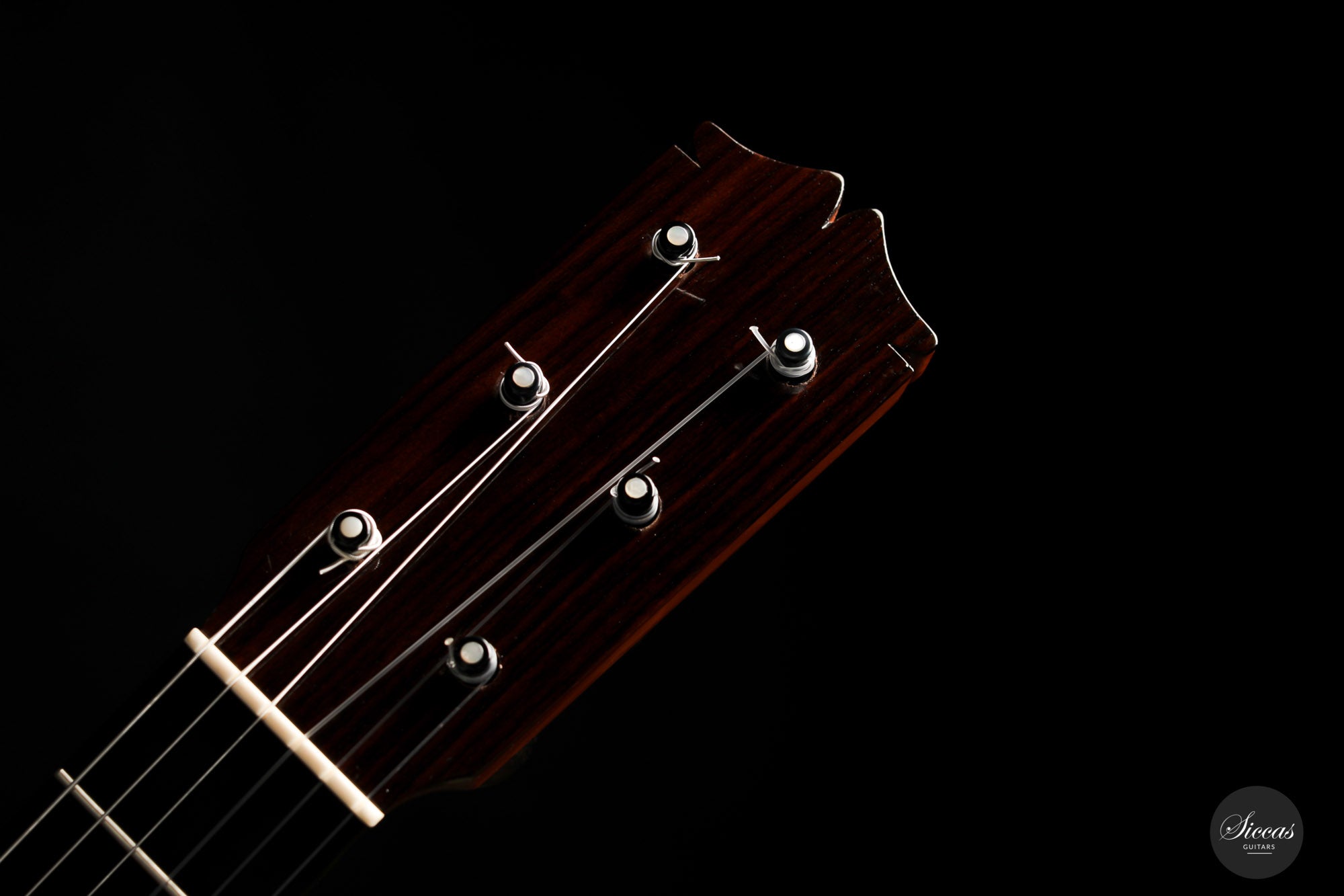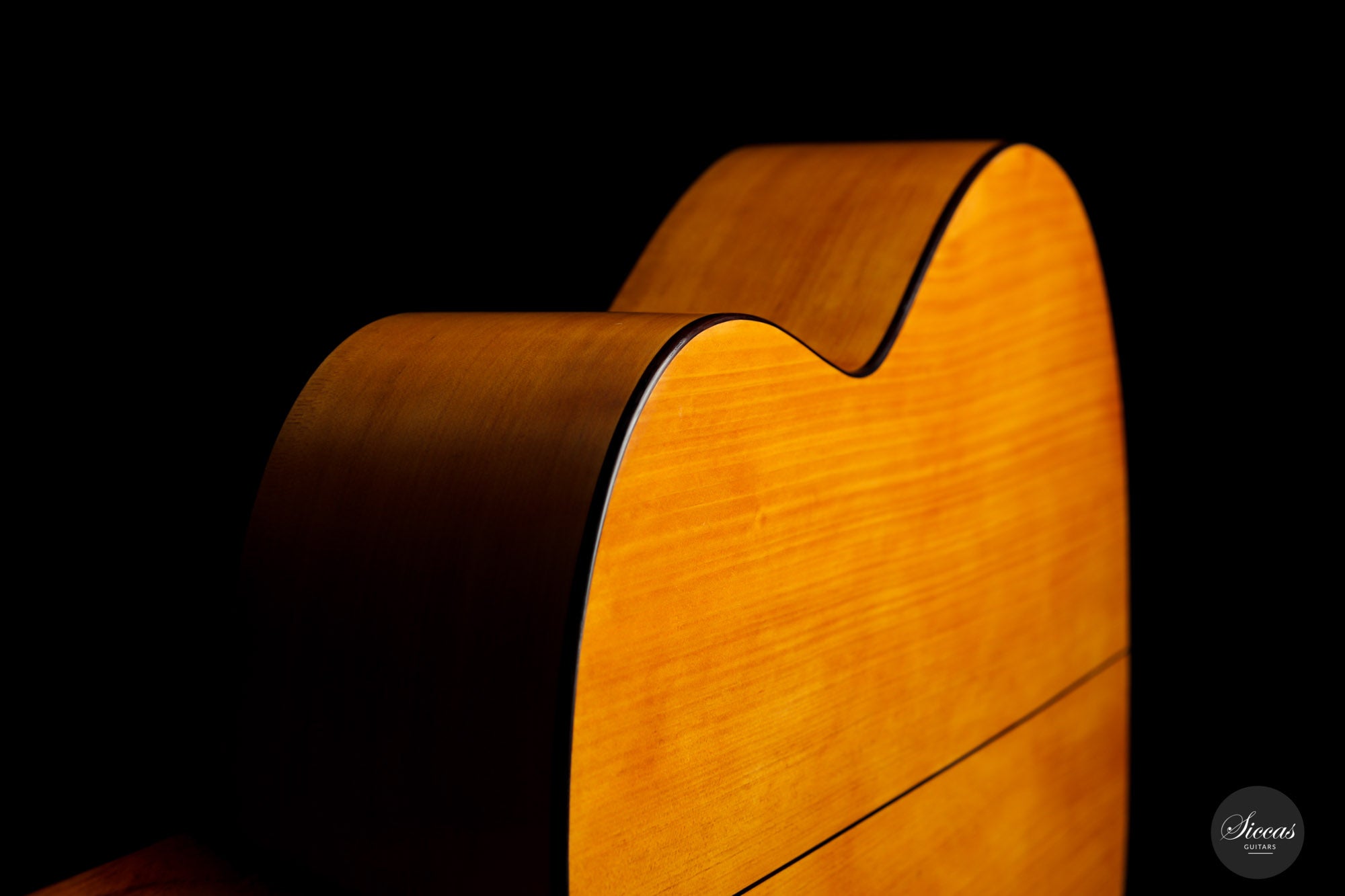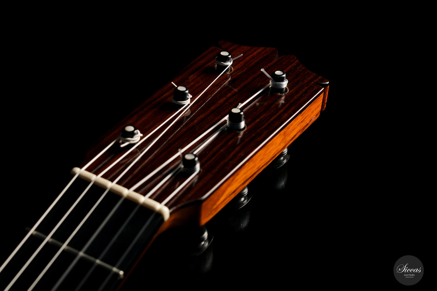 This great copy of a Santos Hernandez guitar from 1925 is in perfect condition and has an attractive vintage look. Equipped with a transparent golpeador, this model has not only a pleasant neck shape but also a fantastic response, making it a very nice, and faithful copy of the guitar made by the grand old master from Madrid. It has a clear sound character with deep, well Spanish basses and an impressive authenticity in its voice. In short, an exceptional copy, truly inspiring and pleasant to play.