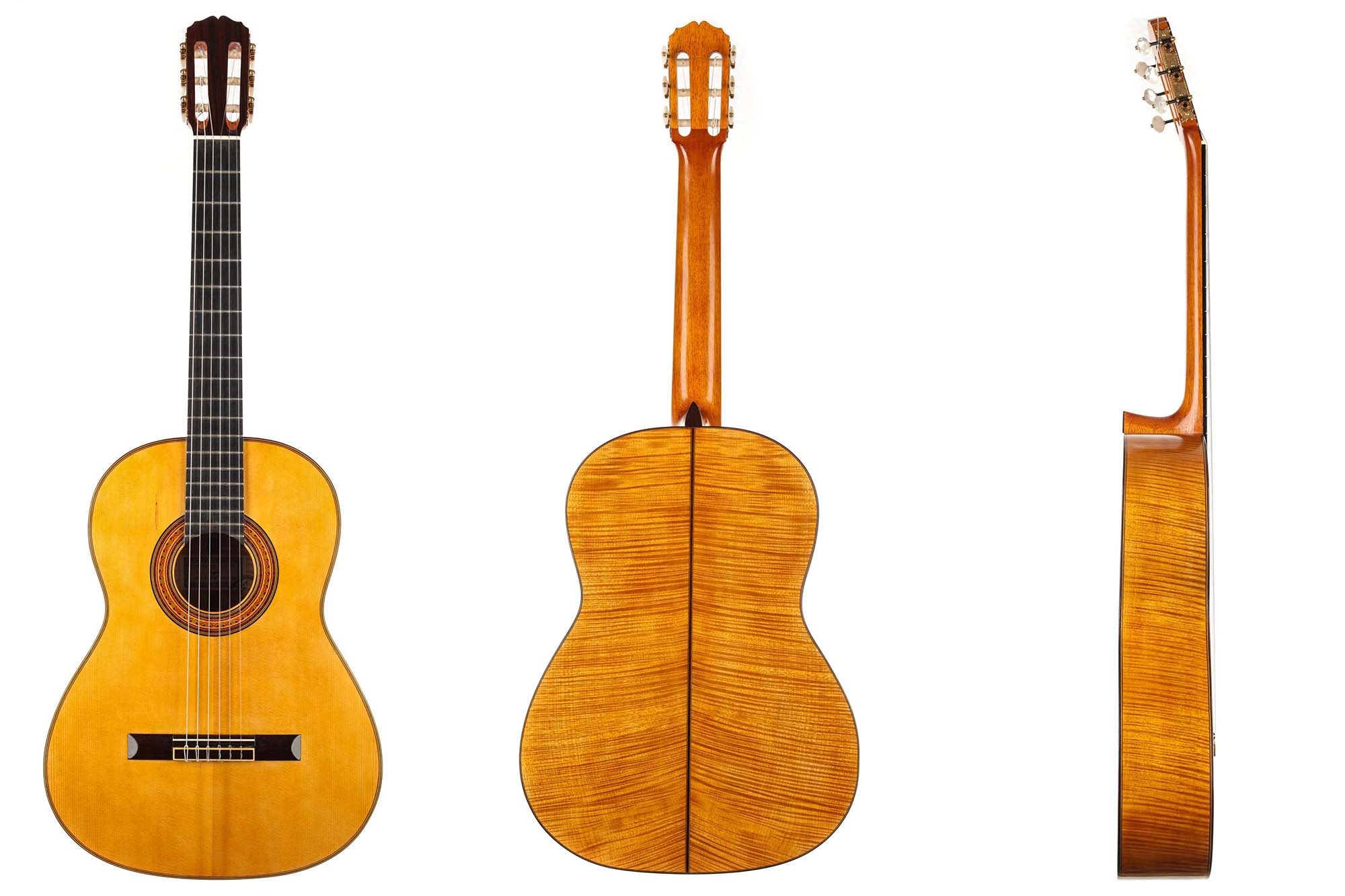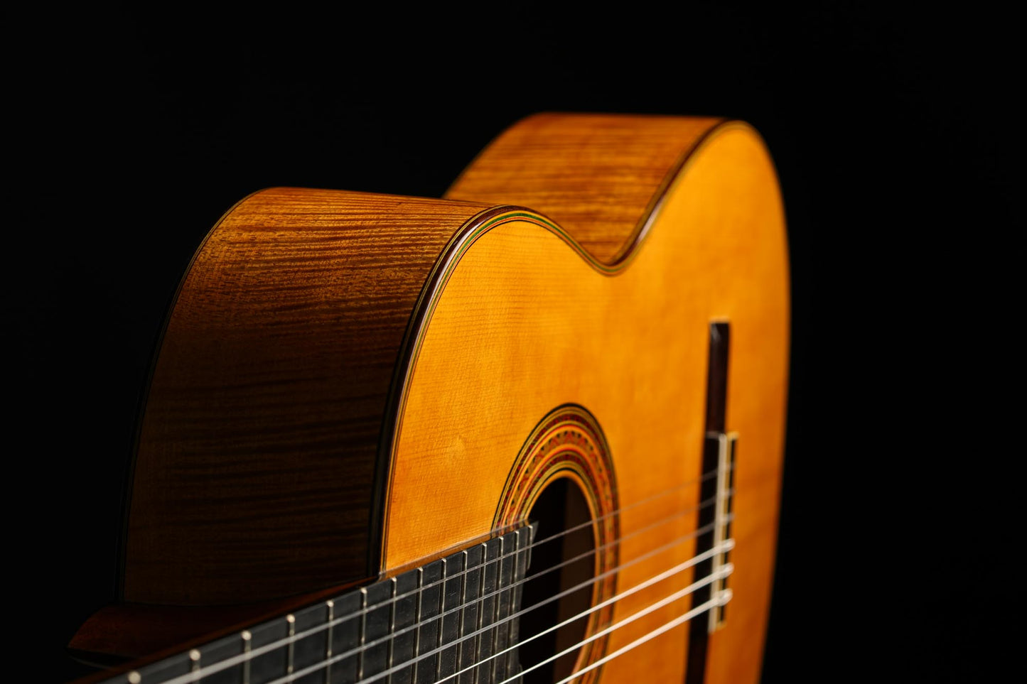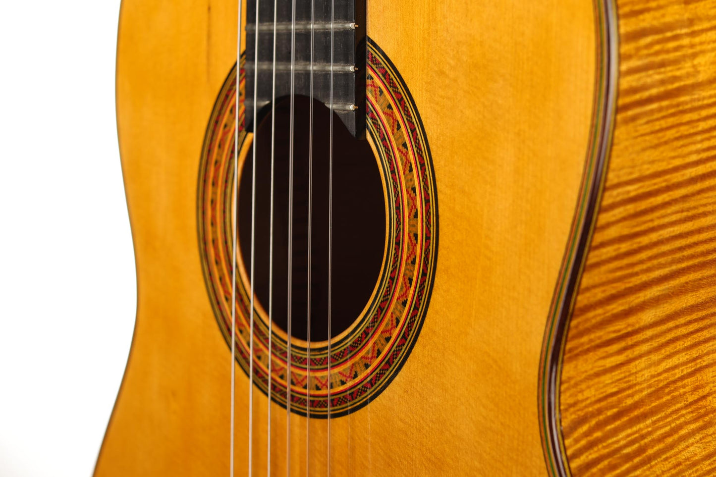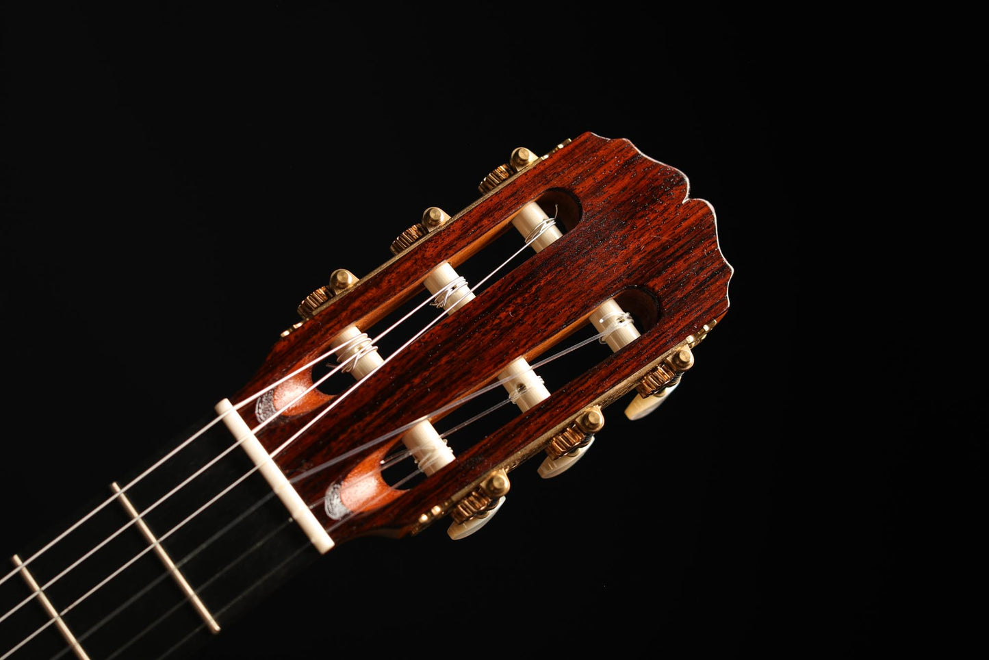 It is simply amazing how much energy and expression emanates from this guitar. One can clearly find the power and spontaneity of the guitars of Santos Hernandez. The basses have an extraordinary charisma and balance, with a full and complex timbre, at the same time classical and very modern. The trebles have a very round and relatively powerful sound, paired with great elegance. The lightness and comfort in the left hand are reminiscent of the playing feel of 19th-century guitars, which makes it an absolutely fascinating guitar that is very difficult to put back into the case once you start playing it.