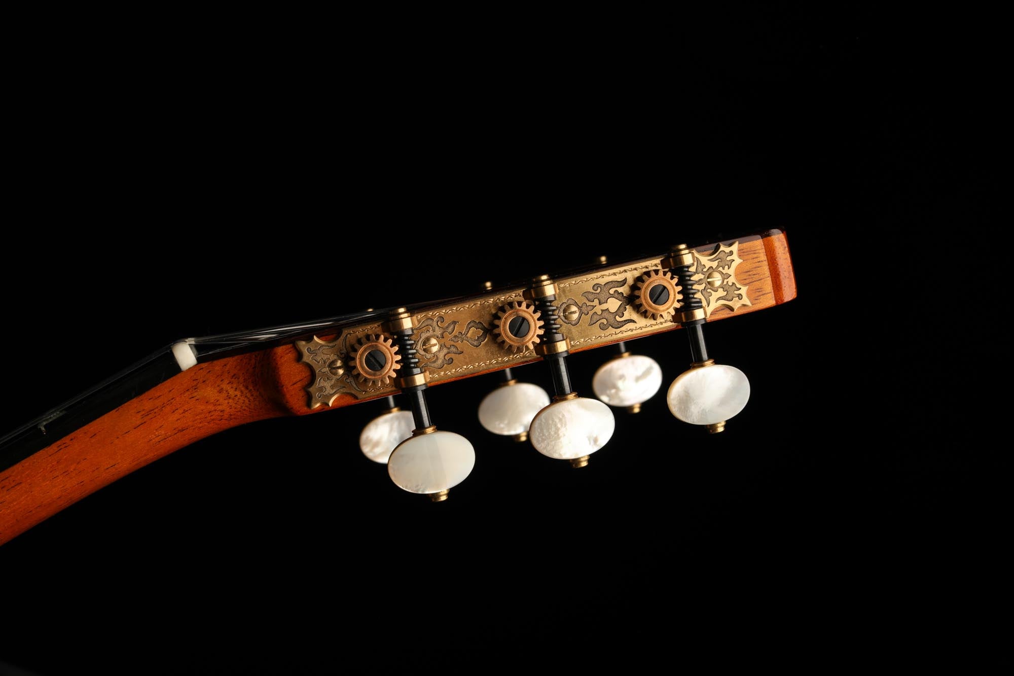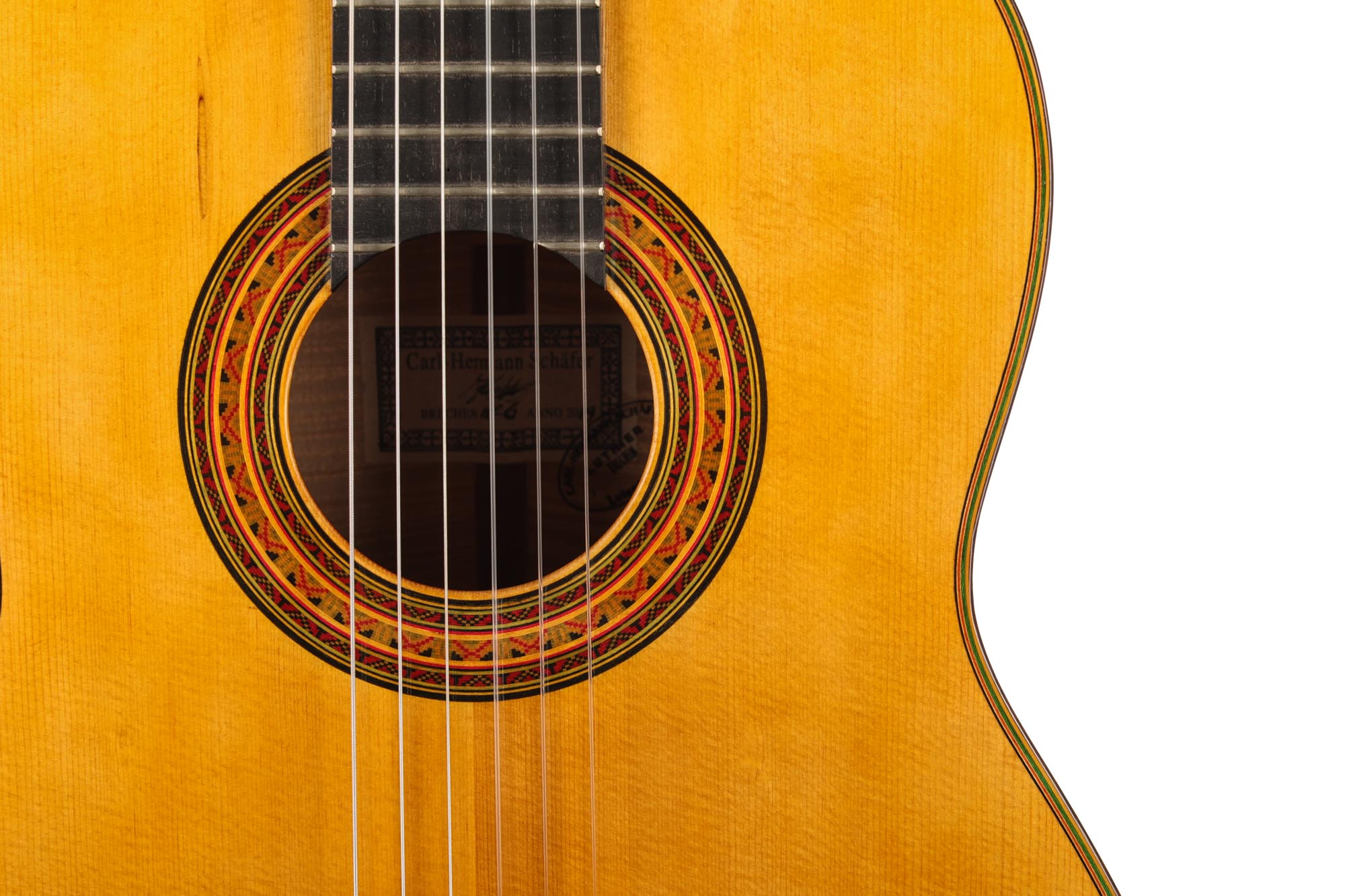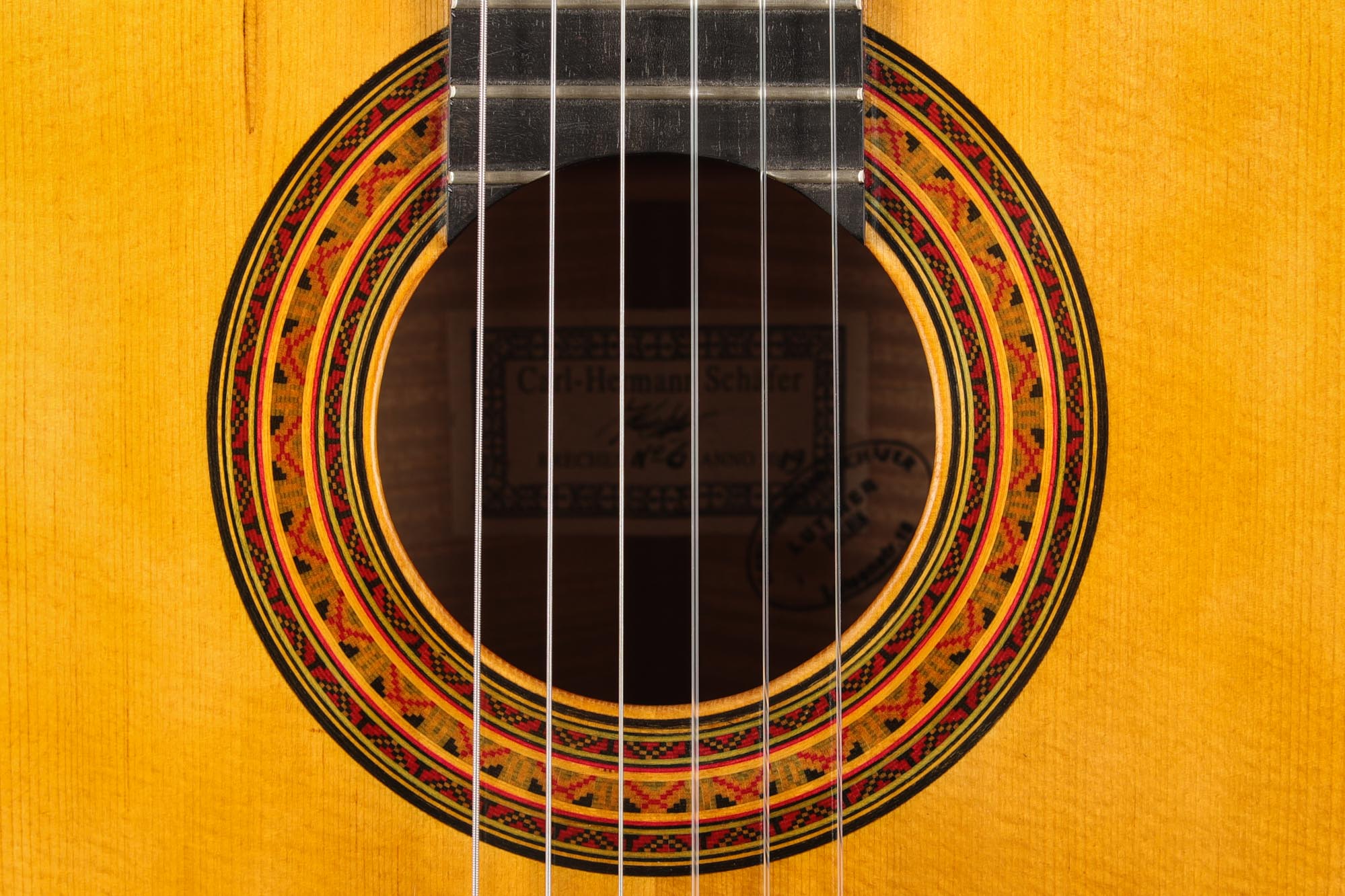 This magnificent copy of a Santos Hernandez guitar is a wonderful homage to the Madrilenian luthier of Andres Segovia, Regino Sainz de la Maza, and many other talented guitarists. Like the Spanish luthiers of the 19th and early 20th century, Carl Hermann Schäfer chose this spruce top mainly because of its excellent sound characteristics and less because of its aesthetic perfection. In fact, the German guitar maker has had this top since his beginnings as a guitar maker several decades ago. Always caught in the dilemma of choosing a top with a knot but with extraordinary sound characteristics, he finally decided to use it for this unique instrument. The magnificent rosette of this replica is also a tribute to the late Santos Hernandez rosettes from the 1930s with their colorful geometric patterns. The high-quality machine heads are handmade by Scheller in Germany and are a premium model in the style of Manuel Ramirez with hand engravings on a brushed metal plate. Furthermore, this guitar is in perfect condition with only very slight playing wear.