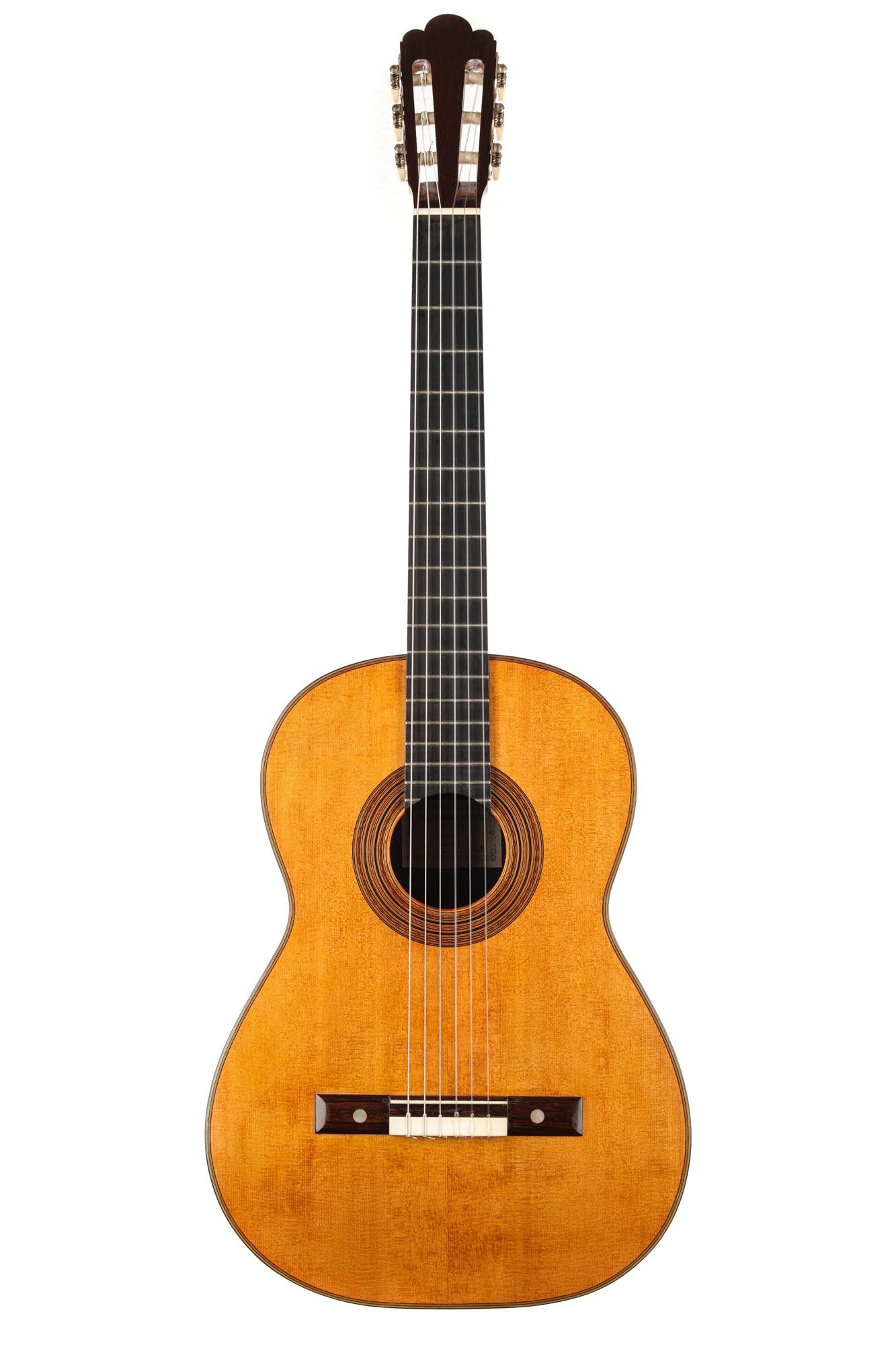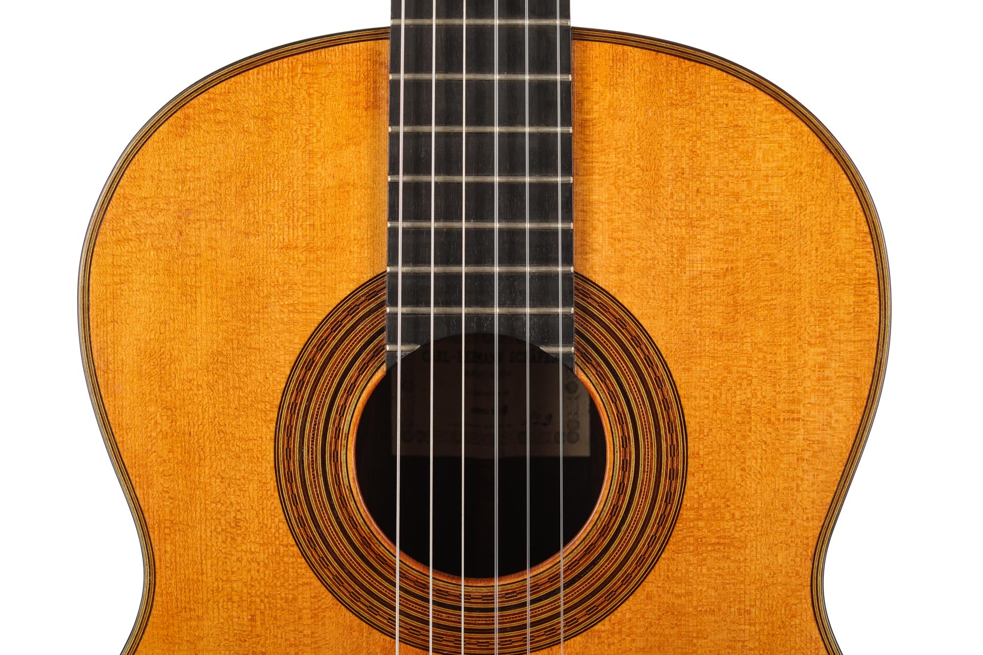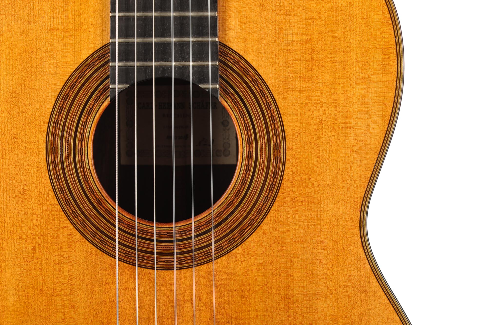 Faithful copies of Antonio de Torres' instruments are rare and extremely demanding for guitar builders. This guitar built by Carl-Hermann Schäfer is a true gem of lutherie and a splendid facsimile of the SE 113 guitar built by Antonio de Torres in 1888. The degree of refinement of this guitar is astonishing. Especially the inlays of the rosette are of impressive precision and delicacy, and the top is an excellent piece of spruce with an antique vintage look. The label is a fine interpretation of the original and a beautiful homage to the work of the "father of the modern classical guitar". The Reischl machine heads are also a perfect match for the overall look of this Carl Hermann Schäfer guitar.