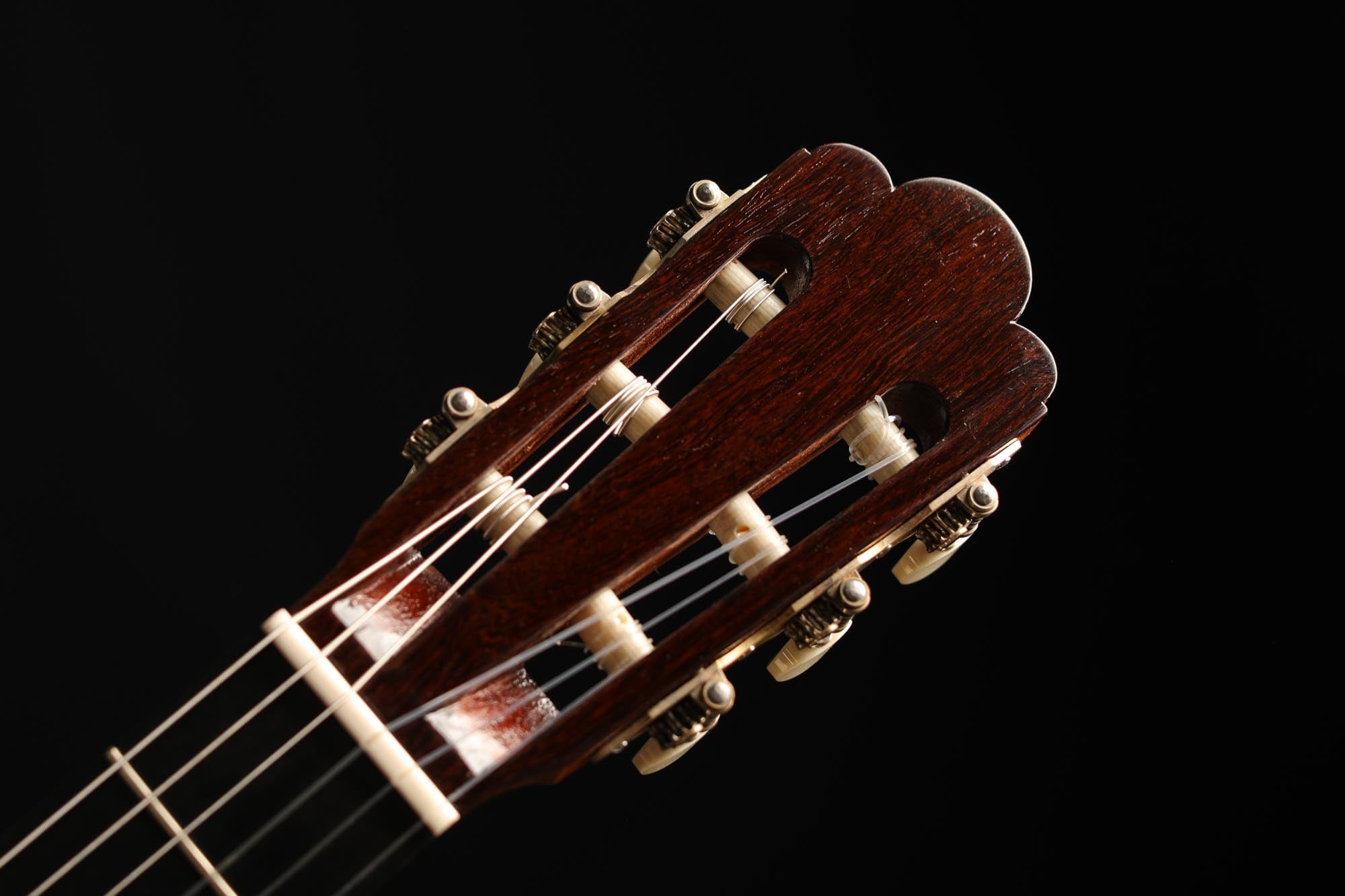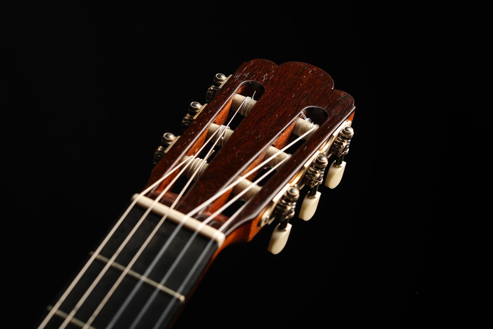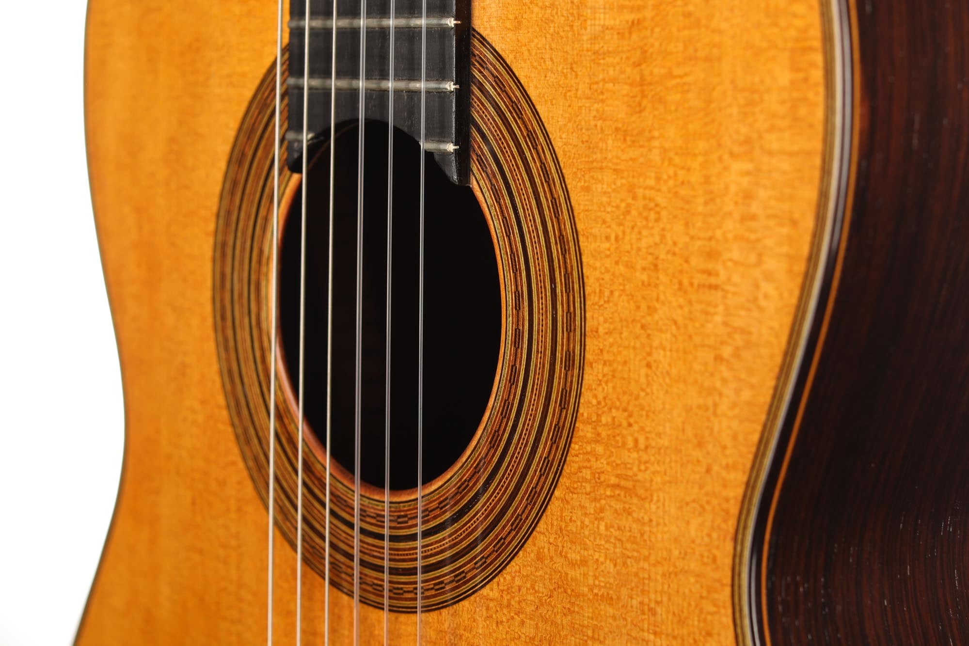 Faithful copies of Antonio de Torres' instruments are rare and extremely demanding for guitar builders. This guitar built by Carl-Hermann Schäfer is a true gem of lutherie and a splendid facsimile of the SE 113 guitar built by Antonio de Torres in 1888. The degree of refinement of this guitar is astonishing. Especially the inlays of the rosette are of impressive precision and delicacy, and the top is an excellent piece of spruce with an antique vintage look. The label is a fine interpretation of the original and a beautiful homage to the work of the "father of the modern classical guitar". The Reischl machine heads are also a perfect match for the overall look of this Carl Hermann Schäfer guitar.