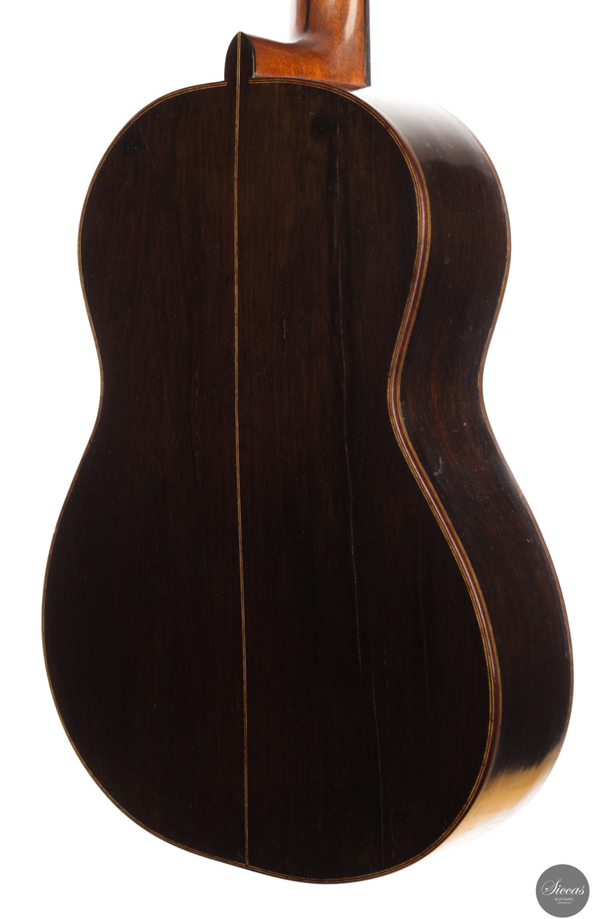 A 1952 guitar by Carlos Perez de Nanclares with a spruce top and Brazilian rosewood body, built during his Paris period and signed beneath the soundboard. It offers refined Madrid school craftsmanship, and a poetic, well separated voice with quick response and wide dynamic range. The original tuners remain in very good condition, and the instrument has been professionally and securely restored.