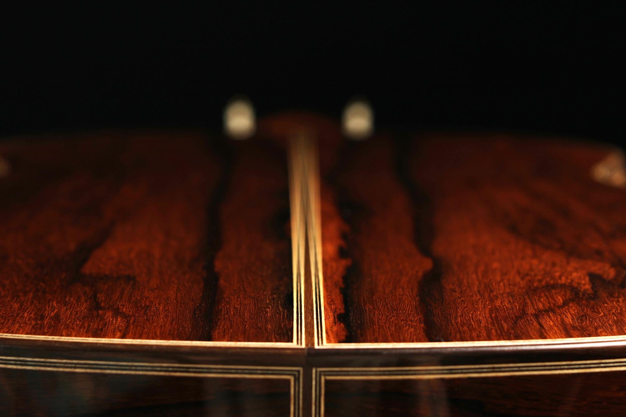 This anniversary model is a stunning example of Lozano's craftmanship. The best possible woods were chosen for these models, and the grain and coloration of this instrument is very striking. The condition is just splendid and one can hardly see that the guitar has been played. Clear, big trebles with great projection, accompanied by almost cello-like basses, result in an inspiring guitar to perform on. With its double side construction, the guitar is very responsive and has a beautiful, almost percussive timbre. The sustain is long and appealing with an elegant overtone array. Also, the playability is excellent due to the perfect setup.