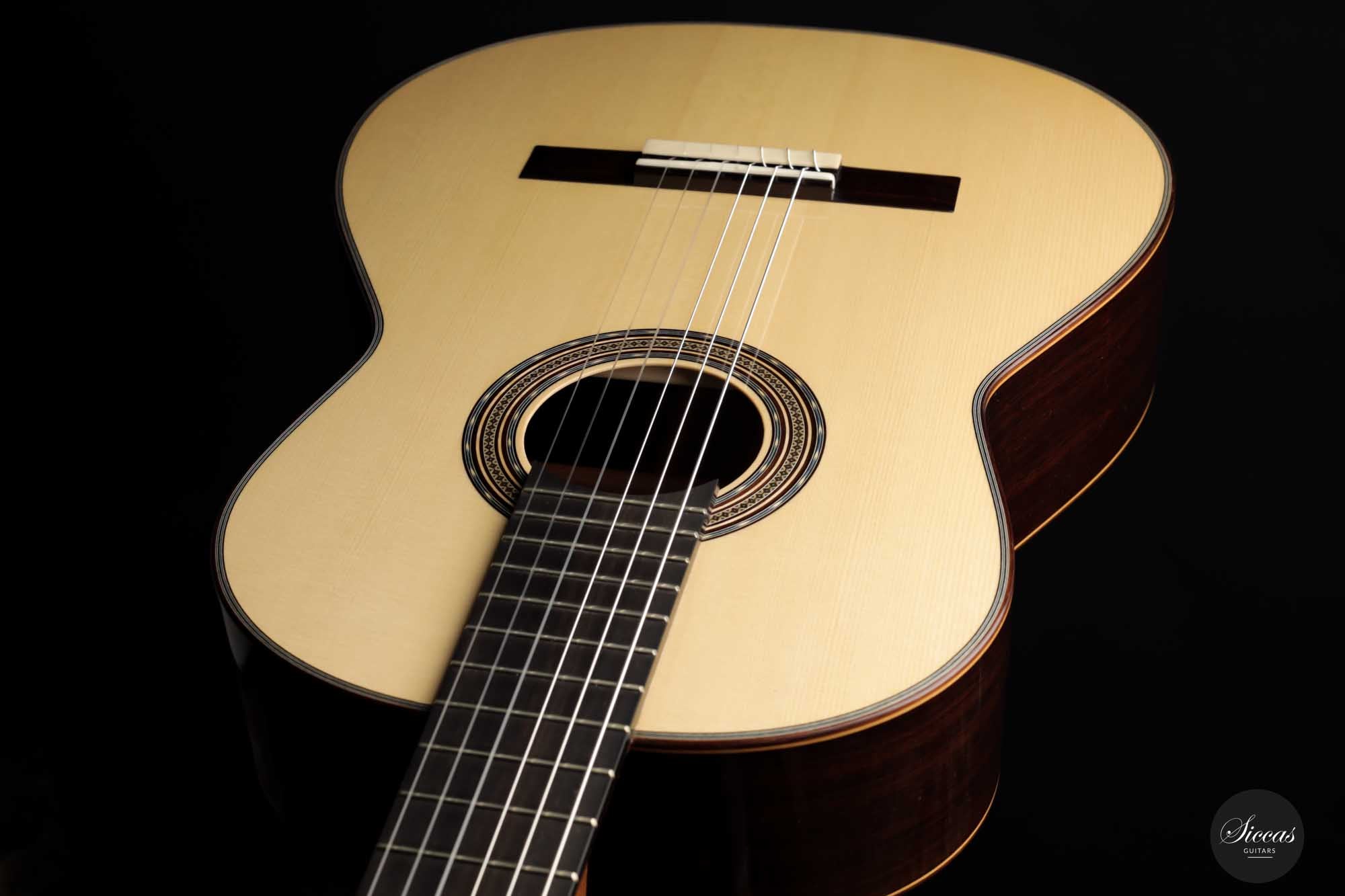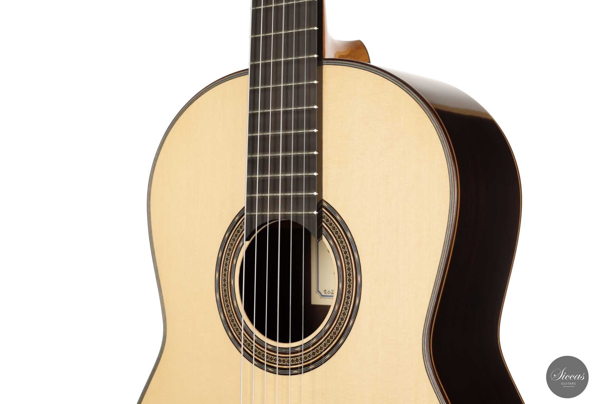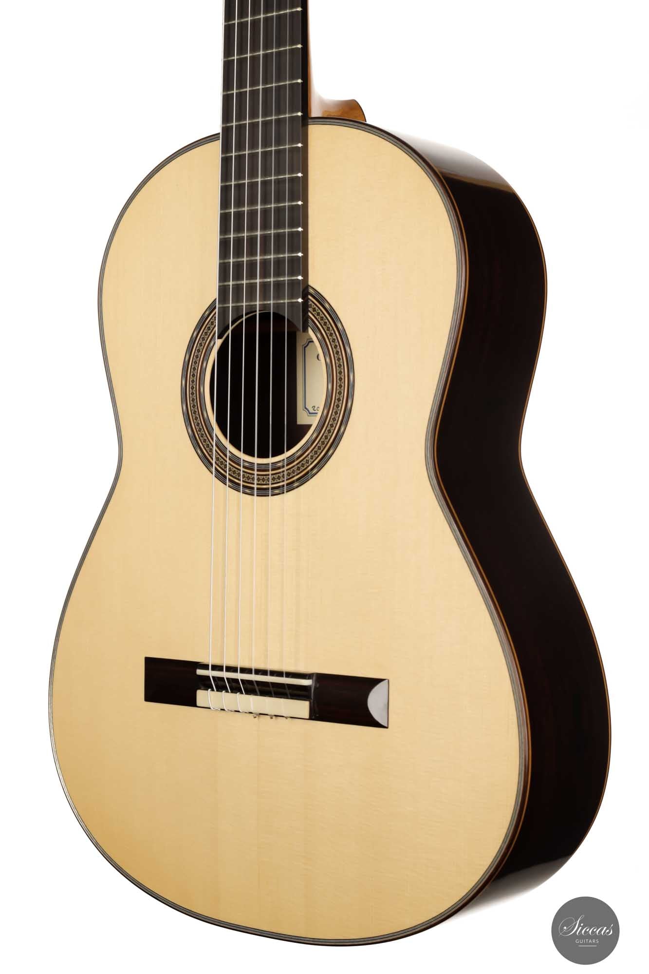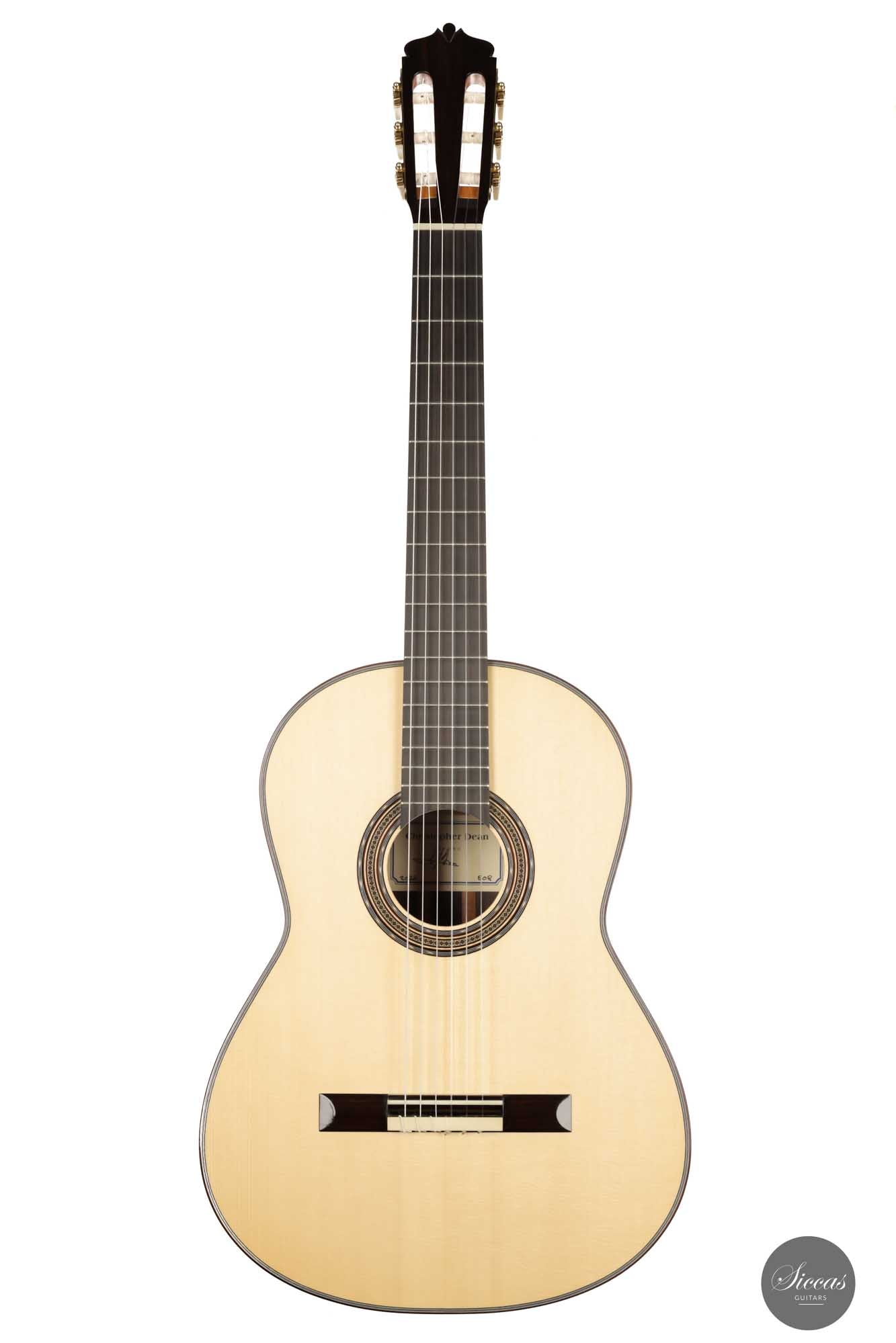 This brand-new instrument, numbered 508, is a delightful guitar in all regards. Its versatile character offers endless possibilities to the guitarist for any musical style. As a result of Christopher's incredible attention to detail, every element of this guitar has been executed to perfection. On top of this, the spruce soundboard and Indian rosewood back and sides are of first quality, and the French polish is perfect. Due to its rich tonal characteristics, this fine guitar allows the players to explore infinite tonal expressions with full support from the instrument. Christopher clearly understands how to build a guitar with excellent playability, from the comfortable neck shape to this guitar's great overall "feel" achieved by an ideal level of tension in the guitar. A sweet-sounding instrument with a huge volume that will serve any playing situation.