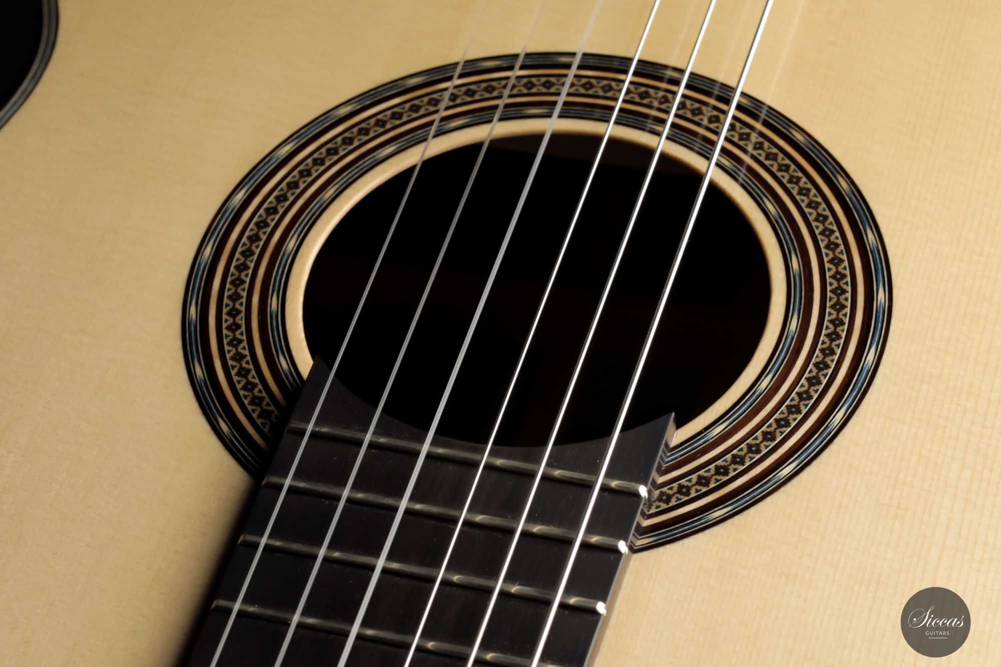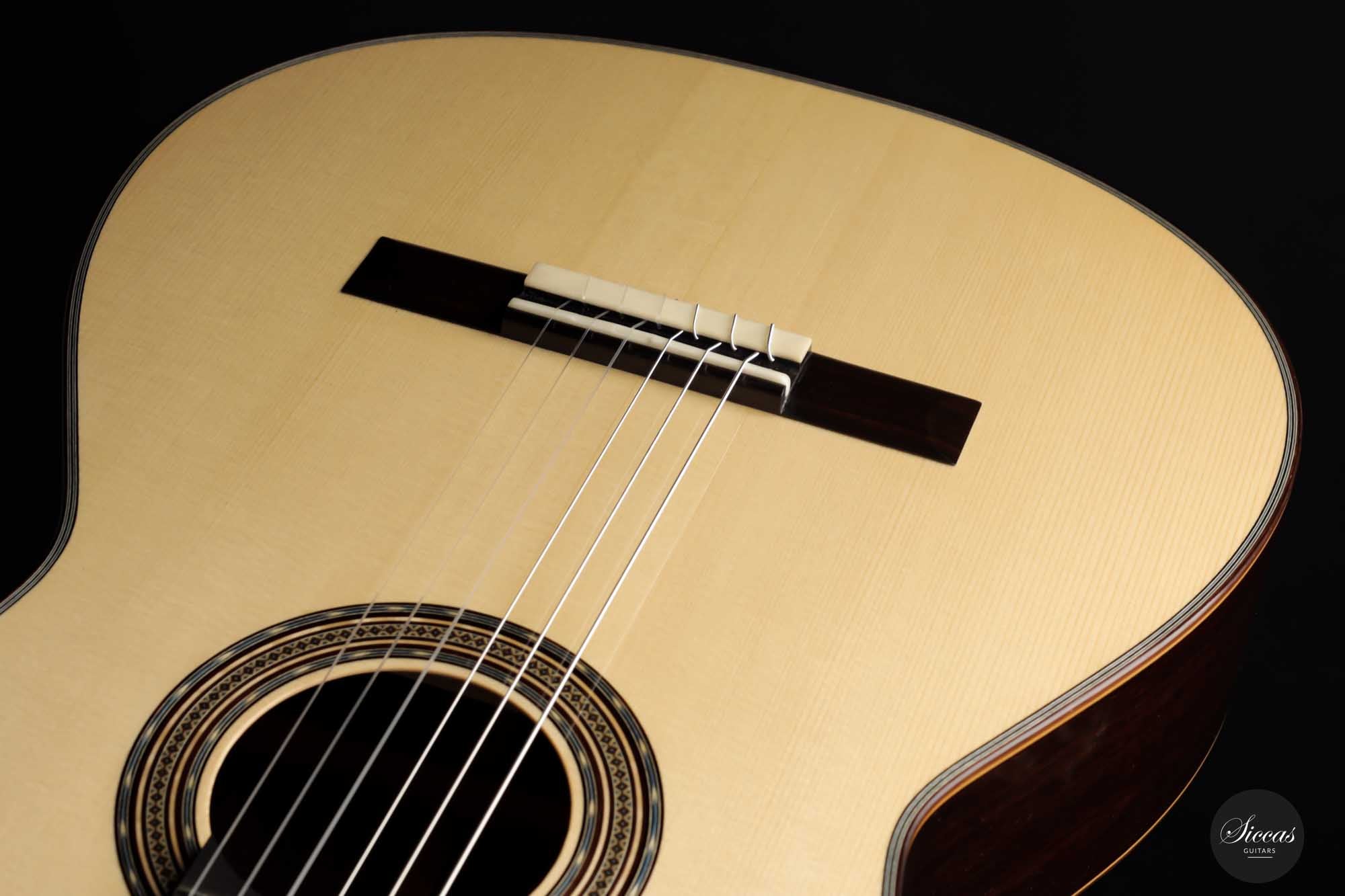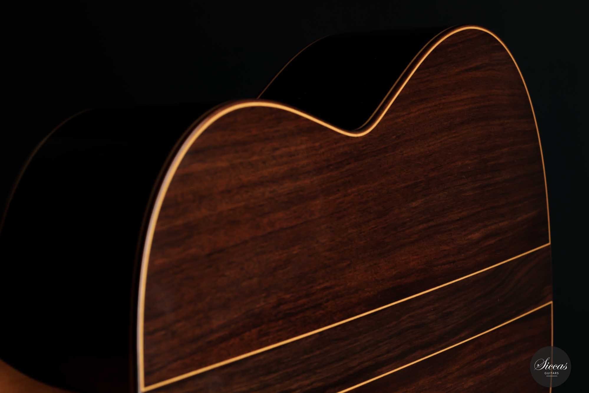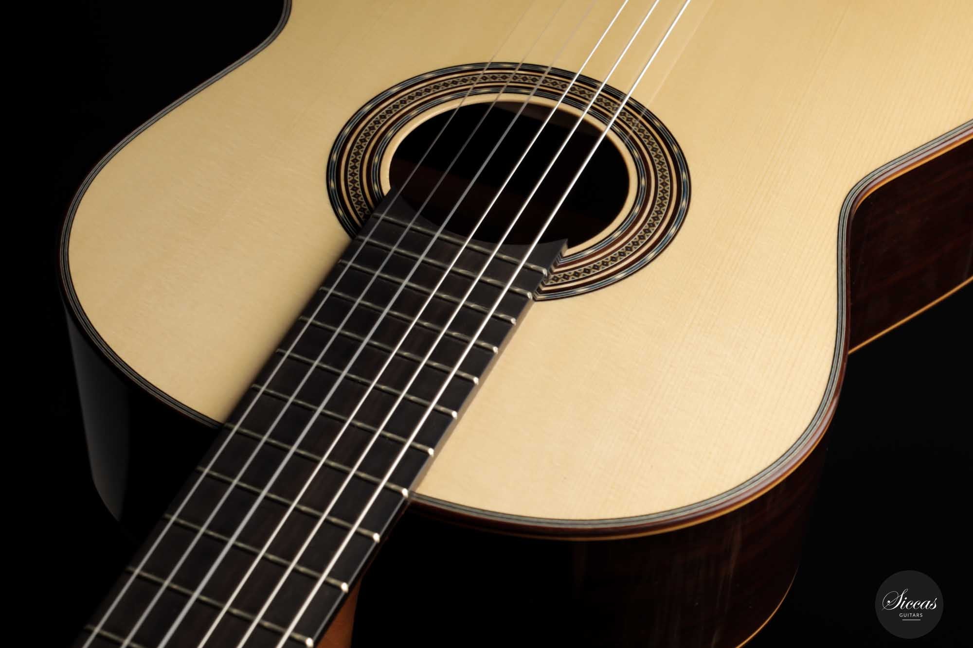 This brand-new instrument, numbered 508, is a delightful guitar in all regards. Its versatile character offers endless possibilities to the guitarist for any musical style. As a result of Christopher's incredible attention to detail, every element of this guitar has been executed to perfection. On top of this, the spruce soundboard and Indian rosewood back and sides are of first quality, and the French polish is perfect. Due to its rich tonal characteristics, this fine guitar allows the players to explore infinite tonal expressions with full support from the instrument. Christopher clearly understands how to build a guitar with excellent playability, from the comfortable neck shape to this guitar's great overall "feel" achieved by an ideal level of tension in the guitar. A sweet-sounding instrument with a huge volume that will serve any playing situation.