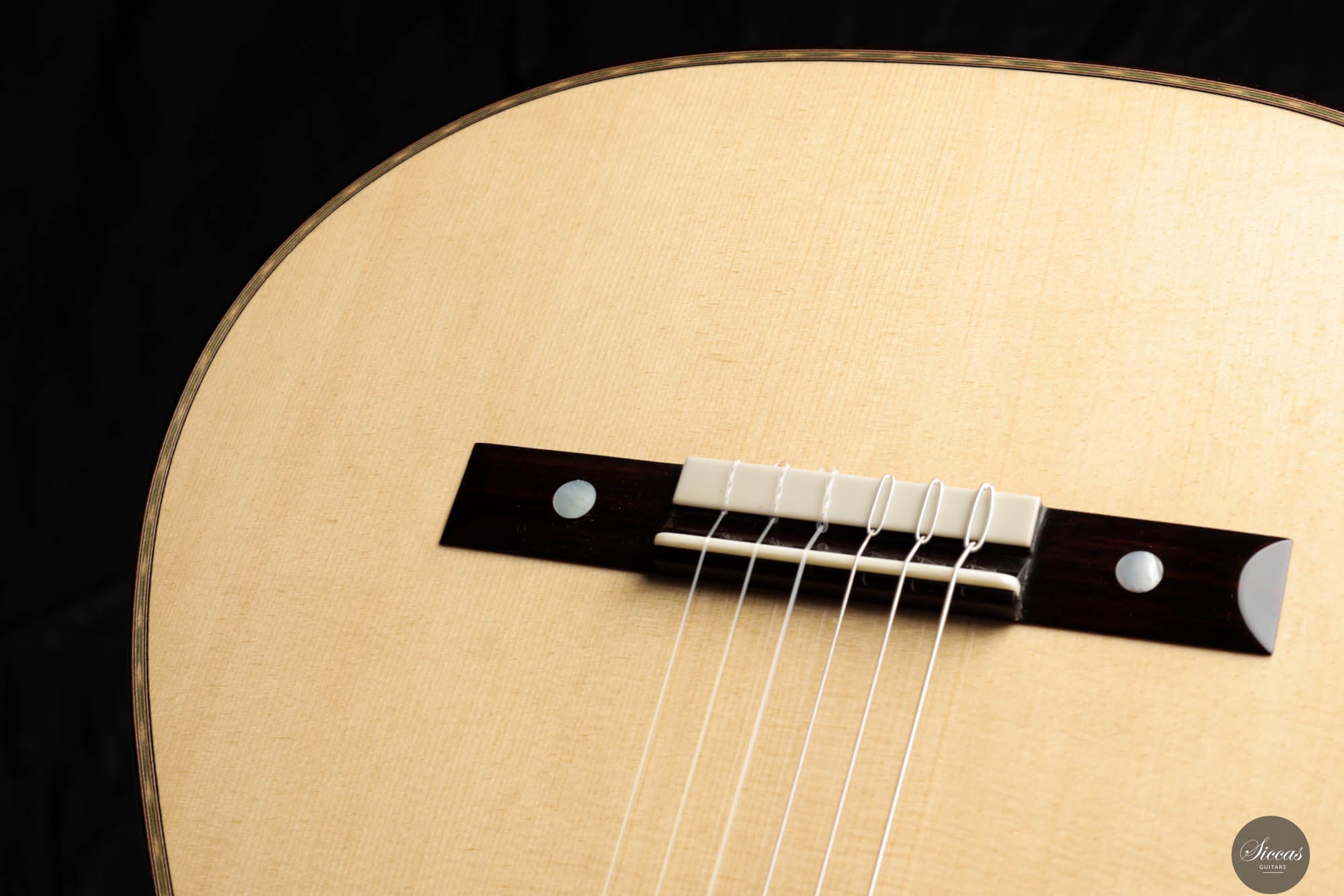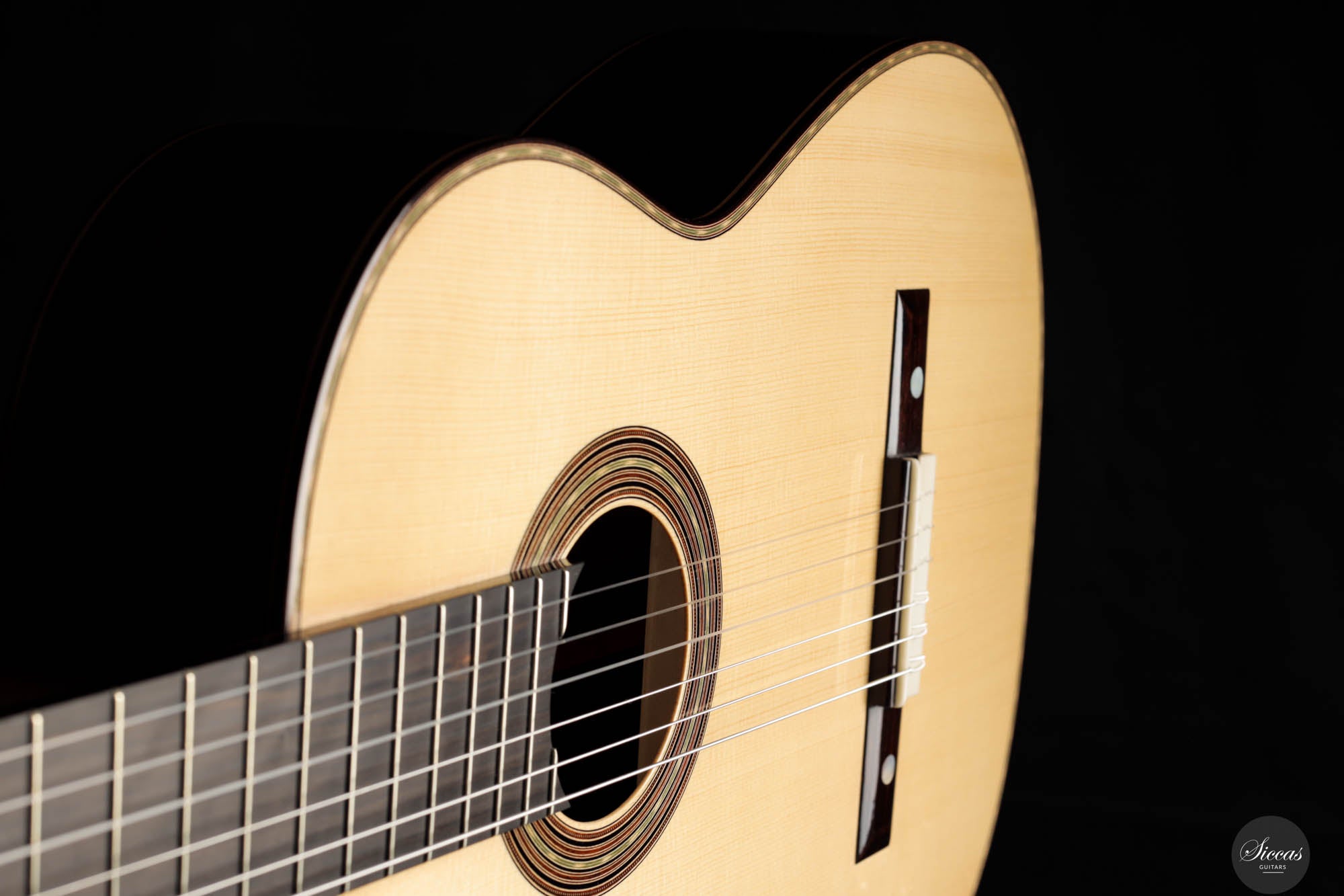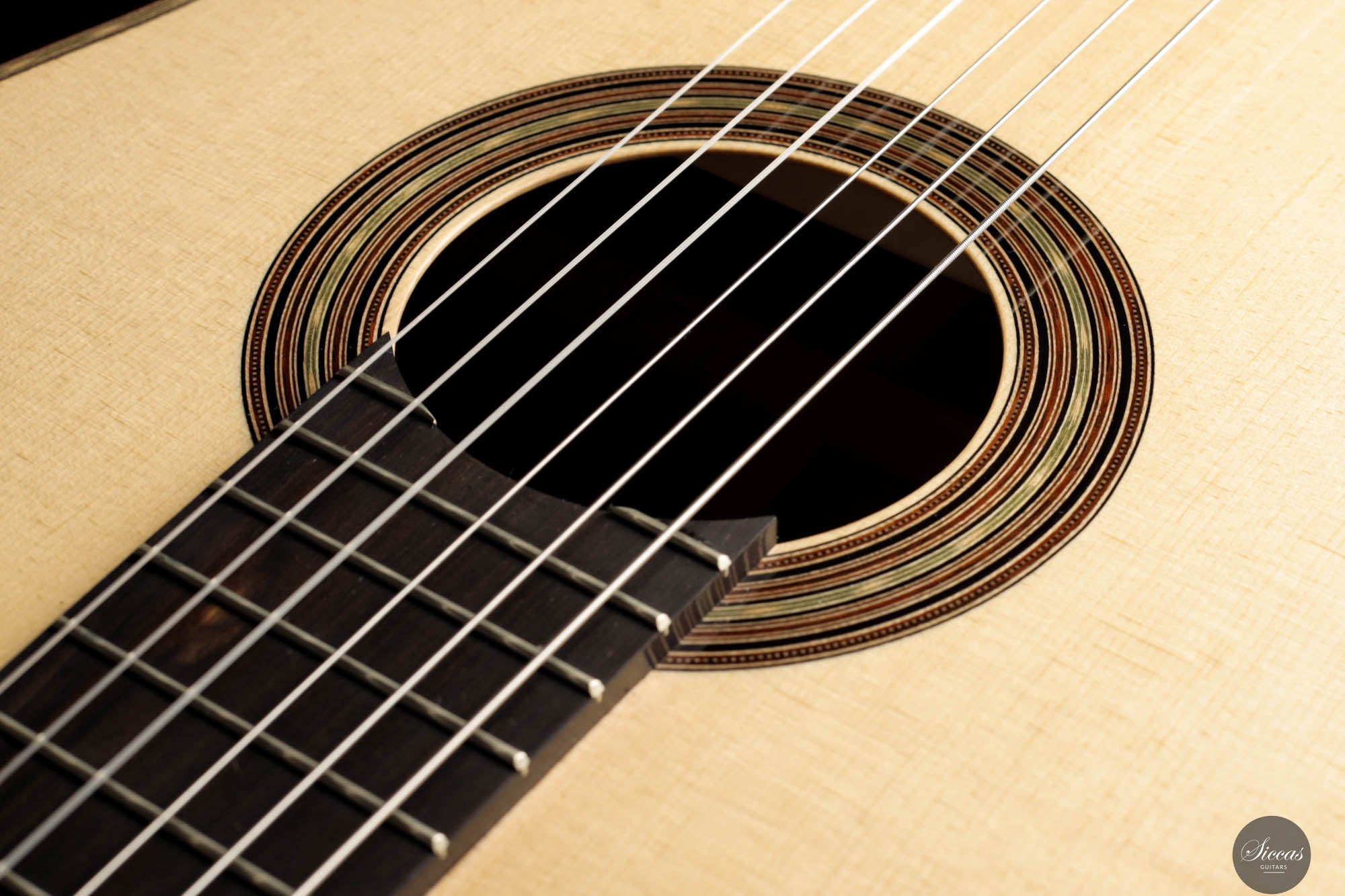 This Torres model guitar, crafted by Christopher, embodies a perfect homage to the legendary guitar-making style of Torres, renowned for shaping the history of classical guitars. The instrument captivates with its low air resonance of D#, which imparts a deep, haunting quality to the basses, creating a sound rich in depth and emotion. Christopher has masterfully balanced this with lively and brilliant trebles, achieving a harmonious contrast that brings each note to life. The guitar features a beautiful spruce soundboard, a material known for its bright and clear tonal quality. Complementing this are the classic Indian rosewood back and sides, with a unique addition of Mexican Royal Ebony for the middle part of the back, adding both a visual and acoustic distinctiveness to the guitar. This blend of woods not only enhances the guitar's sound but also pays tribute to the rich traditional elements found in early 20th-century masterpieces.
