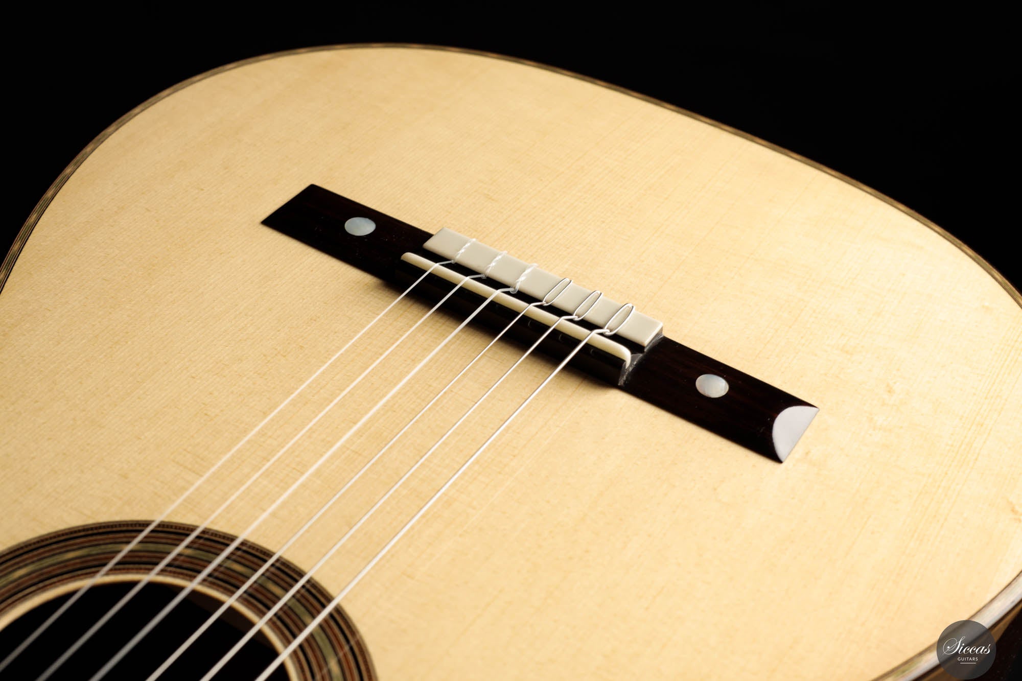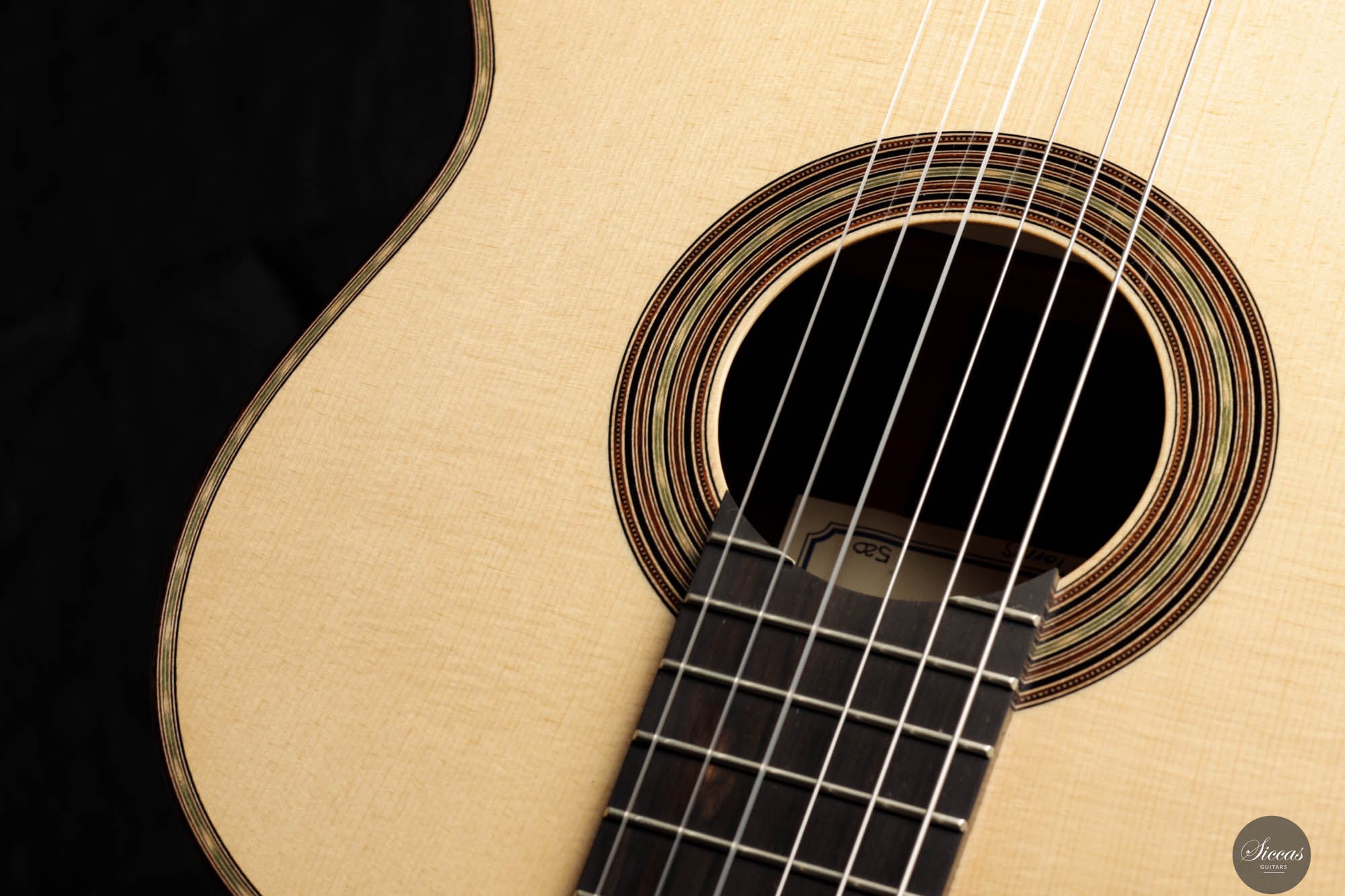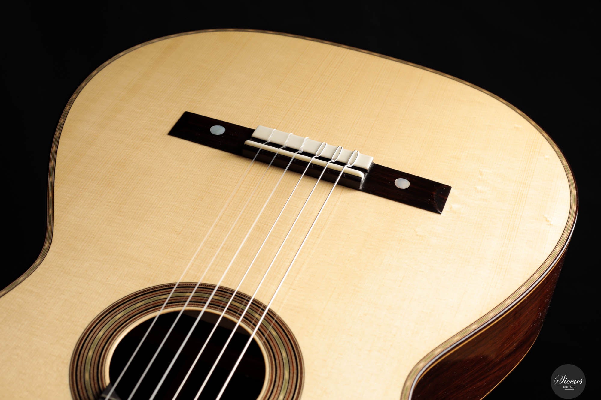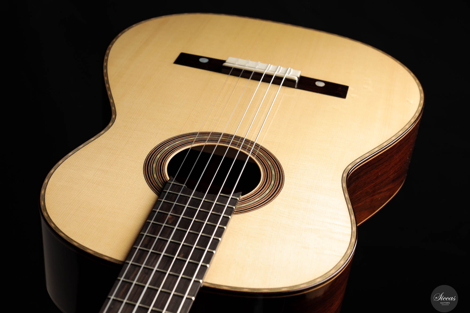 This Torres model guitar, crafted by Christopher, embodies a perfect homage to the legendary guitar-making style of Torres, renowned for shaping the history of classical guitars. The instrument captivates with its low air resonance of D#, which imparts a deep, haunting quality to the basses, creating a sound rich in depth and emotion. Christopher has masterfully balanced this with lively and brilliant trebles, achieving a harmonious contrast that brings each note to life. The guitar features a beautiful spruce soundboard, a material known for its bright and clear tonal quality. Complementing this are the classic Indian rosewood back and sides, with a unique addition of Mexican Royal Ebony for the middle part of the back, adding both a visual and acoustic distinctiveness to the guitar. This blend of woods not only enhances the guitar's sound but also pays tribute to the rich traditional elements found in early 20th-century masterpieces.