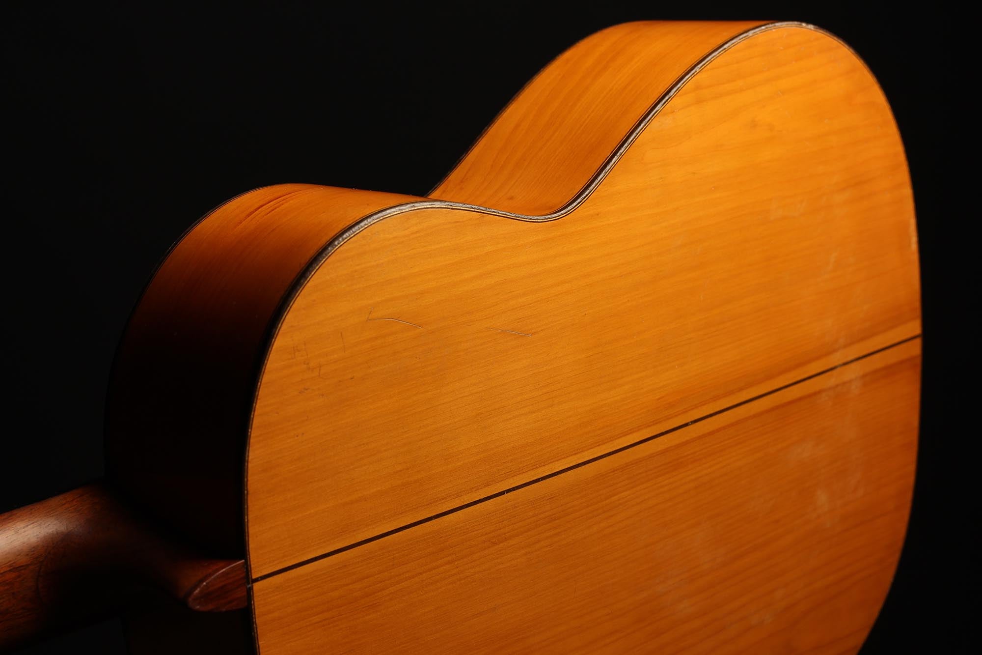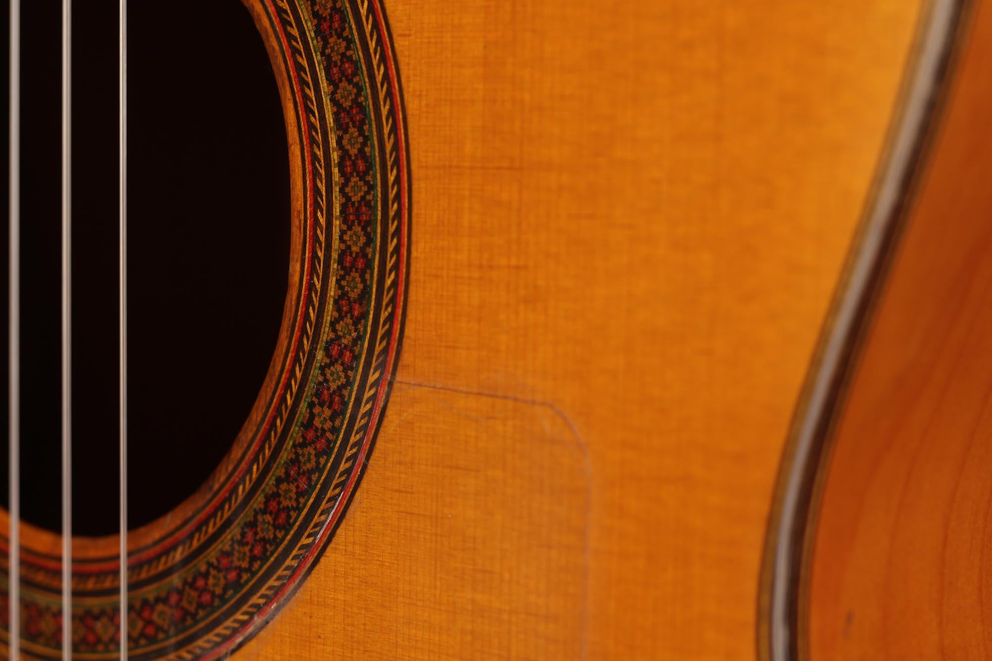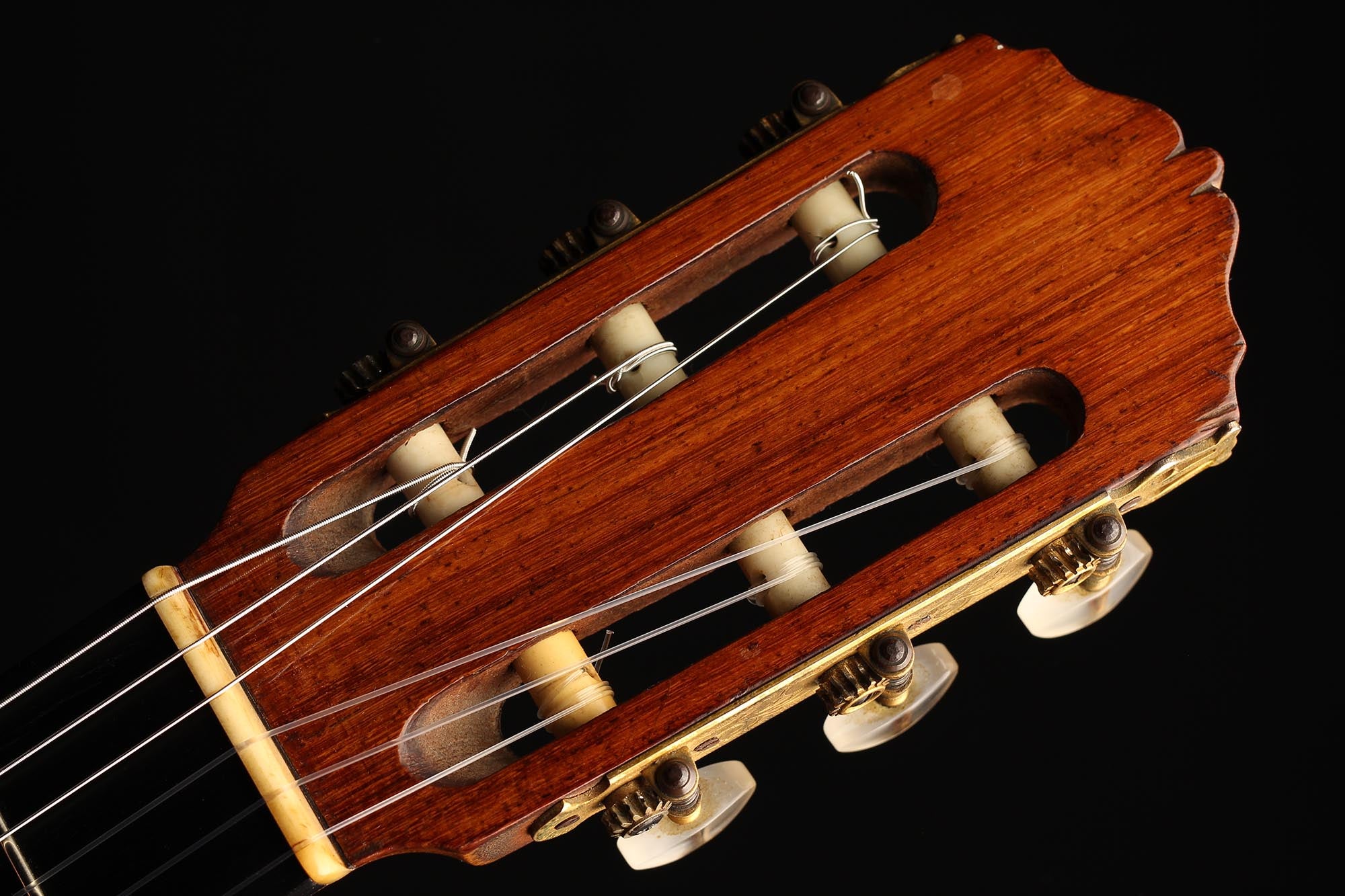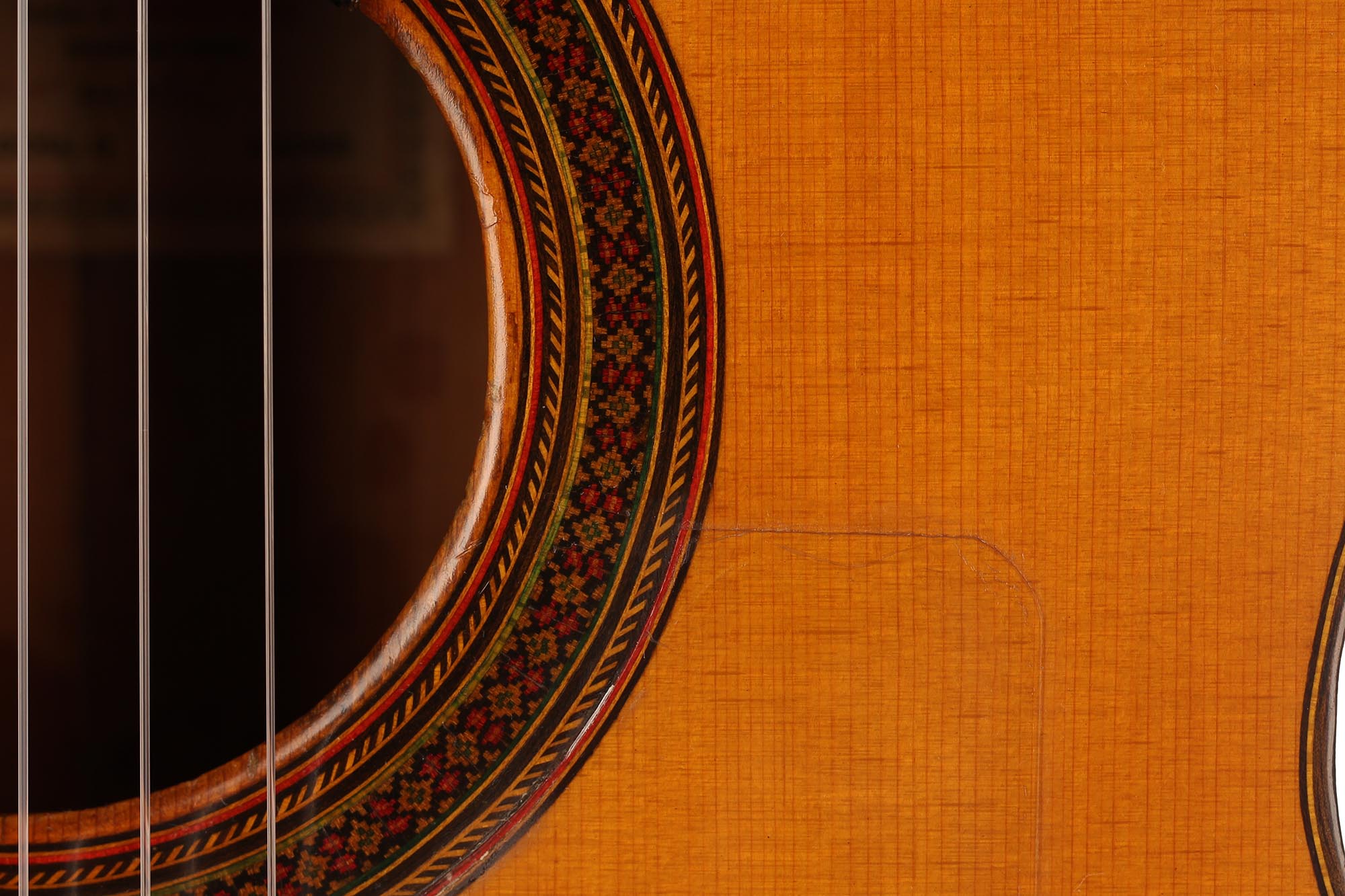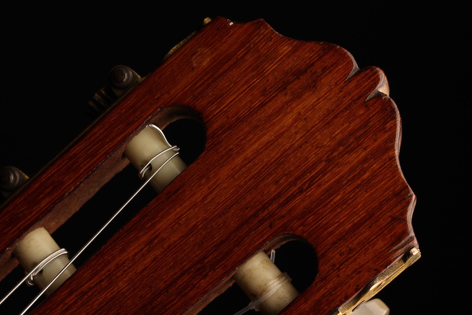 This 1961 guitar is very interesting. It has a Domingo Esteso-style head, very typical of the legendary luthiers from Madrid such as Manuel Ramirez and Santos Hernandez. This beautiful guitar has an extraordinary charisma. Three repaired cracks are visible on the soundboard: one at the central joint and one on each side of the ebony fingerboard. A small reinforcement bar has been added inside at the fan bracing at the central joint. Three small repaired cracks are also visible on the back. This guitar is in perfect playing condition and wears the original engraved Fustero tuners.