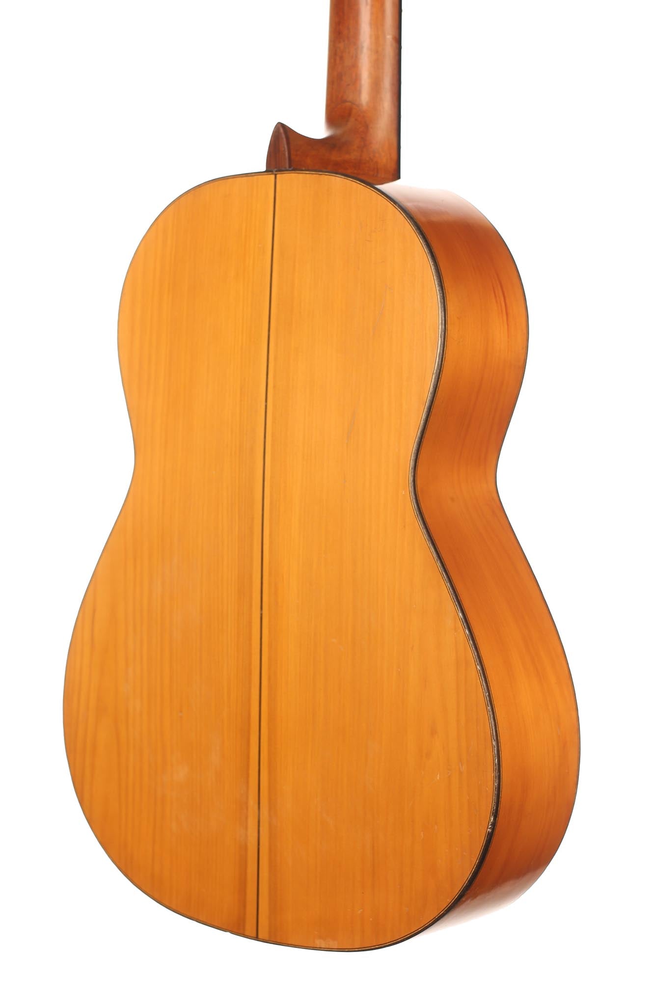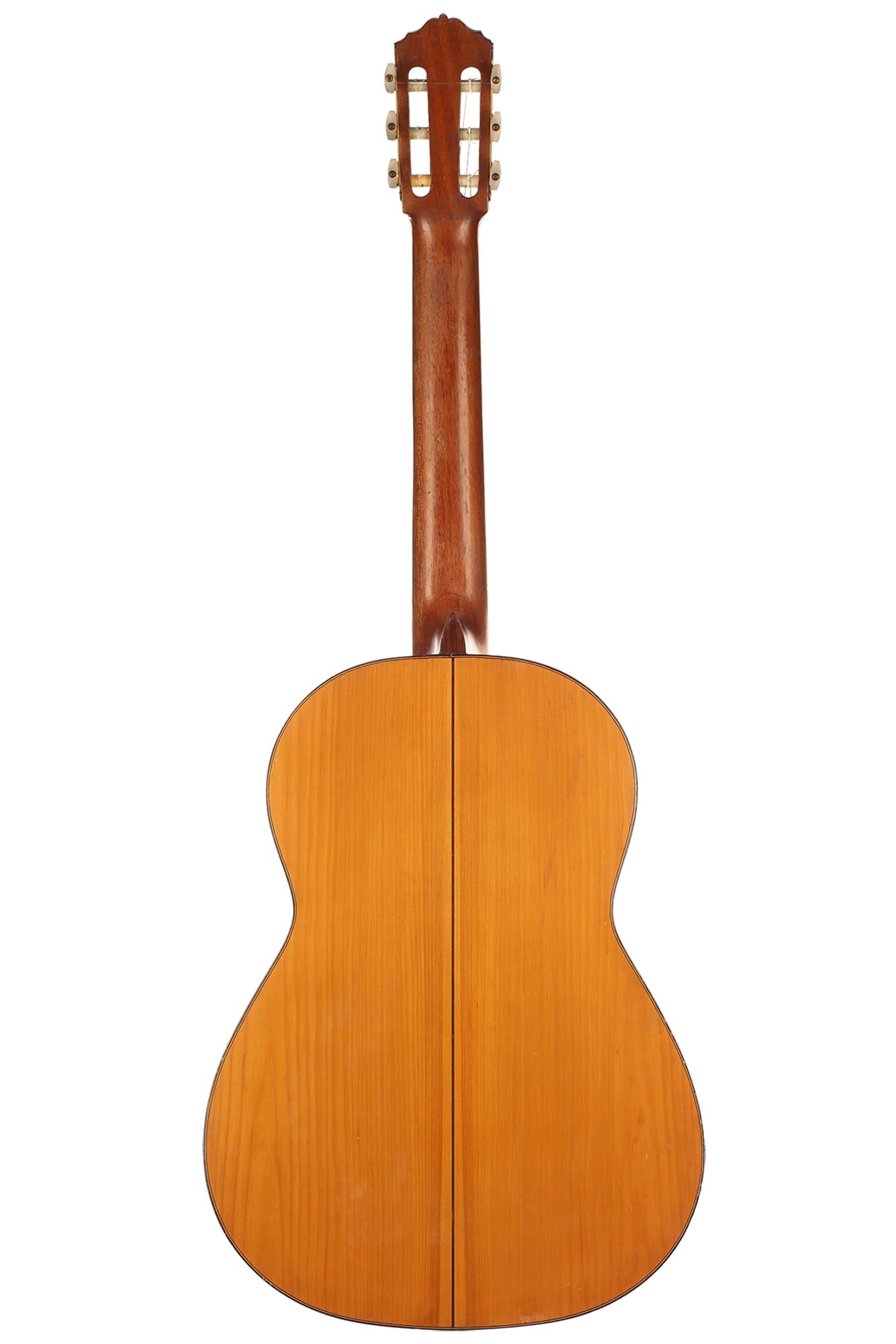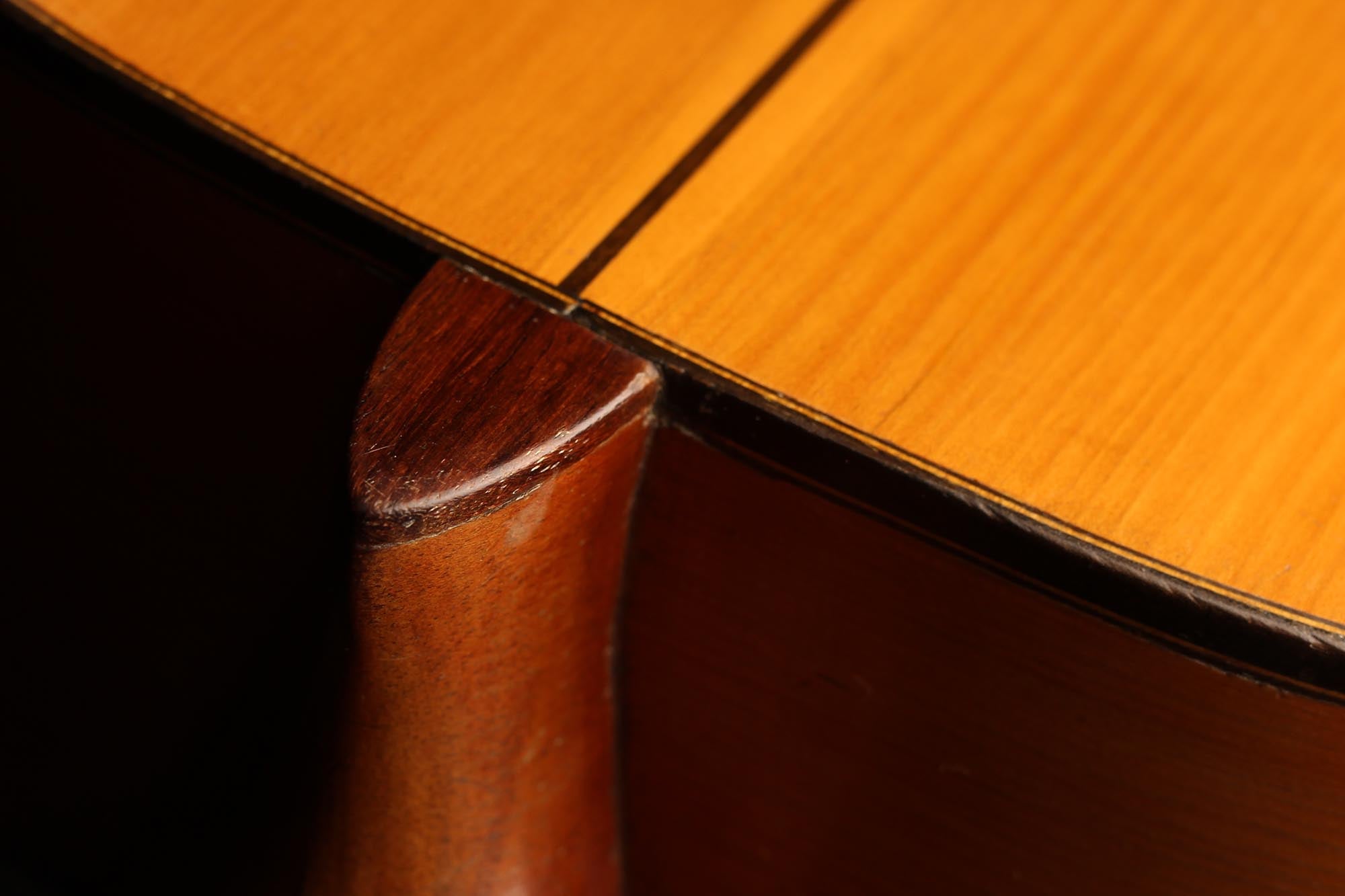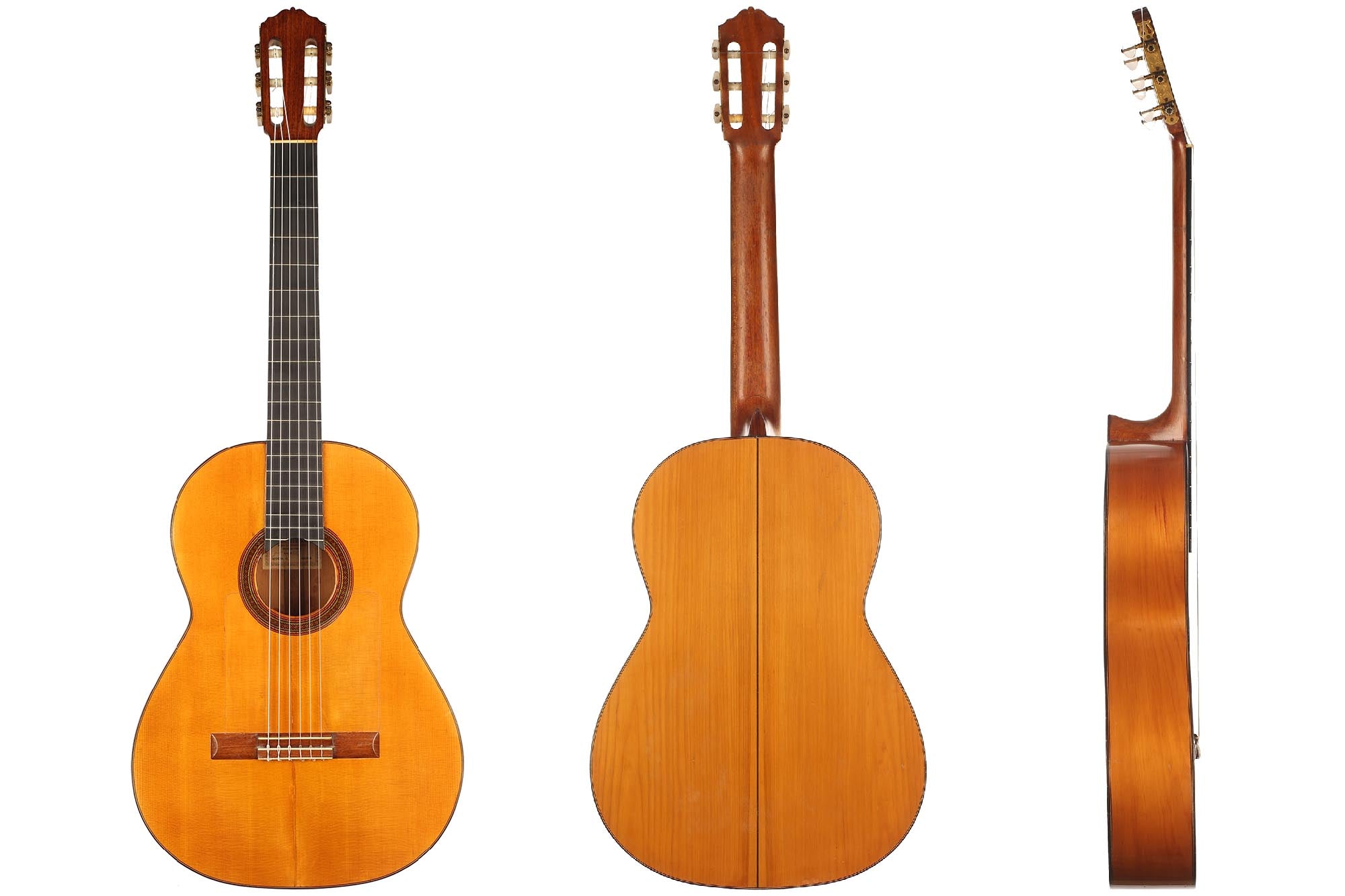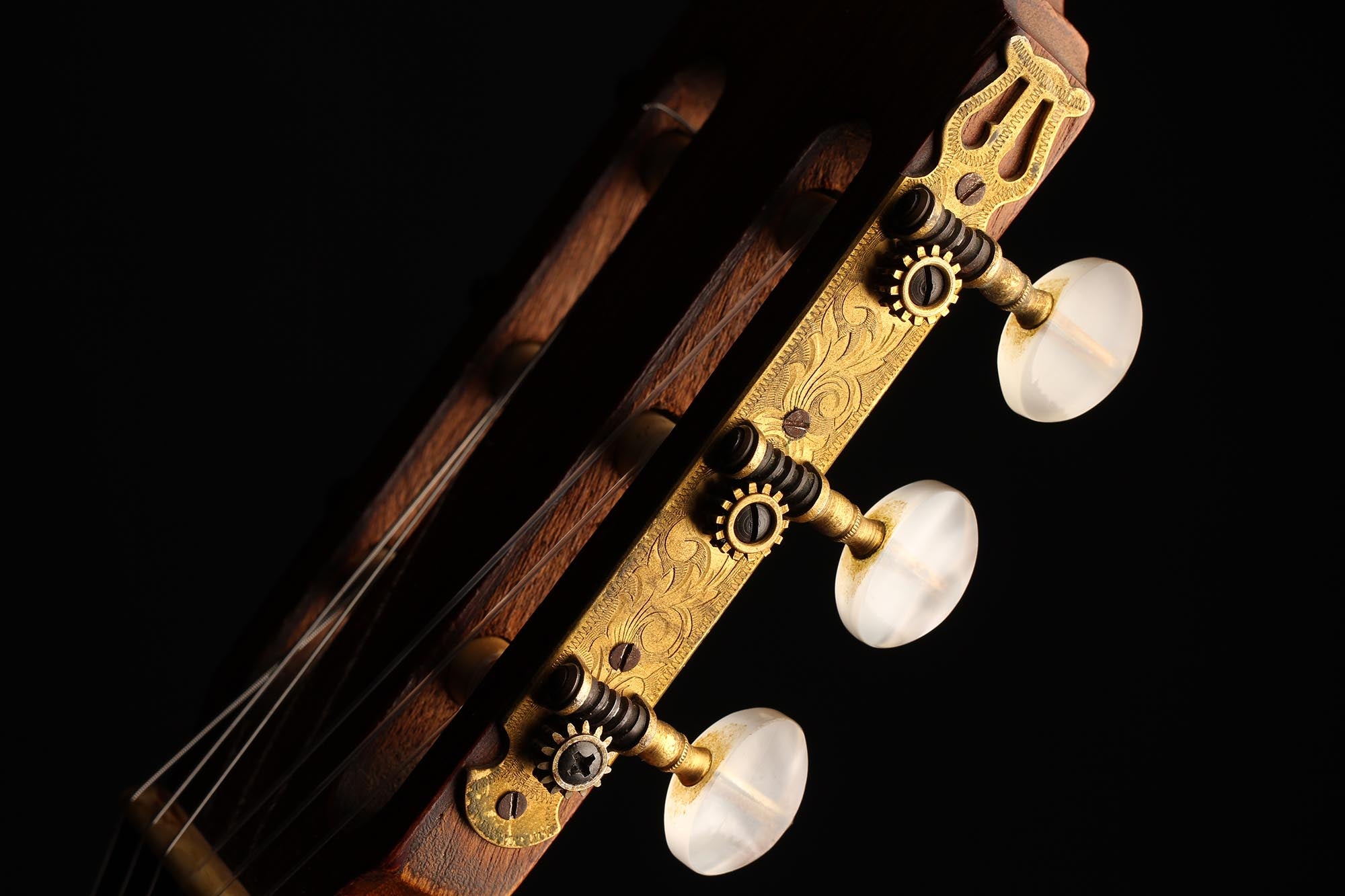 This 1961 guitar is very interesting. It has a Domingo Esteso-style head, very typical of the legendary luthiers from Madrid such as Manuel Ramirez and Santos Hernandez. This beautiful guitar has an extraordinary charisma. Three repaired cracks are visible on the soundboard: one at the central joint and one on each side of the ebony fingerboard. A small reinforcement bar has been added inside at the fan bracing at the central joint. Three small repaired cracks are also visible on the back. This guitar is in perfect playing condition and wears the original engraved Fustero tuners.